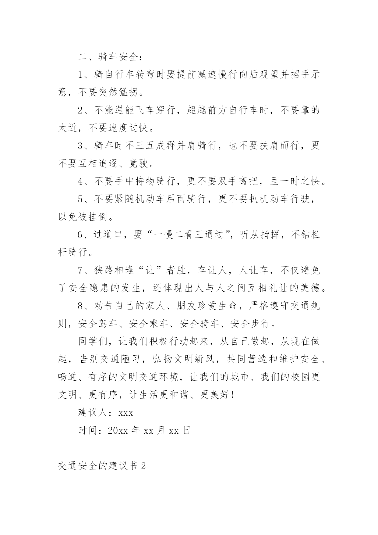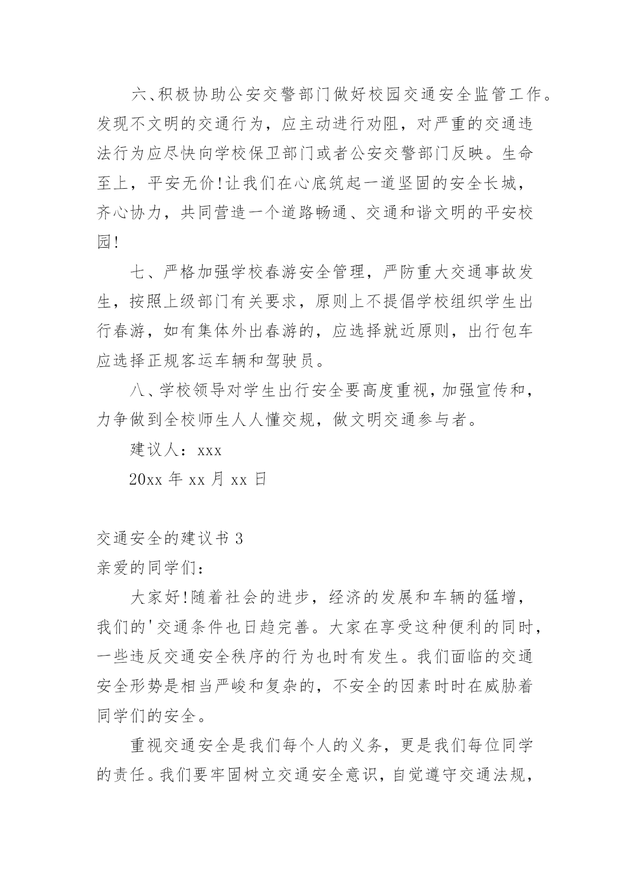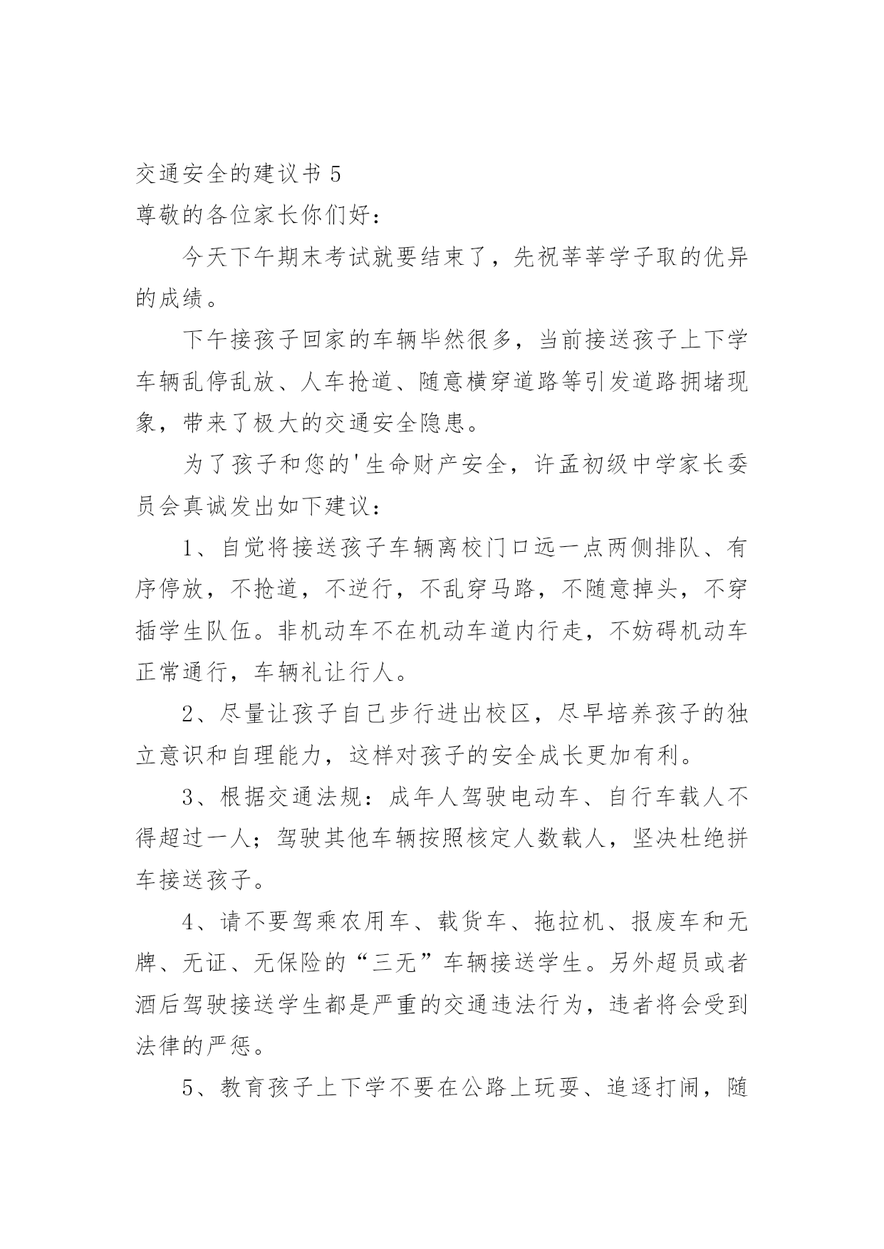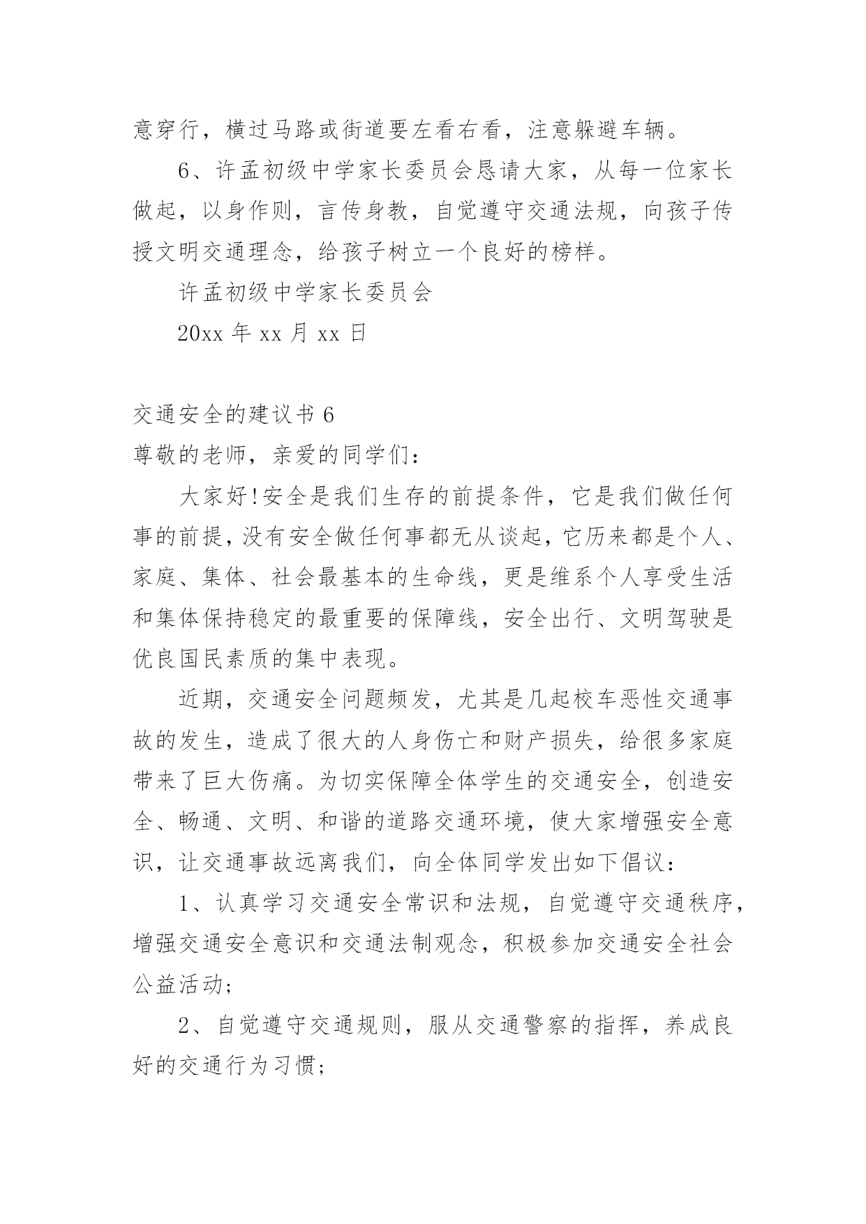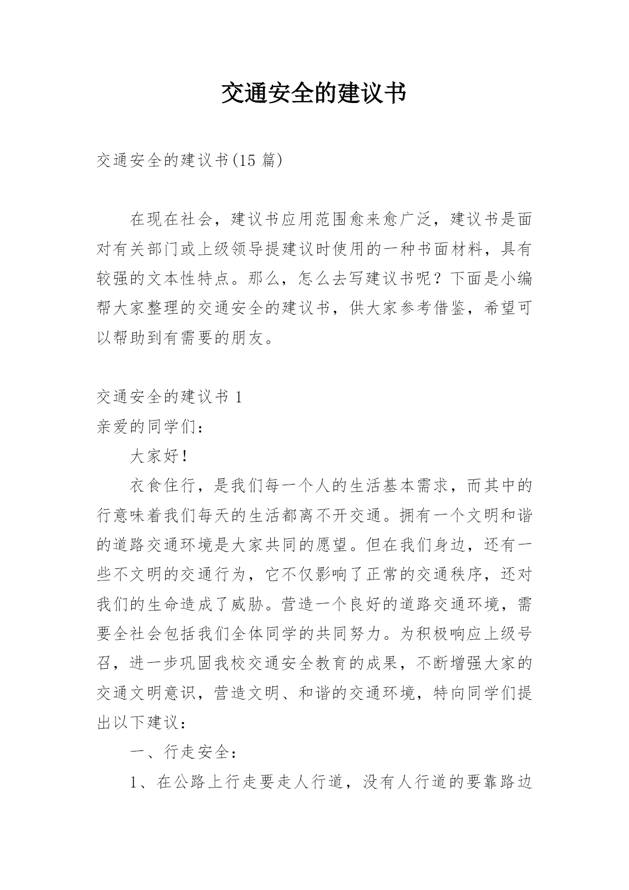 交通安全的建议书交通安全的建议书(15篇)在现在社会,建议书应用范围愈来愈广泛,建议书是面对有关部门或上级领导提建议时使用的一种书面材料,具有较强的文本性特点。那么,怎么去写建议书呢?下面是小编帮大家整理的交通安全的建议书,供大家参考借鉴,希望可以帮助到有需要的朋友。交通安全的建议书1亲爱的同学们:大家好!衣食住行,是我们每一个人的生活基本需求,而其中的行意味着我们每天的生活都离不开交通。拥有一个文明和谐的道路交通环境是大家共同的愿望。但在我们身边,还有一些不文明的交通行为,它不仅影响了正常的交通秩序,还对我们的生命造成了威胁。营造一个良好的道路交通环境,需要全社会包括我们全体同学的共同努力。为积极响应上级号召,进一步巩固我校交通安全教育的成果,不断增强大家的交通文明意识,营造文明、和谐的交通环境,特向同学们提出以下建议:一、行走安全:1、在公路上行走要走人行道,没有人行道的要靠路边行走。2、通过道路交叉口或横穿公路时,要走人行横道,通过路口时,要左右观察,确定安全时再通过。3、行路时,要注意各种信号灯的指示和车辆转向灯的变化,不抢红灯。4、不攀爬或跨越交通隔离栏。5、不在道路、桥梁、隧道或交通安全设施等地方逗留。6、集体外出时,要有组织有秩序的列队行走,结伴外出时不要相互追逐、打闹,行走要专一,不要东张西望、边走边看书、看报或做其他事情。7、校园内行走应遵循靠右原则,有人行道的路段应在人行道内行走。不得在道路上嬉戏、踢球或进行其他有碍交通秩序的活动。上下楼梯精力要集中,一律靠楼梯的`右边行走,前后要保持一定的距离,避免多人并排,跑跳,追逐打闹和前推后拥;发现拥挤现象不要慌乱,要靠墙或扶楼梯扶手止步;不要将身体探过楼梯扶手,更不要从栏杆上往下滑。8、在楼道走廊上行走时,要轻声慢步,不要大声喧哗,不要打闹追逐。不要借助栏杆做健身动作,更不要用身体、四肢冲撞栏杆。不向楼下扔任何东西。9、课间活动时不可在教室内跑、追逐打闹和恶作剧。10、在校园内活动时不得急跑,不得追逐打闹,不得做恶作剧。在人少的地方活动或游戏,且不要危及他人安全。不要做有危险的活动和游戏。二、骑车安全:1、骑自行车转弯时要提前减速慢行向后观望并招手示意,不要突然猛拐。2、不能逞能飞车穿行,超越前方自行车时,不要靠的太近,不要速度过快。3、骑车时不三五成群并肩骑行,也不要扶肩而行,更不要互相追逐、竟驶。4、不要手中持物骑行,更不要双手离把,呈一时之快。5、不要紧随机动车后面骑行,更不要扒机动车行驶,以免被挂倒。6、过道口,要“一慢二看三通过”,听从指挥,不钻栏杆骑行。7、狭路相逢“让”者胜,车让人,人让车,不仅避免了安全隐患的发生,还体现出人与人之间互相礼让的美德。8、劝告自己的家人、朋友珍爱生命,严格遵守交通规则,安全驾车、安全乘车、安全骑车、安全步行。同学们,让我们积极行动起来,从自己做起,从现在做起,告别交通陋习,弘扬文明新风,共同营造和维护安全、畅通、有序的文明交通环境,让我们的城市、我们的校园更文明、更有序,让生活更和谐、更美好!建议人:xxx时间:20xx年xx月xx日交通安全的建议书2尊敬的各位学校老师:为了塑造一个良好的校园环境,增强我校师生的交通安全意识,规范校园交通安全秩序,保障广大师生的人身、财产安全。猴场交警中队派出所根据安顺市公安局《关于学生出行安全专项整顿》有关要求,进一步有效预防学生出行易发生交通事故,结合猴场镇实际情况,猴场交警中队派出所向我镇中小学及幼儿园全体师生建议:一、认真学习各种有关交通安全的法律、法规和,树立交通安全文明意识,增强交通法制观念,并积极地做交通安全的宣传员,为营造平安和谐的校园环境尽到责任。二、自觉抵制违规车辆进入校园,大家不要驾乘无牌、无证和非法改装的机动车辆,不搭乘非法营运车辆。三、在驾驶车辆时要提高警惕,谨慎驾驶,杜绝酒后开车、无证驾驶、超速行驶、飚车以及在校园内违规学开机动车辆等存在严重安全隐患的'行为;驾驶车辆应主动避让行人,车辆应停放到指定地点,杜绝乱停、乱放和占道停车。四、养成文明交通行为,骑自行车或摩托车时不超载搭人、不戴耳机听音乐、不打手机、吃零食、不搭肩并行,不逆向行驶;步行、骑自行车或摩托车过马路时,要做到“一慢、二看、三通过”,不在道路上嬉戏打闹,不在道路上进行旱冰、轮滑等体育活动。五、自觉爱护交通标志、标线等交通设施,不随意移动、遮挡甚至破坏校园交通标志、标线。自行车应按序停放于指定位置,不要占道停放和占用机动车停车位停放。六、积极协助公安交警部门做好校园交通安全监管工作。发现不文明的交通行为,应主动进行劝阻,对严重的交通违法行为应尽快向学校保卫部门或者公安交警部门反映。生命至上,平安无价!让我们在心底筑起一道坚固的安全长城,齐心协力,共同营造一个道路畅通、交通和谐文明的平安校园!