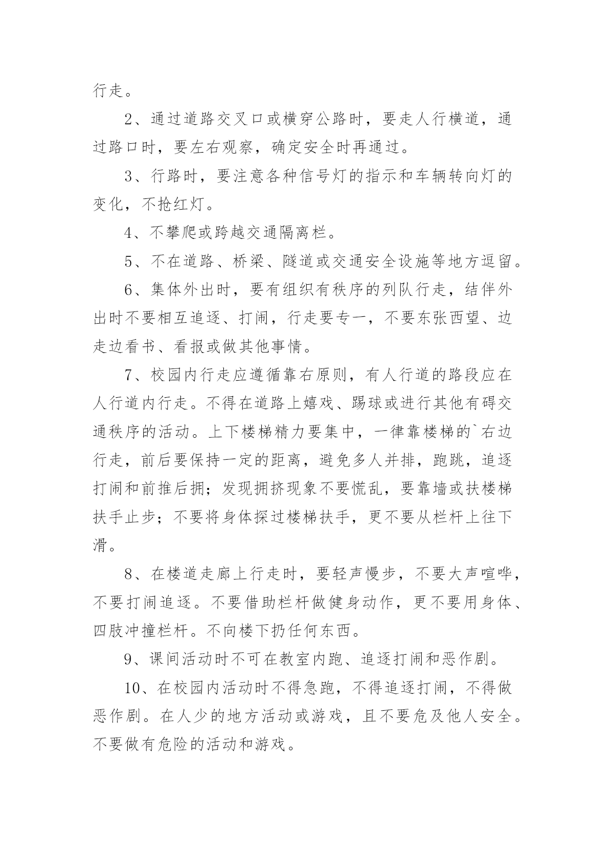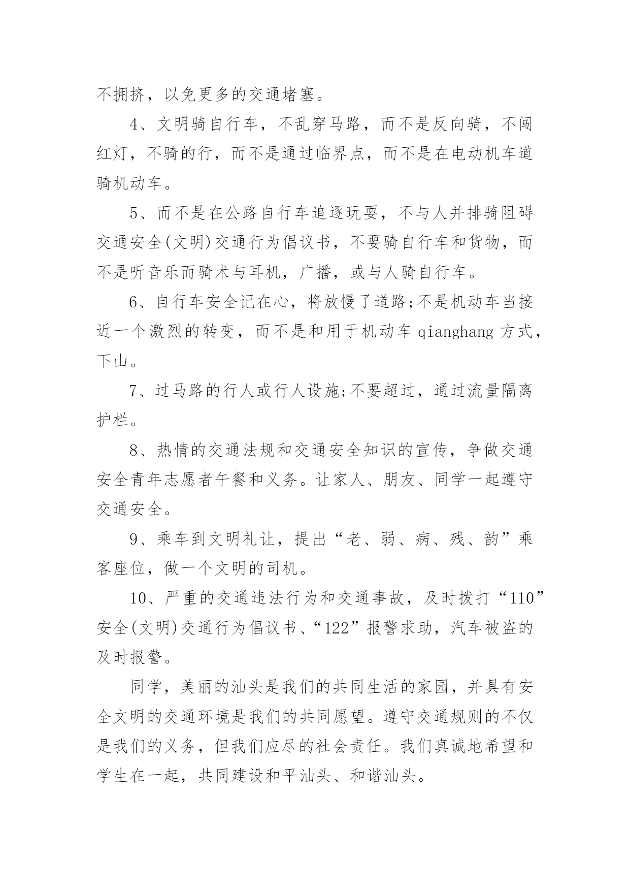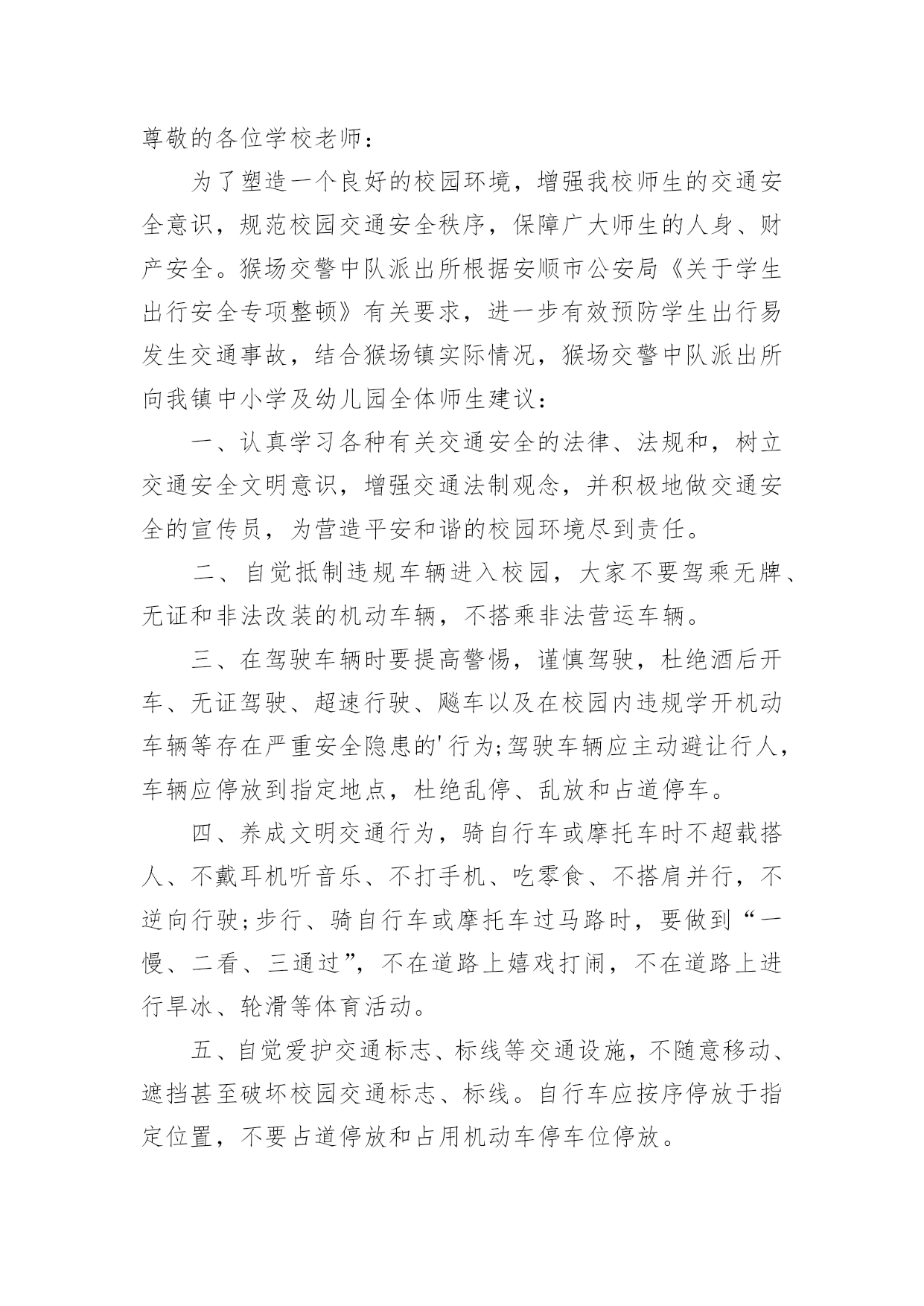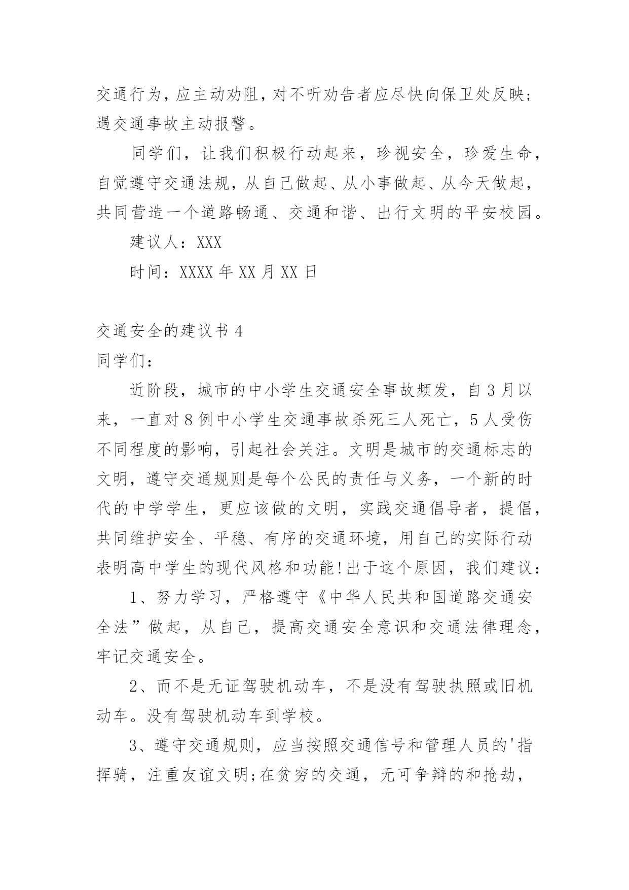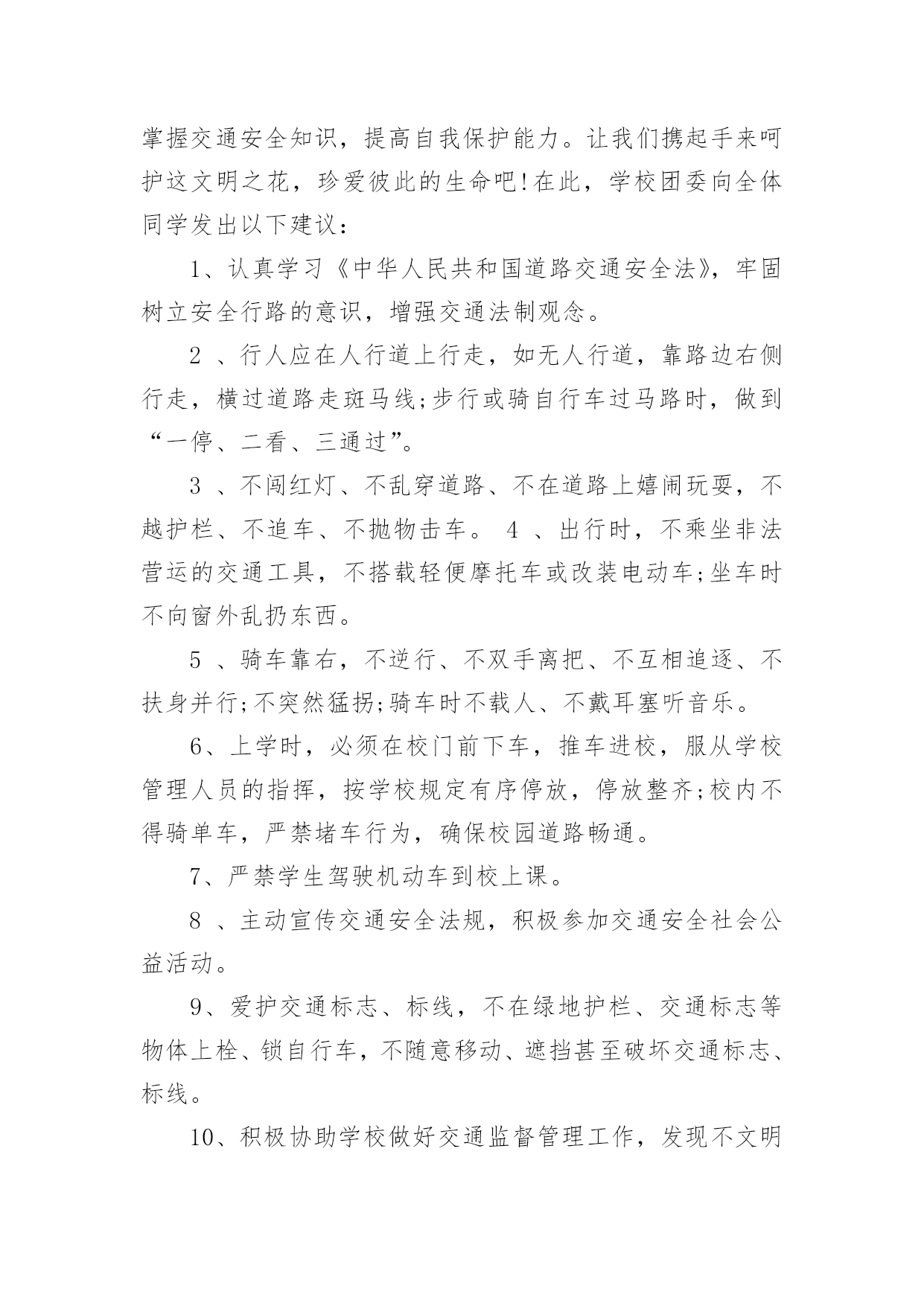 交通安全的建议书交通安全的建议书(15篇)在现在社会,建议书应用范围愈来愈广泛,建议书是面对有关部门或上级领导提建议时使用的一种书面材料,具有较强的文本性特点。那么,怎么去写建议书呢?下面是小编帮大家整理的交通安全的建议书,供大家参考借鉴,希望可以帮助到有需要的朋友。交通安全的建议书1亲爱的同学们:大家好!衣食住行,是我们每一个人的生活基本需求,而其中的行意味着我们每天的生活都离不开交通。拥有一个文明和谐的道路交通环境是大家共同的愿望。但在我们身边,还有一些不文明的交通行为,它不仅影响了正常的交通秩序,还对我们的生命造成了威胁。营造一个良好的道路交通环境,需要全社会包括我们全体同学的共同努力。为积极响应上级号召,进一步巩固我校交通安全教育的成果,不断增强大家的交通文明意识,营造文明、和谐的交通环境,特向同学们提出以下建议:一、行走安全:1、在公路上行走要走人行道,没有人行道的要靠路边行走。2、通过道路交叉口或横穿公路时,要走人行横道,通过路口时,要左右观察,确定安全时再通过。3、行路时,要注意各种信号灯的指示和车辆转向灯的变化,不抢红灯。4、不攀爬或跨越交通隔离栏。5、不在道路、桥梁、隧道或交通安全设施等地方逗留。6、集体外出时,要有组织有秩序的列队行走,结伴外出时不要相互追逐、打闹,行走要专一,不要东张西望、边走边看书、看报或做其他事情。7、校园内行走应遵循靠右原则,有人行道的路段应在人行道内行走。不得在道路上嬉戏、踢球或进行其他有碍交通秩序的活动。上下楼梯精力要集中,一律靠楼梯的`右边行走,前后要保持一定的距离,避免多人并排,跑跳,追逐打闹和前推后拥;发现拥挤现象不要慌乱,要靠墙或扶楼梯扶手止步;不要将身体探过楼梯扶手,更不要从栏杆上往下滑。8、在楼道走廊上行走时,要轻声慢步,不要大声喧哗,不要打闹追逐。不要借助栏杆做健身动作,更不要用身体、四肢冲撞栏杆。不向楼下扔任何东西。9、课间活动时不可在教室内跑、追逐打闹和恶作剧。10、在校园内活动时不得急跑,不得追逐打闹,不得做恶作剧。在人少的地方活动或游戏,且不要危及他人安全。不要做有危险的活动和游戏。二、骑车安全:1、骑自行车转弯时要提前减速慢行向后观望并招手示意,不要突然猛拐。2、不能逞能飞车穿行,超越前方自行车时,不要靠的太近,不要速度过快。3、骑车时不三五成群并肩骑行,也不要扶肩而行,更不要互相追逐、竟驶。4、不要手中持物骑行,更不要双手离把,呈一时之快。5、不要紧随机动车后面骑行,更不要扒机动车行驶,以免被挂倒。6、过道口,要“一慢二看三通过”,听从指挥,不钻栏杆骑行。7、狭路相逢“让”者胜,车让人,人让车,不仅避免了安全隐患的发生,还体现出人与人之间互相礼让的美德。8、劝告自己的家人、朋友珍爱生命,严格遵守交通规则,安全驾车、安全乘车、安全骑车、安全步行。同学们,让我们积极行动起来,从自己做起,从现在做起,告别交通陋习,弘扬文明新风,共同营造和维护安全、畅通、有序的文明交通环境,让我们的城市、我们的校园更文明、更有序,让生活更和谐、更美好!建议人:xxx时间:20xx年xx月xx日交通安全的建议书2尊敬的各位学校老师:为了塑造一个良好的校园环境,增强我校师生的交通安全意识,规范校园交通安全秩序,保障广大师生的人身、财产安全。猴场交警中队派出所根据安顺市公安局《关于学生出行安全专项整顿》有关要求,进一步有效预防学生出行易发生交通事故,结合猴场镇实际情况,猴场交警中队派出所向我镇中小学及幼儿园全体师生建议:一、认真学习各种有关交通安全的法律、法规和,树立交通安全文明意识,增强交通法制观念,并积极地做交通安全的宣传员,为营造平安和谐的校园环境尽到责任。二、自觉抵制违规车辆进入校园,大家不要驾乘无牌、无证和非法改装的机动车辆,不搭乘非法营运车辆。三、在驾驶车辆时要提高警惕,谨慎驾驶,杜绝酒后开车、无证驾驶、超速行驶、飚车以及在校园内违规学开机动车辆等存在严重安全隐患的'行为;驾驶车辆应主动避让行人,车辆应停放到指定地点,杜绝乱停、乱放和占道停车。四、养成文明交通行为,骑自行车或摩托车时不超载搭人、不戴耳机听音乐、不打手机、吃零食、不搭肩并行,不逆向行驶;步行、骑自行车或摩托车过马路时,要做到“一慢、二看、三通过”,不在道路上嬉戏打闹,不在道路上进行旱冰、轮滑等体育活动。五、自觉爱护交通标志、标线等交通设施,不随意移动、遮挡甚至破坏校园交通标志、标线。自行车应按序停放于指定位置,不要占道停放和占用机动车停车位停放。六、积极协助公安交警部门做好校园交通安全监管工作。发现不文明的交通行为,应主动进行劝阻,对严重的交通违法行为应尽快向学校保卫部门或者公安交警部门反映。生命至上,平安无价!让我们在心底筑起一道坚固的安全长城,齐心协力,共同营造一个道路畅通、交通和谐文明的平安校园!