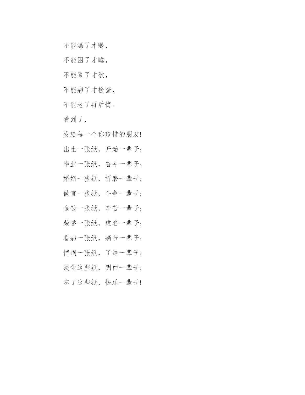 关于人生及生活的经典语句朋友虽不常联系,却一直惦念。天凉时记着多穿衣!睡眠不足八小时人会变笨,有午睡习惯的人不易老。少吃油多的食物,最佳睡眠为晚上十点至早上六点。晚上五点后少吃大餐,每天喝酒不超过一杯。不用冷水服胶囊,睡前半小时服药忌立刻躺下。手机电池剩一格时不要打电话,剩一格时辐射是平时的一千倍。要用左耳接电话,用右耳会直接伤害到大脑。少喝奶茶、不吃刚烤好的面包,远离正在充电的电源。白天多喝水,晚上少喝酒,一天不喝多于两杯的咖啡。21世纪生活新概念经典语录一个中心:一切以健康为中心。两个基本点:遇事潇洒一点,看世糊涂一点。三个忘记:忘记年龄,忘记过去,忘记恩怨。(人生感悟)四个拥有:无论你有多弱或多强,一定要拥有真正爱你的人,拥有知心的朋友,拥有向上的事业,拥有温暖的住所。五个要:要唱,要跳,要俏,要笑,要苗条。六个不能:不能饿了才吃,不能渴了才喝,不能困了才睡,不能累了才歇,不能病了才检查,不能老了再后悔。看到了,发给每一个你珍惜的朋友!出生一张纸,开始一辈子;毕业一张纸,奋斗一辈子;婚姻一张纸,折磨一辈子;做官一张纸,斗争一辈子;金钱一张纸,辛苦一辈子;荣誉一张纸,虚名一辈子;看病一张纸,痛苦一辈子;悼词一张纸,了结一辈子;淡化这些纸,明白一辈子;忘了这些纸,快乐一辈子!