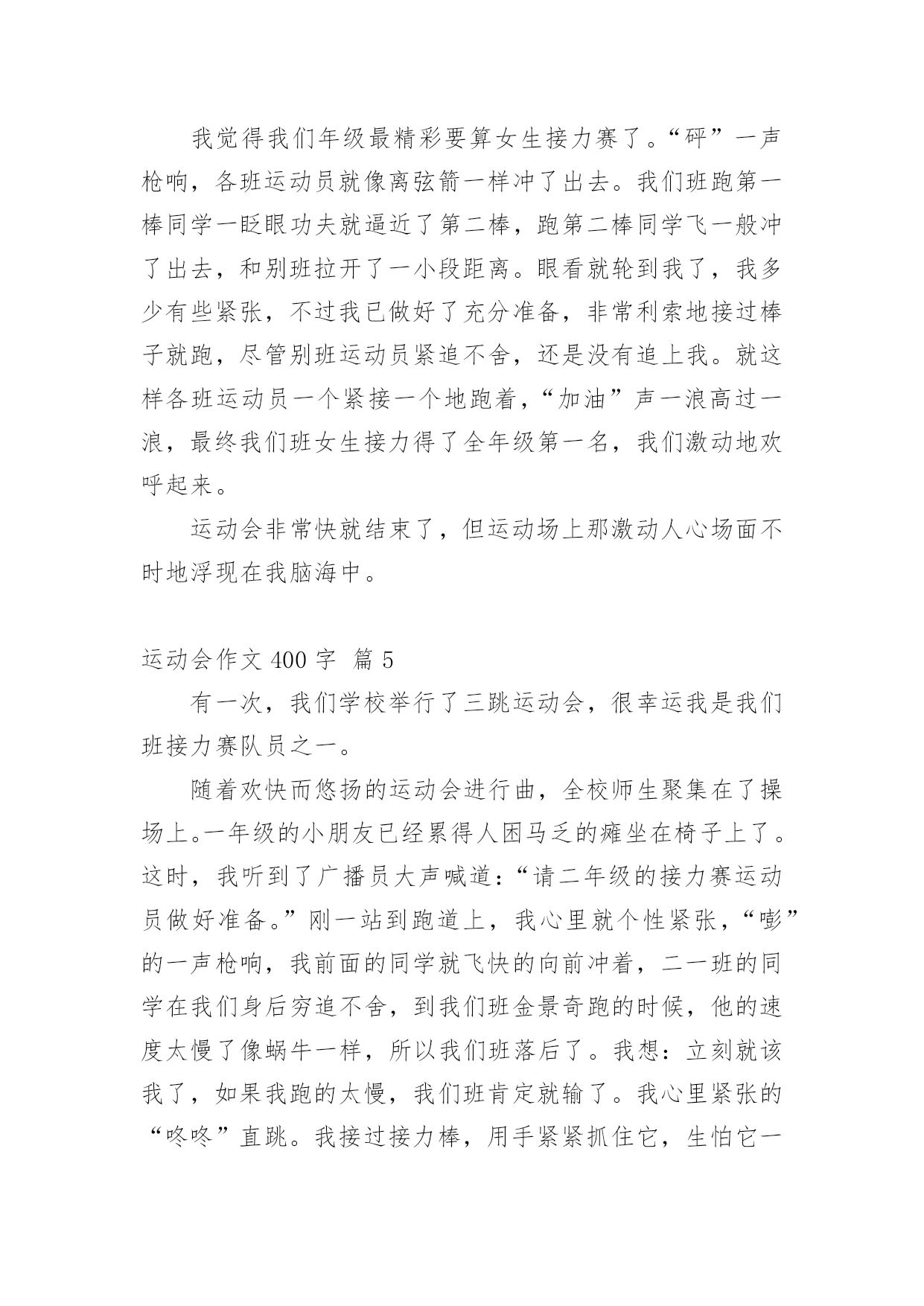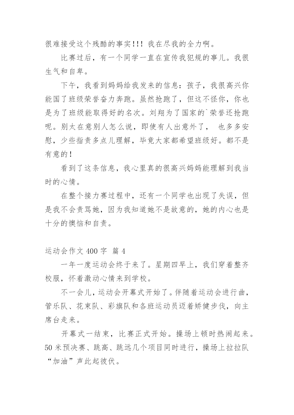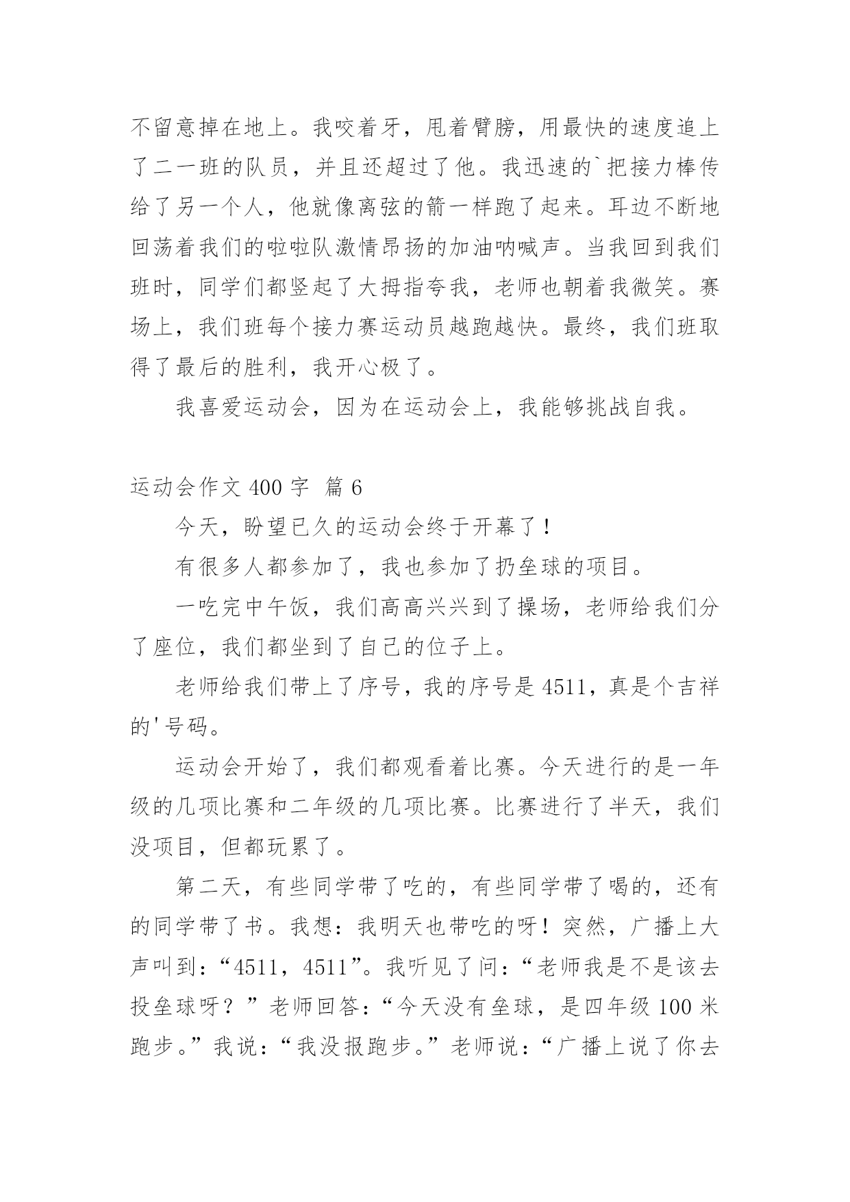 运动会作文400字【精品】运动会作文400字七篇在平平淡淡的学习、工作、生活中,大家都接触过作文吧,写作文是培养人们的观察力、联想力、想象力、思考力和记忆力的重要手段。如何写一篇有思想、有文采的作文呢?下面是小编帮大家整理的运动会作文400字7篇,欢迎大家分享。运动会作文400字篇1星期六,天上的云就像棉花似的,秋高气爽,我兴高采烈地来到了白鹤公园,因为今天时代要在这里举行金秋运动会。我们玩的这个游戏叫传呼啦圈,游戏分为两组,游戏规则是每一名同学都要围成一个圈或站成一排,传呼啦圈的时候,只能用头传,不能用手帮忙,如果到哪个同学的那里断了,就要重新来。来到白鹤公园,我就看到吴老师抱着一沓作业,我还看到许许多多的同学都把自己的.作业交给了吴老师,原来吴老师是在收作业,过了一会儿,吴老师就喊我们集合了。第一轮游戏开始了,只听吴老师大声地喊:“预备……开始。”从小J同学那里开始,她先把手伸出来,再把脚从呼啦圈里跨出去。最后,让呼啦圈慢慢的滑到她旁边那个同学的手,结果,呼啦圈就像一个乖巧的孩子,很轻巧地就滑到了她旁边那个同学的手上。很快轮到我了,我心想:“我也不能太慢了,给我们组拖后腿。”最终,我还是给我们组拖后腿了,最后,我们组还是输了。第二轮游戏开始了,只听吴老师大声地喊:“预备——开始。”从小Y同学那里开始,在她那里,呼啦圈顺顺利利地就滑到了她旁边那个同学的手上。很快又轮到我了,我心想:“我不能再像上一轮一样,传得这么慢了。”这次,我真的做到了。我希望下次时代再举行一次金秋运动会。运动会作文400字篇2一年一度的动物运动会到了,动物王国里沸腾起来,猎豹在山上奔跑,他准备参加马拉松比赛。梅花鹿伸展她美丽身姿,是为体操比赛做准备。大象在山坡上走来走去,他觉得摔跤冠军非他莫属,而小老鼠,他正在秘密地练一样工夫呢!动物公元年一月一日一时一分,第届动物运动会正式开幕。开幕式的表演很精彩,有老虎钻火圈、狗熊摔跤、还有猴子走钢丝呢!第一场比赛是摔跤,是大象和小花猫的斗争,大象先发起了攻击,用长长的鼻子从小猫身后一挑,小花猫就被摔在了地上,真是先发制人啊!不,是先发制猫。狐狸看了大象的摔跤,心里想∶大象只是靠它的鼻子赢了小花猫,只要我控制住大象的鼻子,就没有什么难处。于是狐狸大摇大摆地走上摔跤台,一开始狐狸就想用双手把大象的鼻子控制住,可是大象把鼻子一扬,接着又用同样的方法把狐狸摔在了台上。就在这时,小老鼠走上了摔跤台,大象轻地看了看小老鼠,就用同样的办法来摔小老鼠,小老鼠并没有被摔倒,而是以自已矫健的.身体,突然跳进了大象的耳朵里,把大象弄得跳来跳去,台下的观众见状哈哈大笑…第届动物运动会完整闭幕,动物们都回到家里各自准备明天的劳作,而那只机灵的小老鼠正在接受动物记者的采访呢!运动会作文400字篇3在这个阳光明媚、风和日丽、秋高气爽的日子里,我们怀着激动的心情迎来了一年一度的学校秋季运动会。我被选上的班级接力赛项目,就在运动会第一天的上午比赛。我们练习了好长时间,终于要正式比赛了。老师提醒我们:“要提前去接棒,这样会节省很多时间。”站好队形后,老师的哨子一吹响,接力赛开始了。只见第一个同学快如闪电,成功送棒;第二个同学紧随其后;呀!该我了,我做起跑的姿势。我飞速地跑了过去,快到头时,我差点儿就摔扒下!谁知,我跑过去了,同学们纷纷说我犯规了,加了5秒钟!我很难接受这个残酷的事实!!!我在尽我的全力啊。比赛过后,有一个同学一直在宣传我犯规的事儿。我很生气和自卑。下午,我看到妈妈给我发来的信息:孩子,我很高兴你能国了班级荣誉奋力奔跑。虽然抢跑了,但这不怪你,你也是为了班级能取得好的名次。刘翔为了国家的`荣誉还抢跑呢。别太在意别人怎么说,即使有人出意外了,也多多安慰,少些指责多点儿理解,毕竟大家都希望班级好。都不是有意的!看到了这条信息,我心里真的很高兴妈妈能理解到我当时的心情。在整个接力赛过程中,还有一个同学也出现了失误,但是我不会责骂她,因为我知道她不是故意的,她的内心也是十分的懊恼和自责。运动会作文400字篇4一年一度运动会终于来了。星期四早上,我们穿着整齐校服,怀着激动心情来到学校。不一会儿,运动会开幕式开始了。伴随着运动会进行曲,管乐队、花束队、彩旗队和各班运动员迈着矫健步伐,向主席台走来。开幕式一结束,比赛正式开始。操场上顿时热闹起来。50米预决赛、跳高、跳远几个项目同时进行,操场上拉拉队“加油”声此起彼伏。我觉得我们年级最精彩要算女生接力赛了。“砰”一声枪响,各班运动员就像离弦箭一样冲了出去。我们班跑第一棒同学一眨眼功夫就逼近了第二棒,跑第二棒同学飞一般冲了出去,和别班拉开了一小段距离。眼看就轮到我了,我多少有些紧张,不过我已做好了充分准备,非常利索地接过棒子就跑,尽管别班运动员紧追不舍,还是没有追上我。就这样各班运动员一个紧接一个地