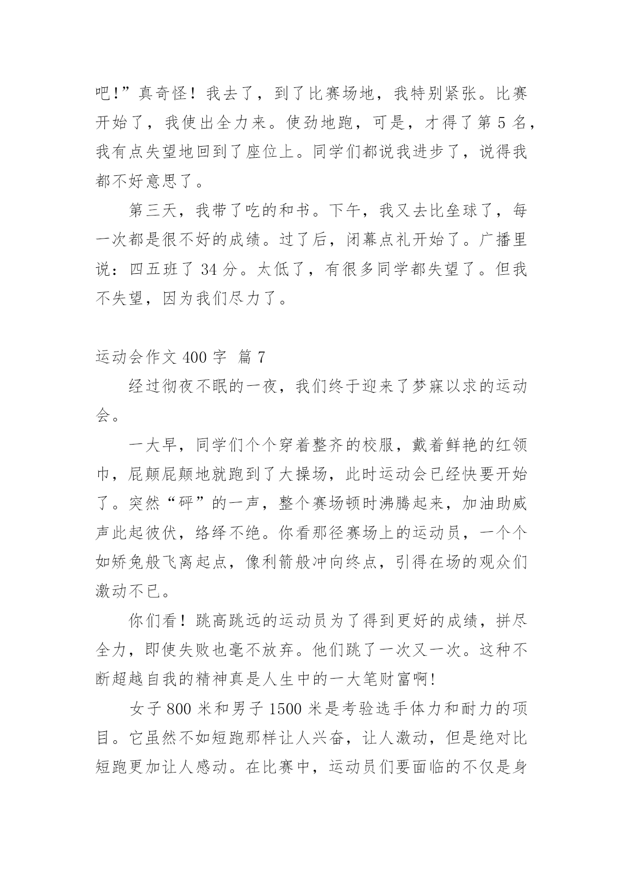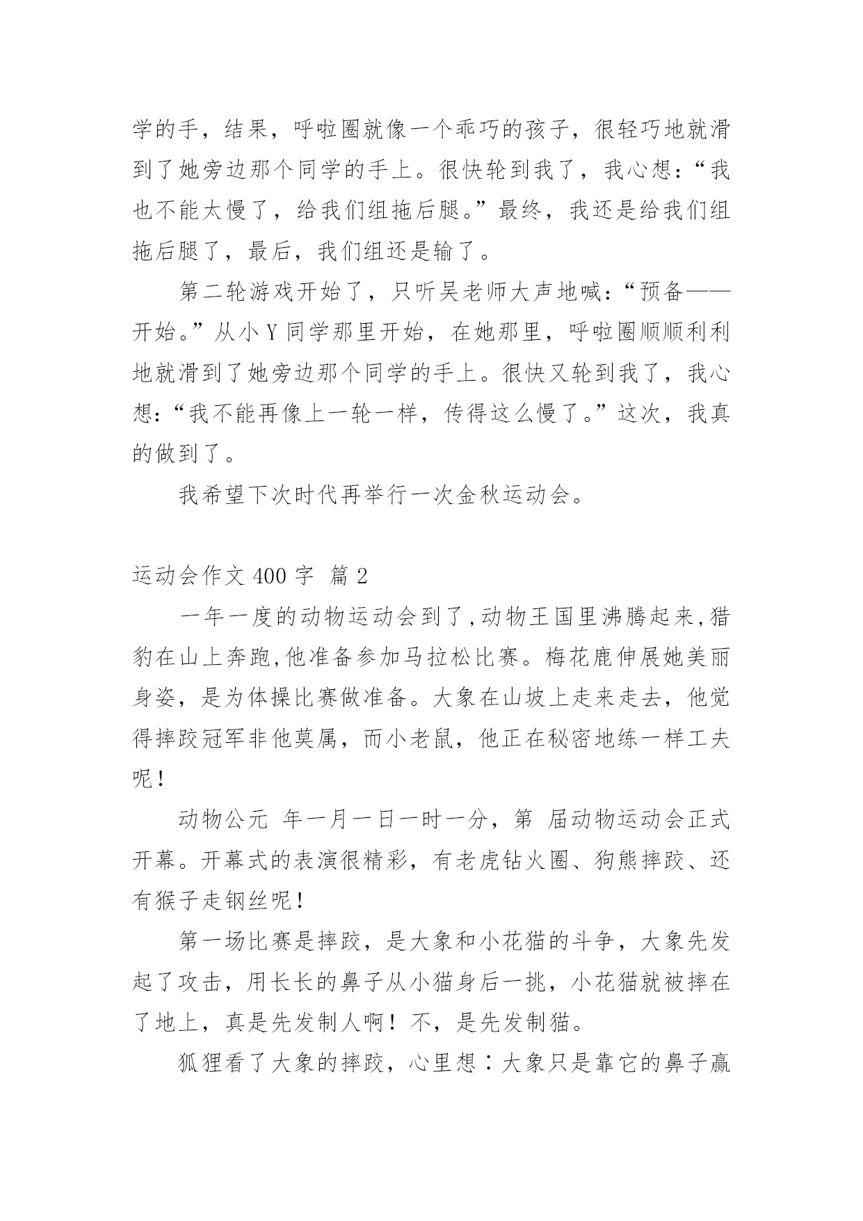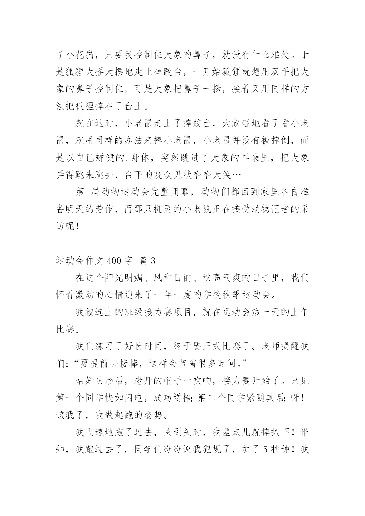 运动会作文400字【精品】运动会作文400字七篇在平平淡淡的学习、工作、生活中,大家都接触过作文吧,写作文是培养人们的观察力、联想力、想象力、思考力和记忆力的重要手段。如何写一篇有思想、有文采的作文呢?下面是小编帮大家整理的运动会作文400字7篇,欢迎大家分享。运动会作文400字篇1星期六,天上的云就像棉花似的,秋高气爽,我兴高采烈地来到了白鹤公园,因为今天时代要在这里举行金秋运动会。我们玩的这个游戏叫传呼啦圈,游戏分为两组,游戏规则是每一名同学都要围成一个圈或站成一排,传呼啦圈的时候,只能用头传,不能用手帮忙,如果到哪个同学的那里断了,就要重新来。来到白鹤公园,我就看到吴老师抱着一沓作业,我还看到许许多多的同学都把自己的.作业交给了吴老师,原来吴老师是在收作业,过了一会儿,吴老师就喊我们集合了。第一轮游戏开始了,只听吴老师大声地喊:“预备……开始。”从小J同学那里开始,她先把手伸出来,再把脚从呼啦圈里跨出去。最后,让呼啦圈慢慢的滑到她旁边那个同学的手,结果,呼啦圈就像一个乖巧的孩子,很轻巧地就滑到了她旁边那个同学的手上。很快轮到我了,我心想:“我也不能太慢了,给我们组拖后腿。”最终,我还是给我们组拖后腿了,最后,我们组还是输了。第二轮游戏开始了,只听吴老师大声地喊:“预备——开始。”从小Y同学那里开始,在她那里,呼啦圈顺顺利利地就滑到了她旁边那个同学的手上。很快又轮到我了,我心想:“我不能再像上一轮一样,传得这么慢了。”这次,我真的做到了。我希望下次时代再举行一次金秋运动会。运动会作文400字篇2一年一度的动物运动会到了,动物王国里沸腾起来,猎豹在山上奔跑,他准备参加马拉松比赛。梅花鹿伸展她美丽身姿,是为体操比赛做准备。大象在山坡上走来走去,他觉得摔跤冠军非他莫属,而小老鼠,他正在秘密地练一样工夫呢!动物公元年一月一日一时一分,第届动物运动会正式开幕。开幕式的表演很精彩,有老虎钻火圈、狗熊摔跤、还有猴子走钢丝呢!第一场比赛是摔跤,是大象和小花猫的斗争,大象先发起了攻击,用长长的鼻子从小猫身后一挑,小花猫就被摔在了地上,真是先发制人啊!不,是先发制猫。狐狸看了大象的摔跤,心里想∶大象只是靠它的鼻子赢了小花猫,只要我控制住大象的鼻子,就没有什么难处。于是狐狸大摇大摆地走上摔跤台,一开始狐狸就想用双手把大象的鼻子控制住,可是大象把鼻子一扬,接着又用同样的方法把狐狸摔在了台上。就在这时,小老鼠走上了摔跤台,大象轻地看了看小老鼠,就用同样的办法来摔小老鼠,小老鼠并没有被摔倒,而是以自已矫健的.身体,突然跳进了大象的耳朵里,把大象弄得跳来跳去,台下的观众见状哈哈大笑…第届动物运动会完整闭幕,动物们都回到家里各自准备明天的劳作,而那只机灵的小老鼠正在接受动物记者的采访呢!运动会作文400字篇3在这个阳光明媚、风和日丽、秋高气爽的日子里,我们怀着激动的心情迎来了一年一度的学校秋季运动会。我被选上的班级接力赛项目,就在运动会第一天的上午比赛。我们练习了好长时间,终于要正式比赛了。老师提醒我们:“要提前去接棒,这样会节省很多时间。”站好队形后,老师的哨子一吹响,接力赛开始了。只见第一个同学快如闪电,成功送棒;第二个同学紧随其后;呀!该我了,我做起跑的姿势。我飞速地跑了过去,快到头时,我差点儿就摔扒下!谁知,我跑过去了,同学们纷纷说我犯规了,加了5秒钟!我很难接受这个残酷的事实!!!我在尽我的全力啊。比赛过后,有一个同学一直在宣传我犯规的事儿。我很生气和自卑。下午,我看到妈妈给我发来的信息:孩子,我很高兴你能国了班级荣誉奋力奔跑。虽然抢跑了,但这不怪你,你也是为了班级能取得好的名次。刘翔为了国家的`荣誉还抢跑呢。别太在意别人怎么说,即使有人出意外了,也多多安慰,少些指责多点儿理解,毕竟大家都希望班级好。都不是有意的!看到了这条信息,我心里真的很高兴妈妈能理解到我当时的心情。在整个接力赛过程中,还有一个同学也出现了失误,但是我不会责骂她,因为我知道她不是故意的,她的内心也是十分的懊恼和自责。运动会作文400字篇4一年一度运动会终于来了。星期四早上,我们穿着整齐校服,怀着激动心情来到学校。不一会儿,运动会开幕式开始了。伴随着运动会进行曲,管乐队、花束队、彩旗队和各班运动员迈着矫健步伐,向主席台走来。开幕式一结束,比赛正式开始。操场上顿时热闹起来。50米预决赛、跳高、跳远几个项目同时进行,操场上拉拉队“加油”声此起彼伏。我觉得我们年级最精彩要算女生接力赛了。“砰”一声枪响,各班运动员就像离弦箭一样冲了出去。我们班跑第一棒同学一眨眼功夫就逼近了第二棒,跑第二棒同学飞一般冲了出去,和别班拉开了一小段距离。眼看就轮到我了,我多少有些紧张,不过我已做好了充分准备,非常利索地接过棒子就跑,尽管别班运动员紧追不舍,还是没有追上我。就这样各班运动员一个紧接一个地