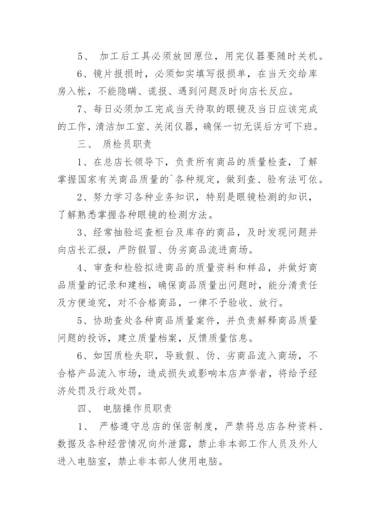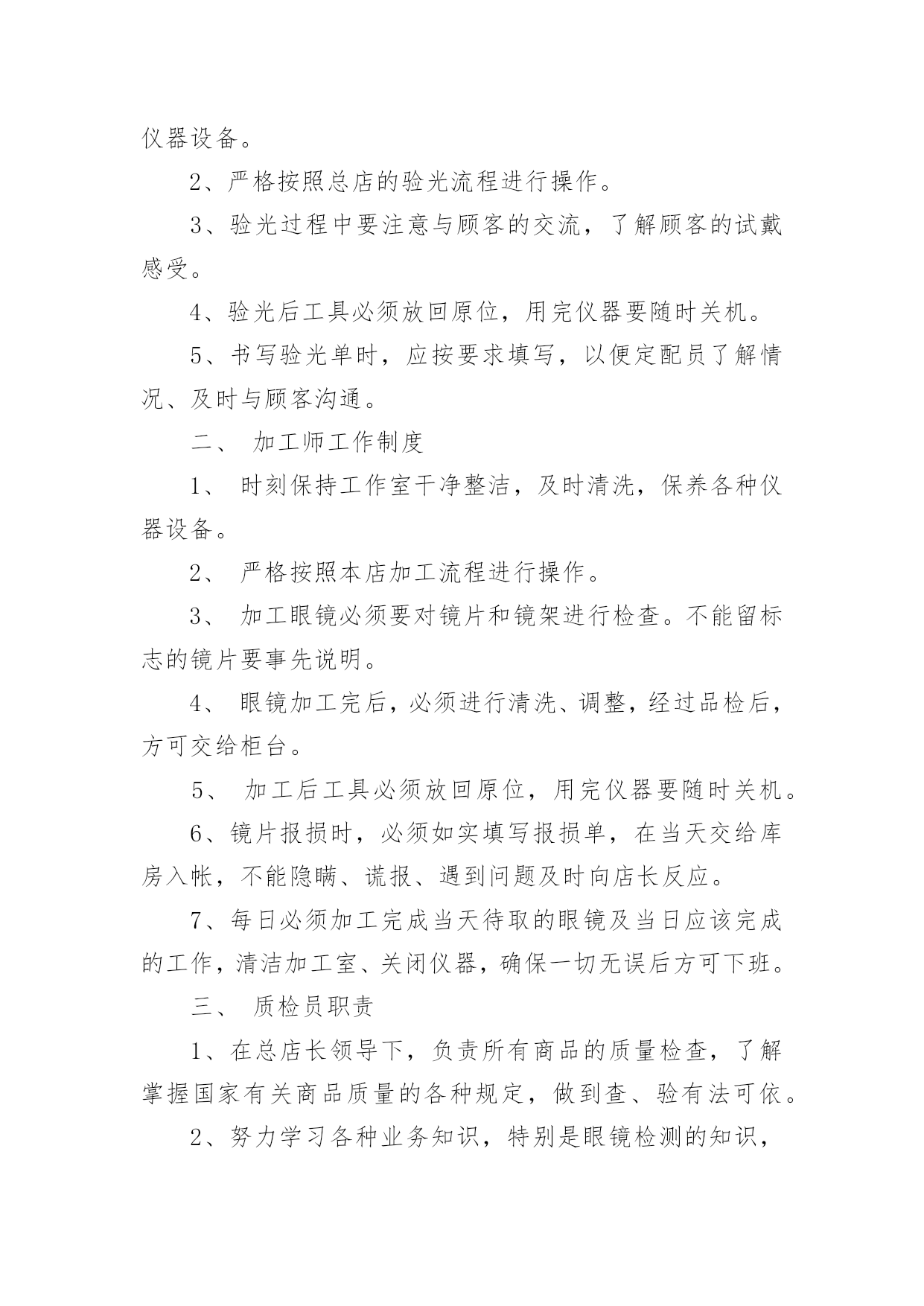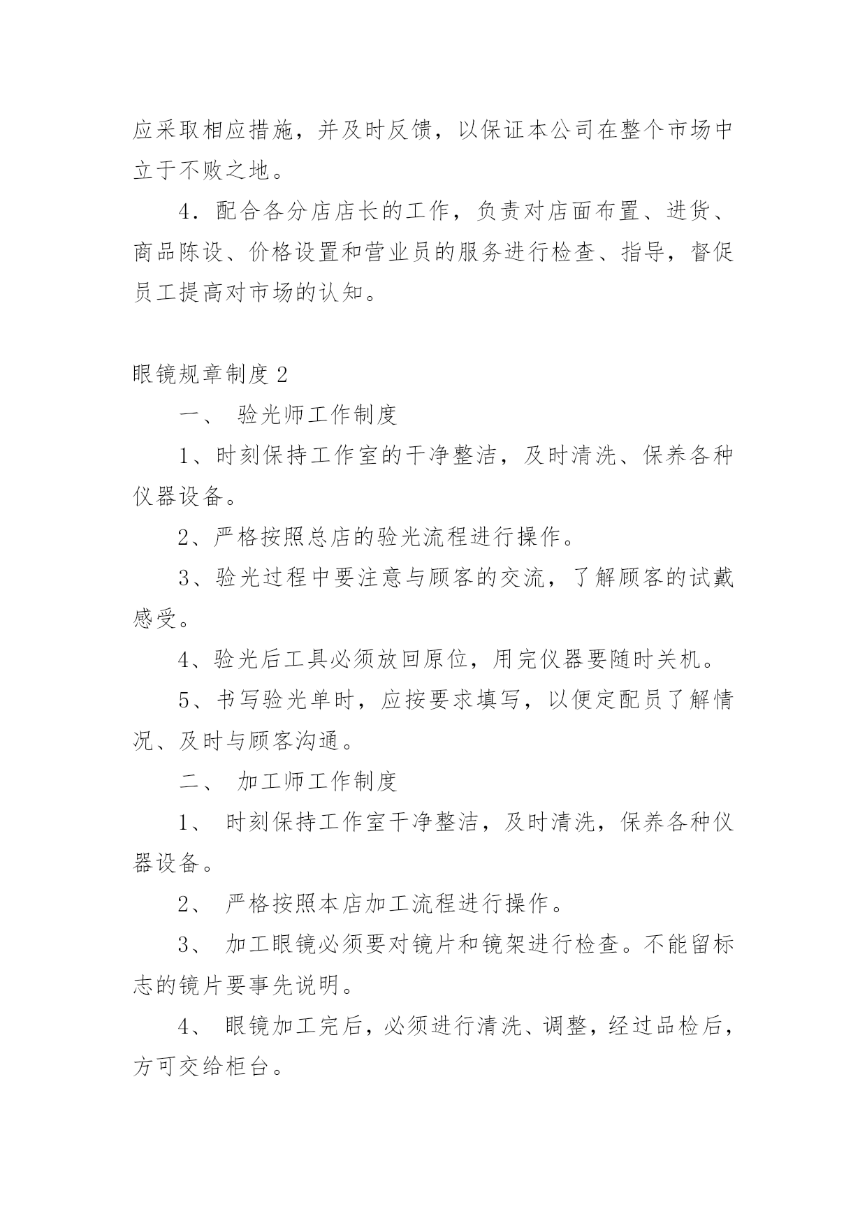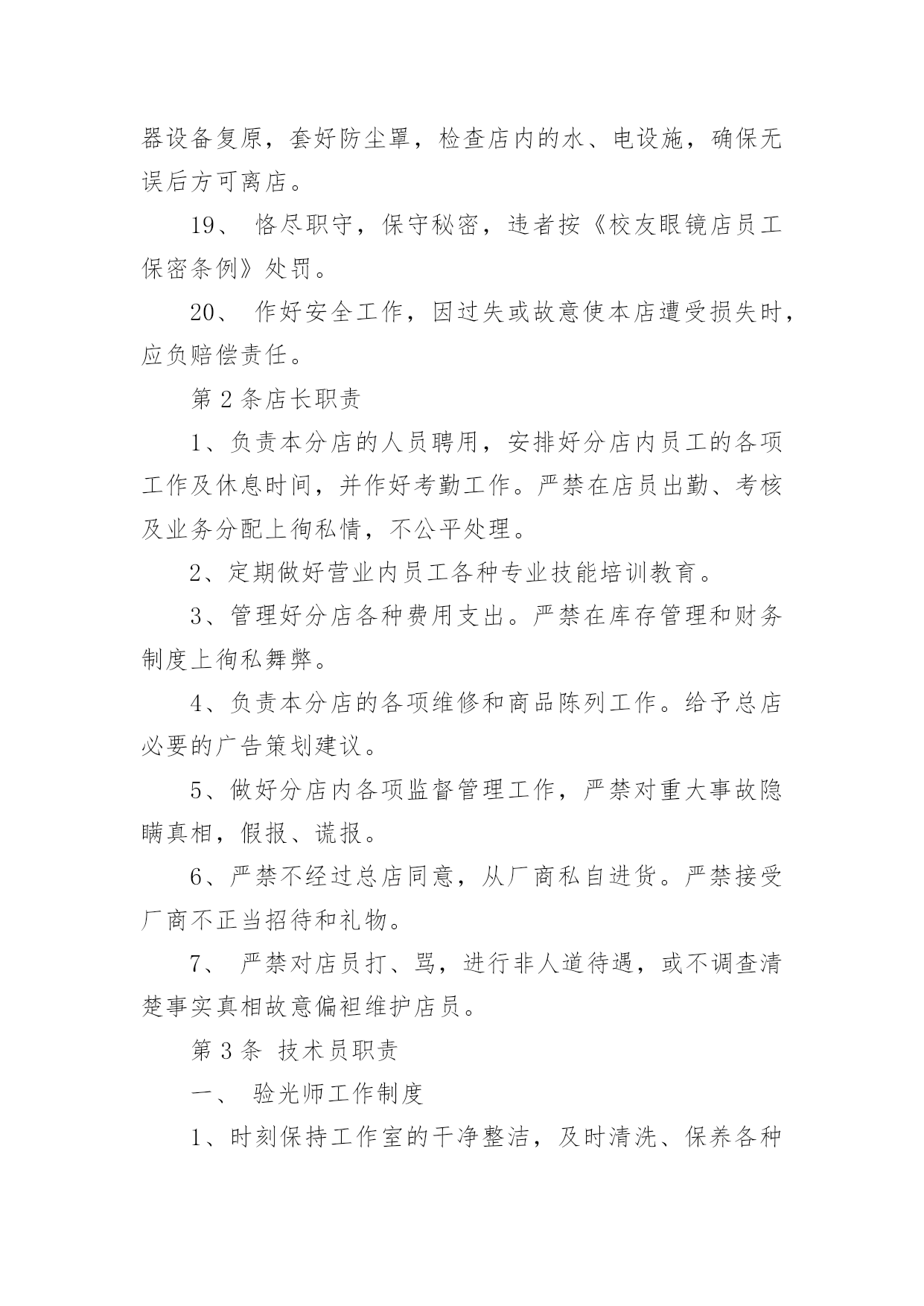 眼镜规章制度1眼镜规章制度在现在的社会生活中,制度的使用频率呈上升趋势,制度是指要求大家共同遵守的办事规程或行动准则。那么什么样的制度才是有效的呢?下面是小编精心整理的眼镜规章制度,希望能够帮助到大家。眼镜规章制度1第1条店员行为规范1、店员上班进入店内必须立即更换制服,穿戴整齐。时刻保持自己的制服平整、干净,仪容整洁。2、店员在店内禁止聚众谈笑、相互聊天、禁止在店堂内打逗、污言秽语。3、店员在店内禁止互相议论其他同事或顾客的是非。4、店员不能随意称呼同事,须直呼姓名,与分店主交谈必须称呼职位。5、店员间必须营造和谐的气氛,精诚团结,相互合作,积极进取。6、店员禁止在店内营业区吃食物、喝水,用餐必须至指定地点。7、接听电话要使用规范用语:“校友眼镜,你好!”或“你好!校友眼镜。”8、店员禁止用总店电话办私事、聊天,接听电话无事即挂(注:如果店员正在接待顾客,必须得到客人同意后,才可接听电话)。9、禁止店员在内趴、靠柜台。迎接顾客必须起立,顾客没有坐下,店员不能坐。10、禁止店员在门口吸烟、聊天。11、店员必须时刻保持自己卫生责任区的清洁及店堂内的清洁整齐。12、店员必须严格按照本店的各项作业流程进行操作。用完工具必须放回原位,各项器材必须放回初始位置。13、店员必须熟知店内货物价格和各项活动方案,遇到特殊情况必须向分店长请示(注:如果分店长不在,必须向上一级主管请求),不能擅自做主。14、店员必须听从分店长指示,分店长分配工作必须及时完成。如果店员有意见不能与分店长发生争执,但可以向上一级提出意见。15、收款找零钱动作要麻利,准确无误。对顾客要有良好的服务态度,使用礼貌用语:“收您xx元”,“找您xx元”,“请您拿好钱”等。接、找顾客钱时要使用双手。16、必须清楚整洁地记录当日的台帐,并保存好。17、交接班时必须及时转交好当天的门市单据,每日下班必须核对当天收入,保证无误后,应向分店长汇报当日收支情况,同时将当日现金收入保险柜内或上交财务。协助分店长做好店内的一切财务工作,遇到问题及时向总店财务负责人汇报。18、店员在下班后须收拾妥当店内一切物品。各种仪器设备复原,套好防尘罩,检查店内的水、电设施,确保无误后方可离店。19、恪尽职守,保守秘密,违者按《校友眼镜店员工保密条例》处罚。20、作好安全工作,因过失或故意使本店遭受损失时,应负赔偿责任。第2条店长职责1、负责本分店的人员聘用,安排好分店内员工的各项工作及休息时间,并作好考勤工作。严禁在店员出勤、考核及业务分配上徇私情,不公平处理。2、定期做好营业内员工各种专业技能培训教育。3、管理好分店各种费用支出。严禁在库存管理和财务制度上徇私舞弊。4、负责本分店的各项维修和商品陈列工作。给予总店必要的广告策划建议。5、做好分店内各项监督管理工作,严禁对重大事故隐瞒真相,假报、谎报。6、严禁不经过总店同意,从厂商私自进货。严禁接受厂商不正当招待和礼物。7、严禁对店员打、骂,进行非人道待遇,或不调查清楚事实真相故意偏袒维护店员。第3条技术员职责一、验光师工作制度1、时刻保持工作室的干净整洁,及时清洗、保养各种仪器设备。2、严格按照总店的验光流程进行操作。3、验光过程中要注意与顾客的交流,了解顾客的试戴感受。4、验光后工具必须放回原位,用完仪器要随时关机。5、书写验光单时,应按要求填写,以便定配员了解情况、及时与顾客沟通。二、加工师工作制度1、时刻保持工作室干净整洁,及时清洗,保养各种仪器设备。2、严格按照本店加工流程进行操作。3、加工眼镜必须要对镜片和镜架进行检查。不能留标志的镜片要事先说明。4、眼镜加工完后,必须进行清洗、调整,经过品检后,方可交给柜台。5、加工后工具必须放回原位,用完仪器要随时关机。6、镜片报损时,必须如实填写报损单,在当天交给库房入帐,不能隐瞒、谎报、遇到问题及时向店长反应。7、每日必须加工完成当天待取的眼镜及当日应该完成的工作,清洁加工室、关闭仪器,确保一切无误后方可下班。三、质检员职责1、在总店长领导下,负责所有商品的质量检查,了解掌握国家有关商品质量的各种规定,做到查、验有法可依。2、努力学习各种业务知识,特别是眼镜检测的知识,了解熟悉掌握各种眼镜的检测方法。3、经常抽验巡查柜台及库存的商品,及时发现问题并向店长汇报,严防假冒、伪劣商品流进商场。4、审查和检验拟进商品的质量资料和样品,并做好商品质量的`记录和建档,确保商品质量出问题时,能分清责任及方便追究,对不合格商品,一律不予验收、放行。5、协助查处各种商品质量案件,并负责解释商品质量问题的投诉,建立质量档案,反馈质量信息。6、如因质检失职,导致假、伪、劣商品流入商场,不合格产品流入市场,造成损失或影响本店声誉者,将给予经济处罚及行政处罚。四、电脑操作员职责1、严格遵守总店的保密制度,严禁将总店各种资
