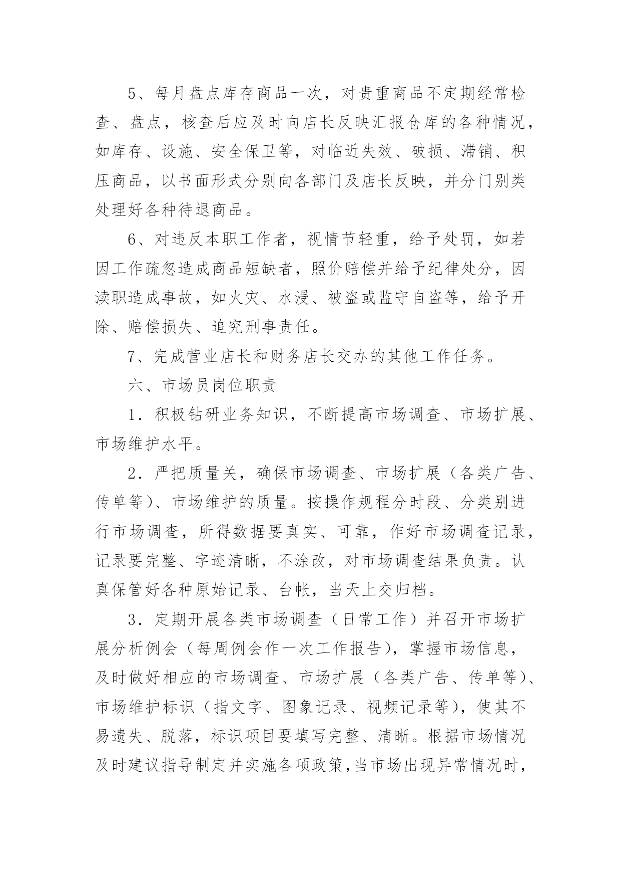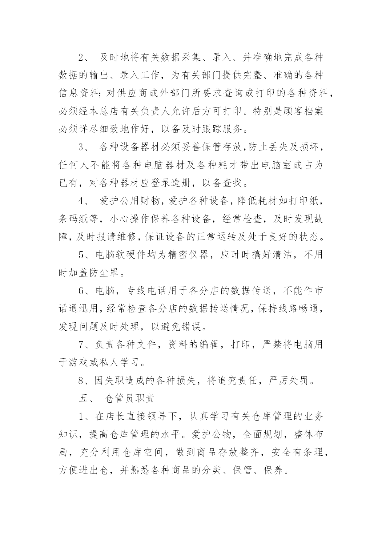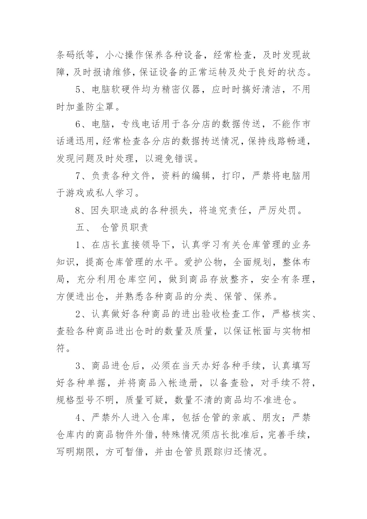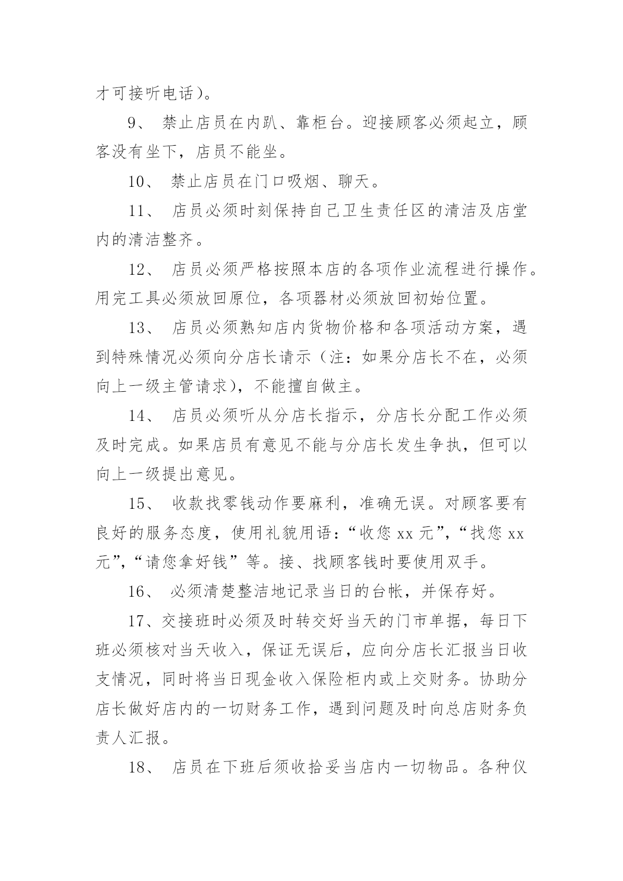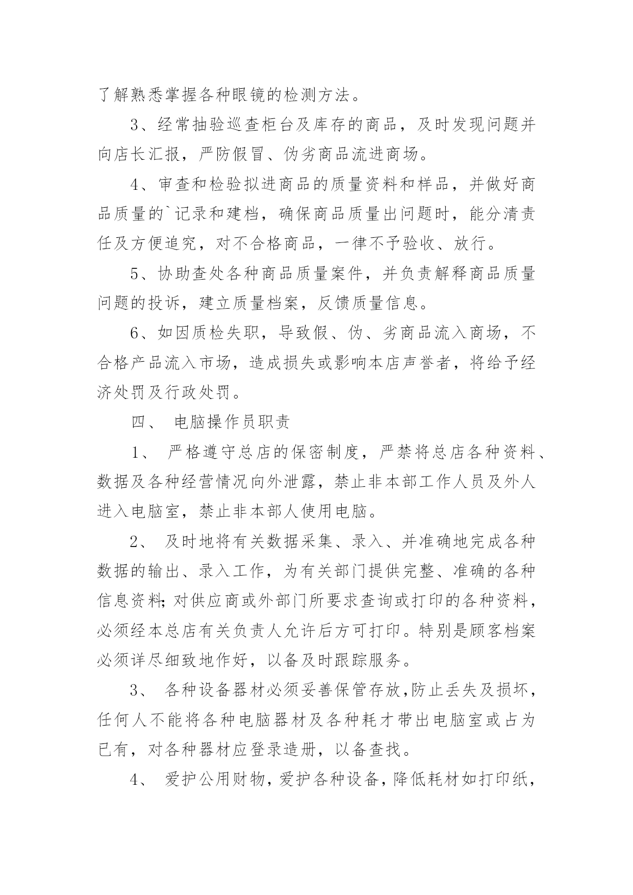 眼镜规章制度1眼镜规章制度在现在的社会生活中,制度的使用频率呈上升趋势,制度是指要求大家共同遵守的办事规程或行动准则。那么什么样的制度才是有效的呢?下面是小编精心整理的眼镜规章制度,希望能够帮助到大家。眼镜规章制度1第1条店员行为规范1、店员上班进入店内必须立即更换制服,穿戴整齐。时刻保持自己的制服平整、干净,仪容整洁。2、店员在店内禁止聚众谈笑、相互聊天、禁止在店堂内打逗、污言秽语。3、店员在店内禁止互相议论其他同事或顾客的是非。4、店员不能随意称呼同事,须直呼姓名,与分店主交谈必须称呼职位。5、店员间必须营造和谐的气氛,精诚团结,相互合作,积极进取。6、店员禁止在店内营业区吃食物、喝水,用餐必须至指定地点。7、接听电话要使用规范用语:“校友眼镜,你好!”或“你好!校友眼镜。”8、店员禁止用总店电话办私事、聊天,接听电话无事即挂(注:如果店员正在接待顾客,必须得到客人同意后,才可接听电话)。9、禁止店员在内趴、靠柜台。迎接顾客必须起立,顾客没有坐下,店员不能坐。10、禁止店员在门口吸烟、聊天。11、店员必须时刻保持自己卫生责任区的清洁及店堂内的清洁整齐。12、店员必须严格按照本店的各项作业流程进行操作。用完工具必须放回原位,各项器材必须放回初始位置。13、店员必须熟知店内货物价格和各项活动方案,遇到特殊情况必须向分店长请示(注:如果分店长不在,必须向上一级主管请求),不能擅自做主。14、店员必须听从分店长指示,分店长分配工作必须及时完成。如果店员有意见不能与分店长发生争执,但可以向上一级提出意见。15、收款找零钱动作要麻利,准确无误。对顾客要有良好的服务态度,使用礼貌用语:“收您xx元”,“找您xx元”,“请您拿好钱”等。接、找顾客钱时要使用双手。16、必须清楚整洁地记录当日的台帐,并保存好。17、交接班时必须及时转交好当天的门市单据,每日下班必须核对当天收入,保证无误后,应向分店长汇报当日收支情况,同时将当日现金收入保险柜内或上交财务。协助分店长做好店内的一切财务工作,遇到问题及时向总店财务负责人汇报。18、店员在下班后须收拾妥当店内一切物品。各种仪器设备复原,套好防尘罩,检查店内的水、电设施,确保无误后方可离店。19、恪尽职守,保守秘密,违者按《校友眼镜店员工保密条例》处罚。20、作好安全工作,因过失或故意使本店遭受损失时,应负赔偿责任。第2条店长职责1、负责本分店的人员聘用,安排好分店内员工的各项工作及休息时间,并作好考勤工作。严禁在店员出勤、考核及业务分配上徇私情,不公平处理。2、定期做好营业内员工各种专业技能培训教育。3、管理好分店各种费用支出。严禁在库存管理和财务制度上徇私舞弊。4、负责本分店的各项维修和商品陈列工作。给予总店必要的广告策划建议。5、做好分店内各项监督管理工作,严禁对重大事故隐瞒真相,假报、谎报。6、严禁不经过总店同意,从厂商私自进货。严禁接受厂商不正当招待和礼物。7、严禁对店员打、骂,进行非人道待遇,或不调查清楚事实真相故意偏袒维护店员。第3条技术员职责一、验光师工作制度1、时刻保持工作室的干净整洁,及时清洗、保养各种仪器设备。2、严格按照总店的验光流程进行操作。3、验光过程中要注意与顾客的交流,了解顾客的试戴感受。4、验光后工具必须放回原位,用完仪器要随时关机。5、书写验光单时,应按要求填写,以便定配员了解情况、及时与顾客沟通。二、加工师工作制度1、时刻保持工作室干净整洁,及时清洗,保养各种仪器设备。2、严格按照本店加工流程进行操作。3、加工眼镜必须要对镜片和镜架进行检查。不能留标志的镜片要事先说明。4、眼镜加工完后,必须进行清洗、调整,经过品检后,方可交给柜台。5、加工后工具必须放回原位,用完仪器要随时关机。6、镜片报损时,必须如实填写报损单,在当天交给库房入帐,不能隐瞒、谎报、遇到问题及时向店长反应。7、每日必须加工完成当天待取的眼镜及当日应该完成的工作,清洁加工室、关闭仪器,确保一切无误后方可下班。三、质检员职责1、在总店长领导下,负责所有商品的质量检查,了解掌握国家有关商品质量的各种规定,做到查、验有法可依。2、努力学习各种业务知识,特别是眼镜检测的知识,了解熟悉掌握各种眼镜的检测方法。3、经常抽验巡查柜台及库存的商品,及时发现问题并向店长汇报,严防假冒、伪劣商品流进商场。4、审查和检验拟进商品的质量资料和样品,并做好商品质量的`记录和建档,确保商品质量出问题时,能分清责任及方便追究,对不合格商品,一律不予验收、放行。5、协助查处各种商品质量案件,并负责解释商品质量问题的投诉,建立质量档案,反馈质量信息。6、如因质检失职,导致假、伪、劣商品流入商场,不合格产品流入市场,造成损失或影响本店声誉者,将给予经济处罚及行政处罚。四、电脑操作员职责1、严格遵守总店的保密制度,严禁将总店各种资