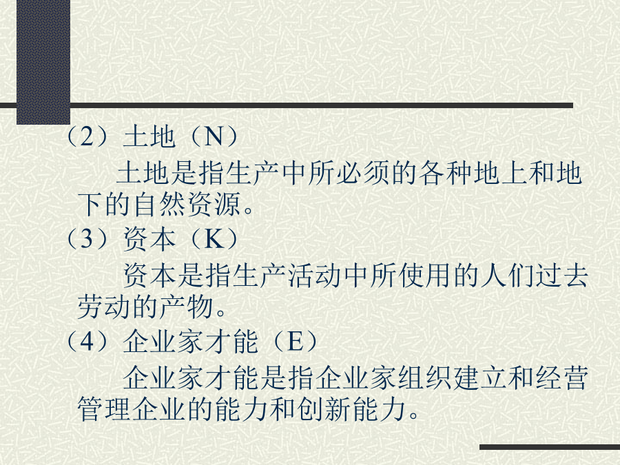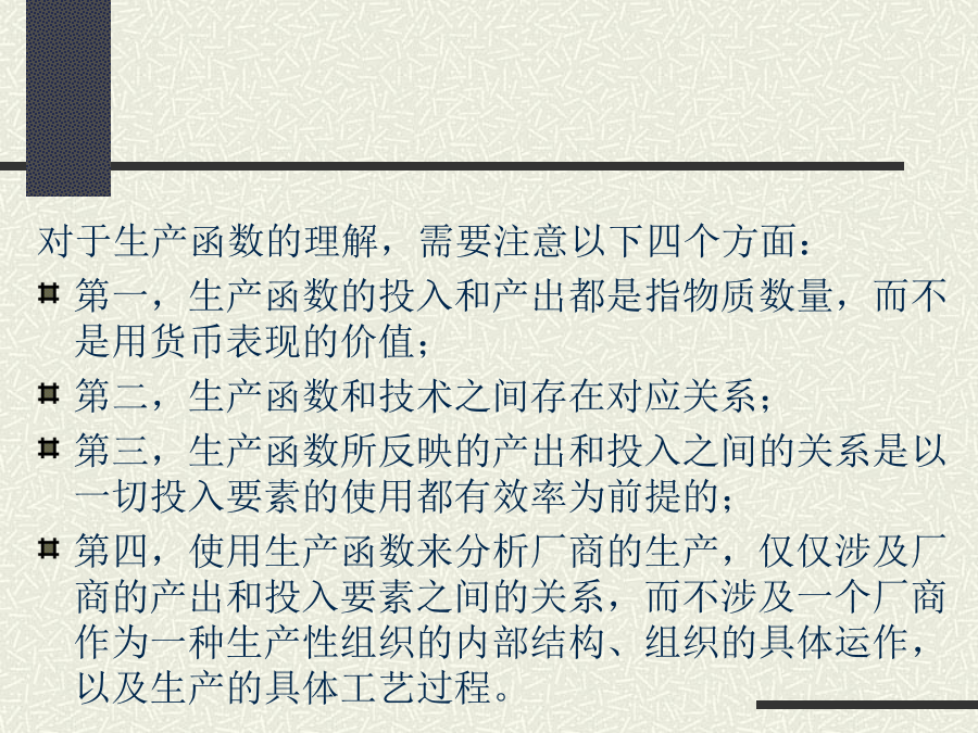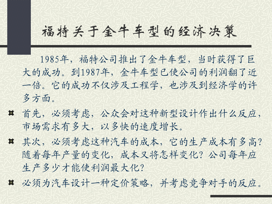 第四章生产理论福特关于金牛车型的经济决策投入的生产要素与产量之间的物质技术关系,即如何增加生产要素以便使产量达到最大成本与收益问题,即对各种成本与收益的经济分析市场问题,即在各种不同的市场条件下厂商如何实现利润的最大化第一节生产与生产要素2.生产要素及其分类二、生产函数2.公式在对产出与投入的生产要素数量之间的关系作具体分析时,土地一般被视为是固定的,而企业家才能又难以估算。为了使研究的问题简化,经济学家把投入的生产要素假定为只有劳动和资本两种。产出则假定为只有一种产品。这样的假定对于分析的结果不会产生实质性影响。于是生产函数可以表示为:Q=f(L,K)三、两种常见的生产函数2.柯布—道格拉斯生产函数第二节边际收益递减规律与一种生产要素的合理投入一、总产量、平均产量、边际产量2.总产量、平均产量和边际产量之间的关系(1)总产量与边际产量之间的关系。从图上可以看出,当边际产量为正时,总产量上升;当边际产量为零时,总产量达到最高点;当边际产量为负时,总产量下降。由边际产量的定义可以知道,边际产量实际上是总产量曲线的斜率值。因此,当总产量曲线的斜率达到最大值时,边际产量的取值也同时达到最大。二、边际收益(边际报酬)递减规律对于边际报酬递减规律,须注意的是:三、一种生产要素的合理投入(1)第Ⅰ阶段产量曲线的特征是:劳动的总产量始终是增加的。劳动的平均产量始终是上升的,而且达到最大值。劳动的边际产量上升达到最大值,并在达到最大值之后开始下降,但是劳动的边际产量始终大于劳动的平均产量。(2)第Ⅲ阶段产量曲线的特征是:劳动的总产量呈下降趋势,劳动的平均产量始终是下降的,劳动的边际产量为负值。作业:三季稻不如两季稻第三节生产要素的最适组合图4.3资本、劳动四种组合的等产量线等产量线是一条向右下方倾斜的线,其斜率为负值。在同一平面图上,可以有无数条等产量线。在同一平面图上,任意两条等产量线不能相交。等产量线是一条凸向原点的线。3.边际技术替代率在维持产量不变的前提下,当一种生产要素的投入量不断增加时,每一单位的这种生产要素所能替代的另一种生产要素的数量是递减的。这一现象被称为边际技术替代率递减规律。解释:以劳动对资本的替代为例,随着劳动对资本的不断替代,劳动的边际产量逐渐下降,资本的边际产量则逐渐上升。因此,随着劳动对资本的不断替代,作为逐渐下降的劳动的边际产量与逐步上升的资本的边际产量之比的边际技术替代率是递减的。边际技术替代率递减规律使得右下方倾斜的等产量曲线必然凸向原点。三、等成本线3.公式4.特点四、生产要素最适组合假定厂商用两种可变生产要素劳动和资本生产一种产品,它们的价格和厂商用于购买两种要的成本是已知的。图4-6唯一的等成本线AB与其中一条等产量曲线Q2相切于E点,该点表示在既定成本条件下,厂商应该按照E点的要素组合投入劳动和资本进行生产可以得到最大的产量,称为均衡点。两条曲线相切意味着在切点它们的斜率相等。也就是说只有在两要素的边际技术替代率和两要素的价格比例相等时,生产者才能实现生产的均衡。图4-6成本既定条件下产量最大的要素投入组合技术效率最优的另一种形式就是生产者在期望得到一个既定的产量时会要求生产成本最小。这可以用图4-7来说明。唯一的等产量曲线Q代表既定的产量。三条等成本线具有相同的斜率(即表示劳动与资本要素的价格是确定的),但代表了三个不同的成本支出水平。等产量曲线Q与等成本线AB相切于E点,这就是生产的均衡点。只有在等产量曲线的等成本线的切点为E才是既定产量条件下实现最小成本的要素组合。图4-7产量既定条件下成本最小的要素组合想象自己是一家饭店的老板。现在你只是有一个开饭店的念头,资本(房子、设备等)、劳动等都还没确定,你需要统筹规划。那么,你是要开一个小饭店好呢?还是开一个大饭店好呢?你可能毫不犹豫地回答:只要钱够,当然越大越好喽。经济学家是这样认为么?第四节规模收益(1)规模报酬递增:产量增加的比例大于各种生产要素投入量增加的比例。事实上,规模经济是长期规模报酬递增的一种表现形式。(2)规模报酬不变:产量增加的比例等于各种生产要素增加的比例。(3)规模报酬递减:产量增加的比例小于各种生产要素增加的比例。规模报酬递减的主要原因是由于厂商生产规模过大,使得生产的各个方面难以得到有效的协调,从而降低了生产效率。图4-9规模收益递减2.规模经济规模经济是指在技术水平不变的情况下,当两种生产要素按同样的比例增加,即生产规模扩大时,最初这种生产规模扩大会使产量的增加大于生产规模的扩大,但当规模的扩大超过一定限度时,则会使产量的增加小于生产规模的扩大,甚至使产量绝对减少,出现规模不经济。“淝水之战”的故事1“淝水之战”的故事2“淝水之战”的故事3“淝水之战”的故事4由“淝水之战”的故