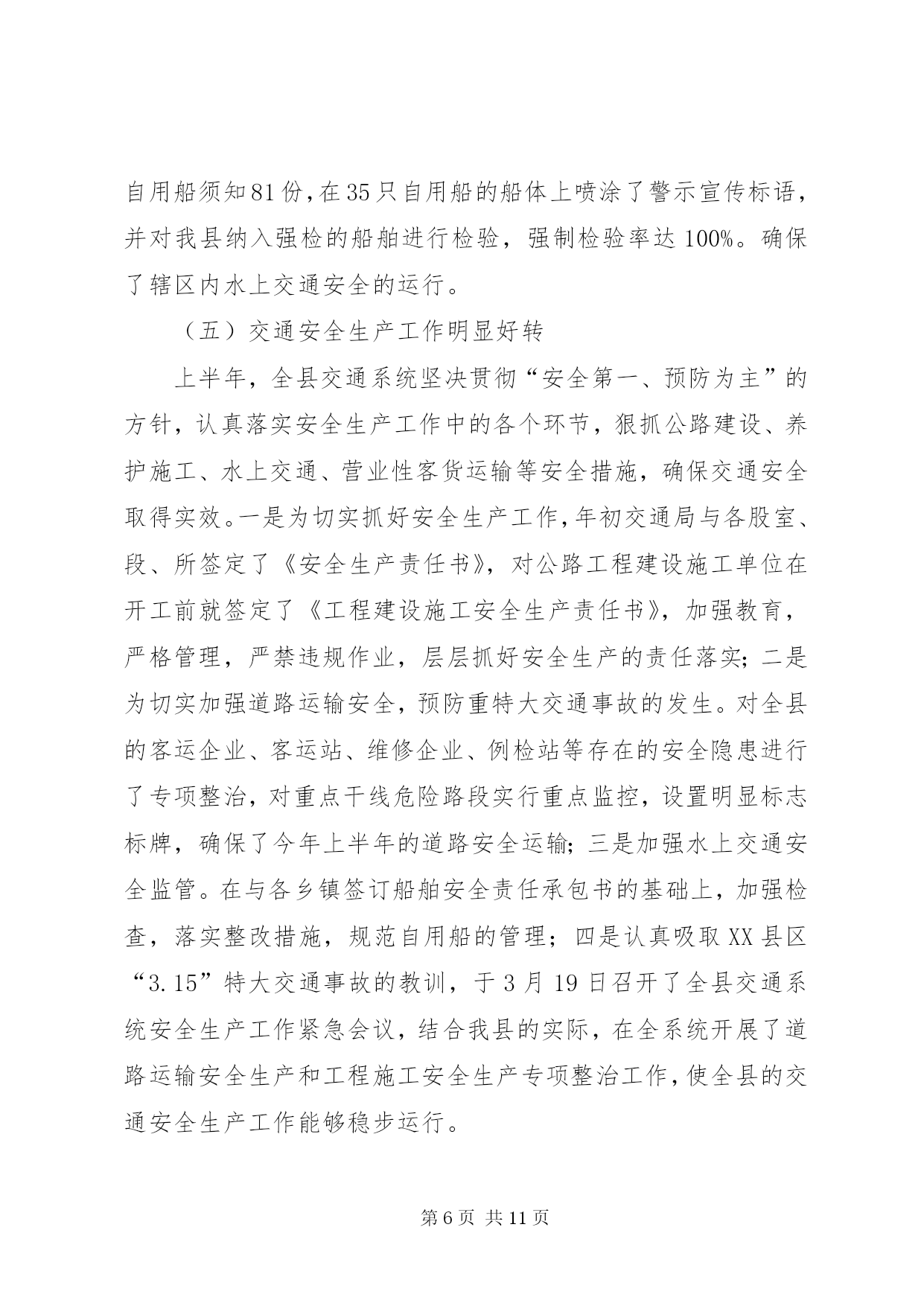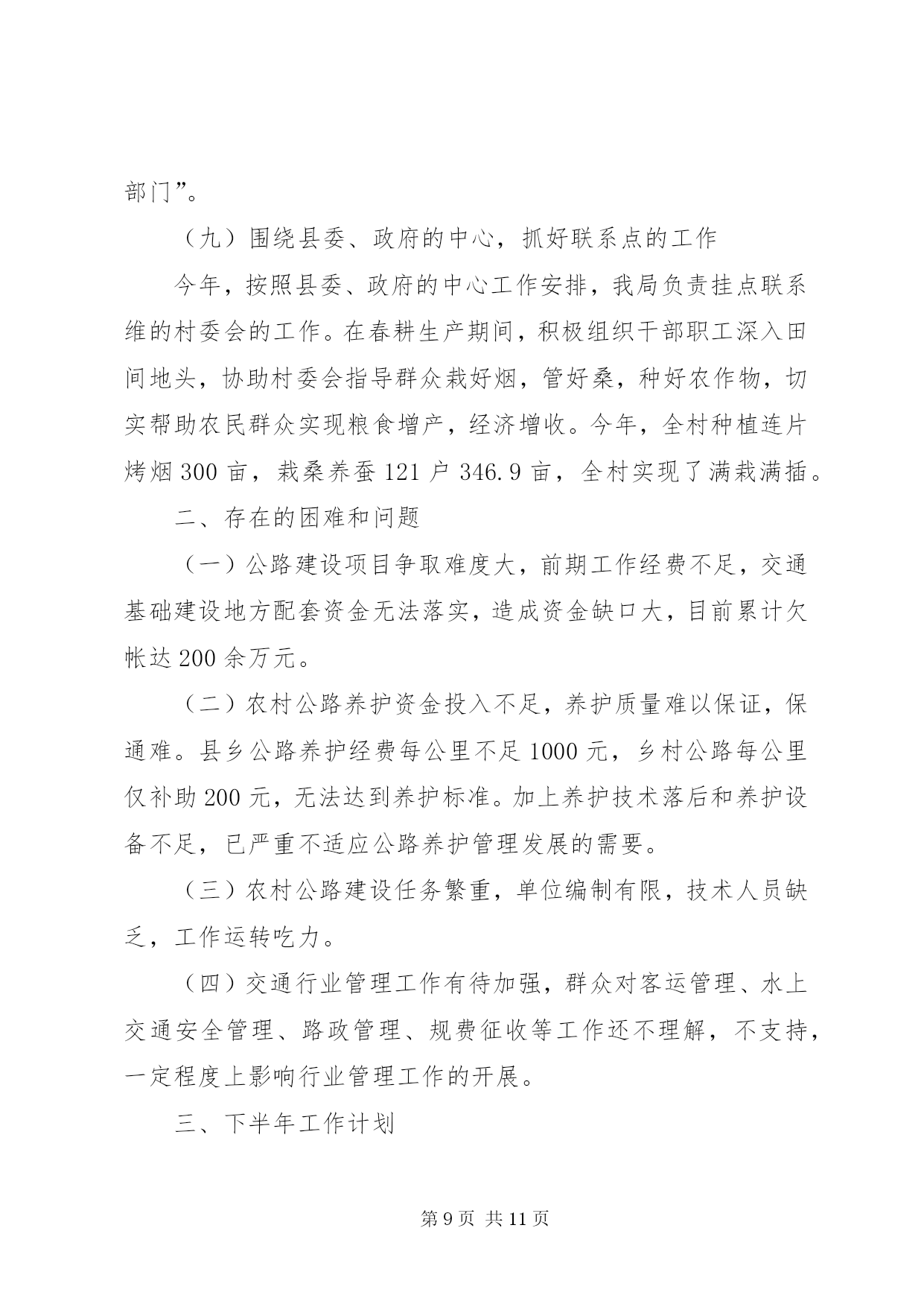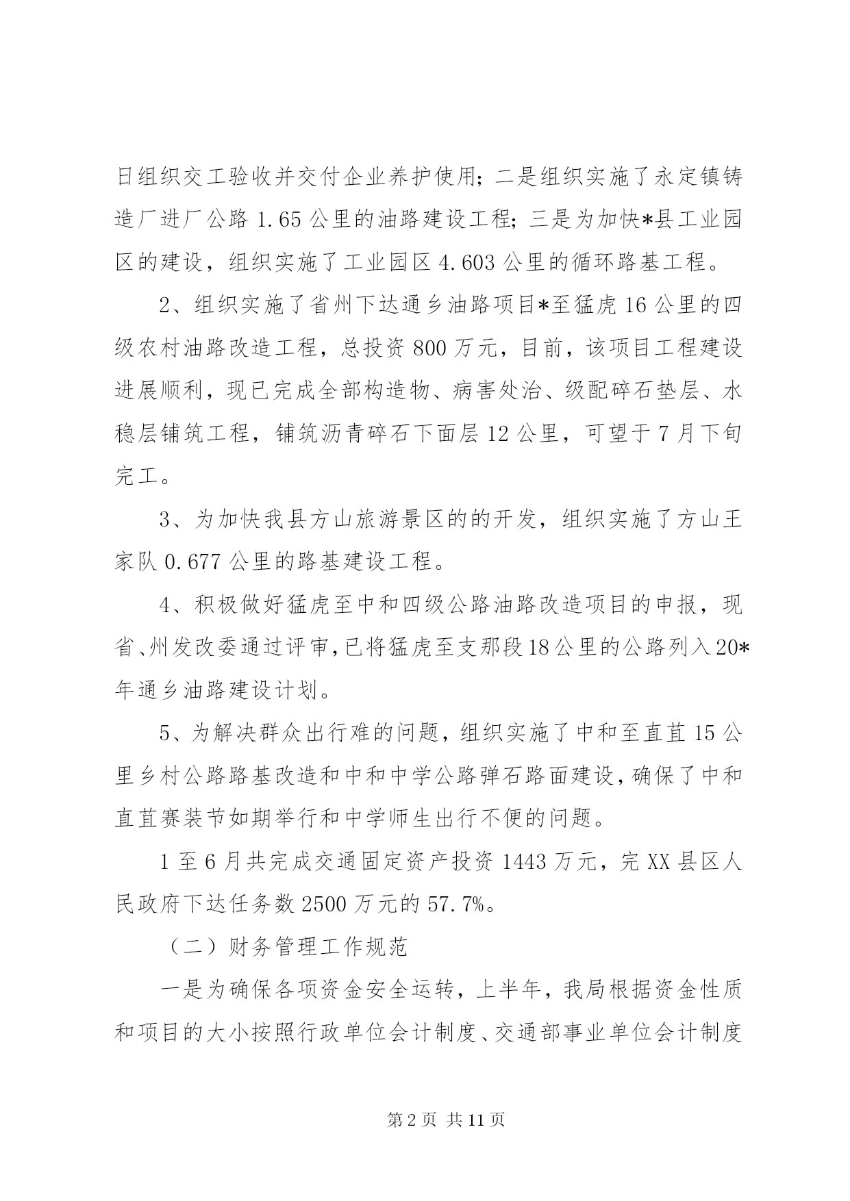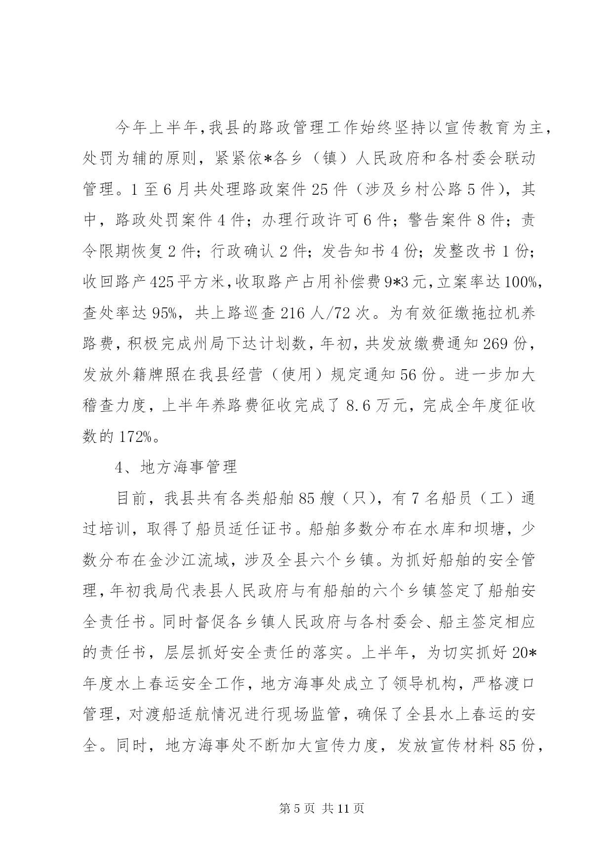 第PAGE\*Arabic\*MERGEFORMAT11页共NUMPAGES\*MERGEFORMAT11页县交通局上半年管理总结及计划年初以来,我局在县委、县人民政府的正确领导下,在州交通局的关心帮助下,在各有关部门的大力支持配合下,交通系统广大干部职工高举邓小平理论伟大旗帜,认真践行“三个代表”重要思想,全面贯彻党的*精神和省第八次党代会、州第七次党代会、县第十一次党代会议精神,紧紧围绕县委、政府的工作思路,统一思想、认真履职,不断加强交通行业的管理和创新,努力加快我县交通基础设施建设,全力推进交通各项工作向前发展。半年来,全县交通工作进展顺利,各项工作按照年初计划稳步推进。现就上半年的工作总结如下:一、上半年主要工作情况(一)交通基础设施建设进展顺利加快交通基础设施建设步伐是建设社会主义新农村的要求,是促进农村社会经济发展的重要保障。上半年,我局紧紧围绕县委、政府和上级部门对交通工作的要求,认真抓紧组织实施各项工程建设。1、为全面推进县委“工业强县”的战略目标,解决企业公路不通,路面硬化率低,影响企业发展的实际,县交通局克服困难,积极申报项目,为企业发展当好交通先行。一是新开建了直苴至桂花(*段)公路12公里的县际公路,解决了直苴铜矿因公路不通,无法进场开发的问题。该工程于1月5日开工,6月22日组织交工验收并交付企业养护使用;二是组织实施了永定镇铸造厂进厂公路1.65公里的油路建设工程;三是为加快*县工业园区的建设,组织实施了工业园区4.603公里的循环路基工程。2、组织实施了省州下达通乡油路项目*至猛虎16公里的四级农村油路改造工程,总投资800万元,目前,该项目工程建设进展顺利,现已完成全部构造物、病害处治、级配碎石垫层、水稳层铺筑工程,铺筑沥青碎石下面层12公里,可望于7月下旬完工。3、为加快我县方山旅游景区的的开发,组织实施了方山王家队0.677公里的路基建设工程。4、积极做好猛虎至中和四级公路油路改造项目的申报,现省、州发改委通过评审,已将猛虎至支那段18公里的公路列入20*年通乡油路建设计划。5、为解决群众出行难的问题,组织实施了中和至直苴15公里乡村公路路基改造和中和中学公路弹石路面建设,确保了中和直苴赛装节如期举行和中学师生出行不便的问题。1至6月共完成交通固定资产投资1443万元,完XX县区人民政府下达任务数2500万元的57.7%。(二)财务管理工作规范一是为确保各项资金安全运转,上半年,我局根据资金性质和项目的大小按照行政单位会计制度、交通部事业单位会计制度和国家建设单位会计制度之规定实行行政、公路、基建三套帐规范核算。1至5月完成了三套帐的会计核算工作,使各项资金做到帐目清楚,资金安全。二是积极协调拨入重点工程资金,严格按工程进度拨付工程款,做到专项资金专款专用,确保各项重点工程顺利实施,1至6月共拨入工程建设资金及工作经费420.90万元,拨付工程款849.30万元。三是搞好各项资金的清理和审计。配合州审计组完成了20*—20*年度的财政扶贫专项资金的审计;对地方公路管理段20*年度的财务管理和资金收支情况进行了清理检查;协助星源会计师事务所完成了宜就客运站、猛虎客运站和店子希望小学的工程竣工结算和审计工作。(三)交通项目申报、前期工作成效明显。1至6月我局按照县委、县人民政府以项目带动发展的要求,积极做好项目申报、储备、前期准备工作。一是向省州交通部门申报农村公路、客运站点建设项目39项,规划投资1.3亿元;二是向县发改委申报交通建设项目11项,规划投资4180万元;三是结合新农村建设项目向县扶贫办申报交通项目5项,规划投资7000余万元。同时通过加强项目前期跟踪协调,省州预计划下达我县20*年交通基础建设项目17项,改造公路里程138公里,中央投资补助资金2300余万元。目前我局正组织实施外业测设工作。(四)交通行业管理工作得到加强1、公路养护今年年初以来,县地方公路管理段在公路养护管理工作中,积极引入竞争机制,同各道班班长签定了《*省劳动合同书》,并根据《*州交通局县乡公路养护与管理考核责任书》和《县乡公路养护质量考核办法》的内容和要求,进一步完善了《*县县乡公路养护管理制度》。采取职工工资和公路养护挂钩的方式,强化了养护管理工作。通过二季度的养护质量查评,公路养护好路率重点公路为81.3%,一般公路为68.5%,比去年同期有所提高。上半年完成备料2150立方米,清除公路坍方3150立方米,确保了公路安全畅通。2、运政管理截至6月底,全县共有客运经营车辆93辆,货运经营车辆300辆,1至6月完成客运量30万人次,周转量2600万人公里,有维修业户65户,从业人员96人。上半年,共征收运管费22万元,作出行政许可45份。为进一步加强驾驶员培训和运输辅助业管理,严厉