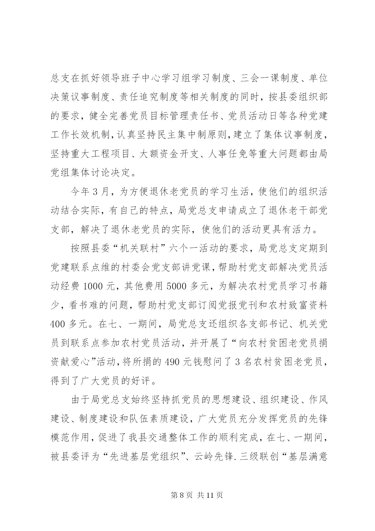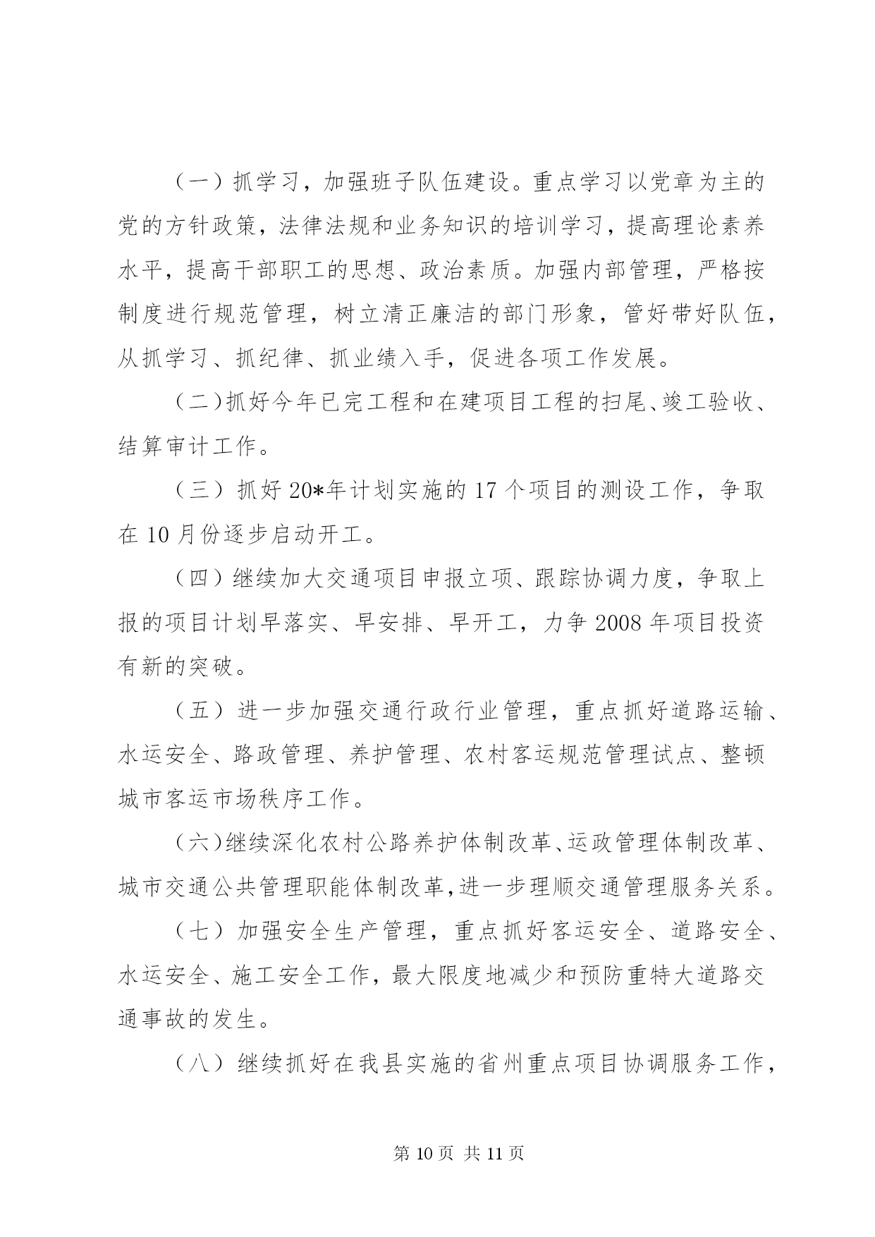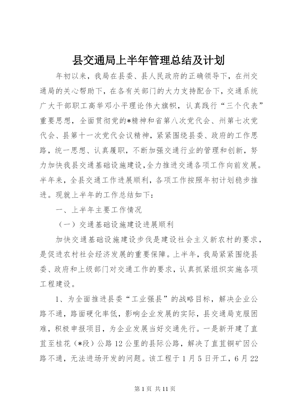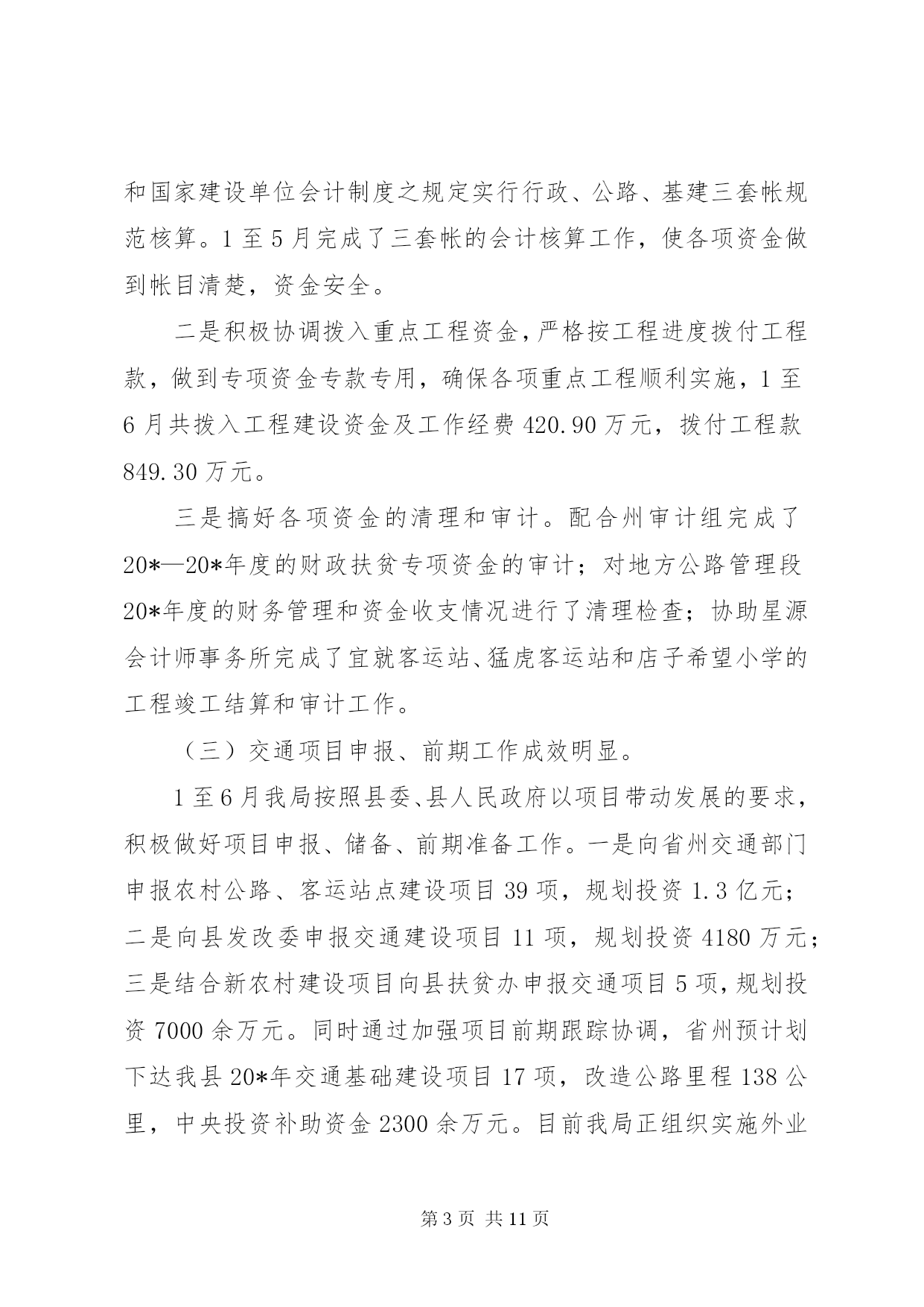 第PAGE\*Arabic\*MERGEFORMAT11页共NUMPAGES\*MERGEFORMAT11页县交通局上半年管理总结及计划年初以来,我局在县委、县人民政府的正确领导下,在州交通局的关心帮助下,在各有关部门的大力支持配合下,交通系统广大干部职工高举邓小平理论伟大旗帜,认真践行“三个代表”重要思想,全面贯彻党的*精神和省第八次党代会、州第七次党代会、县第十一次党代会议精神,紧紧围绕县委、政府的工作思路,统一思想、认真履职,不断加强交通行业的管理和创新,努力加快我县交通基础设施建设,全力推进交通各项工作向前发展。半年来,全县交通工作进展顺利,各项工作按照年初计划稳步推进。现就上半年的工作总结如下:一、上半年主要工作情况(一)交通基础设施建设进展顺利加快交通基础设施建设步伐是建设社会主义新农村的要求,是促进农村社会经济发展的重要保障。上半年,我局紧紧围绕县委、政府和上级部门对交通工作的要求,认真抓紧组织实施各项工程建设。1、为全面推进县委“工业强县”的战略目标,解决企业公路不通,路面硬化率低,影响企业发展的实际,县交通局克服困难,积极申报项目,为企业发展当好交通先行。一是新开建了直苴至桂花(*段)公路12公里的县际公路,解决了直苴铜矿因公路不通,无法进场开发的问题。该工程于1月5日开工,6月22日组织交工验收并交付企业养护使用;二是组织实施了永定镇铸造厂进厂公路1.65公里的油路建设工程;三是为加快*县工业园区的建设,组织实施了工业园区4.603公里的循环路基工程。2、组织实施了省州下达通乡油路项目*至猛虎16公里的四级农村油路改造工程,总投资800万元,目前,该项目工程建设进展顺利,现已完成全部构造物、病害处治、级配碎石垫层、水稳层铺筑工程,铺筑沥青碎石下面层12公里,可望于7月下旬完工。3、为加快我县方山旅游景区的的开发,组织实施了方山王家队0.677公里的路基建设工程。4、积极做好猛虎至中和四级公路油路改造项目的申报,现省、州发改委通过评审,已将猛虎至支那段18公里的公路列入20*年通乡油路建设计划。5、为解决群众出行难的问题,组织实施了中和至直苴15公里乡村公路路基改造和中和中学公路弹石路面建设,确保了中和直苴赛装节如期举行和中学师生出行不便的问题。1至6月共完成交通固定资产投资1443万元,完XX县区人民政府下达任务数2500万元的57.7%。(二)财务管理工作规范一是为确保各项资金安全运转,上半年,我局根据资金性质和项目的大小按照行政单位会计制度、交通部事业单位会计制度和国家建设单位会计制度之规定实行行政、公路、基建三套帐规范核算。1至5月完成了三套帐的会计核算工作,使各项资金做到帐目清楚,资金安全。二是积极协调拨入重点工程资金,严格按工程进度拨付工程款,做到专项资金专款专用,确保各项重点工程顺利实施,1至6月共拨入工程建设资金及工作经费420.90万元,拨付工程款849.30万元。三是搞好各项资金的清理和审计。配合州审计组完成了20*—20*年度的财政扶贫专项资金的审计;对地方公路管理段20*年度的财务管理和资金收支情况进行了清理检查;协助星源会计师事务所完成了宜就客运站、猛虎客运站和店子希望小学的工程竣工结算和审计工作。(三)交通项目申报、前期工作成效明显。1至6月我局按照县委、县人民政府以项目带动发展的要求,积极做好项目申报、储备、前期准备工作。一是向省州交通部门申报农村公路、客运站点建设项目39项,规划投资1.3亿元;二是向县发改委申报交通建设项目11项,规划投资4180万元;三是结合新农村建设项目向县扶贫办申报交通项目5项,规划投资7000余万元。同时通过加强项目前期跟踪协调,省州预计划下达我县20*年交通基础建设项目17项,改造公路里程138公里,中央投资补助资金2300余万元。目前我局正组织实施外业测设工作。(四)交通行业管理工作得到加强1、公路养护今年年初以来,县地方公路管理段在公路养护管理工作中,积极引入竞争机制,同各道班班长签定了《*省劳动合同书》,并根据《*州交通局县乡公路养护与管理考核责任书》和《县乡公路养护质量考核办法》的内容和要求,进一步完善了《*县县乡公路养护管理制度》。采取职工工资和公路养护挂钩的方式,强化了养护管理工作。通过二季度的养护质量查评,公路养护好路率重点公路为81.3%,一般公路为68.5%,比去年同期有所提高。上半年完成备料2150立方米,清除公路坍方3150立方米,确保了公路安全畅通。2、运政管理截至6月底,全县共有客运经营车辆93辆,货运经营车辆300辆,1至6月完成客运量30万人次,周转量2600万人公里,有维修业户65户,从业人员96人。上半年,共征收运管费22万元,作出行政许可45份。为进一步加强驾驶员培训和运输辅助业管理,严厉