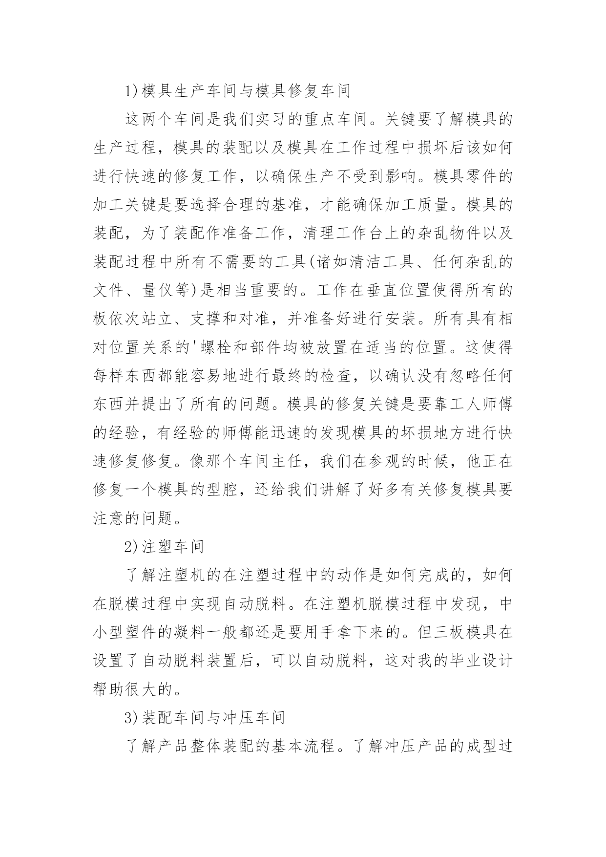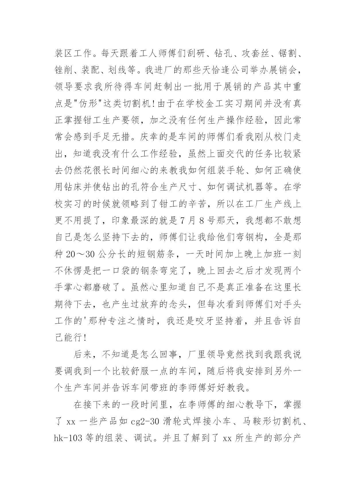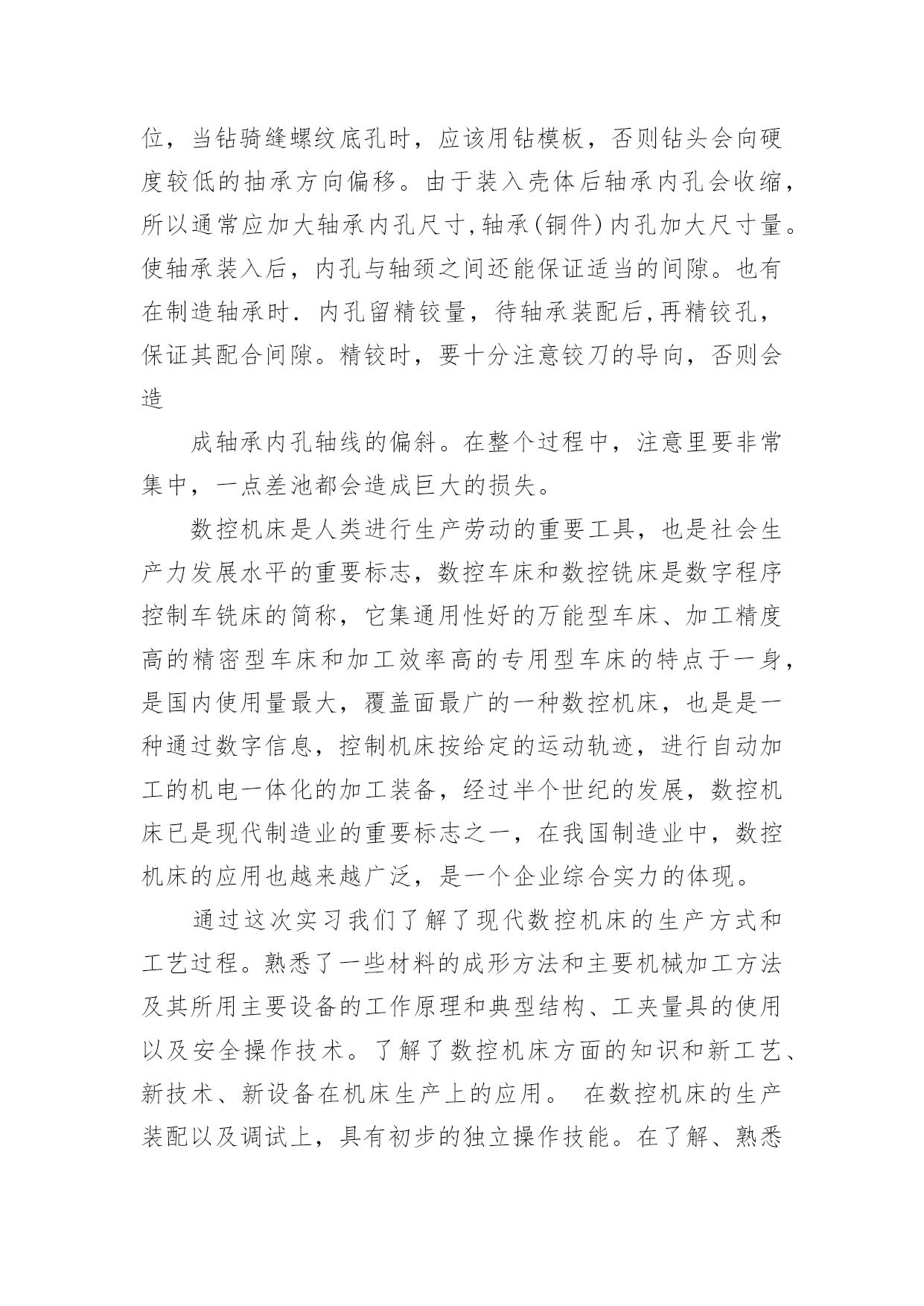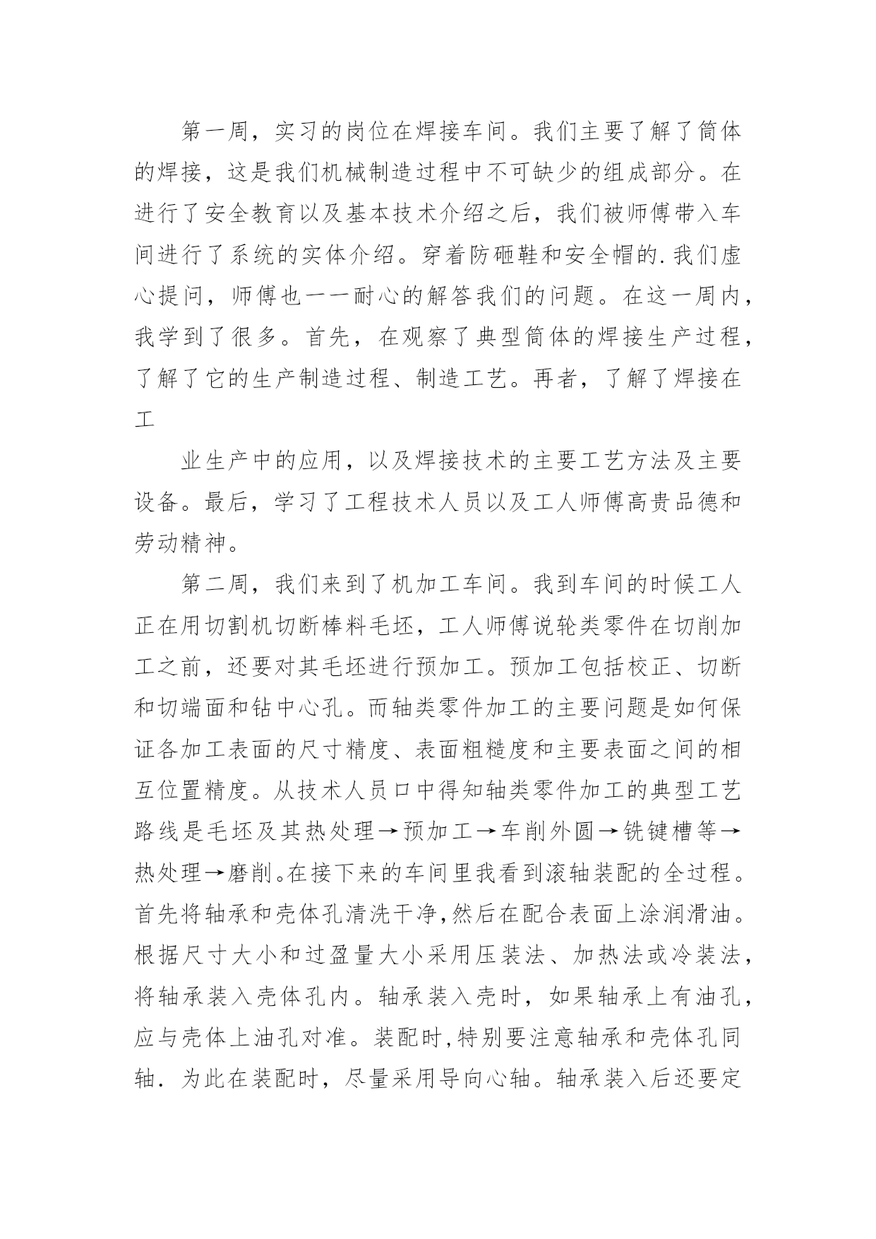 机械厂实习总结机械厂实习总结11篇总结是对某一阶段的工作、学习或思想中的经验或情况进行分析研究的书面材料,它有助于我们寻找工作和事物发展的规律,从而掌握并运用这些规律,为此要我们写一份总结。总结一般是怎么写的呢?以下是小编整理的机械厂实习总结,欢迎阅读,希望大家能够喜欢。机械厂实习总结1美好的时光总是过的如此之快,我已在平高集团有限公司机械制造事业部轮岗实习了两周时间。在这两周的虚心学习的时间内,有过艰辛努力获得成功的喜悦,也有遇到困难和挫折时的无奈。从当初走出大学校园时的青涩与迷茫,到现在在实习岗位的稳重与坦然,我顺利的完成了人生中的一次重要的角色转变。在各位公司领导的关心和车间师傅的指导下,初步学习了公司的企业文化、管理模式和规章制度,并且通过轮换岗位的实习安排,较为系统地学习了一个产品生产过程中的各个环节所用的工艺及设备。了解了从最初的下料,到铣、钻、车、镗、磨以及焊接等各个加工环节所用到的设备及工艺工装,包括各种模具焊具工装夹具等等。通过这种轮岗实习,能在短时间内学到比较多的知识和技能。第一周,实习的岗位在焊接车间。我们主要了解了筒体的焊接,这是我们机械制造过程中不可缺少的组成部分。在进行了安全教育以及基本技术介绍之后,我们被师傅带入车间进行了系统的实体介绍。穿着防砸鞋和安全帽的.我们虚心提问,师傅也一一耐心的解答我们的问题。在这一周内,我学到了很多。首先,在观察了典型筒体的焊接生产过程,了解了它的生产制造过程、制造工艺。再者,了解了焊接在工业生产中的应用,以及焊接技术的主要工艺方法及主要设备。最后,学习了工程技术人员以及工人师傅高贵品德和劳动精神。第二周,我们来到了机加工车间。我到车间的时候工人正在用切割机切断棒料毛坯,工人师傅说轮类零件在切削加工之前,还要对其毛坯进行预加工。预加工包括校正、切断和切端面和钻中心孔。而轴类零件加工的主要问题是如何保证各加工表面的尺寸精度、表面粗糙度和主要表面之间的相互位置精度。从技术人员口中得知轴类零件加工的典型工艺路线是毛坯及其热处理→预加工→车削外圆→铣键槽等→热处理→磨削。在接下来的车间里我看到滚轴装配的全过程。首先将轴承和壳体孔清洗干净,然后在配合表面上涂润滑油。根据尺寸大小和过盈量大小采用压装法、加热法或冷装法,将轴承装入壳体孔内。轴承装入壳时,如果轴承上有油孔,应与壳体上油孔对准。装配时,特别要注意轴承和壳体孔同轴.为此在装配时,尽量采用导向心轴。轴承装入后还要定位,当钻骑缝螺纹底孔时,应该用钻模板,否则钻头会向硬度较低的抽承方向偏移。由于装入壳体后轴承内孔会收缩,所以通常应加大轴承内孔尺寸,轴承(铜件)内孔加大尺寸量。使轴承装入后,内孔与轴颈之间还能保证适当的间隙。也有在制造轴承时.内孔留精铰量,待轴承装配后,再精铰孔,保证其配合间隙。精铰时,要十分注意铰刀的导向,否则会造成轴承内孔轴线的偏斜。在整个过程中,注意里要非常集中,一点差池都会造成巨大的损失。数控机床是人类进行生产劳动的重要工具,也是社会生产力发展水平的重要标志,数控车床和数控铣床是数字程序控制车铣床的简称,它集通用性好的万能型车床、加工精度高的精密型车床和加工效率高的专用型车床的特点于一身,是国内使用量最大,覆盖面最广的一种数控机床,也是是一种通过数字信息,控制机床按给定的运动轨迹,进行自动加工的机电一体化的加工装备,经过半个世纪的发展,数控机床已是现代制造业的重要标志之一,在我国制造业中,数控机床的应用也越来越广泛,是一个企业综合实力的体现。通过这次实习我们了解了现代数控机床的生产方式和工艺过程。熟悉了一些材料的成形方法和主要机械加工方法及其所用主要设备的工作原理和典型结构、工夹量具的使用以及安全操作技术。了解了数控机床方面的知识和新工艺、新技术、新设备在机床生产上的应用。在数控机床的生产装配以及调试上,具有初步的独立操作技能。在了解、熟悉和掌握一定的数控机床的基础知识和操作技能过程中,培养、提高和加强了我的动手能力、创新意识和创新能力。这次实习,让我们明白做事要认真小心细致,不得有半点马虎。同时也培养了我们坚强不屈的本质,不到最后一秒决不放弃的毅力!培养和锻炼了劳动观点、质量和经济观念,强化遵守劳动纪律、遵守安全技术规则和爱护国家财产的自觉性,提高了我们的整体综合素质。让我在日后的工作生涯中更能圆满的去完成平高集团交给我的任务。机械厂实习总结2工程学院学号姓名1.实习目的、意义本次实习是专门为毕业设计做准备的,因此,我在实习过程中主要是参观德豪润达公司里的注塑车间﹑模具修复车间和模具生产车间。具体要了解的是有关注塑模具的工作过程,模具的安装和修复等。通过掌握这些基本的感性素材后,毕业设计就要正式开始了,所以这次实习为我的毕业设计奠定了一定的基础。有了感性材料后,我的毕业设计就不会凭空而作了,真正做到