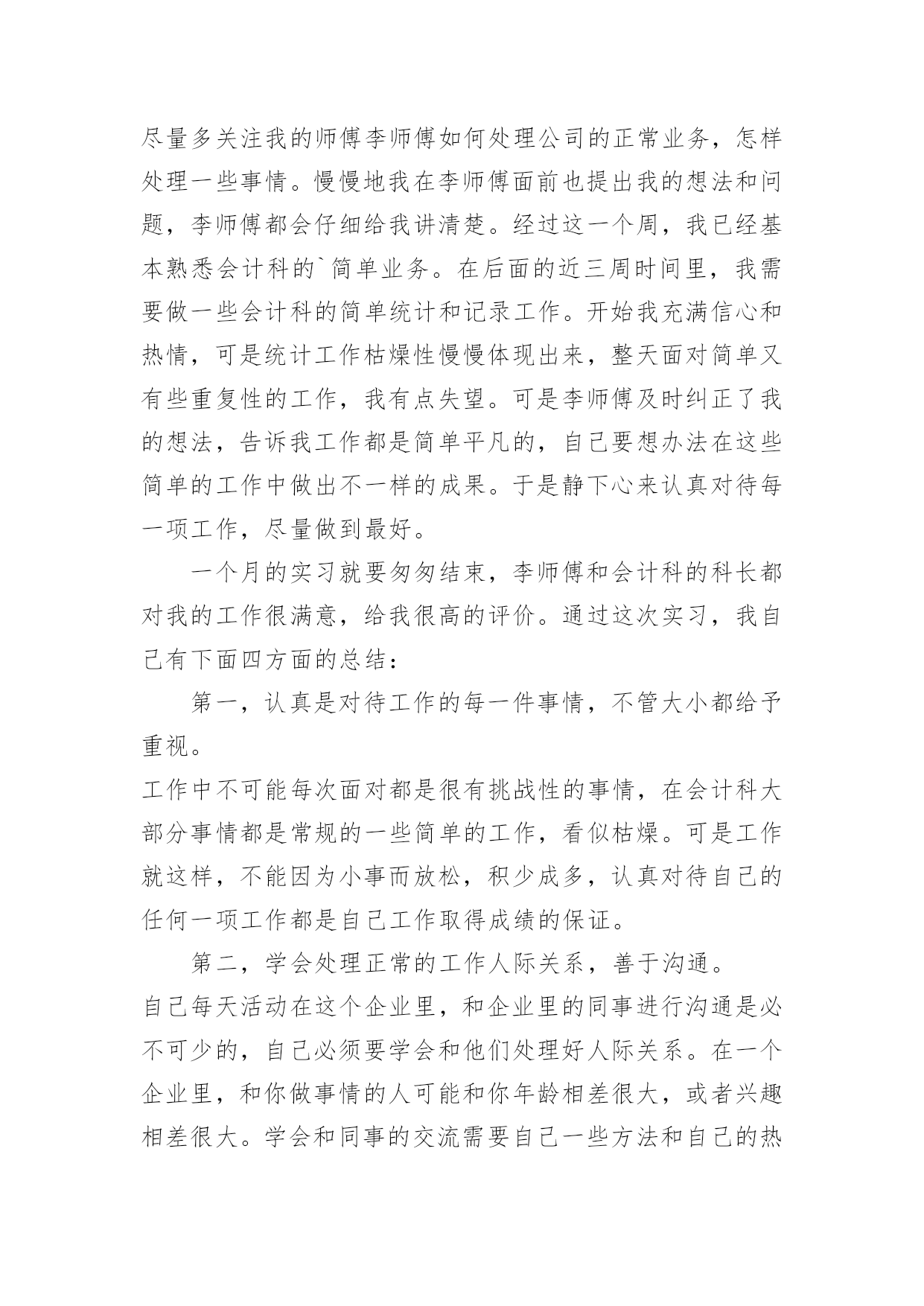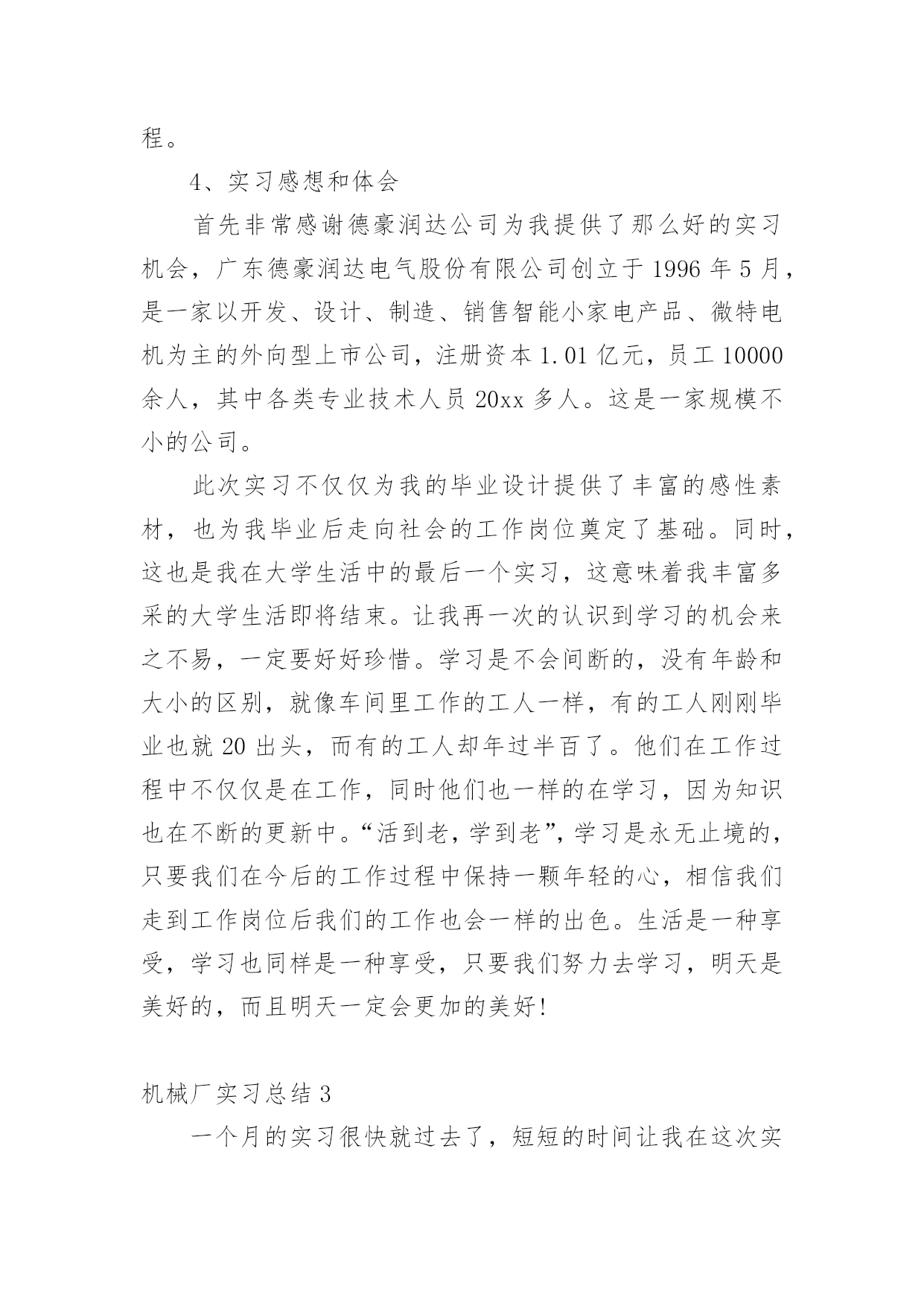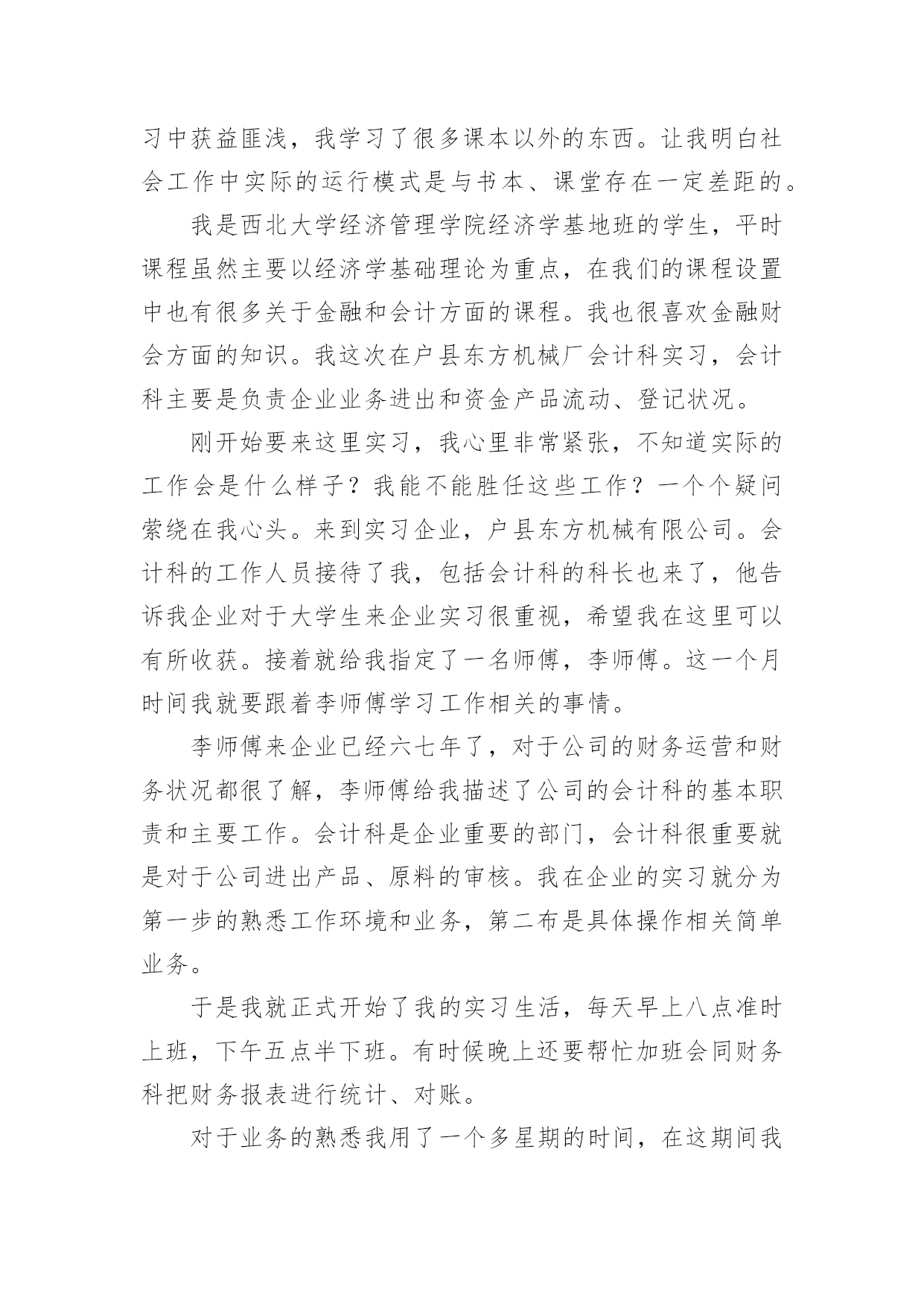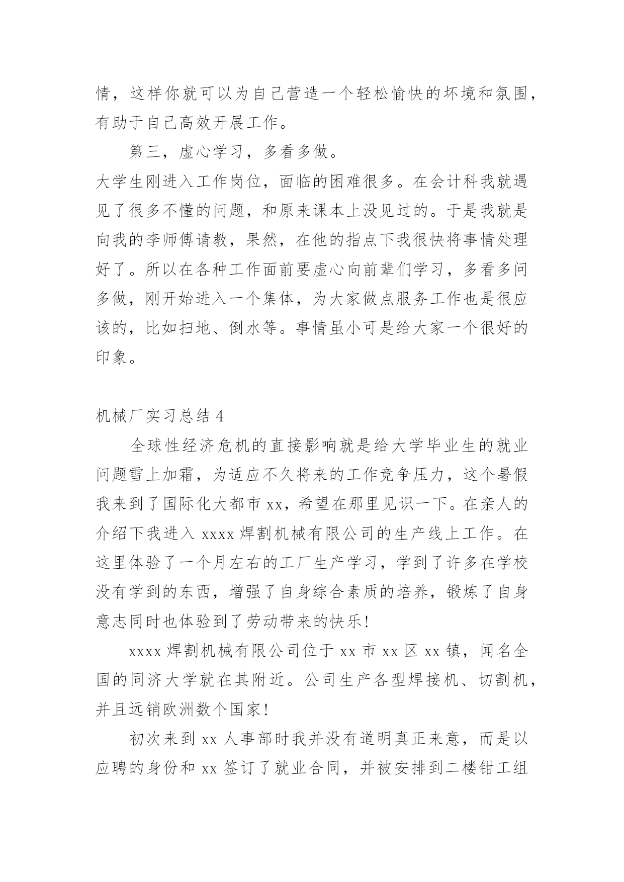 机械厂实习总结机械厂实习总结11篇总结是对某一阶段的工作、学习或思想中的经验或情况进行分析研究的书面材料,它有助于我们寻找工作和事物发展的规律,从而掌握并运用这些规律,为此要我们写一份总结。总结一般是怎么写的呢?以下是小编整理的机械厂实习总结,欢迎阅读,希望大家能够喜欢。机械厂实习总结1美好的时光总是过的如此之快,我已在平高集团有限公司机械制造事业部轮岗实习了两周时间。在这两周的虚心学习的时间内,有过艰辛努力获得成功的喜悦,也有遇到困难和挫折时的无奈。从当初走出大学校园时的青涩与迷茫,到现在在实习岗位的稳重与坦然,我顺利的完成了人生中的一次重要的角色转变。在各位公司领导的关心和车间师傅的指导下,初步学习了公司的企业文化、管理模式和规章制度,并且通过轮换岗位的实习安排,较为系统地学习了一个产品生产过程中的各个环节所用的工艺及设备。了解了从最初的下料,到铣、钻、车、镗、磨以及焊接等各个加工环节所用到的设备及工艺工装,包括各种模具焊具工装夹具等等。通过这种轮岗实习,能在短时间内学到比较多的知识和技能。第一周,实习的岗位在焊接车间。我们主要了解了筒体的焊接,这是我们机械制造过程中不可缺少的组成部分。在进行了安全教育以及基本技术介绍之后,我们被师傅带入车间进行了系统的实体介绍。穿着防砸鞋和安全帽的.我们虚心提问,师傅也一一耐心的解答我们的问题。在这一周内,我学到了很多。首先,在观察了典型筒体的焊接生产过程,了解了它的生产制造过程、制造工艺。再者,了解了焊接在工业生产中的应用,以及焊接技术的主要工艺方法及主要设备。最后,学习了工程技术人员以及工人师傅高贵品德和劳动精神。第二周,我们来到了机加工车间。我到车间的时候工人正在用切割机切断棒料毛坯,工人师傅说轮类零件在切削加工之前,还要对其毛坯进行预加工。预加工包括校正、切断和切端面和钻中心孔。而轴类零件加工的主要问题是如何保证各加工表面的尺寸精度、表面粗糙度和主要表面之间的相互位置精度。从技术人员口中得知轴类零件加工的典型工艺路线是毛坯及其热处理→预加工→车削外圆→铣键槽等→热处理→磨削。在接下来的车间里我看到滚轴装配的全过程。首先将轴承和壳体孔清洗干净,然后在配合表面上涂润滑油。根据尺寸大小和过盈量大小采用压装法、加热法或冷装法,将轴承装入壳体孔内。轴承装入壳时,如果轴承上有油孔,应与壳体上油孔对准。装配时,特别要注意轴承和壳体孔同轴.为此在装配时,尽量采用导向心轴。轴承装入后还要定位,当钻骑缝螺纹底孔时,应该用钻模板,否则钻头会向硬度较低的抽承方向偏移。由于装入壳体后轴承内孔会收缩,所以通常应加大轴承内孔尺寸,轴承(铜件)内孔加大尺寸量。使轴承装入后,内孔与轴颈之间还能保证适当的间隙。也有在制造轴承时.内孔留精铰量,待轴承装配后,再精铰孔,保证其配合间隙。精铰时,要十分注意铰刀的导向,否则会造成轴承内孔轴线的偏斜。在整个过程中,注意里要非常集中,一点差池都会造成巨大的损失。数控机床是人类进行生产劳动的重要工具,也是社会生产力发展水平的重要标志,数控车床和数控铣床是数字程序控制车铣床的简称,它集通用性好的万能型车床、加工精度高的精密型车床和加工效率高的专用型车床的特点于一身,是国内使用量最大,覆盖面最广的一种数控机床,也是是一种通过数字信息,控制机床按给定的运动轨迹,进行自动加工的机电一体化的加工装备,经过半个世纪的发展,数控机床已是现代制造业的重要标志之一,在我国制造业中,数控机床的应用也越来越广泛,是一个企业综合实力的体现。通过这次实习我们了解了现代数控机床的生产方式和工艺过程。熟悉了一些材料的成形方法和主要机械加工方法及其所用主要设备的工作原理和典型结构、工夹量具的使用以及安全操作技术。了解了数控机床方面的知识和新工艺、新技术、新设备在机床生产上的应用。在数控机床的生产装配以及调试上,具有初步的独立操作技能。在了解、熟悉和掌握一定的数控机床的基础知识和操作技能过程中,培养、提高和加强了我的动手能力、创新意识和创新能力。这次实习,让我们明白做事要认真小心细致,不得有半点马虎。同时也培养了我们坚强不屈的本质,不到最后一秒决不放弃的毅力!培养和锻炼了劳动观点、质量和经济观念,强化遵守劳动纪律、遵守安全技术规则和爱护国家财产的自觉性,提高了我们的整体综合素质。让我在日后的工作生涯中更能圆满的去完成平高集团交给我的任务。机械厂实习总结2工程学院学号姓名1.实习目的、意义本次实习是专门为毕业设计做准备的,因此,我在实习过程中主要是参观德豪润达公司里的注塑车间﹑模具修复车间和模具生产车间。具体要了解的是有关注塑模具的工作过程,模具的安装和修复等。通过掌握这些基本的感性素材后,毕业设计就要正式开始了,所以这次实习为我的毕业设计奠定了一定的基础。有了感性材料后,我的毕业设计就不会凭空而作了,真正做到