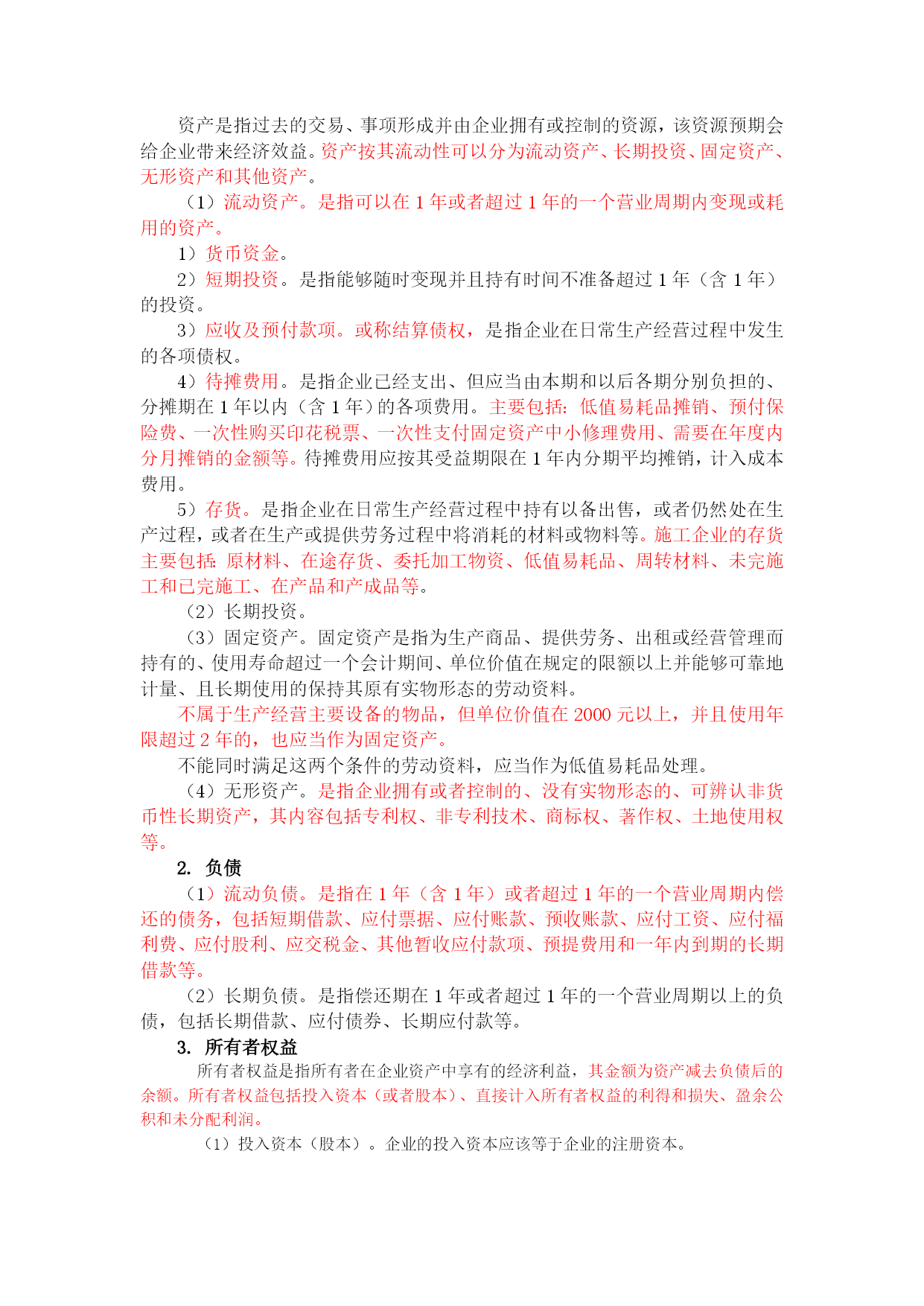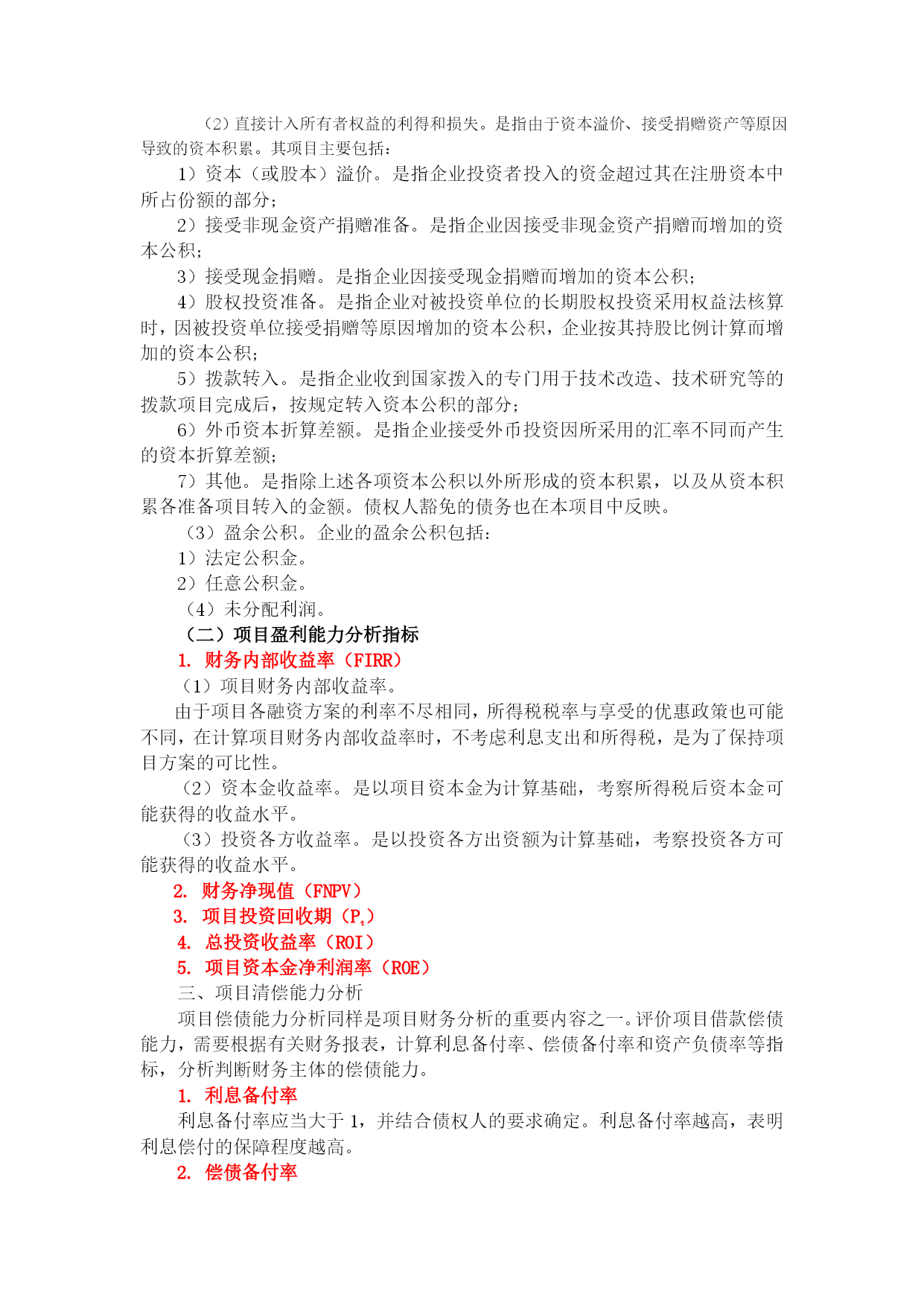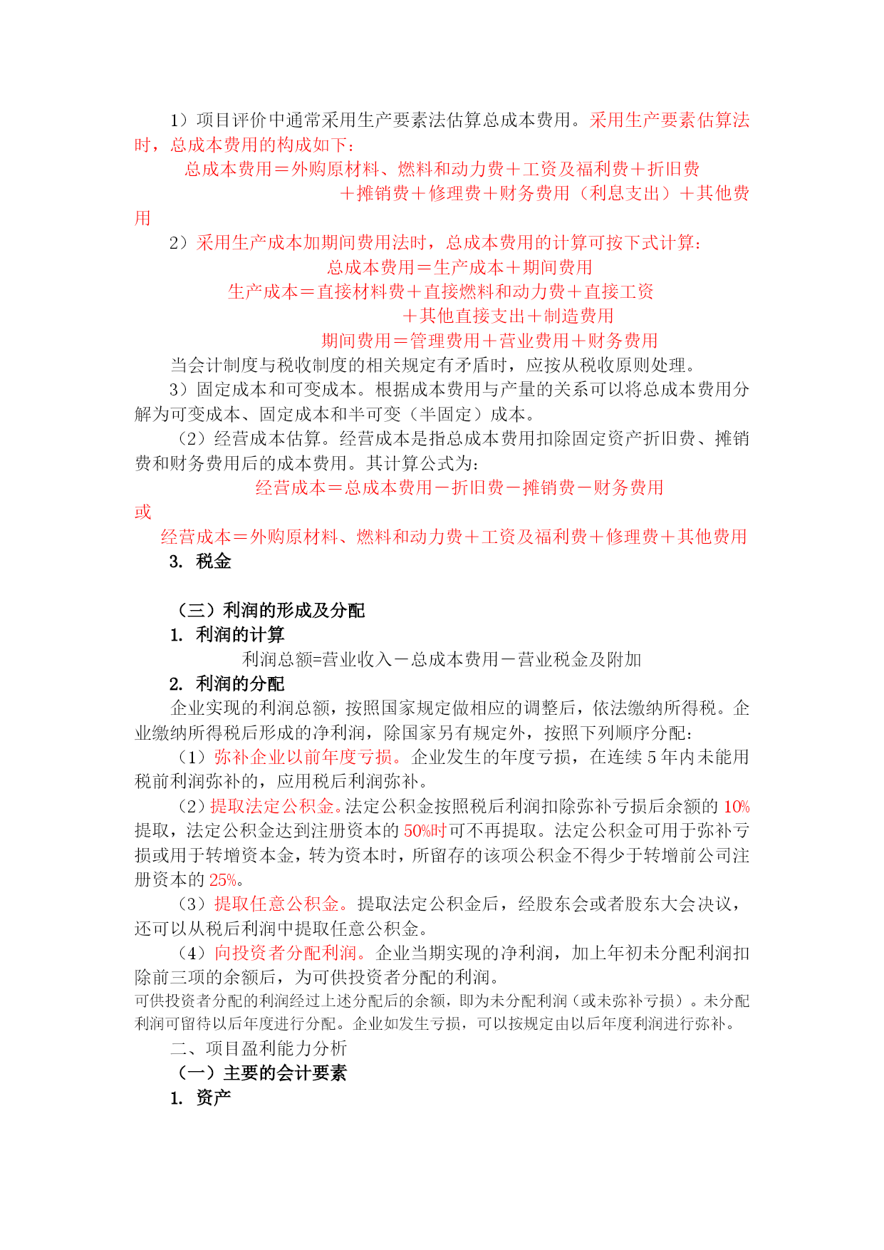 第三节工程项目财务分析一、工程项目收益估算(一)财务效益估算项目的财务效益是指项目实施后所获得的营业收入。对于适用增值税的经营性项目,除营业收入外,其可得到的增值税返还也应作为补贴收入计入财务收益;对于非经营性项目,财务效益应包括可能获得的各种补贴收入。1.营业收入的估算2.补贴收入的估算某些项目还应按有关规定估算企业可能得到的补贴收入(仅包括与收益相关的政府补助,与资产相关的政府补助不在此处核算,与资产相关的政府补助是指企业取得的、用于构建或以其他方式形成长期资产的政府补助)。(二)财务费用估算项目所支出的财务费用主要包括投资、成本费用和税金等。1.投资在项目财务费用的估算中,投资主要包括建设投资、建设期贷款利息和流动资金三部分。(1)建设投资。建设投资的构成可按概算分类法或按形成资产法分类。1)按概算法分类。建设投资由工程费用、工程建设其他费用和预备费三部分构成。其中工程费用又由建筑工程费、设备购置费(含工器具及生产家具购置费)和安装工程费构成;预备费包括基本预备费和涨价预备费。2)按形成资产法分类。建设投资由形成固定资产的费用、形成无形资产的费用、形成其他资产的费用和预备费4部分组成。固定资产费用是指项目投产时直接形成固定资产的建设投资,包括工程费用和工程建设其他费用中按规定将形成固定资产的费用,后者被称为固定资产其他费用,主要包括建设单位管理费、可行性研究费、研究试验费、勘察设计费、环境影响评价费、场地准备及临时设施费、引进技术和进口设备其他费、工程保险费、联合试运转费、特殊设备安全监督检测费和市政公用设施建设及绿化费等;无形资产费用是指将直接形成无形资产的建设投资,主要是专利权、非专利技术、商标权、土地使用权和商誉等。其他资产费用是指建设投资中除形成固定资产和无形资产以外的部分,如生产准备及开办费等。(2)建设期贷款利息。(3)流动资金。流动资金是指运营期内长期占用并周转使用的营运资金,不包括运营中需要的临时性营运资金。2.成本费用按财务评价的特定要求,分为总成本费用和经营成本。(1)总成本费用估算。总成本费用是指在运营期内为生产产品或提供劳务所发生的全部费用。1)项目评价中通常采用生产要素法估算总成本费用。采用生产要素估算法时,总成本费用的构成如下:总成本费用=外购原材料、燃料和动力费+工资及福利费+折旧费+摊销费+修理费+财务费用(利息支出)+其他费用2)采用生产成本加期间费用法时,总成本费用的计算可按下式计算:总成本费用=生产成本+期间费用生产成本=直接材料费+直接燃料和动力费+直接工资+其他直接支出+制造费用期间费用=管理费用+营业费用+财务费用当会计制度与税收制度的相关规定有矛盾时,应按从税收原则处理。3)固定成本和可变成本。根据成本费用与产量的关系可以将总成本费用分解为可变成本、固定成本和半可变(半固定)成本。(2)经营成本估算。经营成本是指总成本费用扣除固定资产折旧费、摊销费和财务费用后的成本费用。其计算公式为:经营成本=总成本费用-折旧费-摊销费-财务费用或经营成本=外购原材料、燃料和动力费+工资及福利费+修理费+其他费用3.税金(三)利润的形成及分配1.利润的计算利润总额=营业收入-总成本费用-营业税金及附加2.利润的分配企业实现的利润总额,按照国家规定做相应的调整后,依法缴纳所得税。企业缴纳所得税后形成的净利润,除国家另有规定外,按照下列顺序分配:(1)弥补企业以前年度亏损。企业发生的年度亏损,在连续5年内未能用税前利润弥补的,应用税后利润弥补。(2)提取法定公积金。法定公积金按照税后利润扣除弥补亏损后余额的10%提取,法定公积金达到注册资本的50%时可不再提取。法定公积金可用于弥补亏损或用于转增资本金,转为资本时,所留存的该项公积金不得少于转增前公司注册资本的25%。(3)提取任意公积金。提取法定公积金后,经股东会或者股东大会决议,还可以从税后利润中提取任意公积金。(4)向投资者分配利润。企业当期实现的净利润,加上年初未分配利润扣除前三项的余额后,为可供投资者分配的利润。可供投资者分配的利润经过上述分配后的余额,即为未分配利润(或未弥补亏损)。未分配利润可留待以后年度进行分配。企业如发生亏损,可以按规定由以后年度利润进行弥补。二、项目盈利能力分析(一)主要的会计要素1.资产资产是指过去的交易、事项形成并由企业拥有或控制的资源,该资源预期会给企业带来经济效益。资产按其流动性可以分为流动资产、长期投资、固定资产、无形资产和其他资产。(1)流动资产。是指可以在1年或者超过1年的一个营业周期内变现或耗用的资产。1)货币资金。2)短期投资。是指能够随时变现并且持有时间不准备超过1年(含1年)