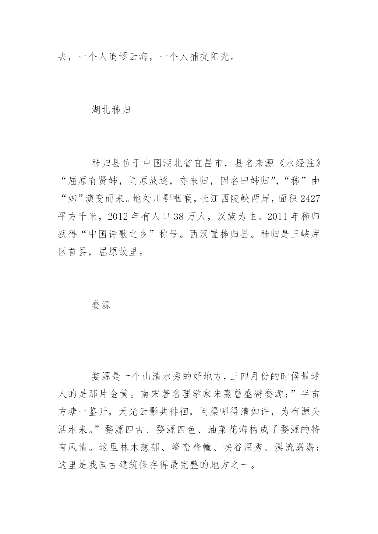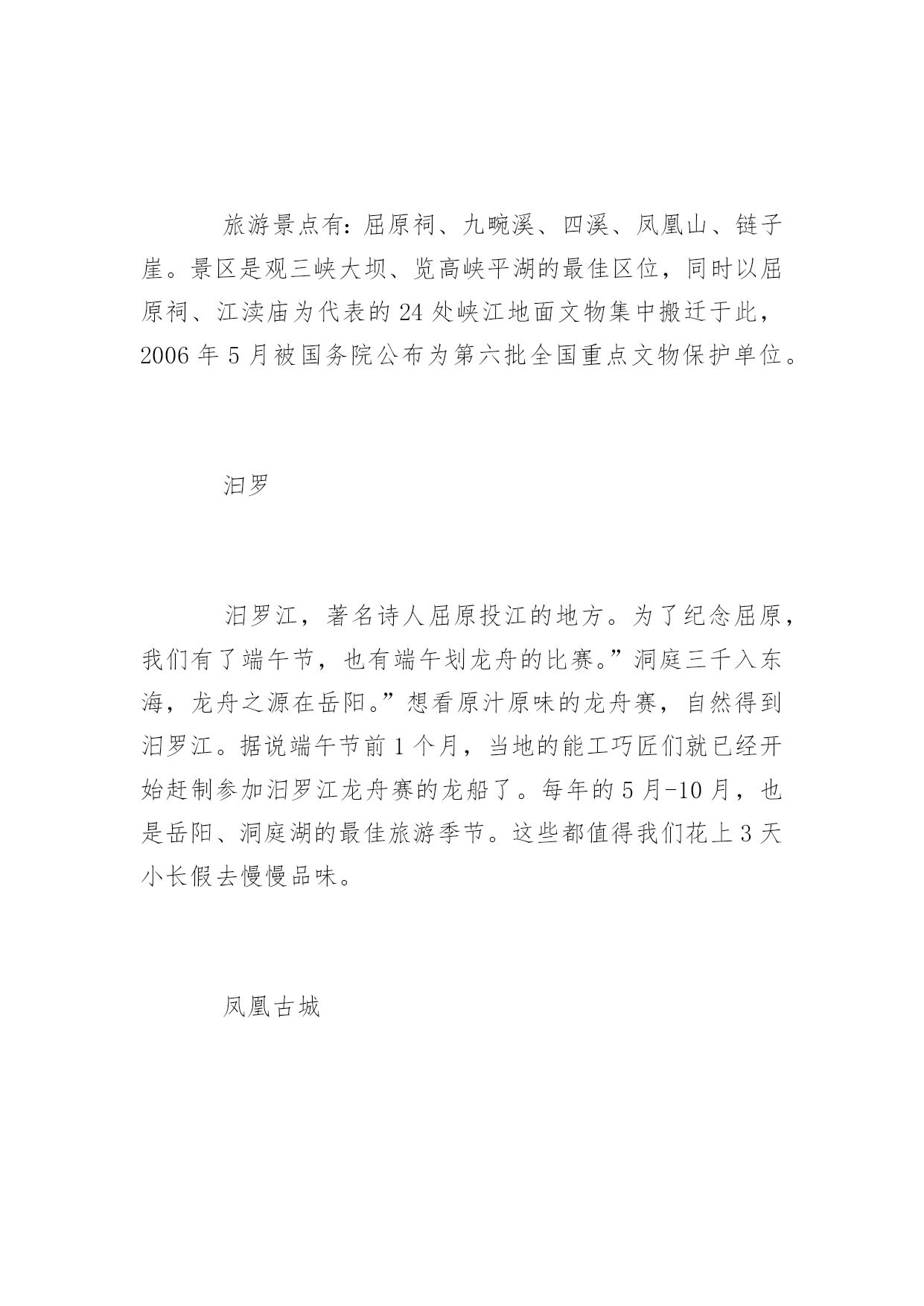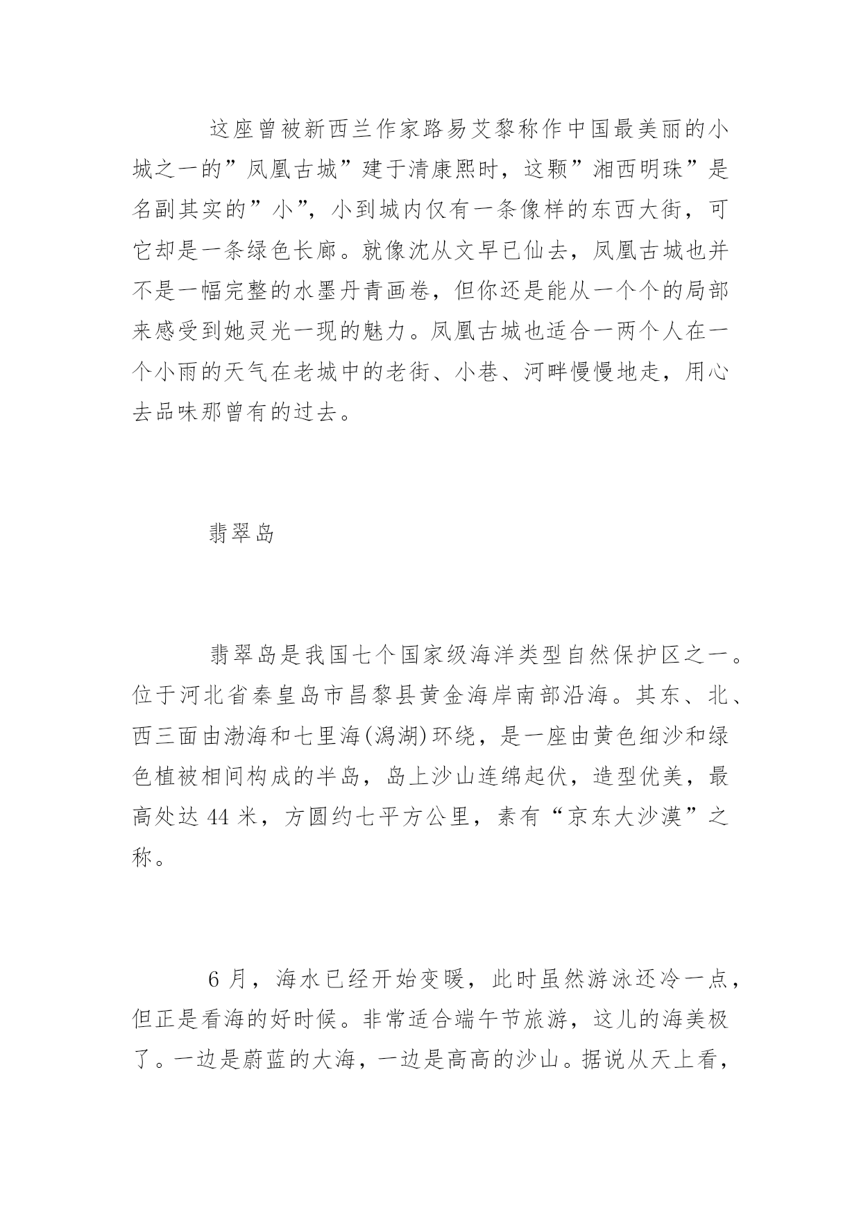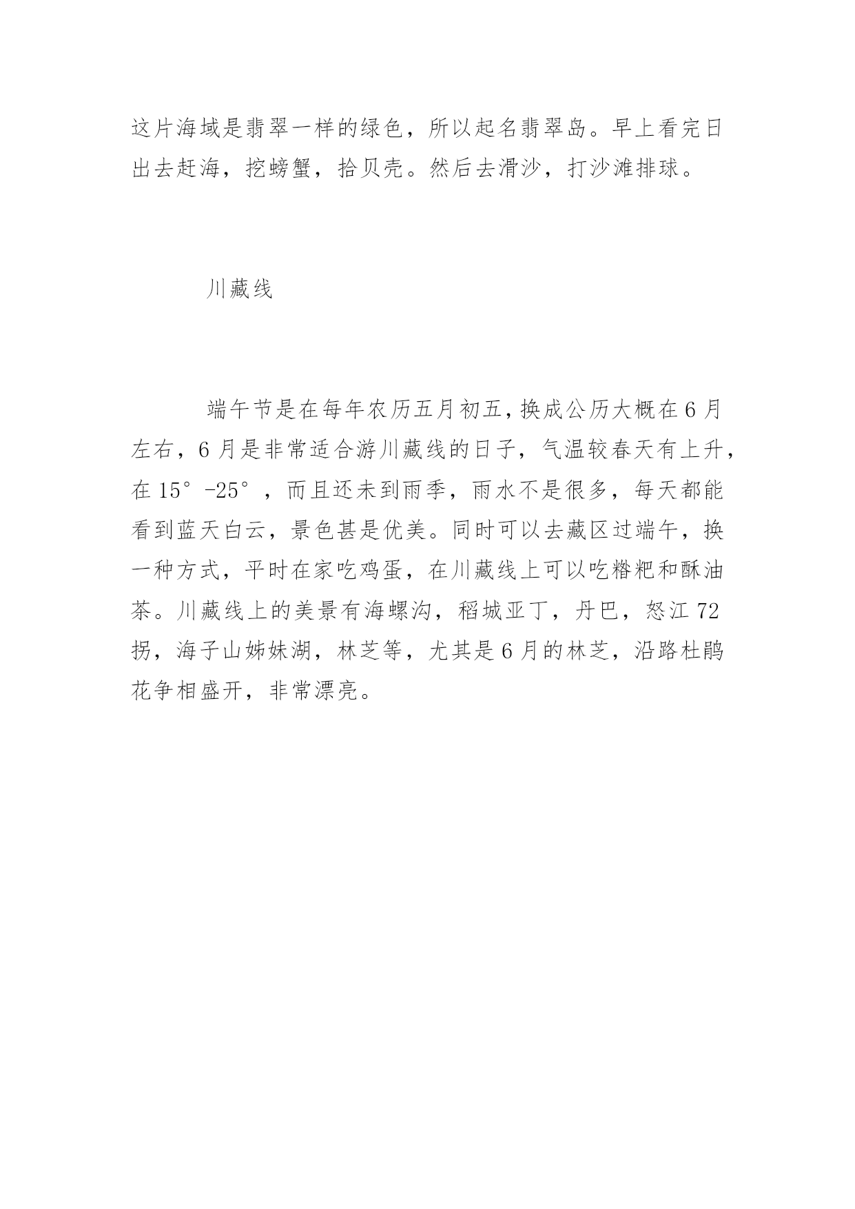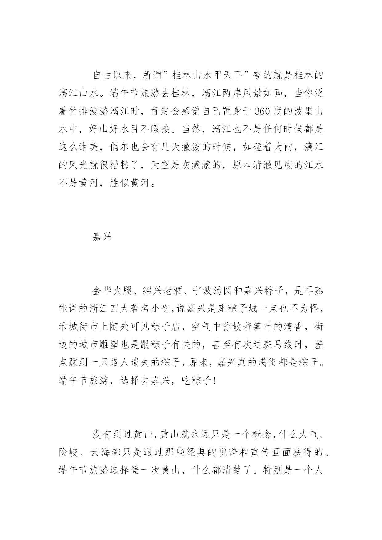 端午假期旅游地端午假期旅游推荐地端午小长假就蹦跶蹦跶的来了。总还是有些盼头的,为了假期更好的出去玩耍,现在应该更努力地坚守好最后一班岗!那么,端午节小长假适合去哪里玩呢?以下是为大家分享的端午假期旅游推荐地,供大家参考借鉴,欢迎浏览!青岛干净的沙滩,干净的城市。海子说,”面朝大海,春暖花开”。青岛的魅力恰好源自它海的浪漫气息。青岛的气候属海洋性气候,冬暖夏凉,它的季节比内陆地区来的晚一些。比如夏天,到7月份的时候,内陆城市已经非常热,而青岛相对来说要凉快许多,因此成为非常驰名的避暑胜地。如果非用一种颜色来形容青岛的话,那么非蓝色莫属。这黄海之涯、岛城之滨的海是带着一种甜美的。端午节旅游选择青岛,去避暑纳凉。自古以来,所谓”桂林山水甲天下”夸的就是桂林的漓江山水。端午节旅游去桂林,漓江两岸风景如画,当你泛着竹排漫游漓江时,肯定会感觉自己置身于360度的泼墨山水中,好山好水目不暇接。当然,漓江也不是任何时候都是这么甜美,偶尔也会有几天撒泼的时候,如碰着大雨,漓江的风光就很糟糕了,天空是灰蒙蒙的,原本清澈见底的江水不是黄河,胜似黄河。嘉兴金华火腿、绍兴老酒、宁波汤圆和嘉兴粽子,是耳熟能详的浙江四大著名小吃,说嘉兴是座粽子城一点也不为怪,禾城街市上随处可见粽子店,空气中弥散着箬叶的清香,街边的城市雕塑也是跟粽子有关的,甚至有次过斑马线时,差点踩到一只路人遗失的粽子,原来,嘉兴真的满街都是粽子。端午节旅游,选择去嘉兴,吃粽子!没有到过黄山,黄山就永远只是一个概念,什么大气、险峻、云海都只是通过那些经典的说辞和宣传画面获得的。端午节旅游选择登一次黄山,什么都清楚了。特别是一个人去,一个人追逐云海,一个人捕捉阳光。湖北秭归秭归县位于中国湖北省宜昌市,县名来源《水经注》“屈原有贤姊,闻原放逐,亦来归,因名曰姊归”,“秭”由“姊”演变而来。地处川鄂咽喉,长江西陵峡两岸,面积2427平方千米,2012年有人口38万人,汉族为主。2011年秭归获得“中国诗歌之乡”称号。西汉置秭归县。秭归是三峡库区首县,屈原故里。婺源婺源是一个山清水秀的好地方,三四月份的时候最迷人的是那片金黄。南宋著名理学家朱熹曾盛赞婺源:”半亩方塘一鉴开,天光云影共徘徊,问渠哪得清如许,为有源头活水来。”婺源四古、婺源四色、油菜花海构成了婺源的特有风情。这里林木葱郁、峰峦叠幢、峡谷深秀、溪流潺潺;这里是我国古建筑保存得最完整的地方之一。旅游景点有:屈原祠、九畹溪、四溪、凤凰山、链子崖。景区是观三峡大坝、览高峡平湖的最佳区位,同时以屈原祠、江渎庙为代表的24处峡江地面文物集中搬迁于此,2006年5月被国务院公布为第六批全国重点文物保护单位。汩罗汨罗江,著名诗人屈原投江的地方。为了纪念屈原,我们有了端午节,也有端午划龙舟的比赛。”洞庭三千入东海,龙舟之源在岳阳。”想看原汁原味的龙舟赛,自然得到汨罗江。据说端午节前1个月,当地的能工巧匠们就已经开始赶制参加汨罗江龙舟赛的龙船了。每年的5月-10月,也是岳阳、洞庭湖的最佳旅游季节。这些都值得我们花上3天小长假去慢慢品味。凤凰古城这座曾被新西兰作家路易艾黎称作中国最美丽的小城之一的”凤凰古城”建于清康熙时,这颗”湘西明珠”是名副其实的”小”,小到城内仅有一条像样的东西大街,可它却是一条绿色长廊。就像沈从文早已仙去,凤凰古城也并不是一幅完整的水墨丹青画卷,但你还是能从一个个的局部来感受到她灵光一现的魅力。凤凰古城也适合一两个人在一个小雨的天气在老城中的老街、小巷、河畔慢慢地走,用心去品味那曾有的过去。翡翠岛翡翠岛是我国七个国家级海洋类型自然保护区之一。位于河北省秦皇岛市昌黎县黄金海岸南部沿海。其东、北、西三面由渤海和七里海(潟湖)环绕,是一座由黄色细沙和绿色植被相间构成的半岛,岛上沙山连绵起伏,造型优美,最高处达44米,方圆约七平方公里,素有“京东大沙漠”之称。6月,海水已经开始变暖,此时虽然游泳还冷一点,但正是看海的好时候。非常适合端午节旅游,这儿的海美极了。一边是蔚蓝的大海,一边是高高的沙山。据说从天上看,这片海域是翡翠一样的绿色,所以起名翡翠岛。早上看完日出去赶海,挖螃蟹,拾贝壳。然后去滑沙,打沙滩排球。川藏线端午节是在每年农历五月初五,换成公历大概在6月左右,6月是非常适合游川藏线的日子,气温较春天有上升,在15°-25°,而且还未到雨季,雨水不是很多,每天都能看到蓝天白云,景色甚是优美。同时可以去藏区过端午,换一种方式,平时在家吃鸡蛋,在川藏线上可以吃糌粑和酥油茶。川藏线上的美景有海螺沟,稻城亚丁,丹巴,怒江72拐,海子山姊妹湖,林芝等,尤其是6月的林芝,沿路杜鹃花争相盛开,非常漂亮。