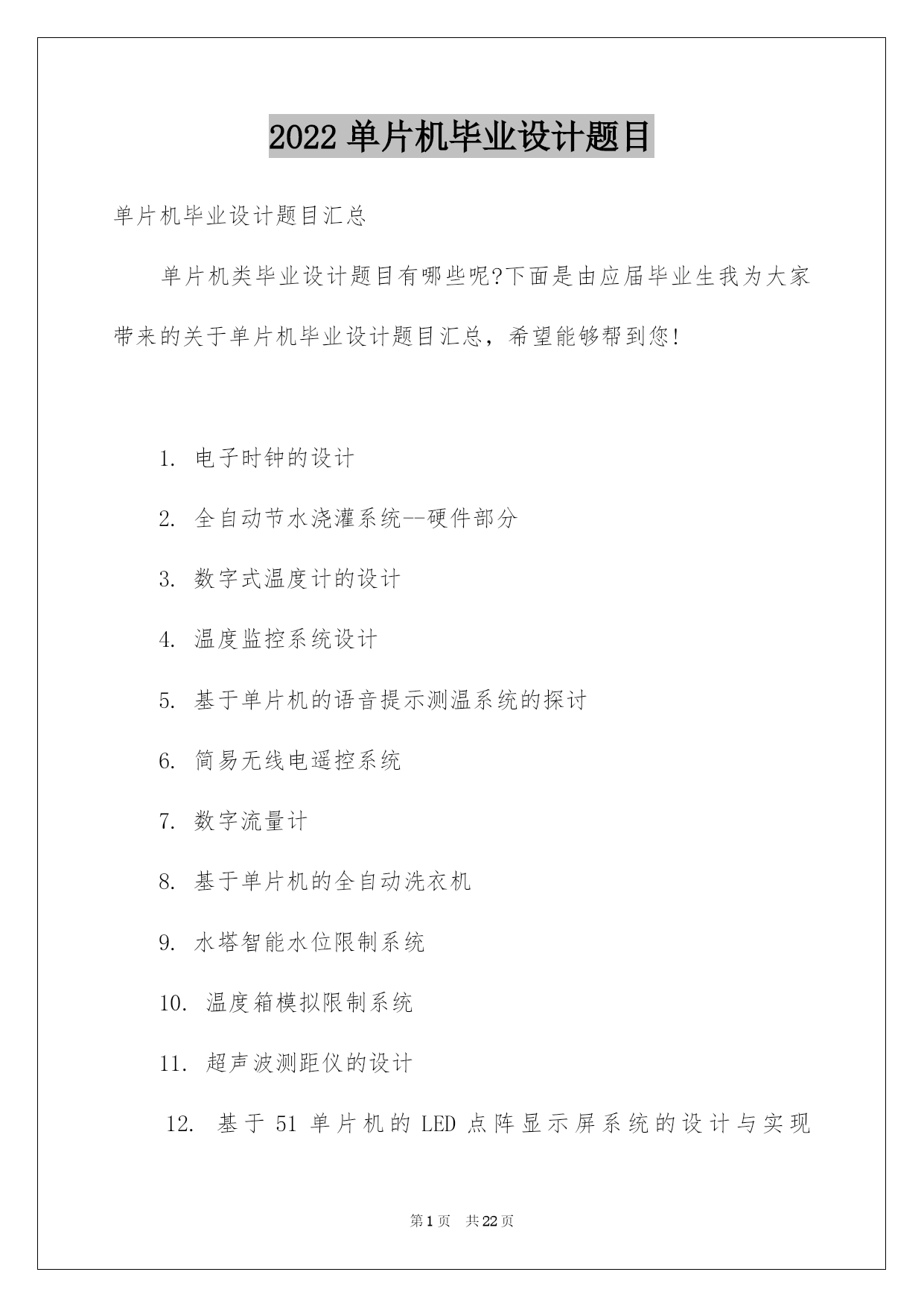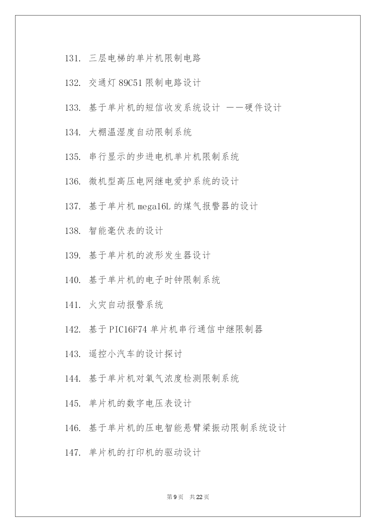 第PAGE\*Arabic\*MERGEFORMAT22页共NUMPAGES\*Arabic\*MERGEFORMAT22页第PAGE\*MERGEFORMAT22页共NUMPAGES\*MERGEFORMAT22页第PAGE\*MERGEFORMAT22页共NUMPAGES\*MERGEFORMAT22页第PAGE\*MERGEFORMAT22页共NUMPAGES\*MERGEFORMAT22页第PAGE\*MERGEFORMAT22页共NUMPAGES\*MERGEFORMAT22页第PAGE\*MERGEFORMAT22页共NUMPAGES\*MERGEFORMAT22页第PAGE\*MERGEFORMAT22页共NUMPAGES\*MERGEFORMAT22页第PAGE\*MERGEFORMAT22页共NUMPAGES\*MERGEFORMAT22页第PAGE\*MERGEFORMAT22页共NUMPAGES\*MERGEFORMAT22页第PAGE\*MERGEFORMAT22页共NUMPAGES\*MERGEFORMAT22页第PAGE\*MERGEFORMAT22页共NUMPAGES\*MERGEFORMAT22页2022单片机毕业设计题目单片机毕业设计题目汇总单片机类毕业设计题目有哪些呢?下面是由应届毕业生我为大家带来的关于单片机毕业设计题目汇总,希望能够帮到您!1.电子时钟的设计2.全自动节水浇灌系统--硬件部分3.数字式温度计的设计4.温度监控系统设计5.基于单片机的语音提示测温系统的探讨6.简易无线电遥控系统7.数字流量计8.基于单片机的全自动洗衣机9.水塔智能水位限制系统10.温度箱模拟限制系统11.超声波测距仪的设计12.基于51单片机的LED点阵显示屏系统的设计与实现16×16点阵显示屏13.基于AT89S51单片机的数字电子时钟14.基于单片机的步进电机的限制15.基于单片机的沟通调功器设计16.基于单片机的数字电压表的设计17.单片机的数字钟设计18.智能散热器限制器的设计19.单片机打铃系统设计20.基于单片机的交通信号灯限制电路设计21.基于单片机的电话远程限制家用电器系统设计22.基于单片机的平安报警器23.基于单片机的八路抢答器设计24.基于单片机的超声波测距系统的设计25.基于MCS-51数字温度表的设计26.电子体温计的设计27.基于AT89C51的电话远程限制系统28.基于AVR单片机幅度可调的DDS信号发生器29.基于单片机的数控稳压电源的设计30.基于单片机的室内一氧化碳监测及报警系统的探讨31.基于单片机的空调温度限制器设计32.基于单片机的可编程多功能电子定时器33.单片机的数字温度计设计34.红外遥控密码锁的设计35.基于51单片机的语音识别系统设计36.家用可燃气体报警器的设计37.基于数字温度计的多点温度检测系统38.基于凌阳单片机的语音实时采集系统设计39.基于单片机的数字频率计的设计40.基于单片机的数字电子钟设计41.设施环境中温度测量电路设计42.汽车倒车防撞报警器的设计43.篮球赛计时记分器44.基于单片机的家用智能总线式开关设计45.设施环境中湿度检测电路设计46.基于单片机的音乐合成器设计47.设施环境中二氧化碳检测电路设计48.基于单片机的水温限制系统设计49.基于单片机的数字温度计的设计50.基于单片机的火灾报警器51.基于单片机的红外遥控开关设计52.基于单片机的电子钟设计53.基于单片机的红外遥控电子密码锁54.大棚温湿度自动监控系统55.基于单片机的电器遥控器的设计56.单片机的语音存储与重放的探讨57.基于单片机的电加热炉温度限制系统设计58.红外遥控电源开关59.基于单片机的低频信号发生器设计60.基于单片机的呼叫系统的设计61.基于PIC16F876A单片机的超声波测距仪62.基于单片机的密码锁设计63.单片机步进电机转速限制器的设计64.由AT89C51限制的太阳能热水器65.防盗与恒温系统的设计与制作66.AT89S52单片机试验系统的开发与应用67.基于单片机限制的数字气压计的设计与实现68.智能压力传感器系统设计69.智能定时器70.基于单片机的智能火灾报警系统71.基于单片机的电子式转速里程表的设计72.公交车汉字显示系统73.单片机数字电压表的设计74.精密VF转换器与MCS-51单片机的接口技术75.基于单片机的居室平安报警系统设计76.基于89C2051IC卡读/写器的设计77.PC机与单片机串行通信设计78.球赛计时计分器设计79.松下系列PCL五层电梯