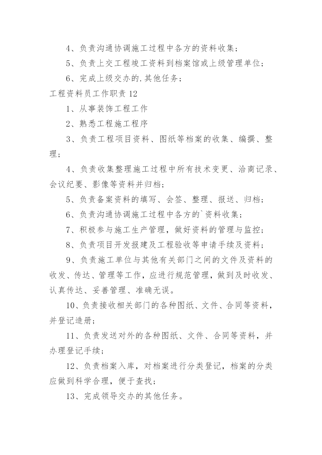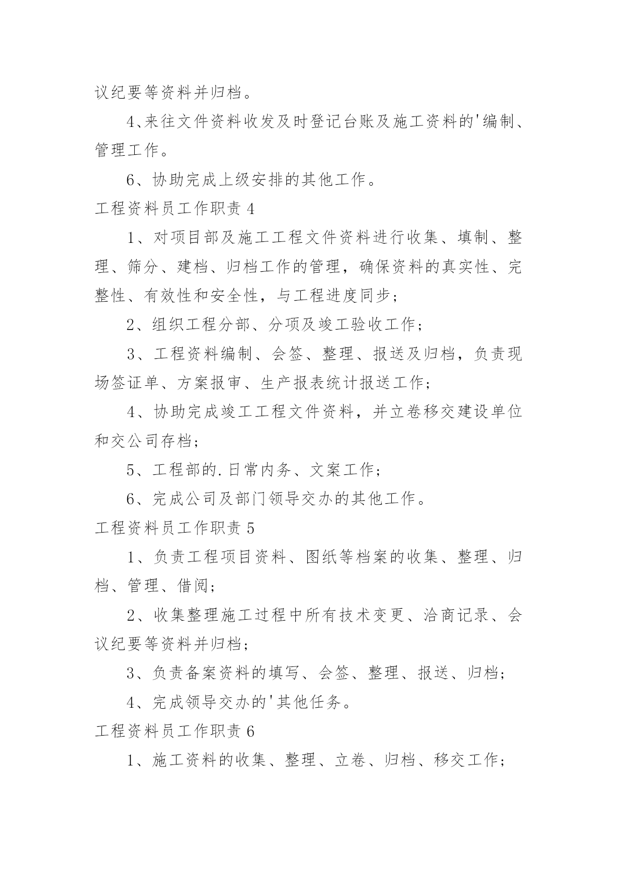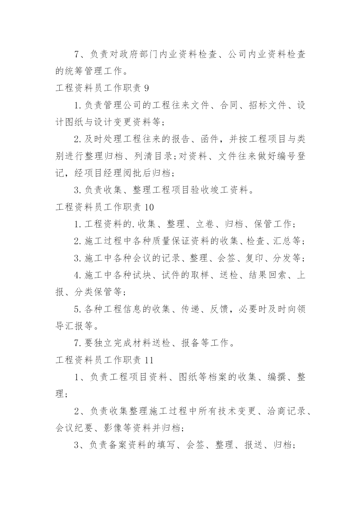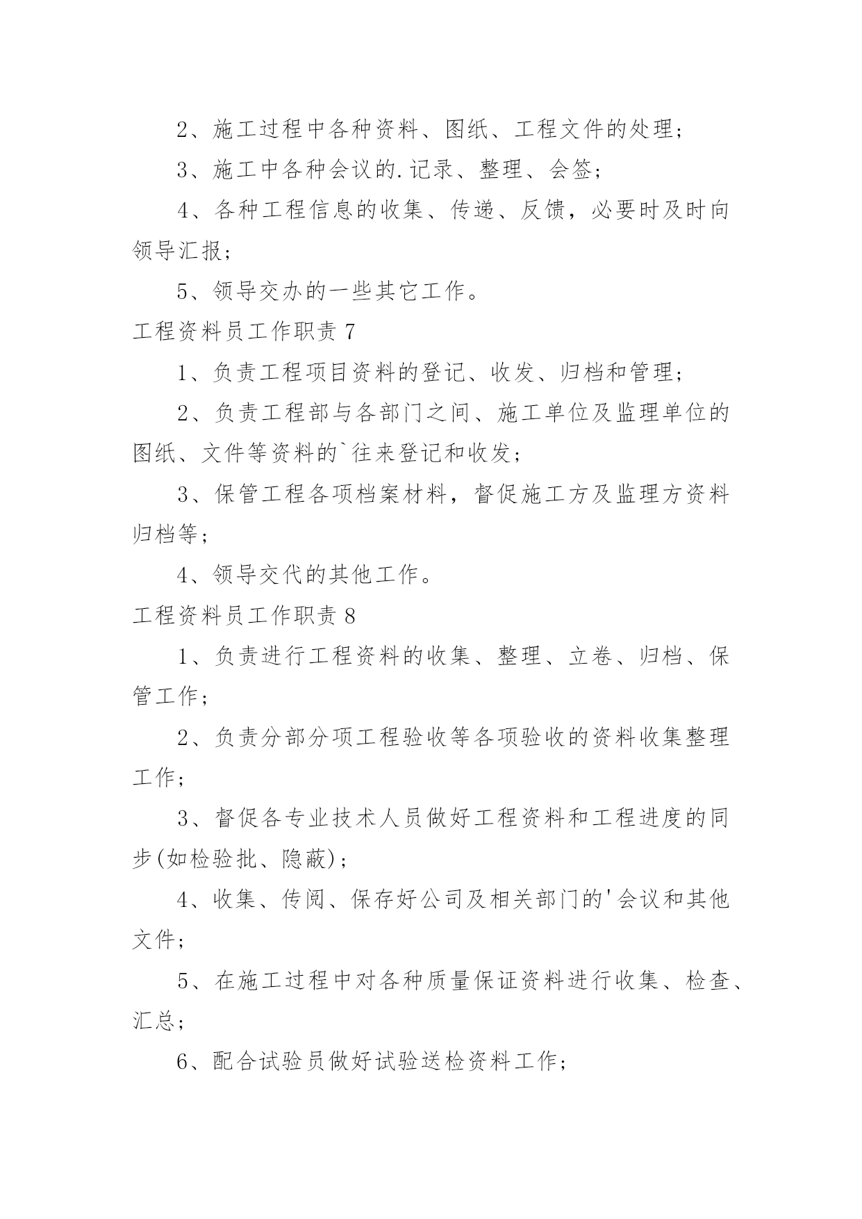 工程资料员工作职责工程资料员工作职责(精选15篇)工程资料员工作职责1一、做好工程资料(图纸、安全、技术、劳务)的收集、整理、立卷、归档、保管工作二、做好施工过程中各种质量保证资料的收集、检查、汇总等工作三、做好施工中各种会议的记录、整理、汇总等工作。四、做好施工中各种试块、试件的取样、送检、结果回索、上报、分美保管等工作五、做好施工后工程量清单的核对六、各施工合同的.签订与归档七、规范工程项目开发施工期间的各类图纸变更通知、工程合同及其它工程项目方面文件料的保管。八、负责管理好有关工程技术经料的归档保存,并按有关工程技术料的重要性进行分美九、收集、检查、核对建设工程竣工姿料。十、负责备案资料的填写、会签、整理、报送、归档:负责工程备案管理,实现对竣工验收相关指标(包括质量资料审查记录、单位工程综合验收记最)作备案处理十一、在工程竣工后,负责将文件资料、工程料立巻移交公司,负责向市城建档案馆的栏案移交工作。十二、负责定期清理工程档案,合同和建设、规划、国士等主管部门审批原件,及时移交公司档案室存档。工程资料员工作职责21、负责本项目部所有技术资料图纸变更、洽商记录、来函的及时接收、整理、发放、借出、保存工作。2、资料员收到文件及设计变更通知后,应立即编号登记,及时、有效地传达到工程技术文件使用者手中。3、负责收集、整理工程施工中的各项资料,包括检验批、隐蔽及验收记录等,做到资料与工程进度同步。4、收集和整理工程准备阶段、竣工验收阶段形成的文件,并应进行立卷归档。归档文件必须齐全、完整、系统、准确。5、负责各类管理台帐、公函、会议纪要、合同等资料的收集、合并、结转、归档及保管工作。6、负责工程竣工图的整理和移交。7、配合项目部做好外来人员的.接待工作,并做好记录,及时向领导反馈信息。8、领导安排的其他工作。工程资料员工作职责31、负责工程项目所有的图纸接收、点清、登记、发放、归档等管理工作。2、负责项目文件资料的登记、催办、签收、签章、传递、立卷、归档销毁等工作3、收集整理施工过程中所有技术变更、洽商记录、会议纪要等资料并归档。4、来往文件资料收发及时登记台账及施工资料的'编制、管理工作。6、协助完成上级安排的其他工作。工程资料员工作职责41、对项目部及施工工程文件资料进行收集、填制、整理、筛分、建档、归档工作的管理,确保资料的真实性、完整性、有效性和安全性,与工程进度同步;2、组织工程分部、分项及竣工验收工作;3、工程资料编制、会签、整理、报送及归档,负责现场签证单、方案报审、生产报表统计报送工作;4、协助完成竣工工程文件资料,并立卷移交建设单位和交公司存档;5、工程部的.日常内务、文案工作;6、完成公司及部门领导交办的其他工作。工程资料员工作职责51、负责工程项目资料、图纸等档案的收集、整理、归档、管理、借阅;2、收集整理施工过程中所有技术变更、洽商记录、会议纪要等资料并归档;3、负责备案资料的填写、会签、整理、报送、归档;4、完成领导交办的'其他任务。工程资料员工作职责61、施工资料的收集、整理、立卷、归档、移交工作;2、施工过程中各种资料、图纸、工程文件的处理;3、施工中各种会议的.记录、整理、会签;4、各种工程信息的收集、传递、反馈,必要时及时向领导汇报;5、领导交办的一些其它工作。工程资料员工作职责71、负责工程项目资料的登记、收发、归档和管理;2、负责工程部与各部门之间、施工单位及监理单位的图纸、文件等资料的`往来登记和收发;3、保管工程各项档案材料,督促施工方及监理方资料归档等;4、领导交代的其他工作。工程资料员工作职责81、负责进行工程资料的收集、整理、立卷、归档、保管工作;2、负责分部分项工程验收等各项验收的资料收集整理工作;3、督促各专业技术人员做好工程资料和工程进度的同步(如检验批、隐蔽);4、收集、传阅、保存好公司及相关部门的'会议和其他文件;5、在施工过程中对各种质量保证资料进行收集、检查、汇总;6、配合试验员做好试验送检资料工作;7、负责对政府部门内业资料检查、公司内业资料检查的统筹管理工作。工程资料员工作职责91.负责管理公司的工程往来文件、合同、招标文件、设计图纸与设计变更资料等;2.及时处理工程往来的报告、函件,并按工程项目与类别进行整理归档、列清目录;对资料、文件往来做好编号登记,经项目经理阅批后归档;3.负责收集、整理工程项目验收竣工资料。工程资料员工作职责101.工程资料的.收集、整理、立卷、归档、保管工作;2.施工过程中各种质量保证资料的收集、检查、汇总等;3.施工中各种会议的记录、整理、会签、复印、分发等;4.施工中各种试块、试件的取样、送检、结果回索、上报、分类保管等;5.各种工程信息的收集、传递、反馈,必要时及时向领导汇报等。7.要独立完成材料送检、报备等工作。工程资料员工作