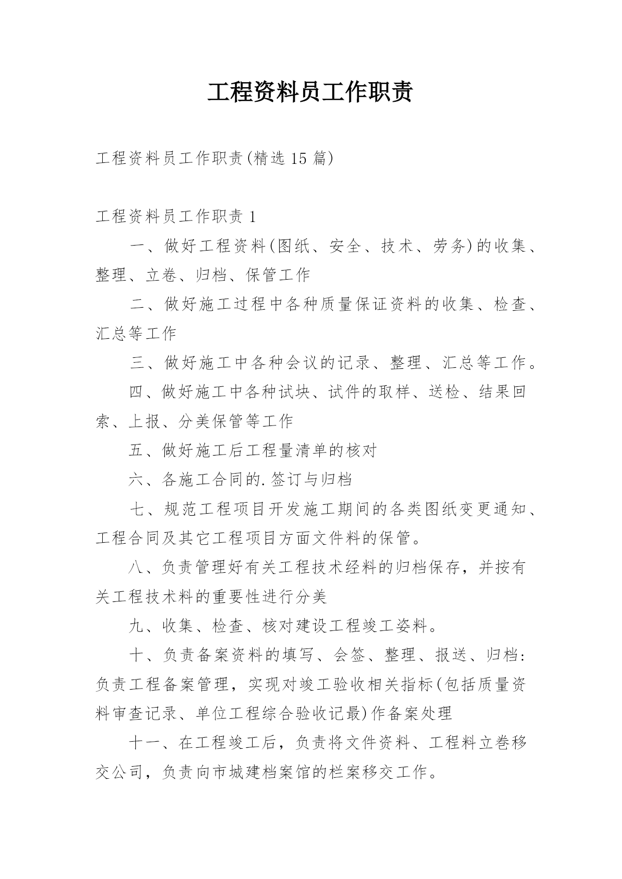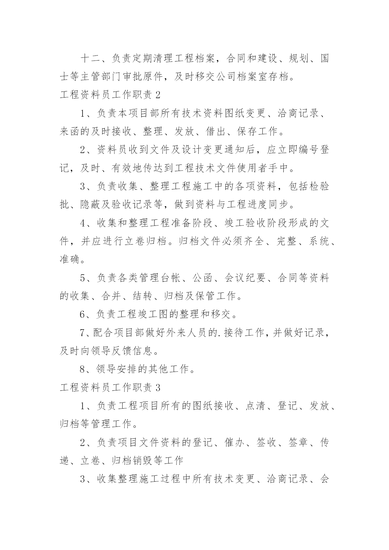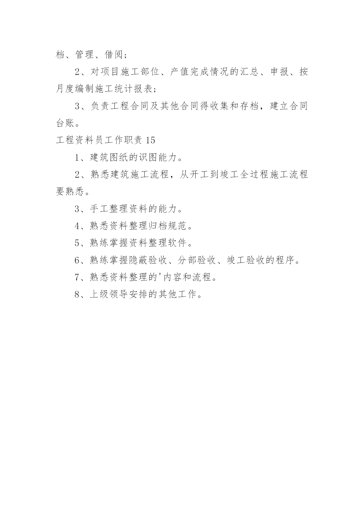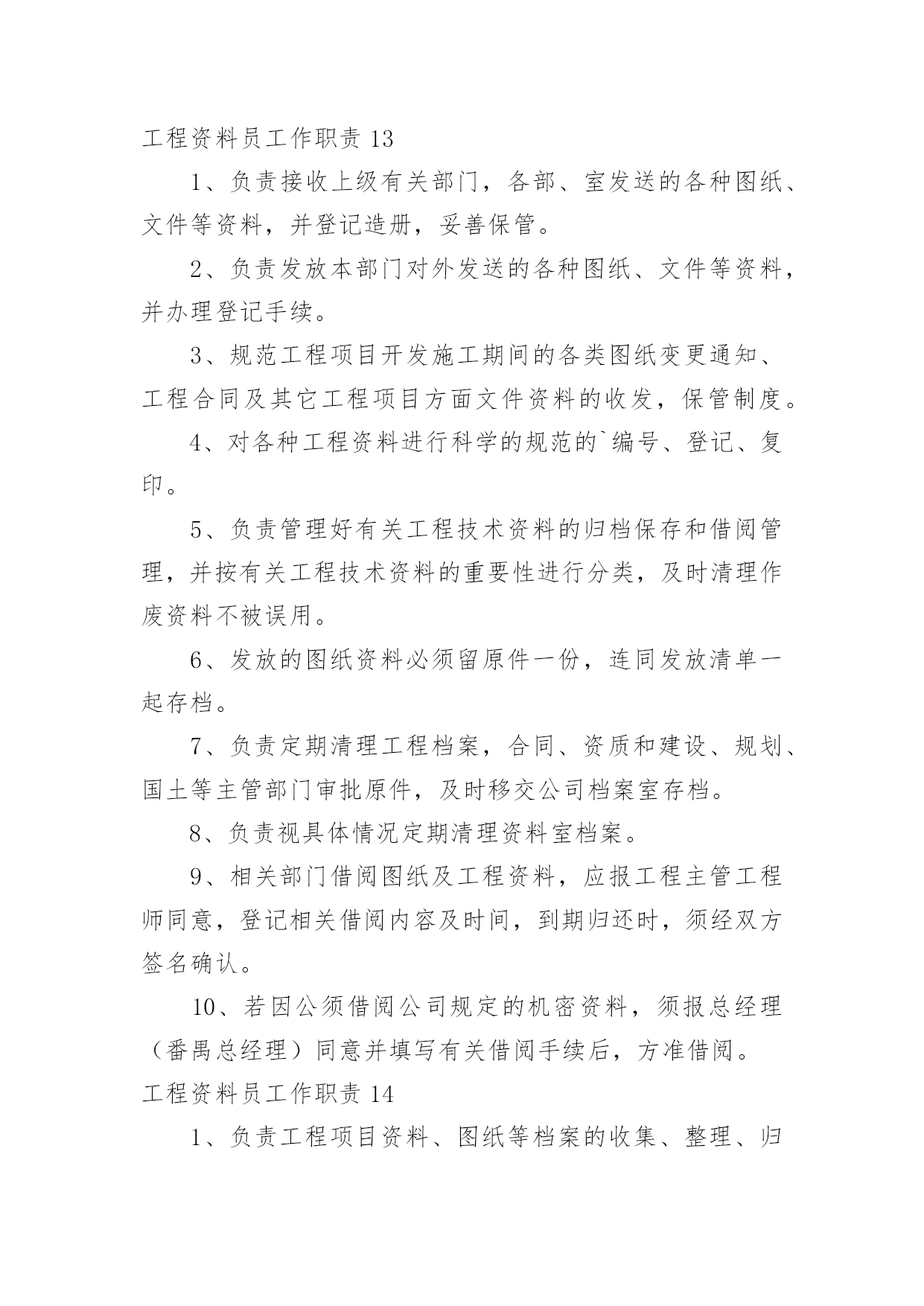 工程资料员工作职责工程资料员工作职责(精选15篇)工程资料员工作职责1一、做好工程资料(图纸、安全、技术、劳务)的收集、整理、立卷、归档、保管工作二、做好施工过程中各种质量保证资料的收集、检查、汇总等工作三、做好施工中各种会议的记录、整理、汇总等工作。四、做好施工中各种试块、试件的取样、送检、结果回索、上报、分美保管等工作五、做好施工后工程量清单的核对六、各施工合同的.签订与归档七、规范工程项目开发施工期间的各类图纸变更通知、工程合同及其它工程项目方面文件料的保管。八、负责管理好有关工程技术经料的归档保存,并按有关工程技术料的重要性进行分美九、收集、检查、核对建设工程竣工姿料。十、负责备案资料的填写、会签、整理、报送、归档:负责工程备案管理,实现对竣工验收相关指标(包括质量资料审查记录、单位工程综合验收记最)作备案处理十一、在工程竣工后,负责将文件资料、工程料立巻移交公司,负责向市城建档案馆的栏案移交工作。十二、负责定期清理工程档案,合同和建设、规划、国士等主管部门审批原件,及时移交公司档案室存档。工程资料员工作职责21、负责本项目部所有技术资料图纸变更、洽商记录、来函的及时接收、整理、发放、借出、保存工作。2、资料员收到文件及设计变更通知后,应立即编号登记,及时、有效地传达到工程技术文件使用者手中。3、负责收集、整理工程施工中的各项资料,包括检验批、隐蔽及验收记录等,做到资料与工程进度同步。4、收集和整理工程准备阶段、竣工验收阶段形成的文件,并应进行立卷归档。归档文件必须齐全、完整、系统、准确。5、负责各类管理台帐、公函、会议纪要、合同等资料的收集、合并、结转、归档及保管工作。6、负责工程竣工图的整理和移交。7、配合项目部做好外来人员的.接待工作,并做好记录,及时向领导反馈信息。8、领导安排的其他工作。工程资料员工作职责31、负责工程项目所有的图纸接收、点清、登记、发放、归档等管理工作。2、负责项目文件资料的登记、催办、签收、签章、传递、立卷、归档销毁等工作3、收集整理施工过程中所有技术变更、洽商记录、会议纪要等资料并归档。4、来往文件资料收发及时登记台账及施工资料的'编制、管理工作。6、协助完成上级安排的其他工作。工程资料员工作职责41、对项目部及施工工程文件资料进行收集、填制、整理、筛分、建档、归档工作的管理,确保资料的真实性、完整性、有效性和安全性,与工程进度同步;2、组织工程分部、分项及竣工验收工作;3、工程资料编制、会签、整理、报送及归档,负责现场签证单、方案报审、生产报表统计报送工作;4、协助完成竣工工程文件资料,并立卷移交建设单位和交公司存档;5、工程部的.日常内务、文案工作;6、完成公司及部门领导交办的其他工作。工程资料员工作职责51、负责工程项目资料、图纸等档案的收集、整理、归档、管理、借阅;2、收集整理施工过程中所有技术变更、洽商记录、会议纪要等资料并归档;3、负责备案资料的填写、会签、整理、报送、归档;4、完成领导交办的'其他任务。工程资料员工作职责61、施工资料的收集、整理、立卷、归档、移交工作;2、施工过程中各种资料、图纸、工程文件的处理;3、施工中各种会议的.记录、整理、会签;4、各种工程信息的收集、传递、反馈,必要时及时向领导汇报;5、领导交办的一些其它工作。工程资料员工作职责71、负责工程项目资料的登记、收发、归档和管理;2、负责工程部与各部门之间、施工单位及监理单位的图纸、文件等资料的`往来登记和收发;3、保管工程各项档案材料,督促施工方及监理方资料归档等;4、领导交代的其他工作。工程资料员工作职责81、负责进行工程资料的收集、整理、立卷、归档、保管工作;2、负责分部分项工程验收等各项验收的资料收集整理工作;3、督促各专业技术人员做好工程资料和工程进度的同步(如检验批、隐蔽);4、收集、传阅、保存好公司及相关部门的'会议和其他文件;5、在施工过程中对各种质量保证资料进行收集、检查、汇总;6、配合试验员做好试验送检资料工作;7、负责对政府部门内业资料检查、公司内业资料检查的统筹管理工作。工程资料员工作职责91.负责管理公司的工程往来文件、合同、招标文件、设计图纸与设计变更资料等;2.及时处理工程往来的报告、函件,并按工程项目与类别进行整理归档、列清目录;对资料、文件往来做好编号登记,经项目经理阅批后归档;3.负责收集、整理工程项目验收竣工资料。工程资料员工作职责101.工程资料的.收集、整理、立卷、归档、保管工作;2.施工过程中各种质量保证资料的收集、检查、汇总等;3.施工中各种会议的记录、整理、会签、复印、分发等;4.施工中各种试块、试件的取样、送检、结果回索、上报、分类保管等;5.各种工程信息的收集、传递、反馈,必要时及时向领导汇报等。7.要独立完成材料送检、报备等工作。工程资料员工作
