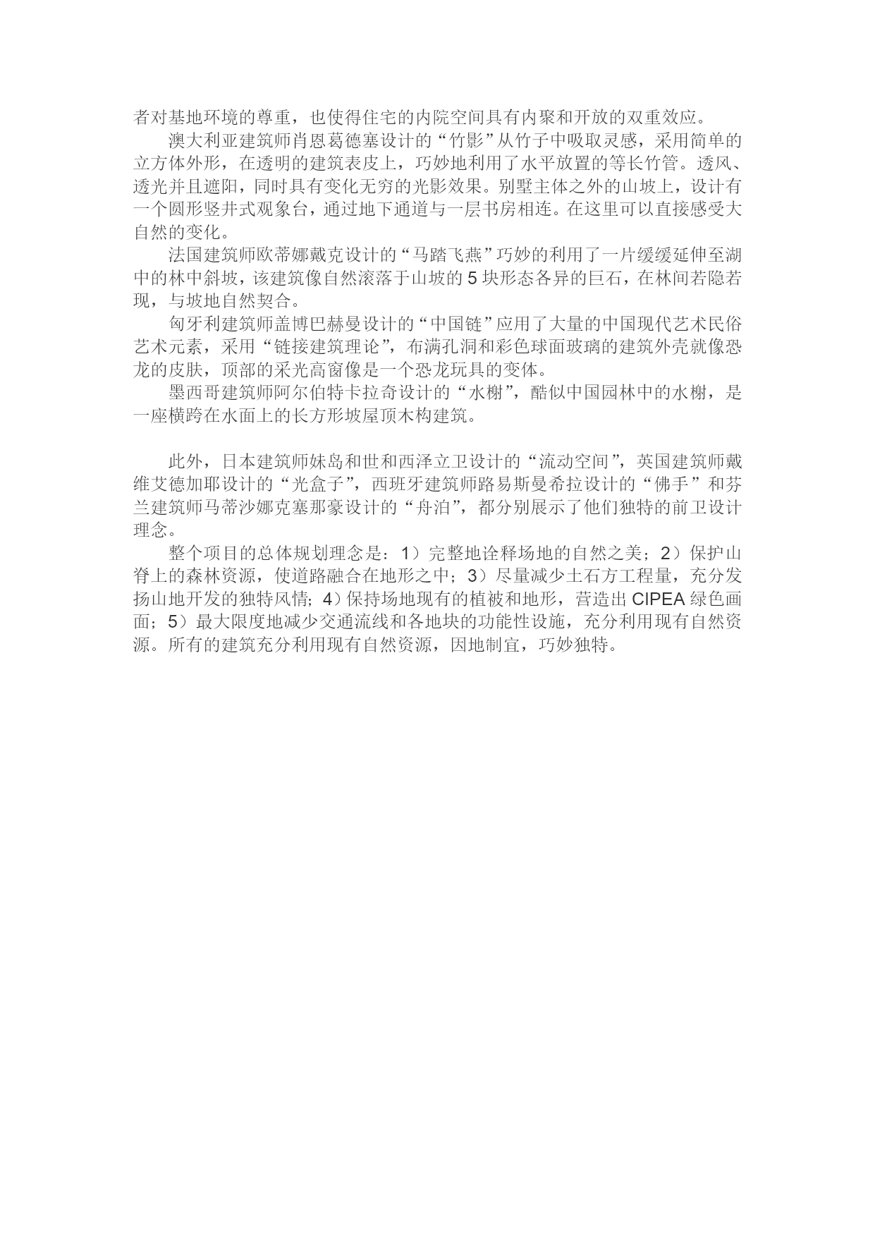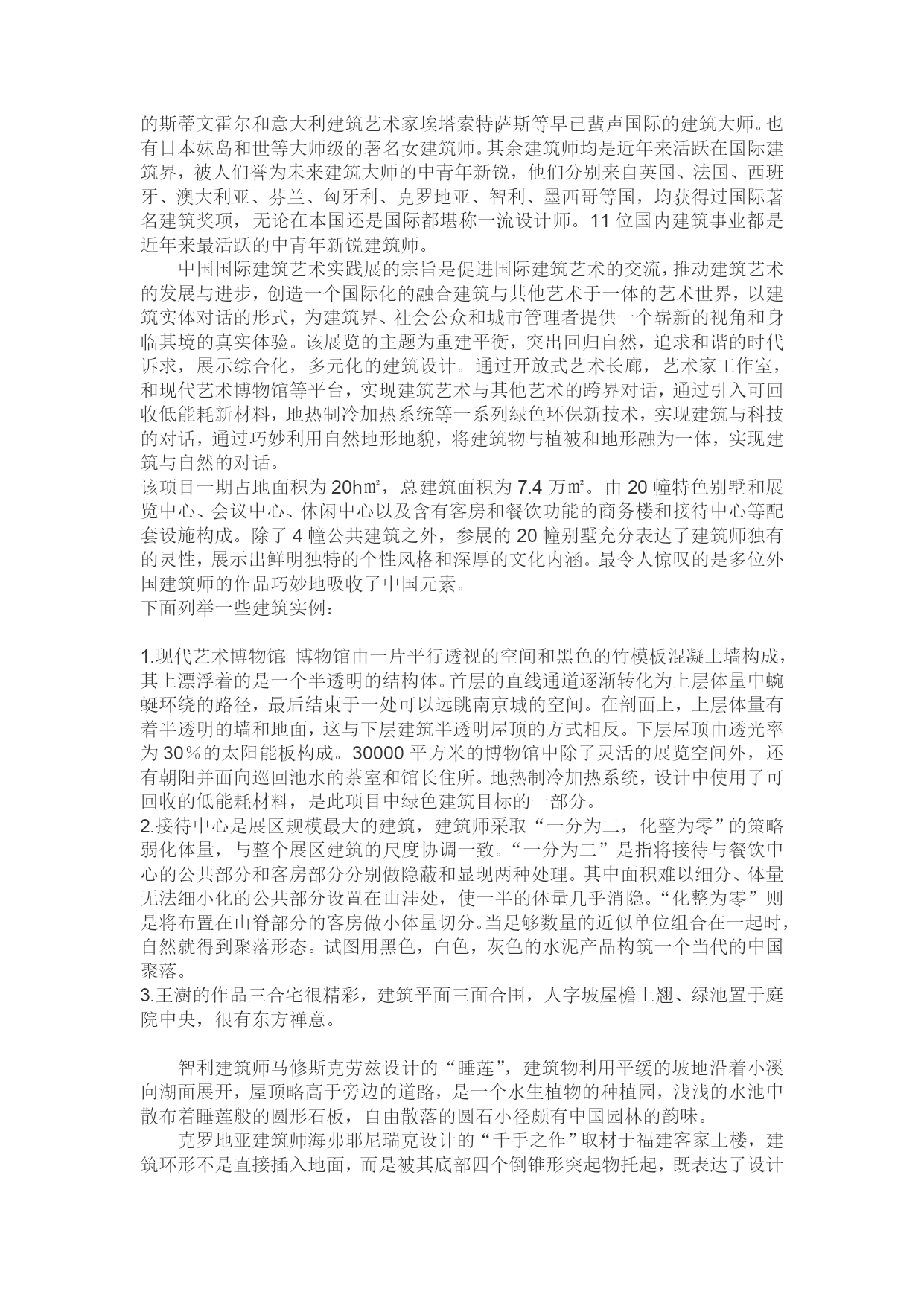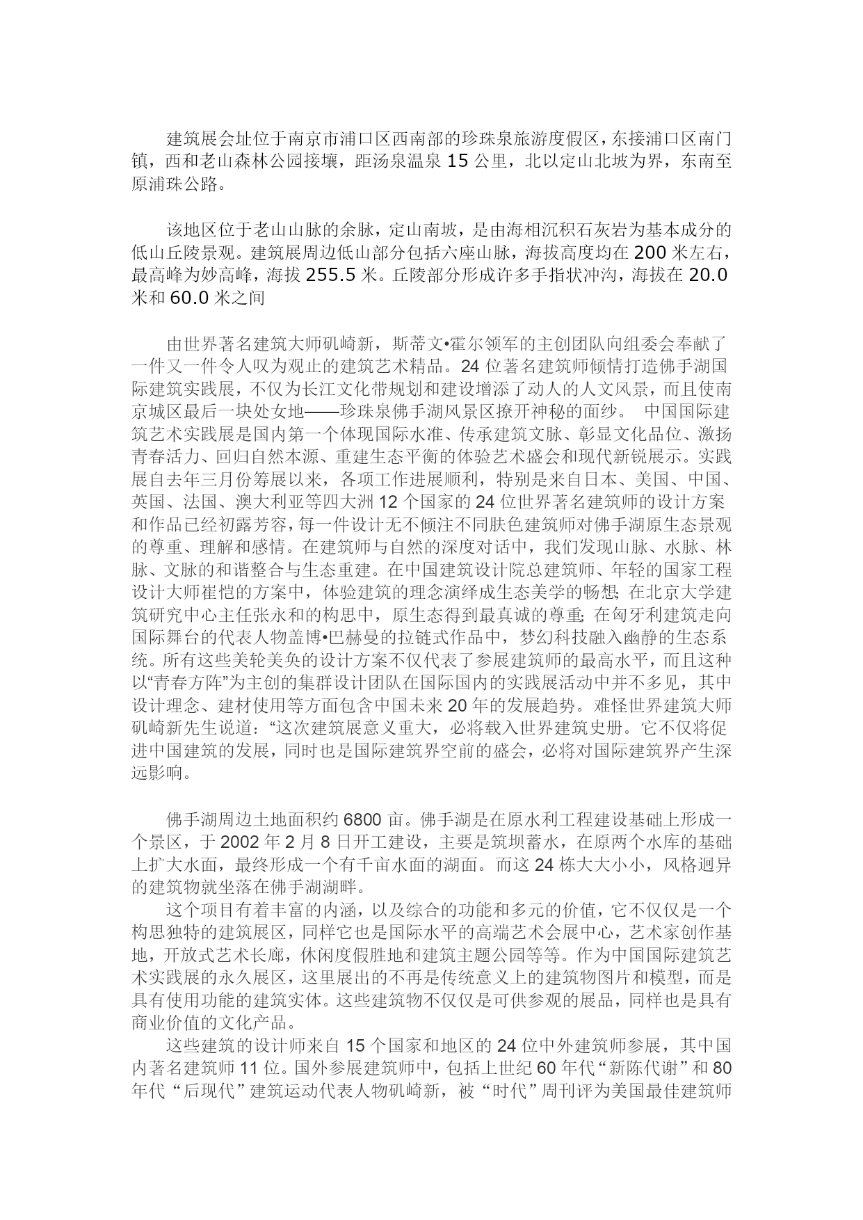 公共艺术场地实习调研——佛手湖建筑调研报告101302127周宁玥建筑展会址位于南京市浦口区西南部的珍珠泉旅游度假区,东接浦口区南门镇,西和老山森林公园接壤,距汤泉温泉15公里,北以定山北坡为界,东南至原浦珠公路。该地区位于老山山脉的余脉,定山南坡,是由海相沉积石灰岩为基本成分的低山丘陵景观。建筑展周边低山部分包括六座山脉,海拔高度均在200米左右,最高峰为妙高峰,海拔255.5米。丘陵部分形成许多手指状冲沟,海拔在20.0米和60.0米之间由世界著名建筑大师矶崎新,斯蒂文•霍尔领军的主创团队向组委会奉献了一件又一件令人叹为观止的建筑艺术精品。24位著名建筑师倾情打造佛手湖国际建筑实践展,不仅为长江文化带规划和建设增添了动人的人文风景,而且使南京城区最后一块处女地——珍珠泉佛手湖风景区撩开神秘的面纱。中国国际建筑艺术实践展是国内第一个体现国际水准、传承建筑文脉、彰显文化品位、激扬青春活力、回归自然本源、重建生态平衡的体验艺术盛会和现代新锐展示。实践展自去年三月份筹展以来,各项工作进展顺利,特别是来自日本、美国、中国、英国、法国、澳大利亚等四大洲12个国家的24位世界著名建筑师的设计方案和作品已经初露芳容,每一件设计无不倾注不同肤色建筑师对佛手湖原生态景观的尊重、理解和感情。在建筑师与自然的深度对话中,我们发现山脉、水脉、林脉、文脉的和谐整合与生态重建。在中国建筑设计院总建筑师、年轻的国家工程设计大师崔恺的方案中,体验建筑的理念演绎成生态美学的畅想;在北京大学建筑研究中心主任张永和的构思中,原生态得到最真诚的尊重;在匈牙利建筑走向国际舞台的代表人物盖博•巴赫曼的拉链式作品中,梦幻科技融入幽静的生态系统。所有这些美轮美奂的设计方案不仅代表了参展建筑师的最高水平,而且这种以“青春方阵”为主创的集群设计团队在国际国内的实践展活动中并不多见,其中设计理念、建材使用等方面包含中国未来20年的发展趋势。难怪世界建筑大师矶崎新先生说道:“这次建筑展意义重大,必将载入世界建筑史册。它不仅将促进中国建筑的发展,同时也是国际建筑界空前的盛会,必将对国际建筑界产生深远影响。佛手湖周边土地面积约6800亩。佛手湖是在原水利工程建设基础上形成一个景区,于2002年2月8日开工建设,主要是筑坝蓄水,在原两个水库的基础上扩大水面,最终形成一个有千亩水面的湖面。而这24栋大大小小,风格迥异的建筑物就坐落在佛手湖湖畔。这个项目有着丰富的内涵,以及综合的功能和多元的价值,它不仅仅是一个构思独特的建筑展区,同样它也是国际水平的高端艺术会展中心,艺术家创作基地,开放式艺术长廊,休闲度假胜地和建筑主题公园等等。作为中国国际建筑艺术实践展的永久展区,这里展出的不再是传统意义上的建筑物图片和模型,而是具有使用功能的建筑实体。这些建筑物不仅仅是可供参观的展品,同样也是具有商业价值的文化产品。这些建筑的设计师来自15个国家和地区的24位中外建筑师参展,其中国内著名建筑师11位。国外参展建筑师中,包括上世纪60年代“新陈代谢”和80年代“后现代”建筑运动代表人物矶崎新,被“时代”周刊评为美国最佳建筑师的斯蒂文霍尔和意大利建筑艺术家埃塔索特萨斯等早已蜚声国际的建筑大师。也有日本妹岛和世等大师级的著名女建筑师。其余建筑师均是近年来活跃在国际建筑界,被人们誉为未来建筑大师的中青年新锐,他们分别来自英国、法国、西班牙、澳大利亚、芬兰、匈牙利、克罗地亚、智利、墨西哥等国,均获得过国际著名建筑奖项,无论在本国还是国际都堪称一流设计师。11位国内建筑事业都是近年来最活跃的中青年新锐建筑师。中国国际建筑艺术实践展的宗旨是促进国际建筑艺术的交流,推动建筑艺术的发展与进步,创造一个国际化的融合建筑与其他艺术于一体的艺术世界,以建筑实体对话的形式,为建筑界、社会公众和城市管理者提供一个崭新的视角和身临其境的真实体验。该展览的主题为重建平衡,突出回归自然,追求和谐的时代诉求,展示综合化,多元化的建筑设计。通过开放式艺术长廊,艺术家工作室,和现代艺术博物馆等平台,实现建筑艺术与其他艺术的跨界对话,通过引入可回收低能耗新材料,地热制冷加热系统等一系列绿色环保新技术,实现建筑与科技的对话,通过巧妙利用自然地形地貌,将建筑物与植被和地形融为一体,实现建筑与自然的对话。该项目一期占地面积为20h㎡,总建筑面积为7.4万㎡。由20幢特色别墅和展览中心、会议中心、休闲中心以及含有客房和餐饮功能的商务楼和接待中心等配套设施构成。除了4幢公共建筑之外,参展的20幢别墅充分表达了建筑师独有的灵性,展示出鲜明独特的个性风格和深厚的文化内涵。最令人惊叹的是多位外国建筑师的作品巧妙地吸收了中国元素。下面列举一些建筑实例:1.现代艺术博物馆:博物馆由一片平行透视的空