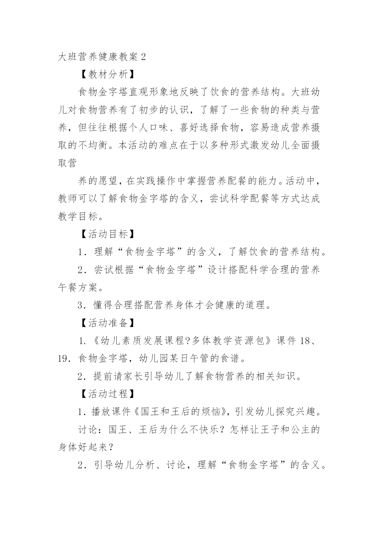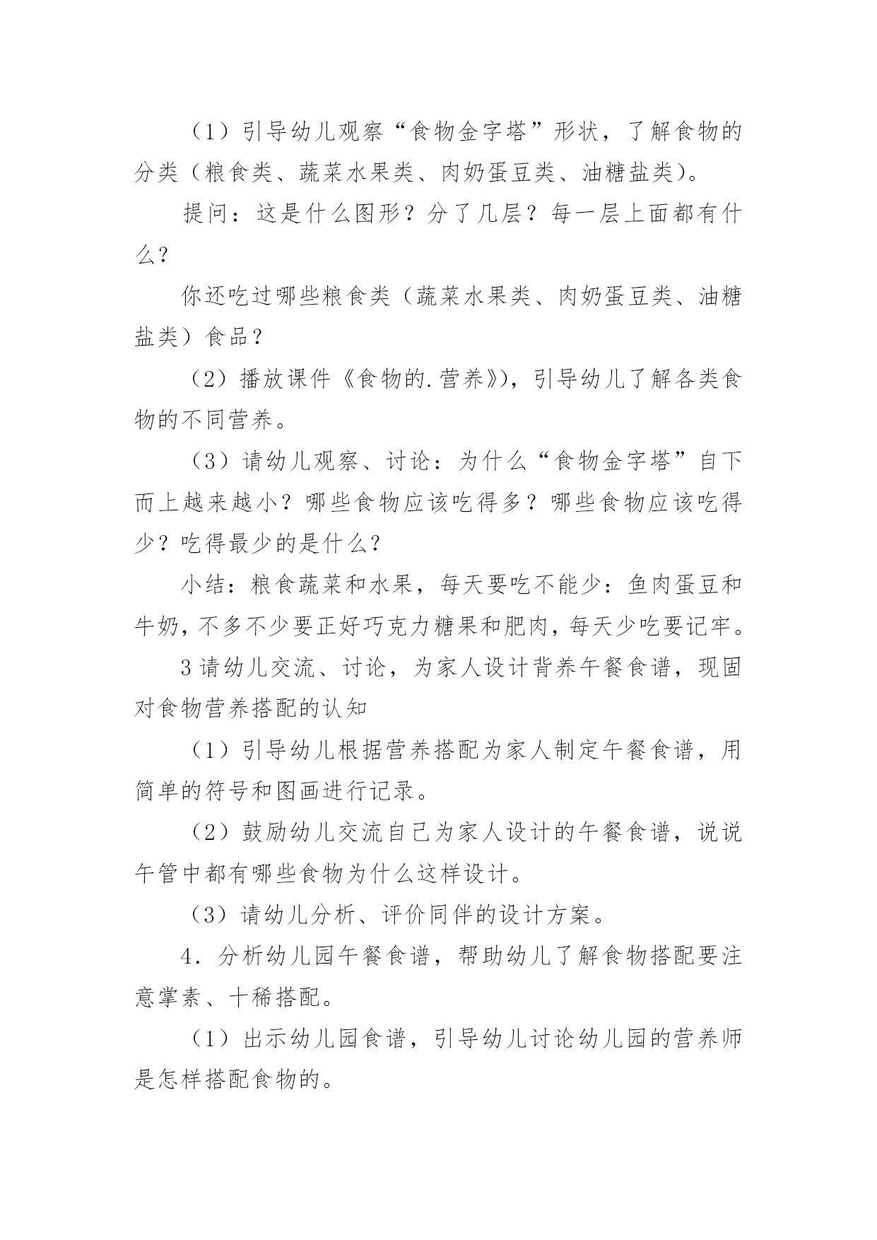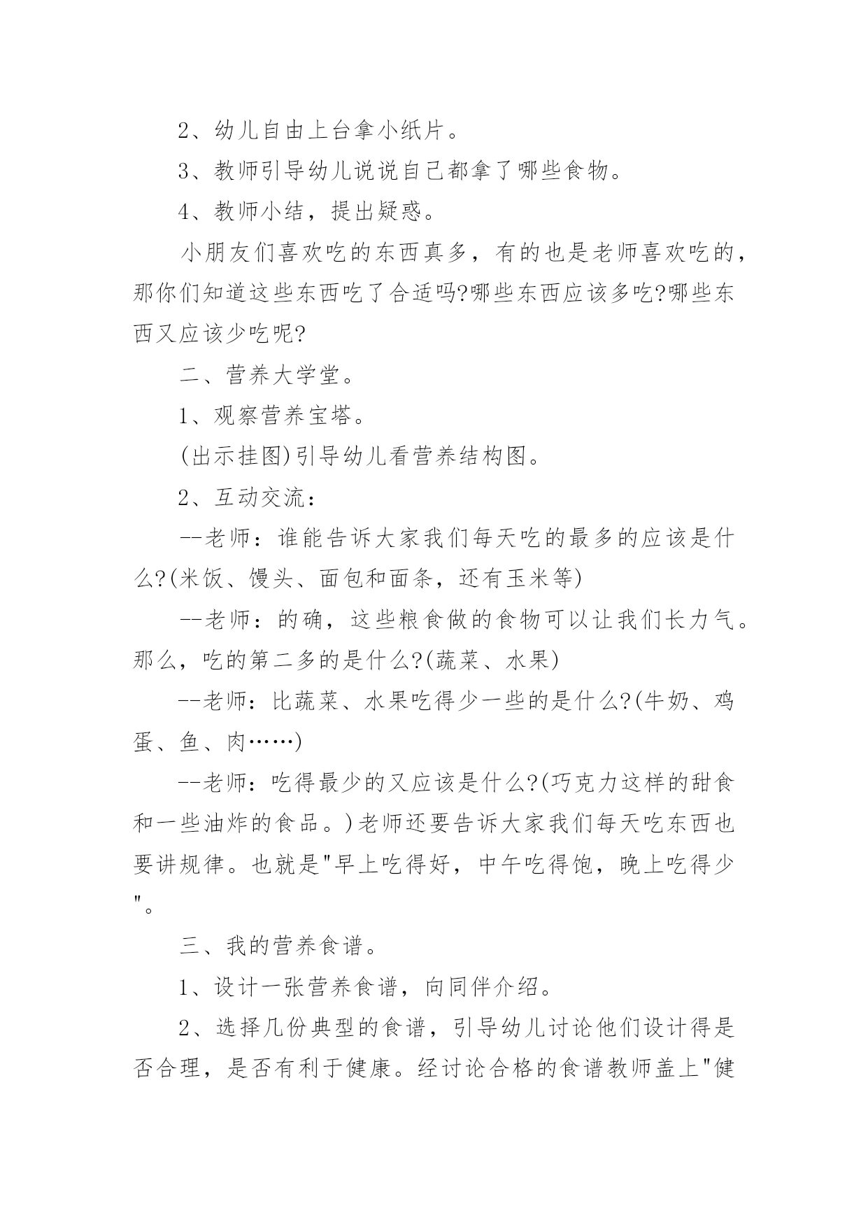 大班营养健康教案大班营养健康教案作为一名专为他人授业解惑的人民教师,总不可避免地需要编写教案,教案是教材及大纲与课堂教学的纽带和桥梁。优秀的教案都具备一些什么特点呢?以下是小编精心整理的大班营养健康教案,供大家参考借鉴,希望可以帮助到有需要的朋友。大班营养健康教案1活动目标1、观察营养宝塔,初步了解合理的饮食结构。2、通过谈话和交流,知道不能偏食,要少吃甜食和油炸食品。3、乐意向同伴介绍自己的营养餐。4、让幼儿知道愉快有益于身体健康。5、知道人体需要各种不同的营养。活动过程一、游戏导入:1、教师与幼儿互动谈话,导入游戏。师:小朋友,今天早晨你们吃了什么早餐?你们最喜欢吃什么?……现在,老师这里有许多好吃的东西,都画在了纸上,你喜欢什么就可以到老师这里随便拿。2、幼儿自由上台拿小纸片。3、教师引导幼儿说说自己都拿了哪些食物。4、教师小结,提出疑惑。小朋友们喜欢吃的东西真多,有的也是老师喜欢吃的,那你们知道这些东西吃了合适吗?哪些东西应该多吃?哪些东西又应该少吃呢?二、营养大学堂。1、观察营养宝塔。(出示挂图)引导幼儿看营养结构图。2、互动交流:--老师:谁能告诉大家我们每天吃的最多的应该是什么?(米饭、馒头、面包和面条,还有玉米等)--老师:的确,这些粮食做的食物可以让我们长力气。那么,吃的第二多的是什么?(蔬菜、水果)--老师:比蔬菜、水果吃得少一些的是什么?(牛奶、鸡蛋、鱼、肉……)--老师:吃得最少的又应该是什么?(巧克力这样的甜食和一些油炸的食品。)老师还要告诉大家我们每天吃东西也要讲规律。也就是"早上吃得好,中午吃得饱,晚上吃得少"。三、我的营养食谱。1、设计一张营养食谱,向同伴介绍。2、选择几份典型的食谱,引导幼儿讨论他们设计得是否合理,是否有利于健康。经讨论合格的食谱教师盖上"健康印章"。活动反思在教学《营养配餐》时,我结合课本中主题图呈现出我国运动员积极备战2008年奥运会的图片,紧紧围绕“运动员的饮食搭配”这一情境激发学生的学习兴趣,在此基础上,引入了营养配餐的活动,并给学生提供一些营养成分的小资料,再通过让学生帮自己设计菜谱,了解到配菜的方法和策略,并且让学生课前收集营养成分和营养配餐的资料,在课堂上展开交流,整个课堂气氛活跃,小组讨论、汇报都兴致勃勃,参与热情很高。配菜时注意营养搭配,学生在生活中并不太熟悉,学完了知识后,学生由衷地发出了感叹“原来食品搭配也有那么多的数学知识呀!”这样的.设计,不仅贴近学生的生活水平,符合学生的需要心理,而且也给学生留有一些想像的空间和期盼,使他们将数学知识和实际生活联系得更紧密。让数学教学充满生活气息和时代色彩,真正调动起学生学习数学的积极性,培养他们的自主创新能力和解决问题的能力。在这节课中,有些环节也些处理不当的地方如:时间分配不够合理在于学生设计的食谱与小明设计的食谱都出现相同的问题,各种营养成分不能满足12岁儿童成长的需要,没能及时抓住时机利用学生的资源,让学生自己思考如何使这份食谱有营养份量又合适,提高学生学生主动性。对于一些配餐方面缺乏创新的指导,例如无肉类,如何补充脂肪、蛋白质等,如何又营养份量又合适品种又多等等。大班营养健康教案2【教材分析】食物金字塔直观形象地反映了饮食的营养结构。大班幼儿对食物营养有了初步的认识,了解了一些食物的种类与营养,但往往根据个人口味、喜好选择食物,容易造成营养摄取的不均衡。本活动的难点在于以多种形式激发幼儿全面摄取营养的愿望,在实践操作中掌握营养配餐的能力。活动中,教师可以了解食物金字塔的含义,尝试科学配餐等方式达成教学目标。【活动目标】1.理解“食物金字塔”的含义,了解饮食的营养结构。2.尝试根据“食物金字塔”设计搭配科学合理的营养午餐方案。3.懂得合理搭配营养身体才会健康的道理。【活动准备】1.《幼儿素质发展课程?多体教学资源包》课件18、19.食物金字塔,幼儿园某日午管的食谱。2.提前请家长引导幼儿了解食物营养的相关知识。【活动过程】1.播放课件《国王和王后的烦恼》,引发幼儿探究兴趣。讨论:国王、王后为什么不快乐?怎样让王子和公主的身体好起来?2.引导幼儿分析、讨论,理解“食物金字塔”的含义。(1)引导幼儿观察“食物金字塔”形状,了解食物的分类(粮食类、蔬菜水果类、肉奶蛋豆类、油糖盐类)。提问:这是什么图形?分了几层?每一层上面都有什么?你还吃过哪些粮食类(蔬菜水果类、肉奶蛋豆类、油糖盐类)食品?(2)播放课件《食物的.营养》),引导幼儿了解各类食物的不同营养。(3)请幼儿观察、讨论:为什么“食物金字塔”自下而上越来越小?哪些食物应该吃得多?哪些食物应该吃得少?吃得最少的是什么?小结:粮食蔬菜和水果,每天要吃不能少:鱼肉蛋豆和牛奶,不多不少要正好巧克力糖果和肥肉,每天少吃要记牢。3请幼儿交流、讨论,为家人设计背养午餐