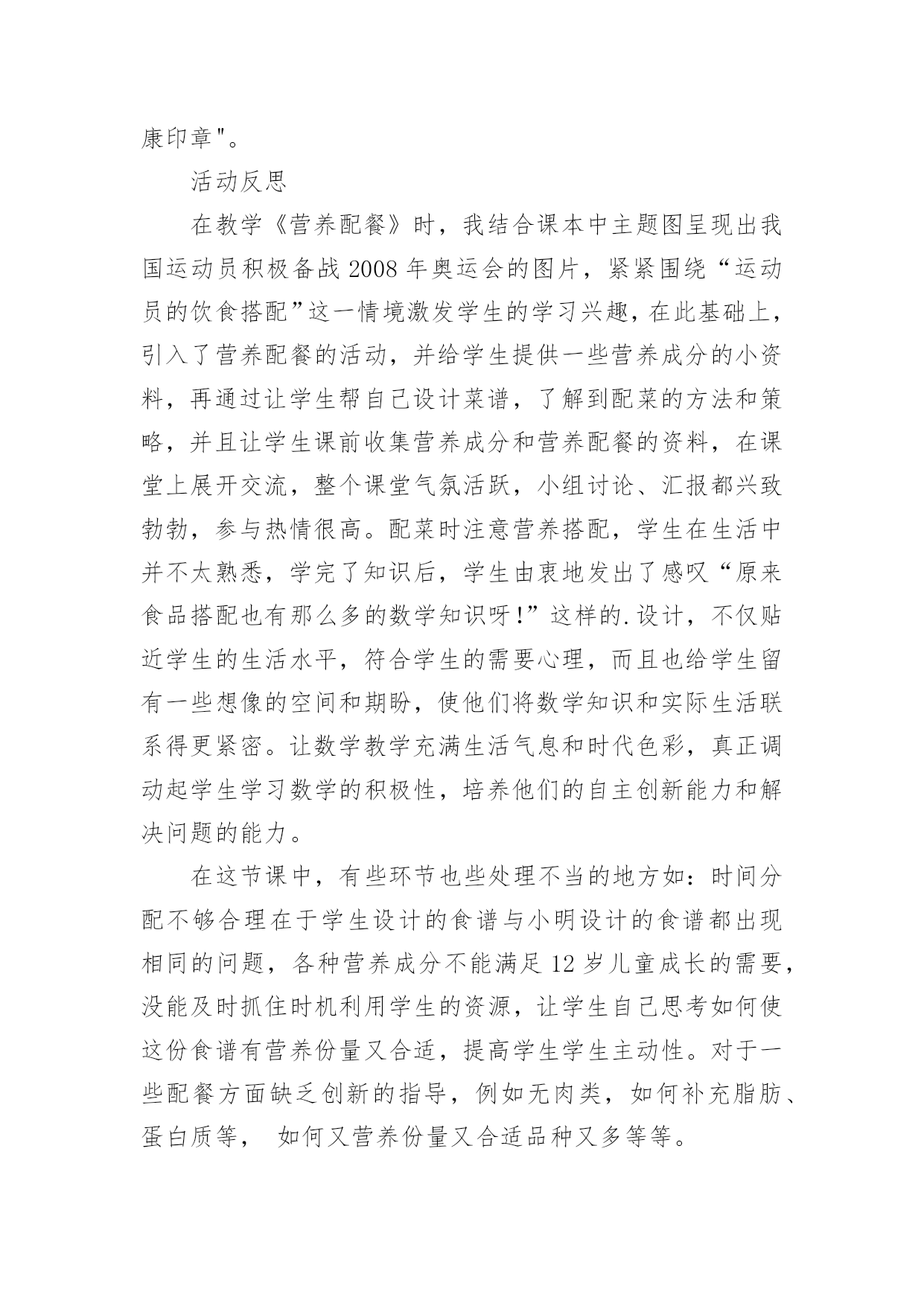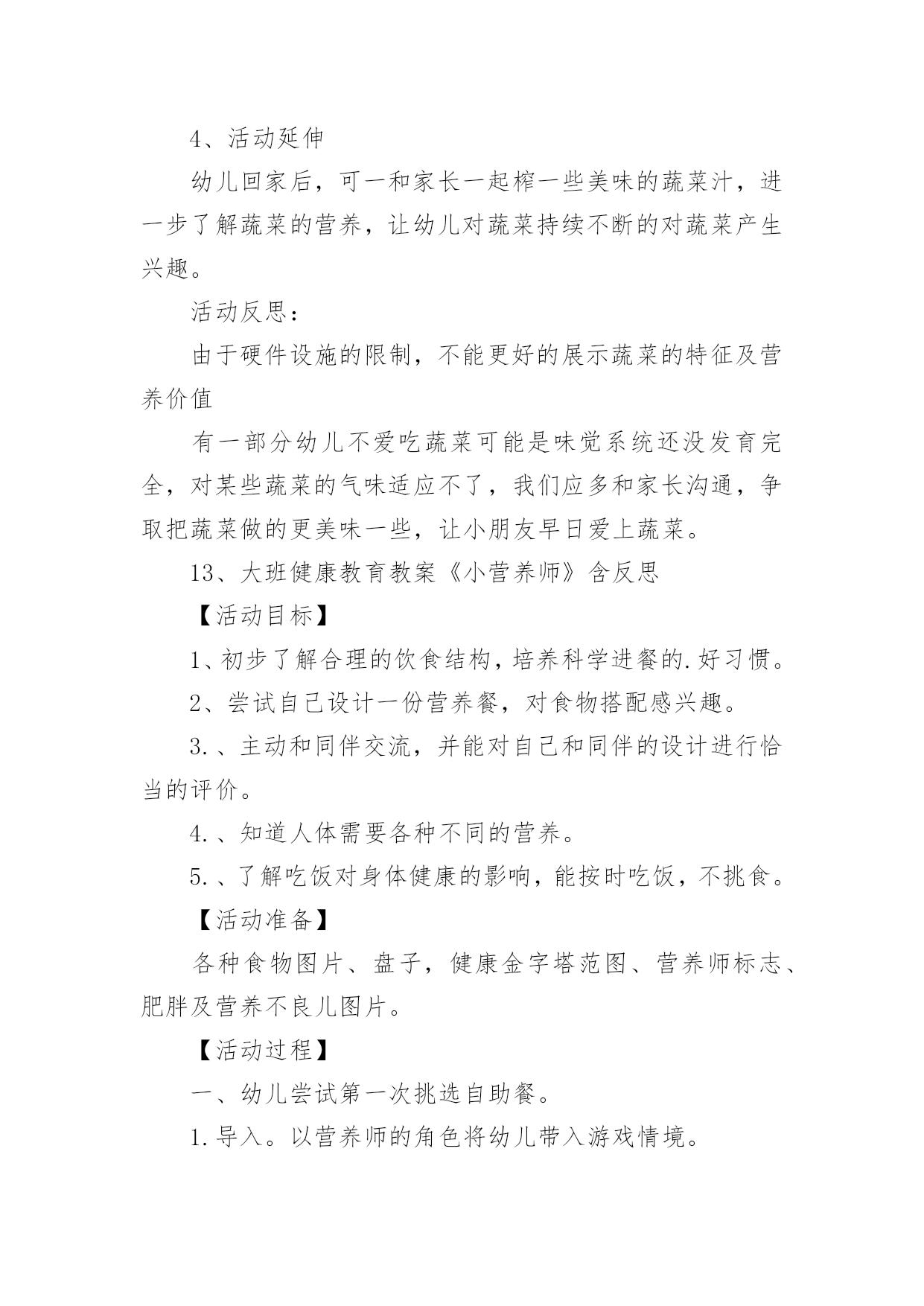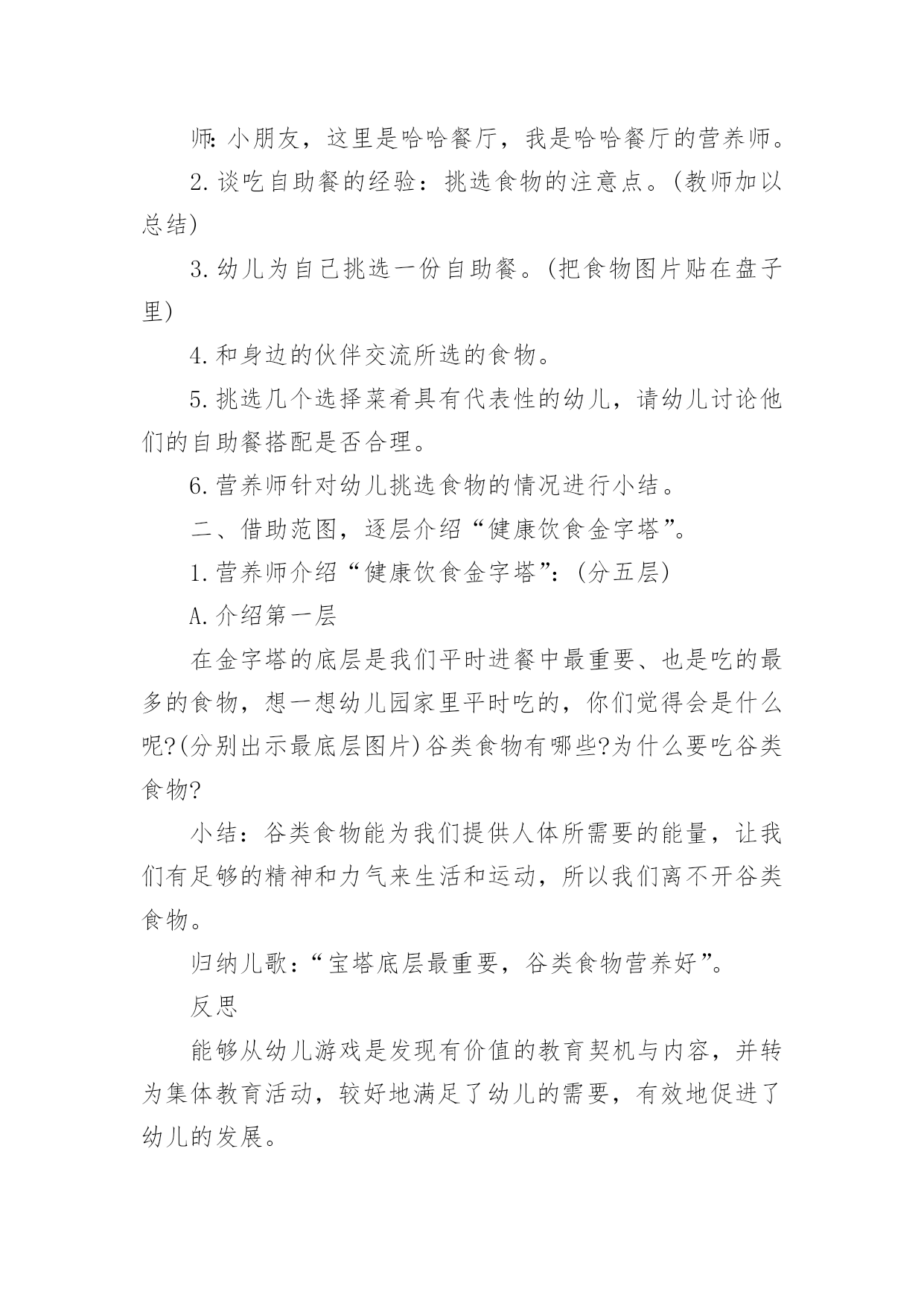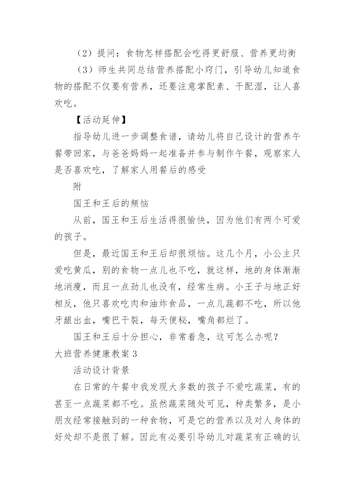 大班营养健康教案大班营养健康教案作为一名专为他人授业解惑的人民教师,总不可避免地需要编写教案,教案是教材及大纲与课堂教学的纽带和桥梁。优秀的教案都具备一些什么特点呢?以下是小编精心整理的大班营养健康教案,供大家参考借鉴,希望可以帮助到有需要的朋友。大班营养健康教案1活动目标1、观察营养宝塔,初步了解合理的饮食结构。2、通过谈话和交流,知道不能偏食,要少吃甜食和油炸食品。3、乐意向同伴介绍自己的营养餐。4、让幼儿知道愉快有益于身体健康。5、知道人体需要各种不同的营养。活动过程一、游戏导入:1、教师与幼儿互动谈话,导入游戏。师:小朋友,今天早晨你们吃了什么早餐?你们最喜欢吃什么?……现在,老师这里有许多好吃的东西,都画在了纸上,你喜欢什么就可以到老师这里随便拿。2、幼儿自由上台拿小纸片。3、教师引导幼儿说说自己都拿了哪些食物。4、教师小结,提出疑惑。小朋友们喜欢吃的东西真多,有的也是老师喜欢吃的,那你们知道这些东西吃了合适吗?哪些东西应该多吃?哪些东西又应该少吃呢?二、营养大学堂。1、观察营养宝塔。(出示挂图)引导幼儿看营养结构图。2、互动交流:--老师:谁能告诉大家我们每天吃的最多的应该是什么?(米饭、馒头、面包和面条,还有玉米等)--老师:的确,这些粮食做的食物可以让我们长力气。那么,吃的第二多的是什么?(蔬菜、水果)--老师:比蔬菜、水果吃得少一些的是什么?(牛奶、鸡蛋、鱼、肉……)--老师:吃得最少的又应该是什么?(巧克力这样的甜食和一些油炸的食品。)老师还要告诉大家我们每天吃东西也要讲规律。也就是"早上吃得好,中午吃得饱,晚上吃得少"。三、我的营养食谱。1、设计一张营养食谱,向同伴介绍。2、选择几份典型的食谱,引导幼儿讨论他们设计得是否合理,是否有利于健康。经讨论合格的食谱教师盖上"健康印章"。活动反思在教学《营养配餐》时,我结合课本中主题图呈现出我国运动员积极备战2008年奥运会的图片,紧紧围绕“运动员的饮食搭配”这一情境激发学生的学习兴趣,在此基础上,引入了营养配餐的活动,并给学生提供一些营养成分的小资料,再通过让学生帮自己设计菜谱,了解到配菜的方法和策略,并且让学生课前收集营养成分和营养配餐的资料,在课堂上展开交流,整个课堂气氛活跃,小组讨论、汇报都兴致勃勃,参与热情很高。配菜时注意营养搭配,学生在生活中并不太熟悉,学完了知识后,学生由衷地发出了感叹“原来食品搭配也有那么多的数学知识呀!”这样的.设计,不仅贴近学生的生活水平,符合学生的需要心理,而且也给学生留有一些想像的空间和期盼,使他们将数学知识和实际生活联系得更紧密。让数学教学充满生活气息和时代色彩,真正调动起学生学习数学的积极性,培养他们的自主创新能力和解决问题的能力。在这节课中,有些环节也些处理不当的地方如:时间分配不够合理在于学生设计的食谱与小明设计的食谱都出现相同的问题,各种营养成分不能满足12岁儿童成长的需要,没能及时抓住时机利用学生的资源,让学生自己思考如何使这份食谱有营养份量又合适,提高学生学生主动性。对于一些配餐方面缺乏创新的指导,例如无肉类,如何补充脂肪、蛋白质等,如何又营养份量又合适品种又多等等。大班营养健康教案2【教材分析】食物金字塔直观形象地反映了饮食的营养结构。大班幼儿对食物营养有了初步的认识,了解了一些食物的种类与营养,但往往根据个人口味、喜好选择食物,容易造成营养摄取的不均衡。本活动的难点在于以多种形式激发幼儿全面摄取营养的愿望,在实践操作中掌握营养配餐的能力。活动中,教师可以了解食物金字塔的含义,尝试科学配餐等方式达成教学目标。【活动目标】1.理解“食物金字塔”的含义,了解饮食的营养结构。2.尝试根据“食物金字塔”设计搭配科学合理的营养午餐方案。3.懂得合理搭配营养身体才会健康的道理。【活动准备】1.《幼儿素质发展课程?多体教学资源包》课件18、19.食物金字塔,幼儿园某日午管的食谱。2.提前请家长引导幼儿了解食物营养的相关知识。【活动过程】1.播放课件《国王和王后的烦恼》,引发幼儿探究兴趣。讨论:国王、王后为什么不快乐?怎样让王子和公主的身体好起来?2.引导幼儿分析、讨论,理解“食物金字塔”的含义。(1)引导幼儿观察“食物金字塔”形状,了解食物的分类(粮食类、蔬菜水果类、肉奶蛋豆类、油糖盐类)。提问:这是什么图形?分了几层?每一层上面都有什么?你还吃过哪些粮食类(蔬菜水果类、肉奶蛋豆类、油糖盐类)食品?(2)播放课件《食物的.营养》),引导幼儿了解各类食物的不同营养。(3)请幼儿观察、讨论:为什么“食物金字塔”自下而上越来越小?哪些食物应该吃得多?哪些食物应该吃得少?吃得最少的是什么?小结:粮食蔬菜和水果,每天要吃不能少:鱼肉蛋豆和牛奶,不多不少要正好巧克力糖果和肥肉,每天少吃要记牢。3请幼儿交流、讨论,为家人设计背养午餐