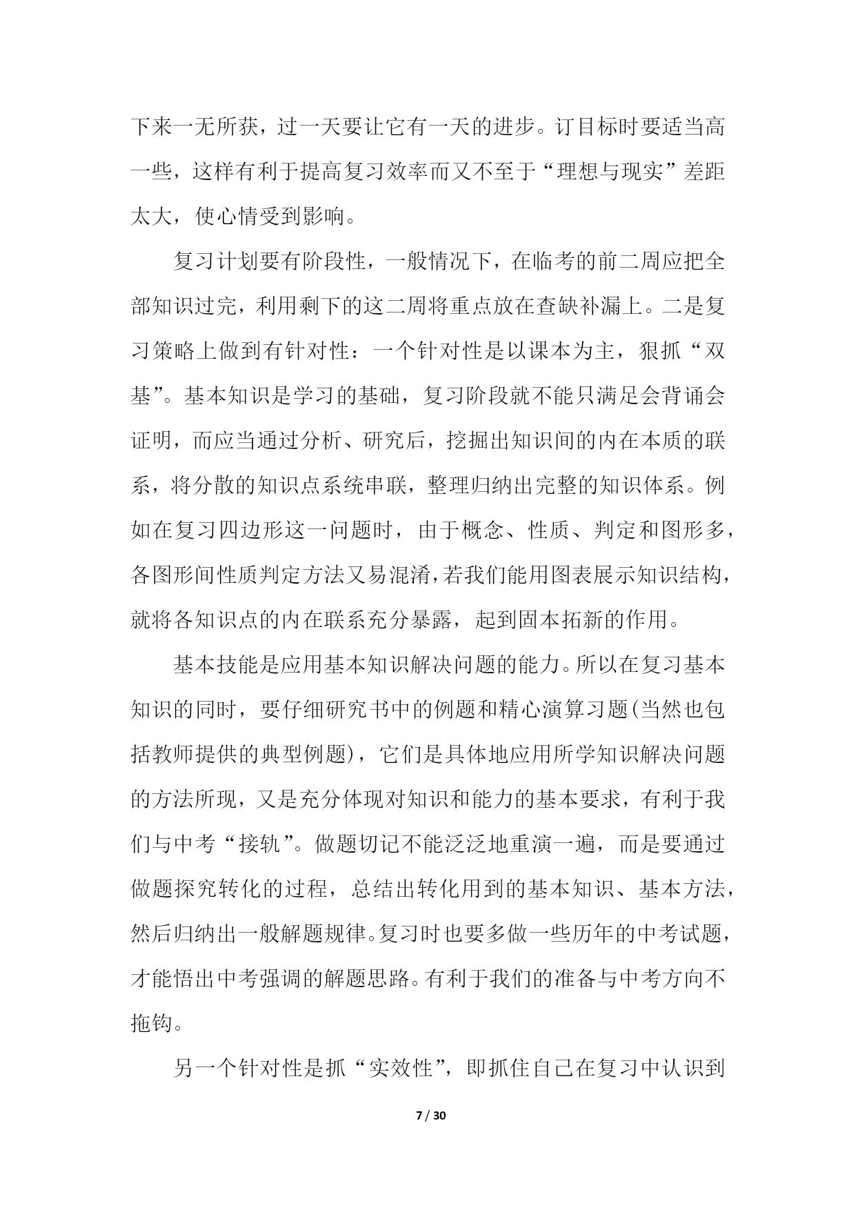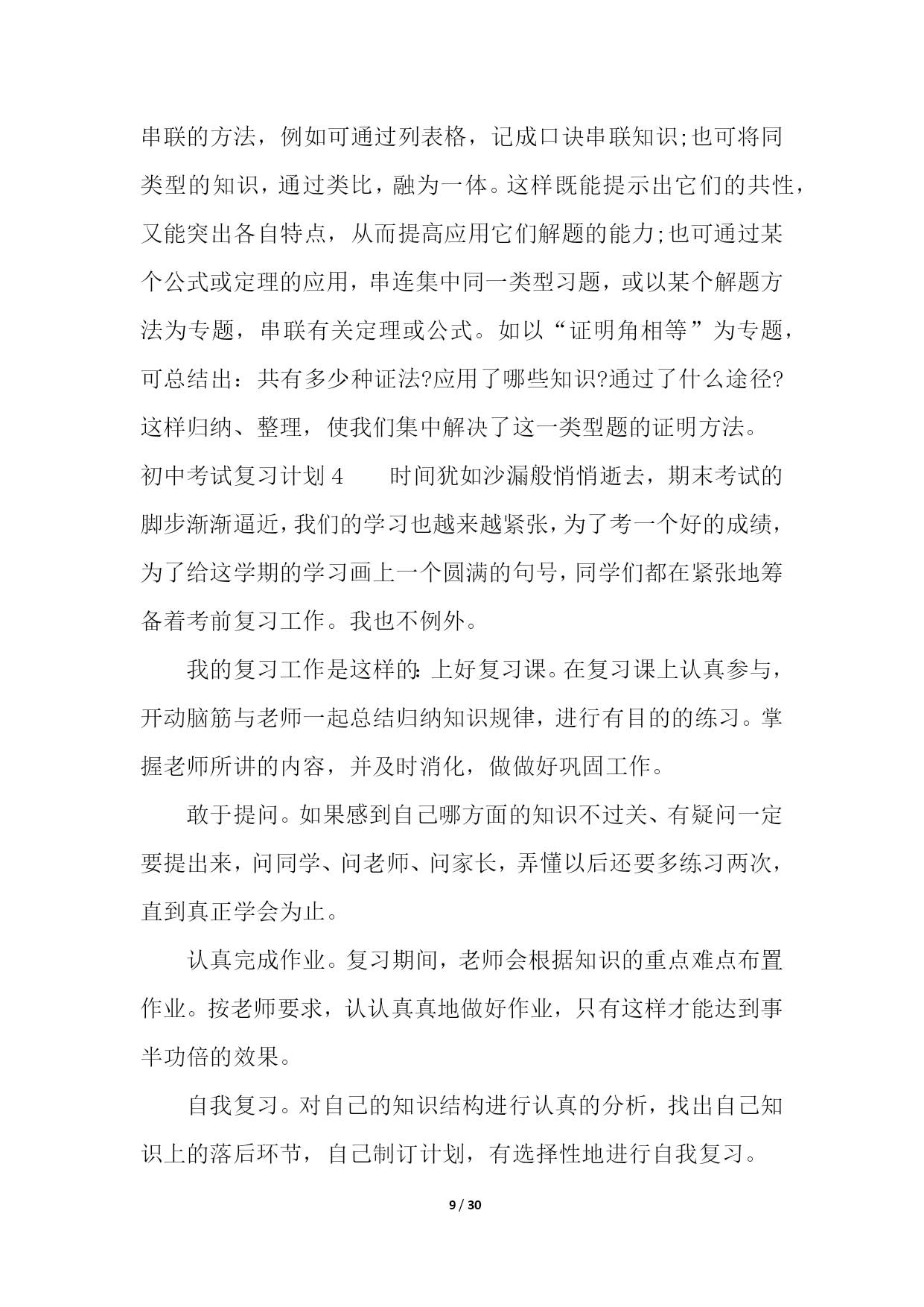 PAGE30/NUMPAGES30初中考试复习计划初中考试复习计划1一、总体思路由于语文学习是分阶段、分课时进行的,每个阶段每个课时都要接触一些新知识,而学过的知识则变成了旧知识。新旧知识之间本来是有联系的,但由于语文教学中的阶段性,使知识之间形成了间隔。为了使新旧知识能相互沟通,由点到线,由线到面,从而形成知识网络,达到掌握知识、运用知识的目的,我们采取疏通思路,分阶段分步骤复习的方法。二、具体做法(一)课本知识的复习阶段这个阶段的复习目的是以教材为本,帮助学生过好课本关,掌握好课本上的基础知识和基本技能。由于复习时间短,我们准备采用以下方法:大胆取舍复习内容,打破逐册复习的方法,确定好重点的册,然后再分体裁复习。分体裁复习时确定好重点的单元、重点的课文及语文知识(当然非重点的内容也涉及一些),然后让学生进一步明确要求,避免学生盲目复习。同时就这些内容一般怎样考,会出现哪些问题及怎能样应对,让学生掌握一些基本的技能和方法。(二)知识点归类复习在课本知识复习的基础上,把初中阶段要求掌握的知识点作如下几大类复习:1、基础知识及语言运用这里面的知识点多,但主要是要求学生会运用语文知识解决问题。也就是要求学生能仿句、能对对联、能根据一句话提练观点、能简明、连贯、得体地使用语言等等。2、阅读训练(1)现代文阅读现代文阅读是中考复习的一个很重要的内容,我们将对现代文进行分类,即记叙文(包括散文、小说)、说明文、议文章三类,每一类都对学生进行有针对性的训练。通过对近几年各地中考题研究发现:中考现代文阅读体裁多样,题材丰富,意蕴深刻,强调整体感悟。《课程标准》指出:“阅读评价要综合考察学生阅读过程中的感受、体验、理解和价值取向。”因而我们在复习时必须让学生对每一类型都要涉及,但又不能面面具到。我们准备在复习时做到突出重点,抓住难点,授予方法。具体方法如下:精心选取阅读材料,主要选取意蕴深刻、对学生有情感教育作用的、能对学生人生观、价值观有引导作用的文章;精心设计问题,着重设具有层次性、能考查学生对整篇文章融合贯通的理解和把握能力,着重培养学生探究性阅读和创造性阅读的能力,提倡多角度、有创意的阅读,利用阅读期待、阅读反思和批判等环节,拓展思维空间,提高阅读质量;注重方法指导,在解答阅读题时,我们要求学生不要去关心问题的答案,而要总结有关规律性的知识和解题的思路方法。(2)文言文阅读文言文是我国古代文化的重要载体,是现代汉语的源头,学好文言文是继承民族优秀文化的需要,也是学好语文的需要。《课程标准》指出,文言文的学习目标是:“阅读浅易文言文,能借助注释和工具书理解基本内容。背诵优秀诗文80篇。”文言文阅读是中考语文试题的重要组成部分,但在中考命题上除了取材课内的文言文段外,课外阅读文段必须难度适中。在试题设计上“言”“文”并重,即既考查学生文言基础知识,也考查学生对文意的理解和把握。近几年来,对文言文的阅读开始重视对文意的理解、分析、概括、评价能力的考查。因此我们在阅读训练时也要向这一方向发展。3、作文训练我们在这一阶段主要让学生会学记叙文、说明文和议文章,让学生明确每一类文章的写法。同时让学生限时作文,养成写作文的好习惯。(三)综合强化复习阶段这一阶段的复习目的是:通过训练,提高学生综合运用知识、分析解决问题的能力,而阅读理解和写作题就很好的训练了学生的这些能力,因此我们准备重点训练这些内容。1、阅读训练,前面已讲了复习方法,在这里只是把各种方法进行综合,从而让学生提高。2、写作训练在这一阶段,我们准备突出针对学生作文中存在的问题进行训练,指导学生。同时强化限时作文。3、精选部分中考试题,组成几套专题练习,进行强化训练。4、精选几套中考模拟试题进行近似实战的强化训练,注意发现问题,及时指导。在这时应让学生适应,但要控制次数,防止学生产生厌考情绪。初中考试复习计划2专家建议同学们,在期中考试后,先不要忙着分析试卷,而是向自己提出三个问题:1.名次、成绩跟以往相比是上升还是下滑?2.如果上升,是因为考试题目适合你(有些同学遇到比较难的题目反而成绩会比较好,有些则反之),还是其他同学出现了失误,还是自己的真实水平的确上升了?3.如果在班级里的名次下滑,问题又出在哪里?针对这次的期中考试成绩以及近期的学习状态如此“三省”下来,同学们就能从整体上把握住此次期中考成败的关键因素和自己所面临的处境,以及所要努力的方向了。有许多同学在期中考试后,往往只是关注于考试成绩而忽略了更为重要的考后反思工作,专家在此强调,无论考试成绩优或劣,考试后都要认真地进行总结,因为只有这样,学生才能找到考好的原因抑或是考得不好的原因。找到了问题的根结,在今后的学习中就会更有利于自己发挥优点,改正缺点,从而在之后的考试中发挥出优异水平,所以说考后自我反省的意义