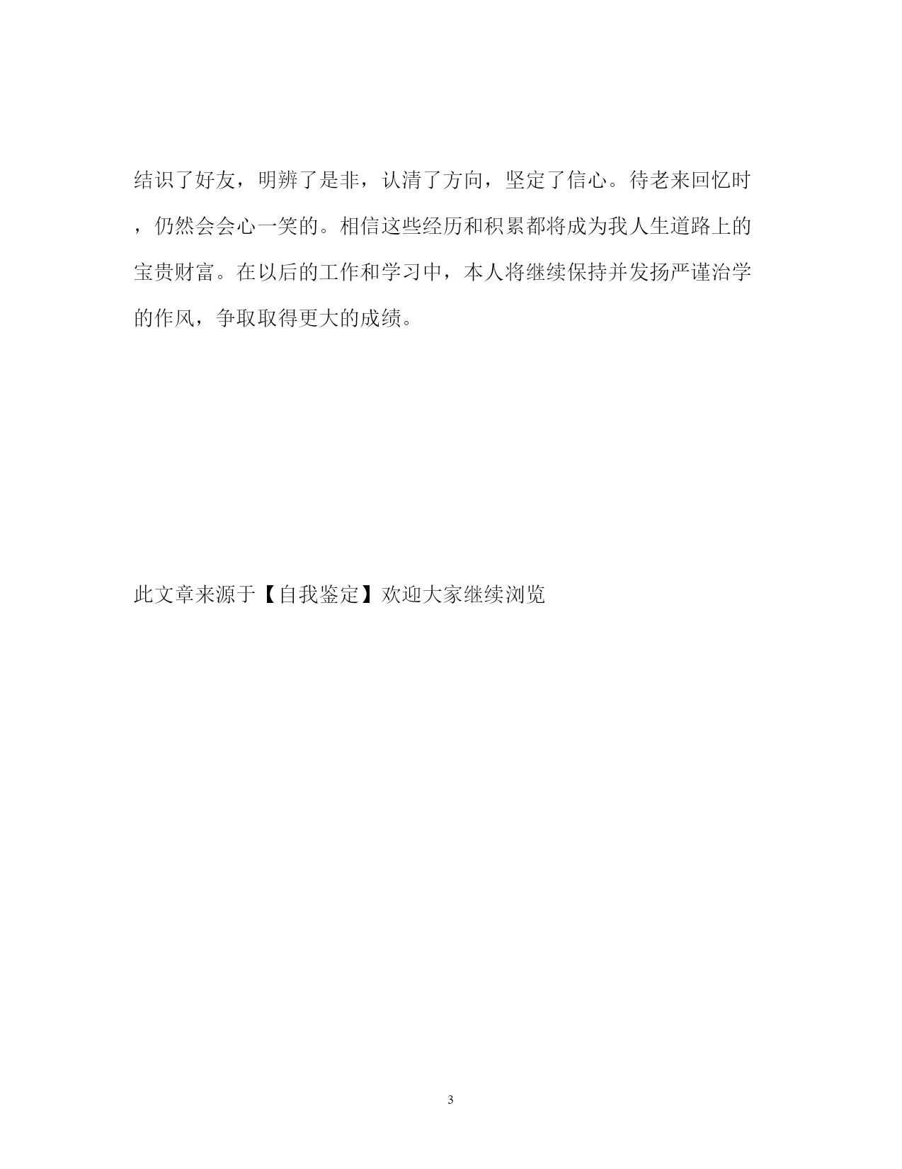此资料由网络收集而来,如有侵权请告知上传者立即删除。资料共分享,我们负责传递知识。PAGEPAGE3三年的研究生学习的自我鉴定三年的研究生学习的自我鉴定三年的研究生学习的自我鉴定三年的研究生,三年的学习,岁月匆匆,时光匆匆在身上留下了深深的烙印,这耐人寻味的烙印必将陪伴我,必将在以后的学习、生活和工作中时刻感染着我、激励着我,三年,受益匪浅的三年。曾记得,初入大学的我,稚嫩欲动的心怀揣着美好的憧憬与理想,每个人都为着心中的那个目标奋斗拼搏,在大学的课堂里汲取无限的知识,在与同学的交往中学到为人的品格,在各类活动中感悟处事的精神。而今,即将踏上工作的征途,不禁感慨,大学的磨练与学习会在今后的工作生活中熠熠生辉的,因为所有的这些都见证了一个人的’成长过程,所有的这些都改变了甚至培育了一个人,所有的这些都将在潜移默化中继续影响着我,直到永远。大学的大课堂里,我学会了怎样用一颗热情真挚的心,去追寻心中的梦想,如何用辛勤的双手、苦涩的汗水去耕耘属于自己天空。艰苦朴素、实事求是、严格要求、勇于探索,按着校训的轨迹,踏实地走好自己的路,为了明天,为了理想。努力用诚挚、感动的心规范自身。思想上的积极、乐观、上进,指导着行动的方向。为人与处事,相辅相成,为人的品质决定了处事的风格,处事的风格又影响了为人的品质。真诚、热情、友好提高是最重要的。我组织和参与了实验室的系列体育赛事,并获得了不错的名次;积极参加学校的辩论赛。坚持听一些社会、文化等领域的名家讲座,提高自身的修养。业余时间爱好摄影,作为青年志愿者参与了国际学术会议的拍摄工作并负责实验室重大活动的摄影任务;在摄影专业杂志发表文章一篇。我在研究生阶段所获颇多,从学业、科研工作,到个人素质,都得到了充分的培养和锻炼,是充实且有意义的三年。试想人的一生又有几个三年?经历了许多,磨砺了许多,积累了许多。结识了好友,明辨了是非,认清了方向,坚定了信心。待老来回忆时,仍然会会心一笑的。相信这些经历和积累都将成为我人生道路上的宝贵财富。在以后的工作和学习中,本人将继续保持并发扬严谨治学的作风,争取取得更大的成绩。此文章来源于【自我鉴定】欢迎大家继续浏览