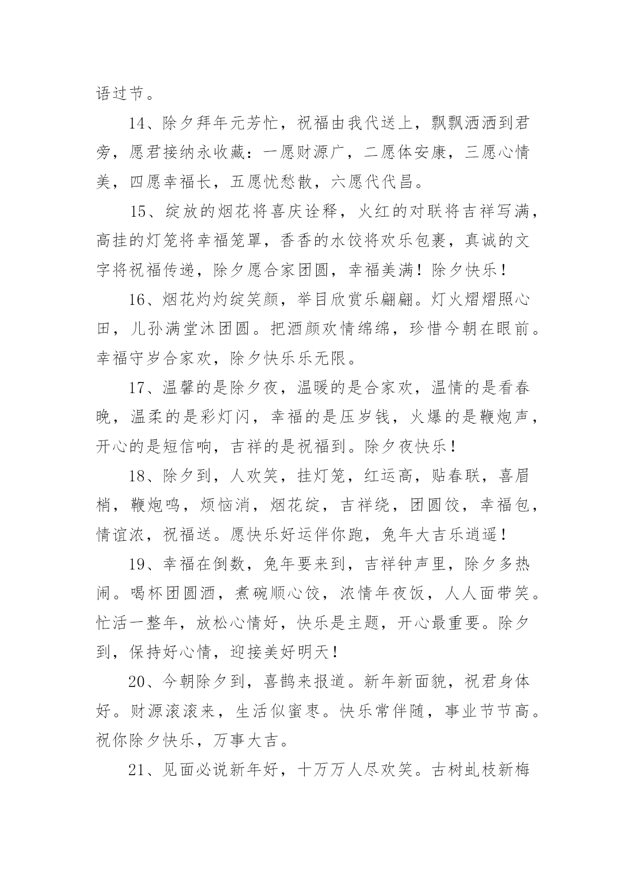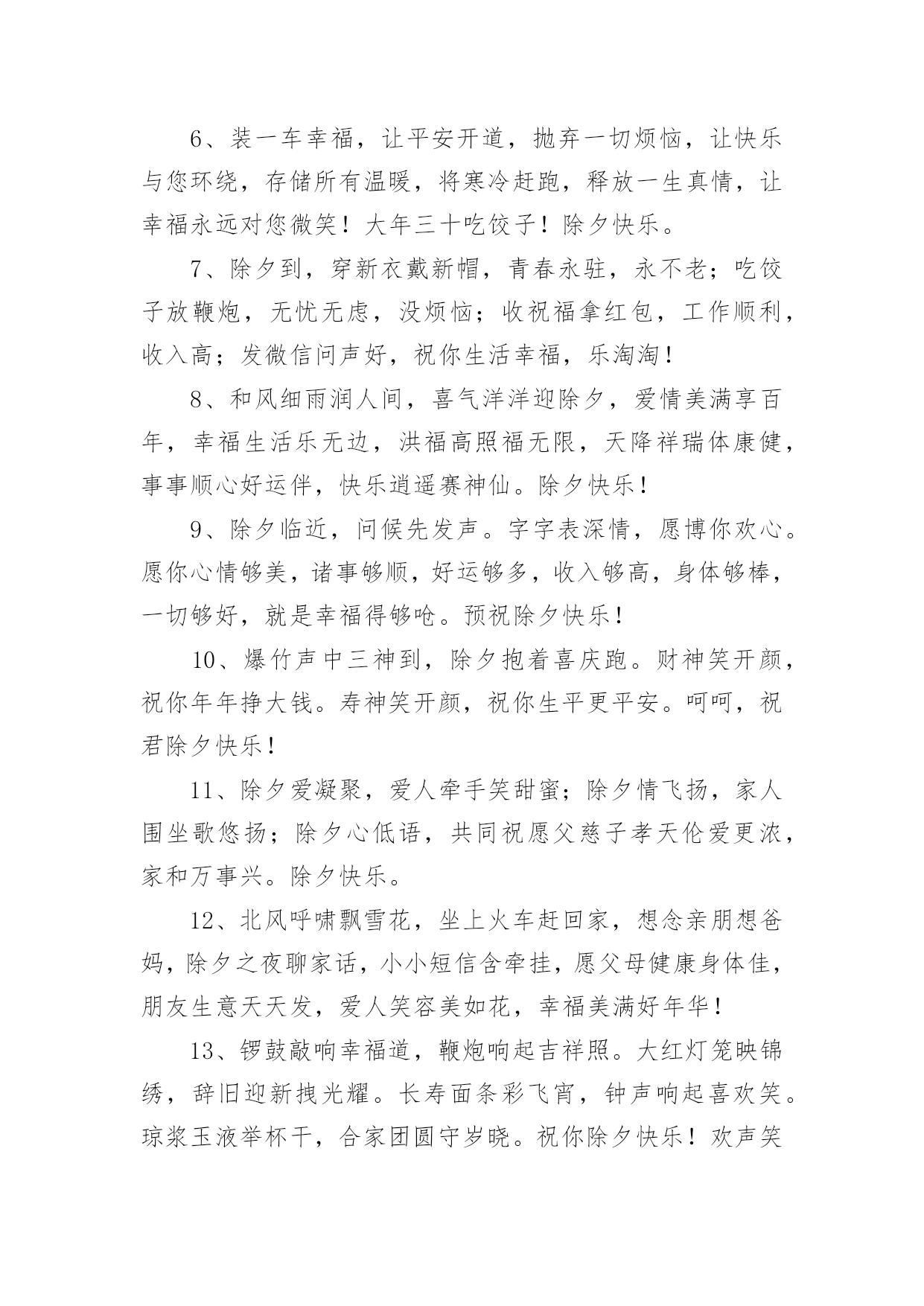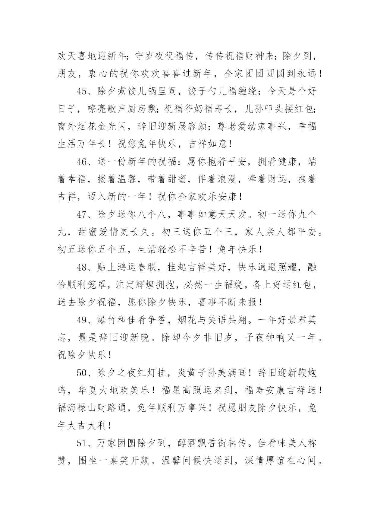 除夕夜祝福简短文案除夕夜祝福简短文案随着社交网络的迅猛发展,大家总少不了接触一些耳熟能详的文案吧,文案用于跟亲朋好友分享个人生活情况。那什么样的文案才是新颖独特的呢?以下是小编精心整理的除夕夜祝福简短文案,供大家参考借鉴,希望可以帮助到有需要的朋友。1、兔年除夕到眼前,风风火火拜个年:勤勤恳恳收获年,红红火火发财年,热热闹闹欢喜年,健健康康养生年,嘻嘻哈哈开心年,和和美美和谐年!2、除夕夜晚灯火煌,儿孙回家大团圆。爸妈亲做一桌宴,举杯换盏守岁年。孝顺儿孙敬高堂,祝愿老人长寿康。子孙满堂快乐享,喜迎除夕幸福长。祝你除夕喜乐扬!3、除夕到眼前,风风火火拜个年:勤勤恳恳收获年,红红火火发财年,热热闹闹欢喜年,健健康康养生年,嘻嘻哈哈开心年,和和美美和谐年!4、烛光将吉祥摇曳,烟花将幸福绽放,酒杯将如意碰响,除夕将团圆升华,文字将祝福传递,除夕,愿合家欢乐,幸福美满,除夕快乐!5、有一种幸福安安静静,有一种拥有实实在在,有一种快乐飘飘洒洒,有一种自在平平淡淡,有一种友情长长久久,有一个我祝你除夕快乐。6、装一车幸福,让平安开道,抛弃一切烦恼,让快乐与您环绕,存储所有温暖,将寒冷赶跑,释放一生真情,让幸福永远对您微笑!大年三十吃饺子!除夕快乐。7、除夕到,穿新衣戴新帽,青春永驻,永不老;吃饺子放鞭炮,无忧无虑,没烦恼;收祝福拿红包,工作顺利,收入高;发微信问声好,祝你生活幸福,乐淘淘!8、和风细雨润人间,喜气洋洋迎除夕,爱情美满享百年,幸福生活乐无边,洪福高照福无限,天降祥瑞体康健,事事顺心好运伴,快乐逍遥赛神仙。除夕快乐!9、除夕临近,问候先发声。字字表深情,愿博你欢心。愿你心情够美,诸事够顺,好运够多,收入够高,身体够棒,一切够好,就是幸福得够呛。预祝除夕快乐!10、爆竹声中三神到,除夕抱着喜庆跑。财神笑开颜,祝你年年挣大钱。寿神笑开颜,祝你生平更平安。呵呵,祝君除夕快乐!11、除夕爱凝聚,爱人牵手笑甜蜜;除夕情飞扬,家人围坐歌悠扬;除夕心低语,共同祝愿父慈子孝天伦爱更浓,家和万事兴。除夕快乐。12、北风呼啸飘雪花,坐上火车赶回家,想念亲朋想爸妈,除夕之夜聊家话,小小短信含牵挂,愿父母健康身体佳,朋友生意天天发,爱人笑容美如花,幸福美满好年华!13、锣鼓敲响幸福道,鞭炮响起吉祥照。大红灯笼映锦绣,辞旧迎新拽光耀。长寿面条彩飞宵,钟声响起喜欢笑。琼浆玉液举杯干,合家团圆守岁晓。祝你除夕快乐!欢声笑语过节。14、除夕拜年元芳忙,祝福由我代送上,飘飘洒洒到君旁,愿君接纳永收藏:一愿财源广,二愿体安康,三愿心情美,四愿幸福长,五愿忧愁散,六愿代代昌。15、绽放的烟花将喜庆诠释,火红的对联将吉祥写满,高挂的灯笼将幸福笼罩,香香的水饺将欢乐包裹,真诚的文字将祝福传递,除夕愿合家团圆,幸福美满!除夕快乐!16、烟花灼灼绽笑颜,举目欣赏乐翩翩。灯火熠熠照心田,儿孙满堂沐团圆。把酒颜欢情绵绵,珍惜今朝在眼前。幸福守岁合家欢,除夕快乐乐无限。17、温馨的是除夕夜,温暖的是合家欢,温情的是看春晚,温柔的是彩灯闪,幸福的是压岁钱,火爆的是鞭炮声,开心的是短信响,吉祥的是祝福到。除夕夜快乐!18、除夕到,人欢笑,挂灯笼,红运高,贴春联,喜眉梢,鞭炮鸣,烦恼消,烟花绽,吉祥绕,团圆饺,幸福包,情谊浓,祝福送。愿快乐好运伴你跑,兔年大吉乐逍遥!19、幸福在倒数,兔年要来到,吉祥钟声里,除夕多热闹。喝杯团圆酒,煮碗顺心饺,浓情年夜饭,人人面带笑。忙活一整年,放松心情好,快乐是主题,开心最重要。除夕到,保持好心情,迎接美好明天!20、今朝除夕到,喜鹊来报道。新年新面貌,祝君身体好。财源滚滚来,生活似蜜枣。快乐常伴随,事业节节高。祝你除夕快乐,万事大吉。21、见面必说新年好,十万万人尽欢笑。古树虬枝新梅老,庙堂年画结寿桃。枝上雪残吹又少,除夕除旧无烦恼。吃好玩好休息好,除夕守岁燃鞭炮。除夕快乐,兔年吉祥!22、佳肴是除夕夜的礼物,团圆是除夕夜的情怀,幸福是除夕夜的节拍,守岁是除夕夜的故事,祝福是除夕夜不变的表白:除夕快乐!23、季节有冷有暖,时间有长有短,岁月有甜有酸,故事有我有你,工作有张有弛,生活有喜有乐,业绩有模有样,朋友有情有义,愿你应有尽有,预祝除夕快乐!24、吉祥鞭炮响彻云霄,祈祷父母健康安好,盼望孩子茁壮成长,守望爱人携手到老。除夕,亲手点燃祝愿的烟花,五彩缤纷斑斓朋友亲人的新年梦想。祝你除夕快乐,和幸福抱抱。25、辞去旧岁迎新年,迎来一年好运气;温馨可口年夜饭,万家团圆展笑颜;祝福朋友合家欢,幸福美满乐逍遥。除夕快乐!26、欢乐除夕之夜,“吉祥天空”飘过朵朵福云,“欢乐海洋”增添缕缕乐波,“美事山上”升起喜气阵阵,“送福短信”送来祝福声声:恭祝您除夕穿“金”带“银”,团“福”圆“运”!27、兔年又到,吉星高照。除夕夜送祝福,初一送问候,短信不迟到,