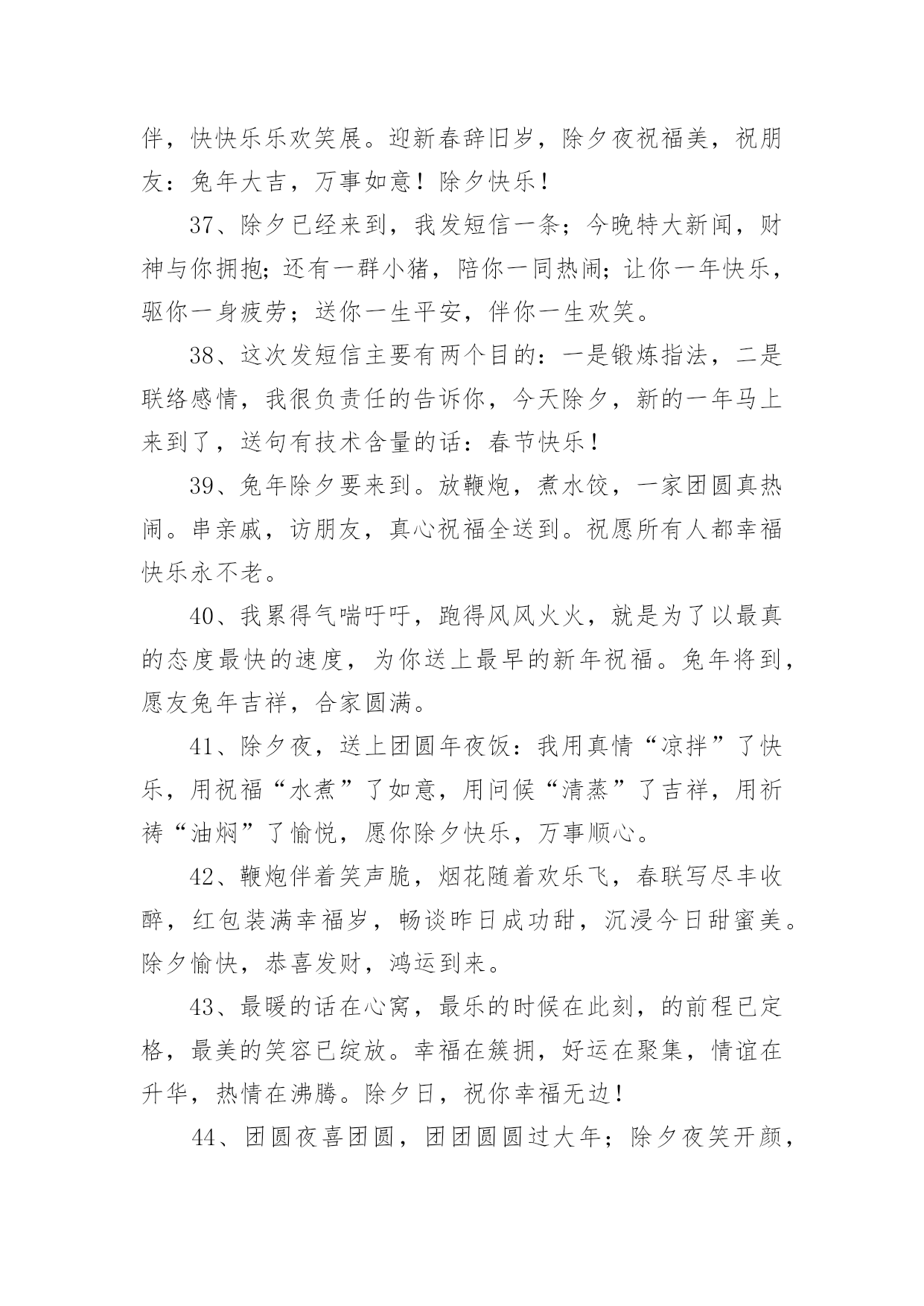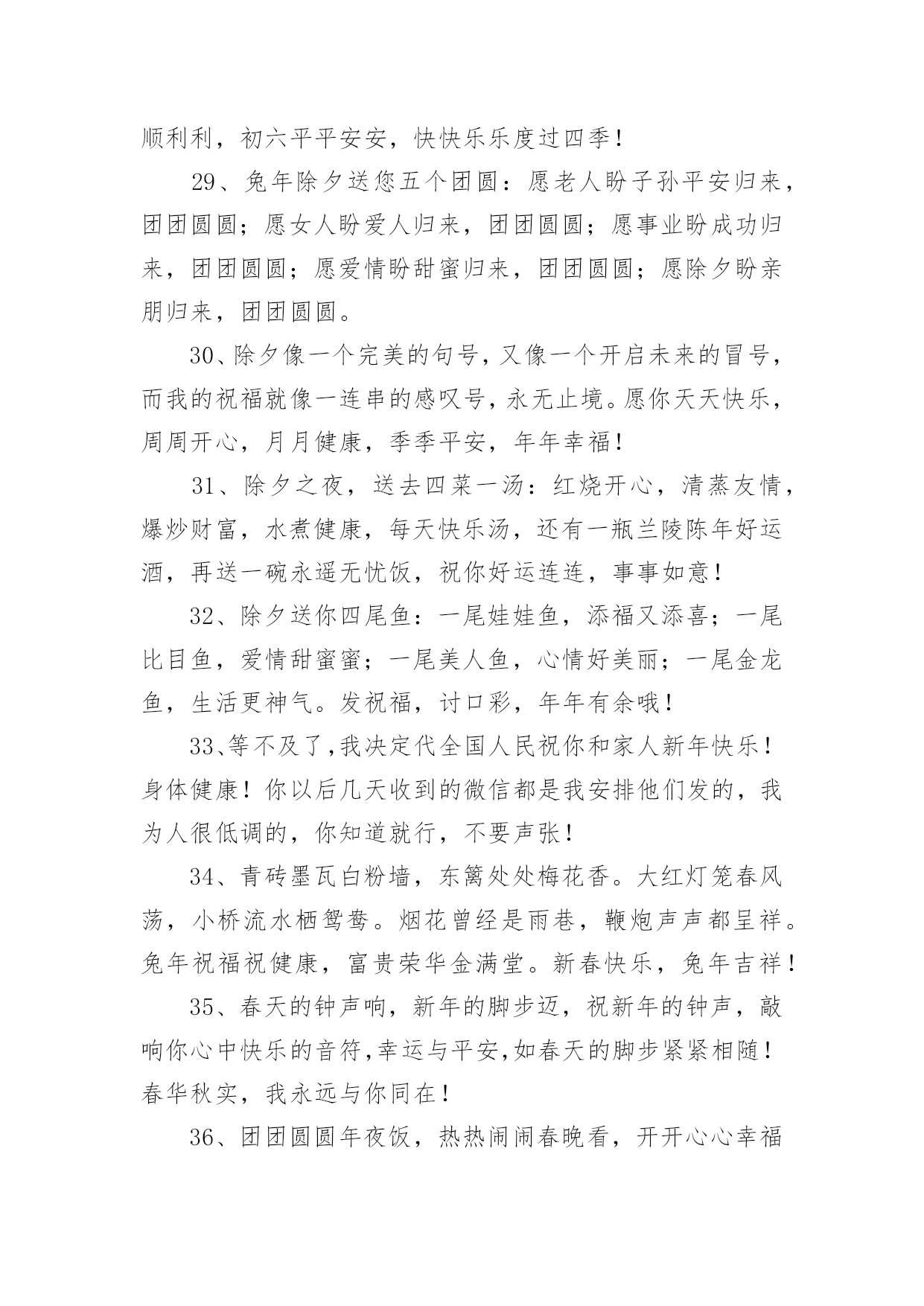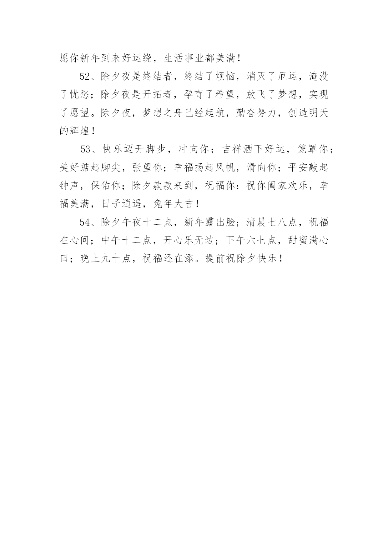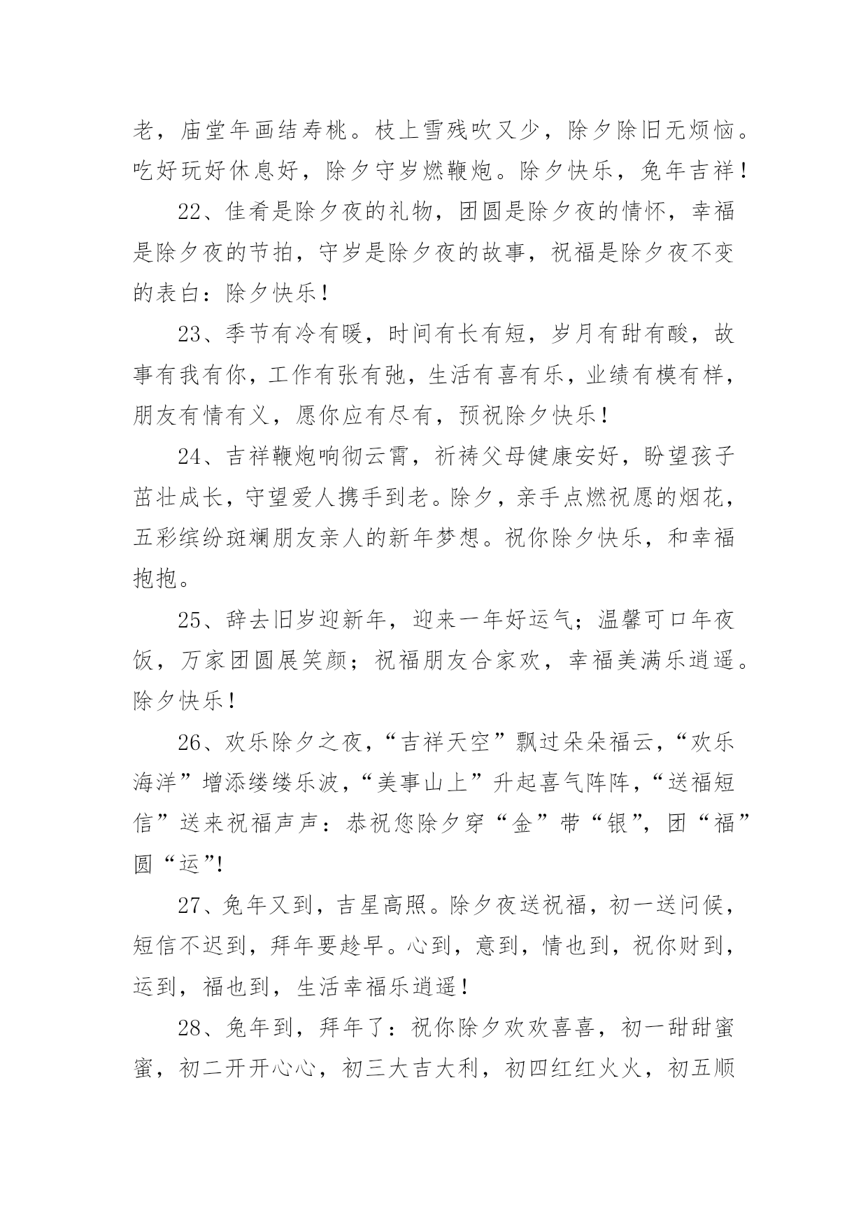 除夕夜祝福简短文案除夕夜祝福简短文案随着社交网络的迅猛发展,大家总少不了接触一些耳熟能详的文案吧,文案用于跟亲朋好友分享个人生活情况。那什么样的文案才是新颖独特的呢?以下是小编精心整理的除夕夜祝福简短文案,供大家参考借鉴,希望可以帮助到有需要的朋友。1、兔年除夕到眼前,风风火火拜个年:勤勤恳恳收获年,红红火火发财年,热热闹闹欢喜年,健健康康养生年,嘻嘻哈哈开心年,和和美美和谐年!2、除夕夜晚灯火煌,儿孙回家大团圆。爸妈亲做一桌宴,举杯换盏守岁年。孝顺儿孙敬高堂,祝愿老人长寿康。子孙满堂快乐享,喜迎除夕幸福长。祝你除夕喜乐扬!3、除夕到眼前,风风火火拜个年:勤勤恳恳收获年,红红火火发财年,热热闹闹欢喜年,健健康康养生年,嘻嘻哈哈开心年,和和美美和谐年!4、烛光将吉祥摇曳,烟花将幸福绽放,酒杯将如意碰响,除夕将团圆升华,文字将祝福传递,除夕,愿合家欢乐,幸福美满,除夕快乐!5、有一种幸福安安静静,有一种拥有实实在在,有一种快乐飘飘洒洒,有一种自在平平淡淡,有一种友情长长久久,有一个我祝你除夕快乐。6、装一车幸福,让平安开道,抛弃一切烦恼,让快乐与您环绕,存储所有温暖,将寒冷赶跑,释放一生真情,让幸福永远对您微笑!大年三十吃饺子!除夕快乐。7、除夕到,穿新衣戴新帽,青春永驻,永不老;吃饺子放鞭炮,无忧无虑,没烦恼;收祝福拿红包,工作顺利,收入高;发微信问声好,祝你生活幸福,乐淘淘!8、和风细雨润人间,喜气洋洋迎除夕,爱情美满享百年,幸福生活乐无边,洪福高照福无限,天降祥瑞体康健,事事顺心好运伴,快乐逍遥赛神仙。除夕快乐!9、除夕临近,问候先发声。字字表深情,愿博你欢心。愿你心情够美,诸事够顺,好运够多,收入够高,身体够棒,一切够好,就是幸福得够呛。预祝除夕快乐!10、爆竹声中三神到,除夕抱着喜庆跑。财神笑开颜,祝你年年挣大钱。寿神笑开颜,祝你生平更平安。呵呵,祝君除夕快乐!11、除夕爱凝聚,爱人牵手笑甜蜜;除夕情飞扬,家人围坐歌悠扬;除夕心低语,共同祝愿父慈子孝天伦爱更浓,家和万事兴。除夕快乐。12、北风呼啸飘雪花,坐上火车赶回家,想念亲朋想爸妈,除夕之夜聊家话,小小短信含牵挂,愿父母健康身体佳,朋友生意天天发,爱人笑容美如花,幸福美满好年华!13、锣鼓敲响幸福道,鞭炮响起吉祥照。大红灯笼映锦绣,辞旧迎新拽光耀。长寿面条彩飞宵,钟声响起喜欢笑。琼浆玉液举杯干,合家团圆守岁晓。祝你除夕快乐!欢声笑语过节。14、除夕拜年元芳忙,祝福由我代送上,飘飘洒洒到君旁,愿君接纳永收藏:一愿财源广,二愿体安康,三愿心情美,四愿幸福长,五愿忧愁散,六愿代代昌。15、绽放的烟花将喜庆诠释,火红的对联将吉祥写满,高挂的灯笼将幸福笼罩,香香的水饺将欢乐包裹,真诚的文字将祝福传递,除夕愿合家团圆,幸福美满!除夕快乐!16、烟花灼灼绽笑颜,举目欣赏乐翩翩。灯火熠熠照心田,儿孙满堂沐团圆。把酒颜欢情绵绵,珍惜今朝在眼前。幸福守岁合家欢,除夕快乐乐无限。17、温馨的是除夕夜,温暖的是合家欢,温情的是看春晚,温柔的是彩灯闪,幸福的是压岁钱,火爆的是鞭炮声,开心的是短信响,吉祥的是祝福到。除夕夜快乐!18、除夕到,人欢笑,挂灯笼,红运高,贴春联,喜眉梢,鞭炮鸣,烦恼消,烟花绽,吉祥绕,团圆饺,幸福包,情谊浓,祝福送。愿快乐好运伴你跑,兔年大吉乐逍遥!19、幸福在倒数,兔年要来到,吉祥钟声里,除夕多热闹。喝杯团圆酒,煮碗顺心饺,浓情年夜饭,人人面带笑。忙活一整年,放松心情好,快乐是主题,开心最重要。除夕到,保持好心情,迎接美好明天!20、今朝除夕到,喜鹊来报道。新年新面貌,祝君身体好。财源滚滚来,生活似蜜枣。快乐常伴随,事业节节高。祝你除夕快乐,万事大吉。21、见面必说新年好,十万万人尽欢笑。古树虬枝新梅老,庙堂年画结寿桃。枝上雪残吹又少,除夕除旧无烦恼。吃好玩好休息好,除夕守岁燃鞭炮。除夕快乐,兔年吉祥!22、佳肴是除夕夜的礼物,团圆是除夕夜的情怀,幸福是除夕夜的节拍,守岁是除夕夜的故事,祝福是除夕夜不变的表白:除夕快乐!23、季节有冷有暖,时间有长有短,岁月有甜有酸,故事有我有你,工作有张有弛,生活有喜有乐,业绩有模有样,朋友有情有义,愿你应有尽有,预祝除夕快乐!24、吉祥鞭炮响彻云霄,祈祷父母健康安好,盼望孩子茁壮成长,守望爱人携手到老。除夕,亲手点燃祝愿的烟花,五彩缤纷斑斓朋友亲人的新年梦想。祝你除夕快乐,和幸福抱抱。25、辞去旧岁迎新年,迎来一年好运气;温馨可口年夜饭,万家团圆展笑颜;祝福朋友合家欢,幸福美满乐逍遥。除夕快乐!26、欢乐除夕之夜,“吉祥天空”飘过朵朵福云,“欢乐海洋”增添缕缕乐波,“美事山上”升起喜气阵阵,“送福短信”送来祝福声声:恭祝您除夕穿“金”带“银”,团“福”圆“运”!27、兔年又到,吉星高照。除夕夜送祝福,初一送问候,短信不迟到,