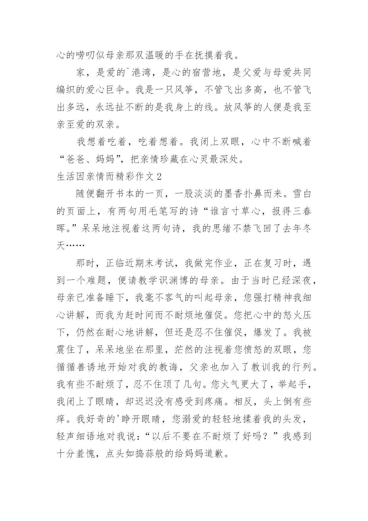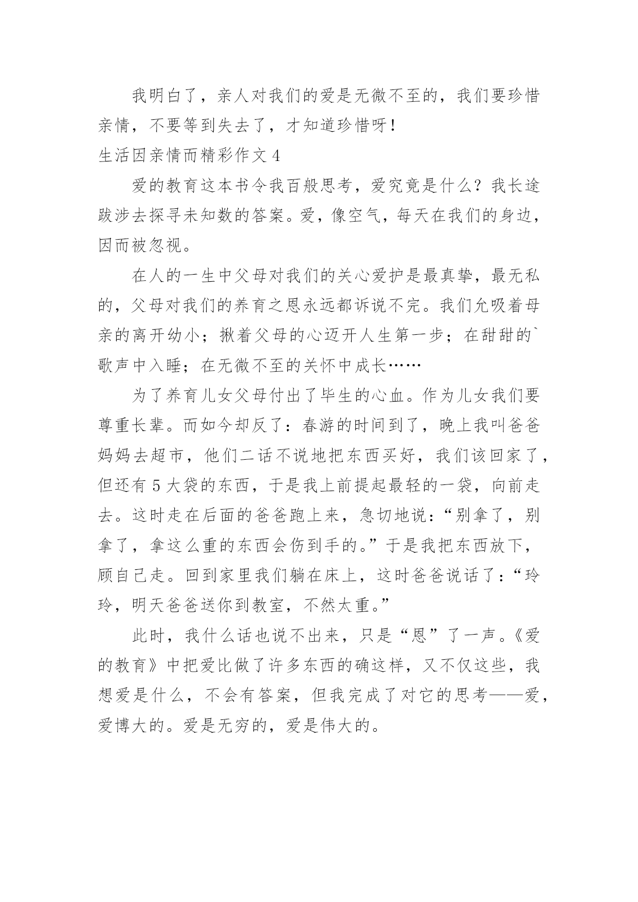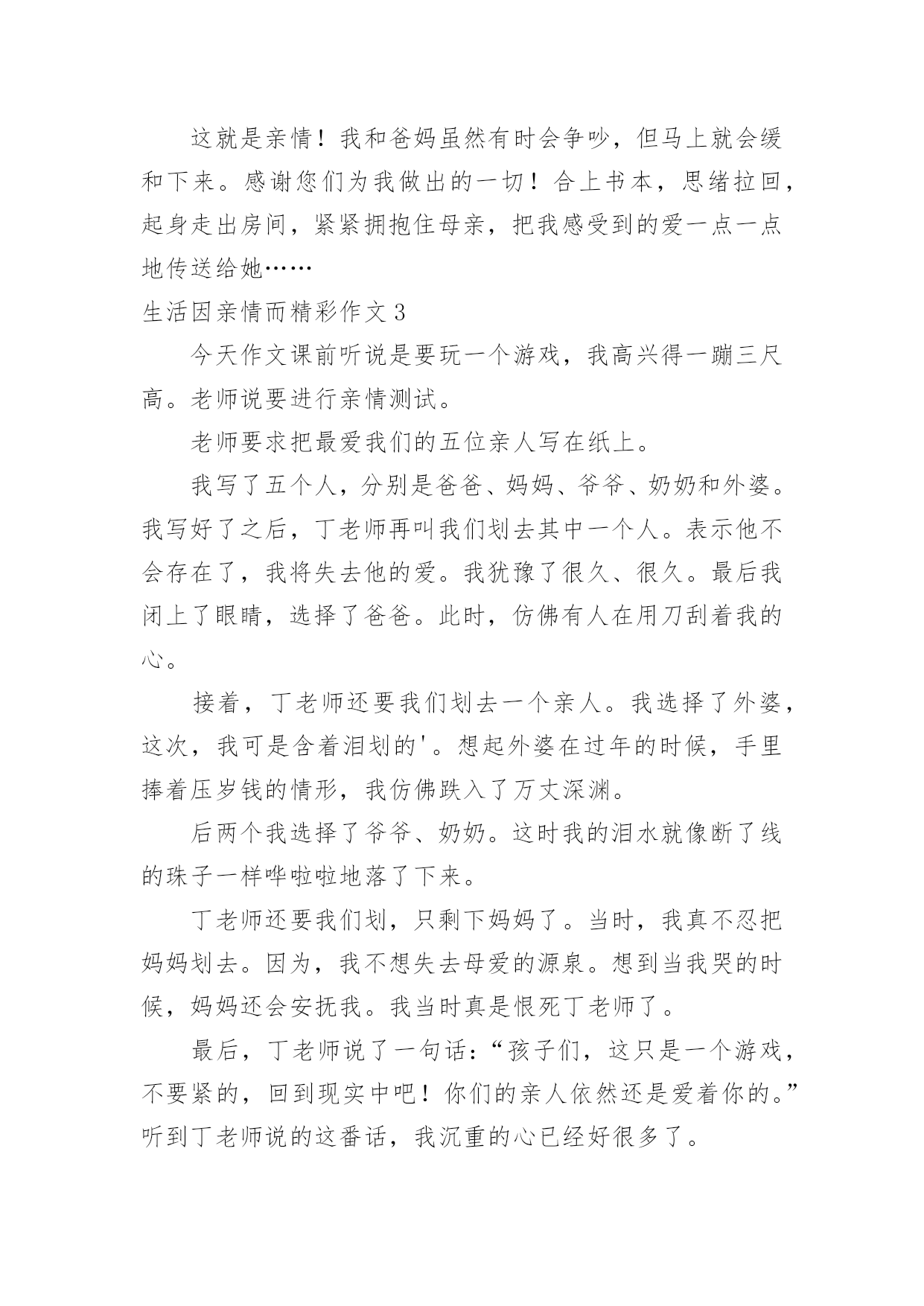 生活因亲情而精彩作文(优选)生活因亲情而精彩作文4篇在日常生活或是工作学习中,大家总少不了接触作文吧,作文是人们以书面形式表情达意的言语活动。那么你知道一篇好的作文该怎么写吗?以下是小编为大家整理的生活因亲情而精彩作文,欢迎阅读与收藏。生活因亲情而精彩作文1在我求学的日子,我常常梦中回家,我想念我的父母,我想念我的亲朋好友。每次匆匆忙忙奔回家总是在夜晚时分,我深情地望一眼那熟悉得不能再熟悉的家门,感情的潮水便顿涌心头。柔和的灯光下,母亲在厨房忙着做饭,父亲在默默坐着等我。听到我的脚步声,母亲从厨房里慌忙地走了出来,父亲则猛然站起来问:“怎么来得这么晚?吃过饭了没?”父亲随手接过我的背包。照着屋里的灯光,我倍感家庭的温暖,我突然有一种想哭的感觉,却努力控制着。我不愿让他们看到我流泪的双眼,怕他们心里难受。我只想看见父母那舒心的甜蜜的笑容,那是人间最美最好的诗篇。不一会儿,我面前就摆满了我喜欢吃的饭菜,其中有我最喜欢吃的鱼香肉丝。母亲慈爱地坐在了我的身旁,开始了她那令我永远也听不厌的唠叨。“吹面不寒杨柳风。”句句暖心的唠叨似母亲那双温暖的手在抚摸着我。家,是爱的`港湾,是心的宿营地,是父爱与母爱共同编织的爱心巨伞。我是一只风筝,不管飞出多高,也不管飞出多远,永远扯不断的是我身上的线。放风筝的人便是我至亲至爱的双亲。我想着吃着,吃着想着。我闭上双眼,心中不断喊着“爸爸、妈妈”,把亲情珍藏在心灵最深处。生活因亲情而精彩作文2随便翻开书本的一页,一股淡淡的墨香扑鼻而来。雪白的页面上,有两句用毛笔写的诗“谁言寸草心,报得三春晖。”呆呆地注视着这两句诗,我的思绪不禁飞回了去年冬天……那时,正临近期末考试,我做完作业,正在复习时,遇到一个难题,便请教学识渊博的母亲。由于当时已经深夜,母亲已准备睡下,我毫不客气的叫起母亲,您强打精神我细心讲解,而我为赶时间而不耐烦地催促。您把心中的怒火压下,仍然在耐心地讲解,但还是忍不住催促,爆发了。我被震住了,呆呆地坐在那里,茫然的注视着您愤怒的双眼,您循循善诱地开始对我的教诲,父亲也加入了教训我的行列。我有些不耐烦了,忍不住顶了几句。您火气更大了,举起手,我闭上了眼睛,却迟迟没有感受到疼痛。相反,头上倒有些痒。我好奇的'睁开眼睛,您溺爱的轻轻地揉着我的头发,轻声细语地对我说:“以后不要在不耐烦了好吗?”我感到十分羞愧,点头如捣蒜般的给妈妈道歉。这就是亲情!我和爸妈虽然有时会争吵,但马上就会缓和下来。感谢您们为我做出的一切!合上书本,思绪拉回,起身走出房间,紧紧拥抱住母亲,把我感受到的爱一点一点地传送给她……生活因亲情而精彩作文3今天作文课前听说是要玩一个游戏,我高兴得一蹦三尺高。老师说要进行亲情测试。老师要求把最爱我们的五位亲人写在纸上。我写了五个人,分别是爸爸、妈妈、爷爷、奶奶和外婆。我写好了之后,丁老师再叫我们划去其中一个人。表示他不会存在了,我将失去他的爱。我犹豫了很久、很久。最后我闭上了眼睛,选择了爸爸。此时,仿佛有人在用刀刮着我的心。接着,丁老师还要我们划去一个亲人。我选择了外婆,这次,我可是含着泪划的'。想起外婆在过年的时候,手里捧着压岁钱的情形,我仿佛跌入了万丈深渊。后两个我选择了爷爷、奶奶。这时我的泪水就像断了线的珠子一样哗啦啦地落了下来。丁老师还要我们划,只剩下妈妈了。当时,我真不忍把妈妈划去。因为,我不想失去母爱的源泉。想到当我哭的时候,妈妈还会安抚我。我当时真是恨死丁老师了。最后,丁老师说了一句话:“孩子们,这只是一个游戏,不要紧的,回到现实中吧!你们的亲人依然还是爱着你的。”听到丁老师说的这番话,我沉重的心已经好很多了。我明白了,亲人对我们的爱是无微不至的,我们要珍惜亲情,不要等到失去了,才知道珍惜呀!生活因亲情而精彩作文4爱的教育这本书令我百般思考,爱究竟是什么?我长途跋涉去探寻未知数的答案。爱,像空气,每天在我们的身边,因而被忽视。在人的一生中父母对我们的关心爱护是最真挚,最无私的,父母对我们的养育之恩永远都诉说不完。我们允吸着母亲的离开幼小;揪着父母的心迈开人生第一步;在甜甜的`歌声中入睡;在无微不至的关怀中成长……为了养育儿女父母付出了毕生的心血。作为儿女我们要尊重长辈。而如今却反了:春游的时间到了,晚上我叫爸爸妈妈去超市,他们二话不说地把东西买好,我们该回家了,但还有5大袋的东西,于是我上前提起最轻的一袋,向前走去。这时走在后面的爸爸跑上来,急切地说:“别拿了,别拿了,拿这么重的东西会伤到手的。”于是我把东西放下,顾自己走。回到家里我们躺在床上,这时爸爸说话了:“玲玲,明天爸爸送你到教室,不然太重。”此时,我什么话也说不出来,只是“恩”了一声。《爱的教育》中把爱比做了许多东西的确这样,又不仅这些,我想爱是什么,不会有答案,但我完成了对它的思考——爱,爱博大的。爱是无穷的