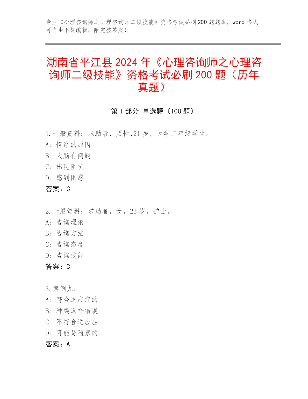 湖南省平江县2024年《心理咨询师之心理咨询师二级技能》资格考试必刷200题(历年真题)
