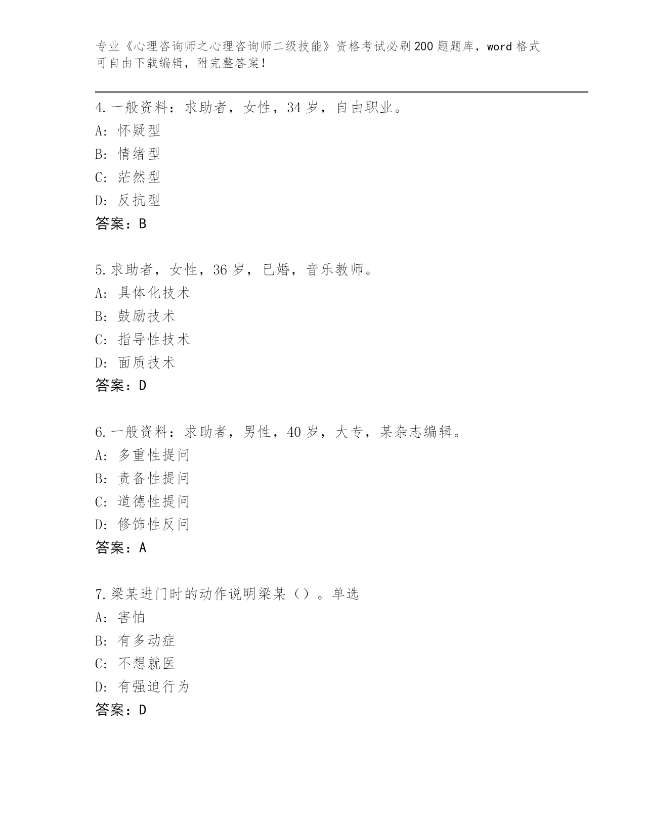 山东省垦利区历年《心理咨询师之心理咨询师二级技能》资格考试必刷200题题库(历年真题)