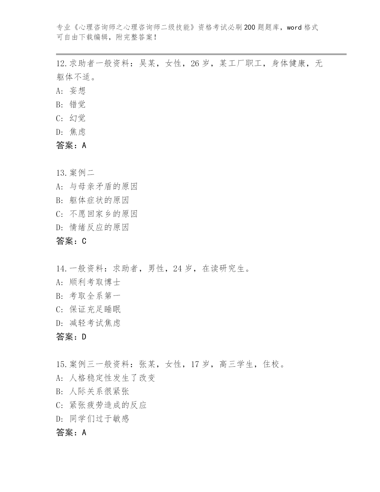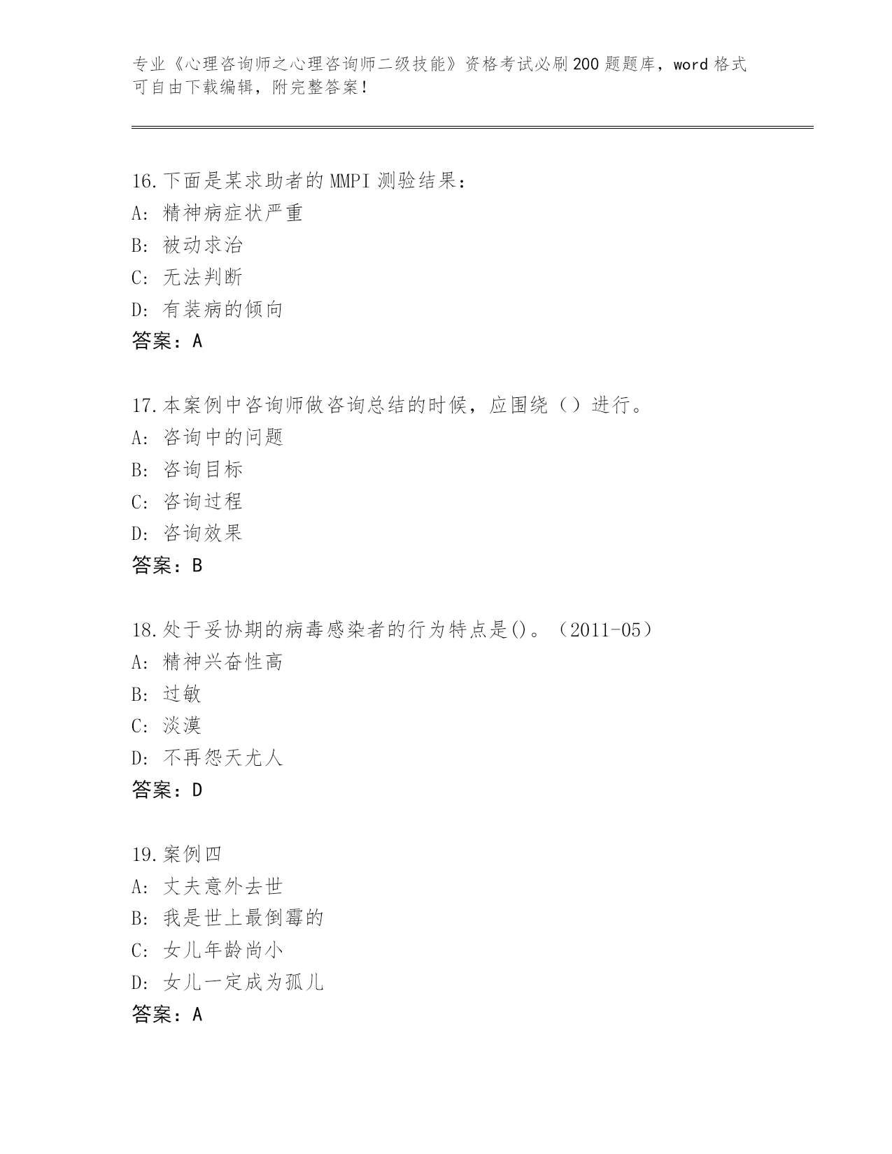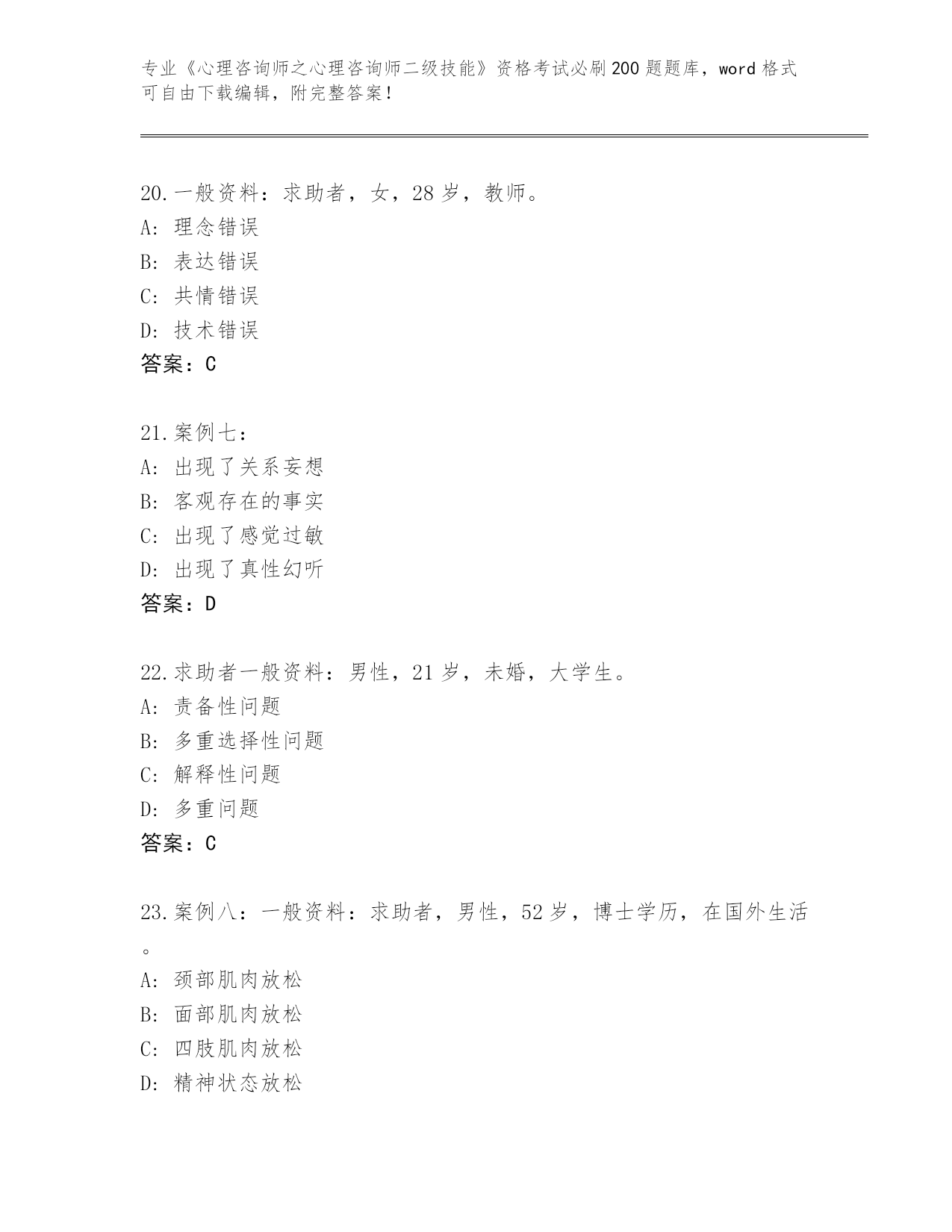 历年山西省《心理咨询师之心理咨询师二级技能》资格考试必刷200题真题【全国通用】