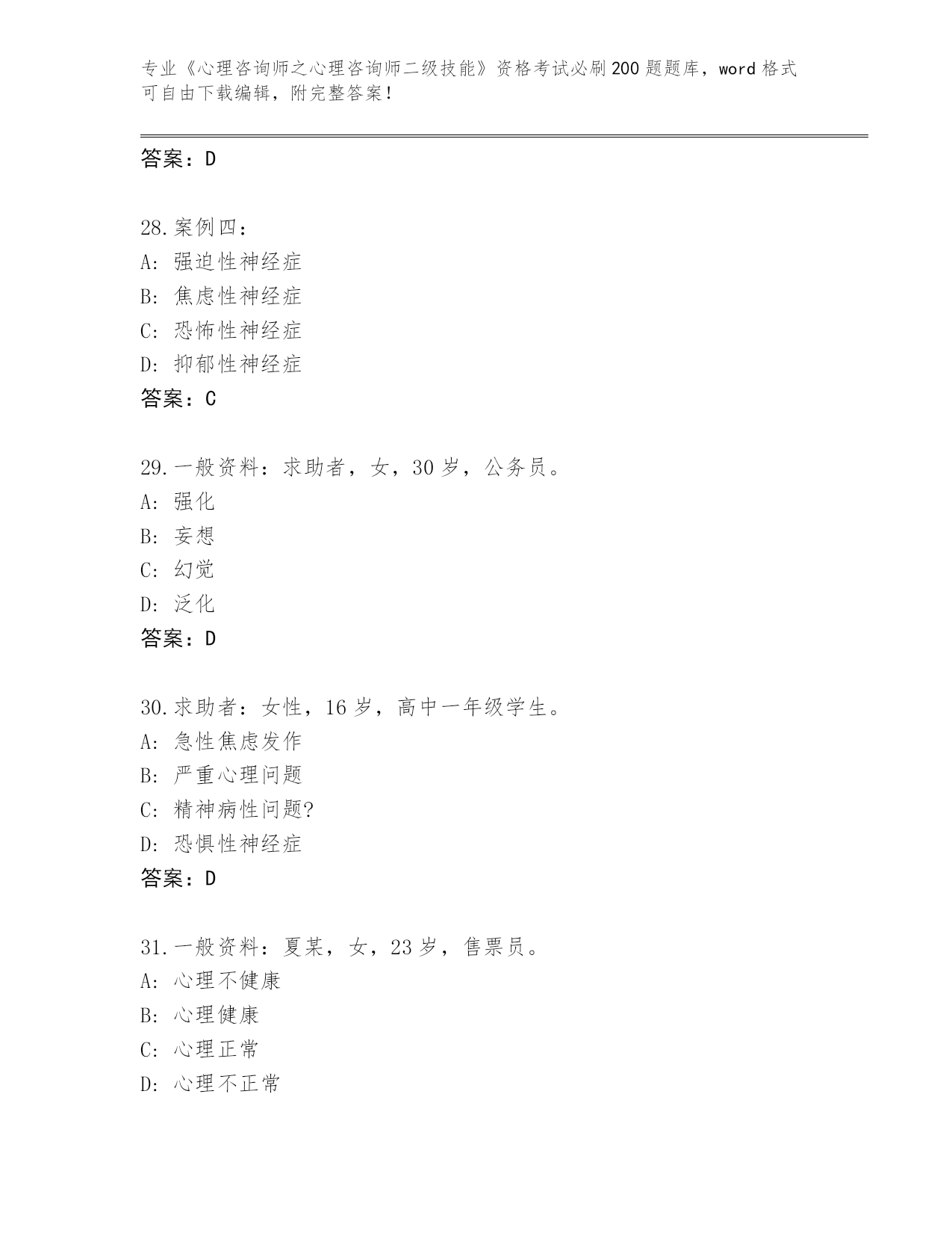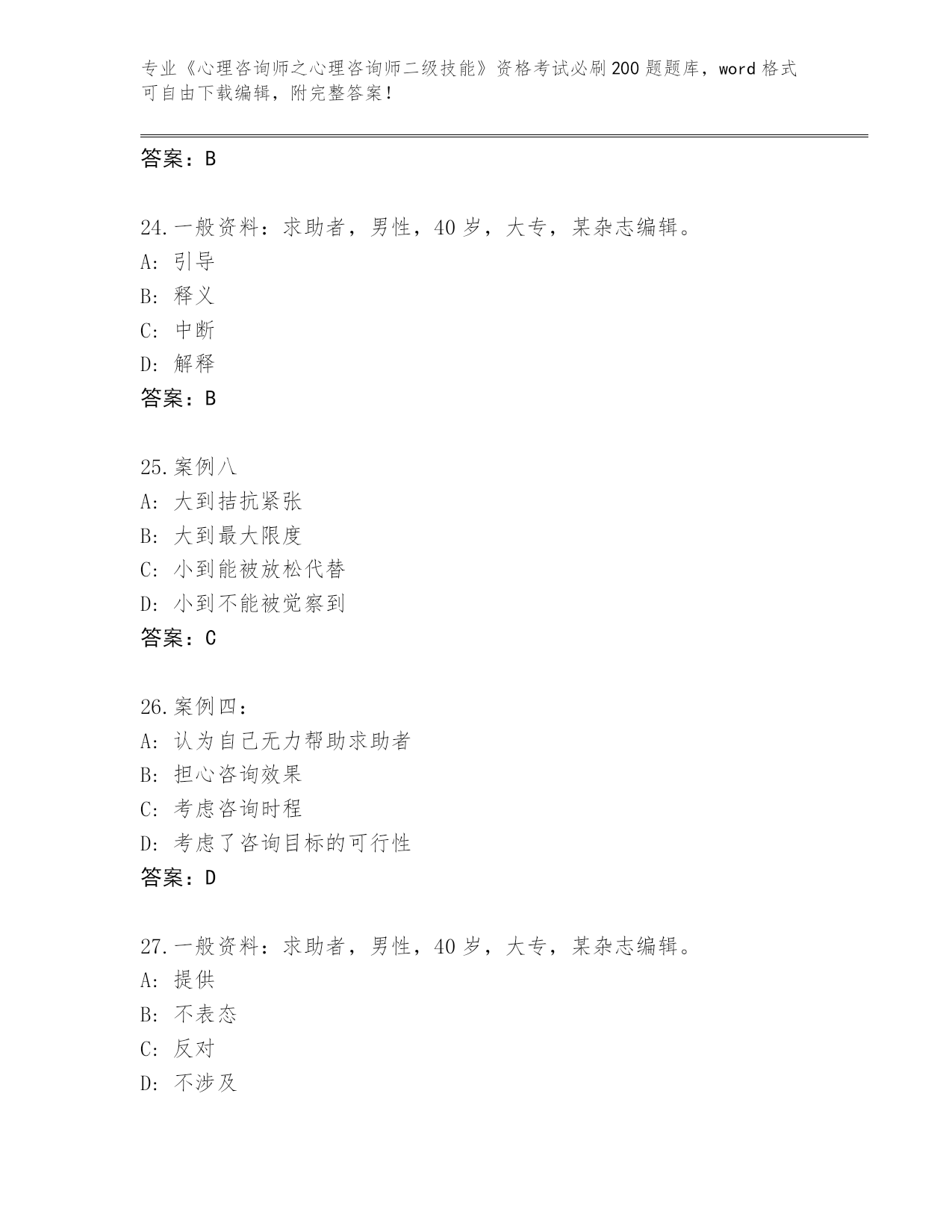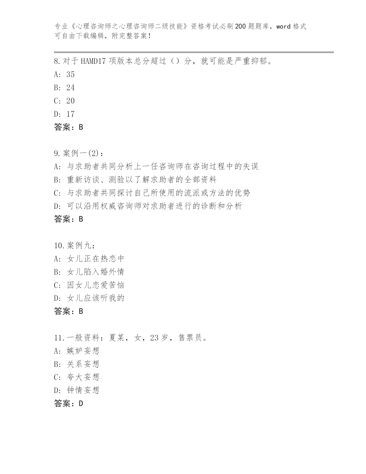 历年山西省《心理咨询师之心理咨询师二级技能》资格考试必刷200题真题【全国通用】