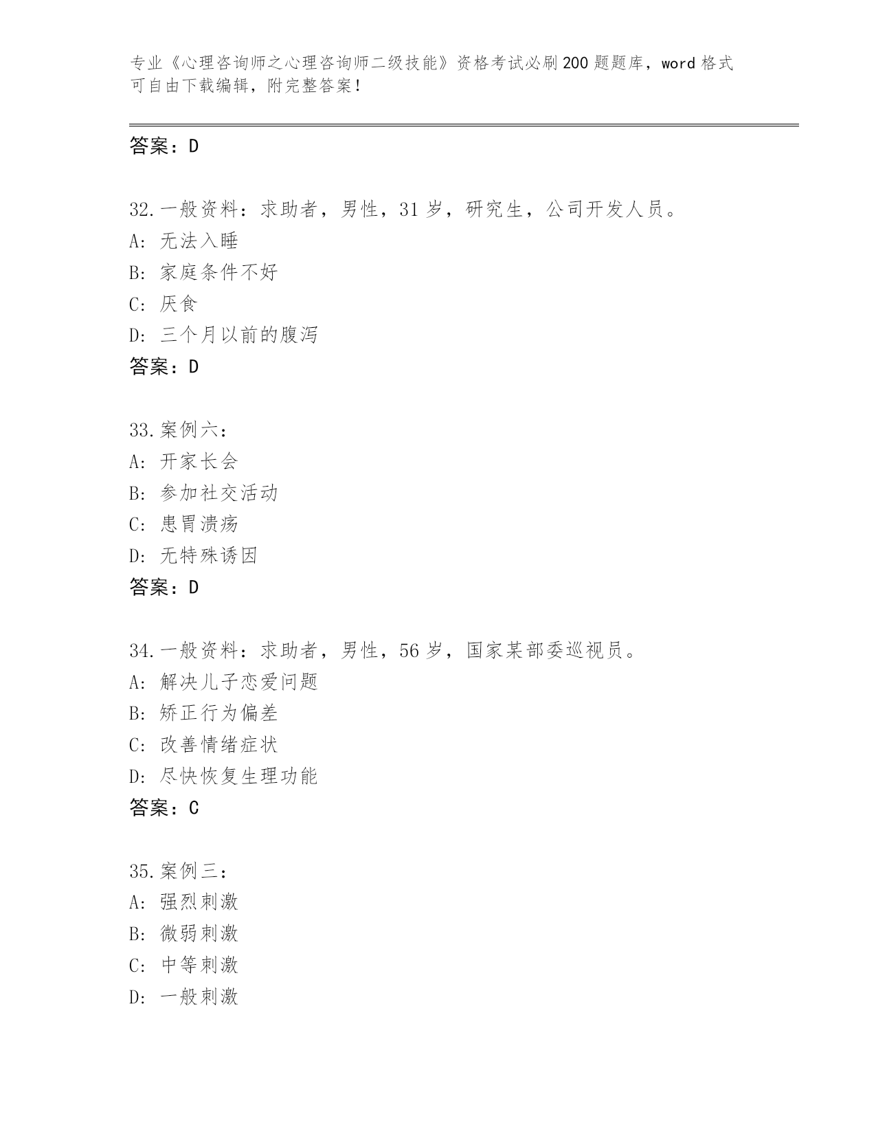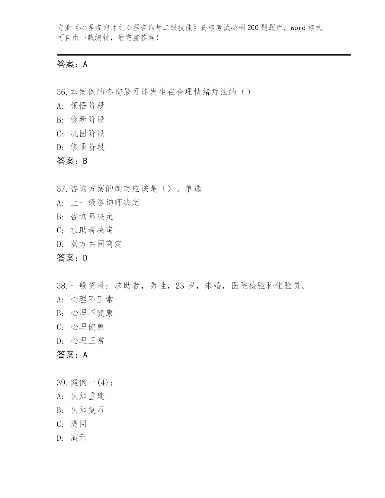 内部使用湖南省云溪区《心理咨询师之心理咨询师二级技能》考试必刷200题真题(历年真题)