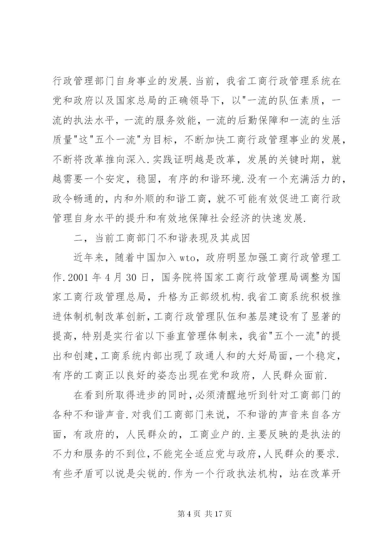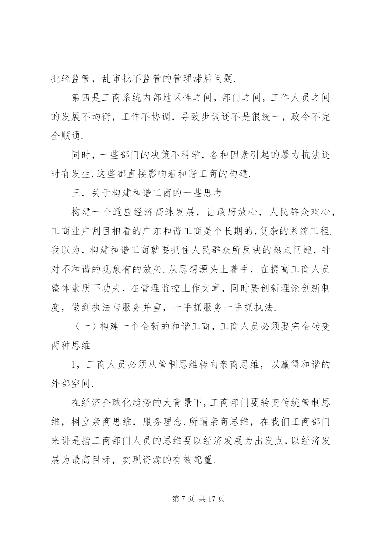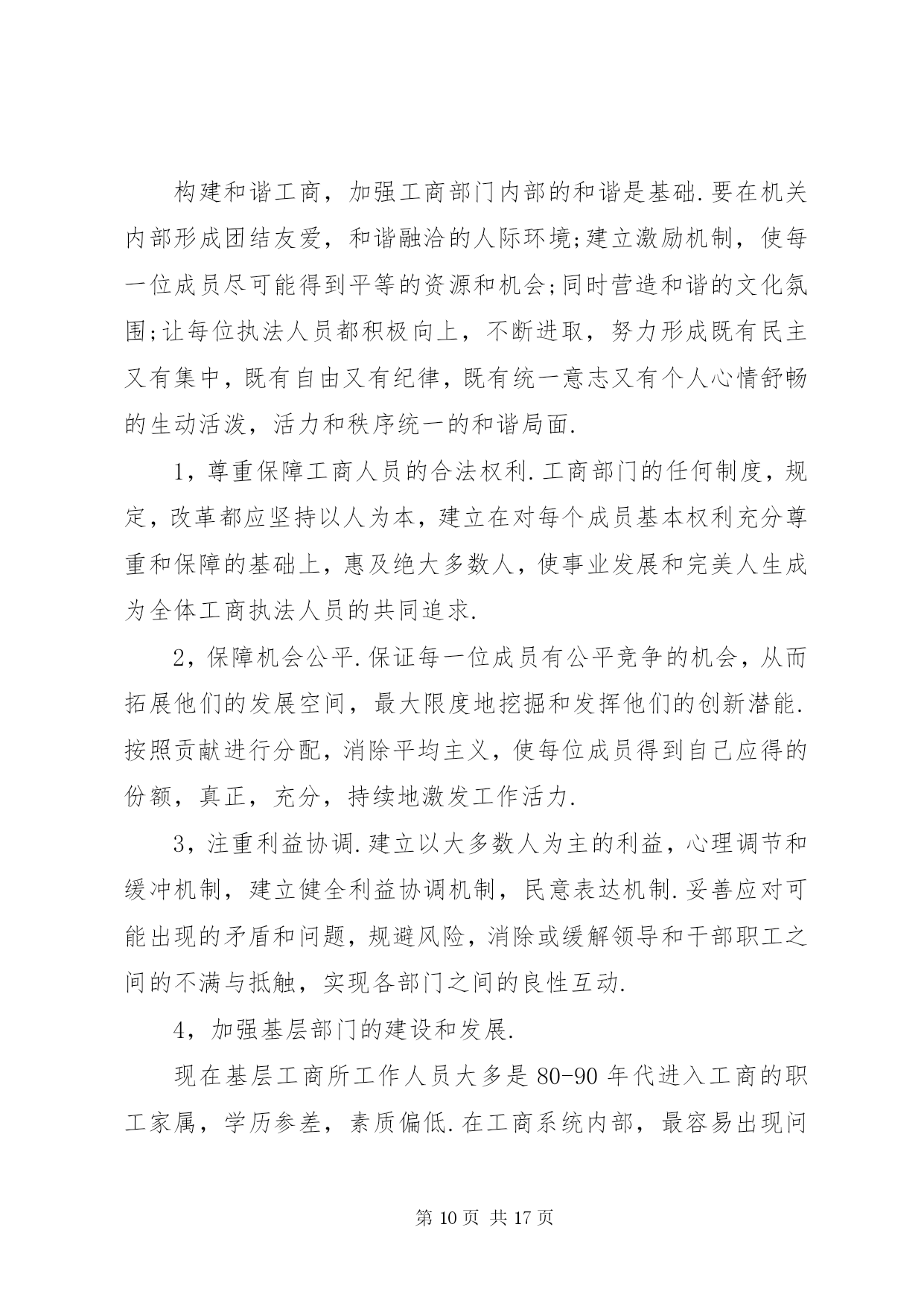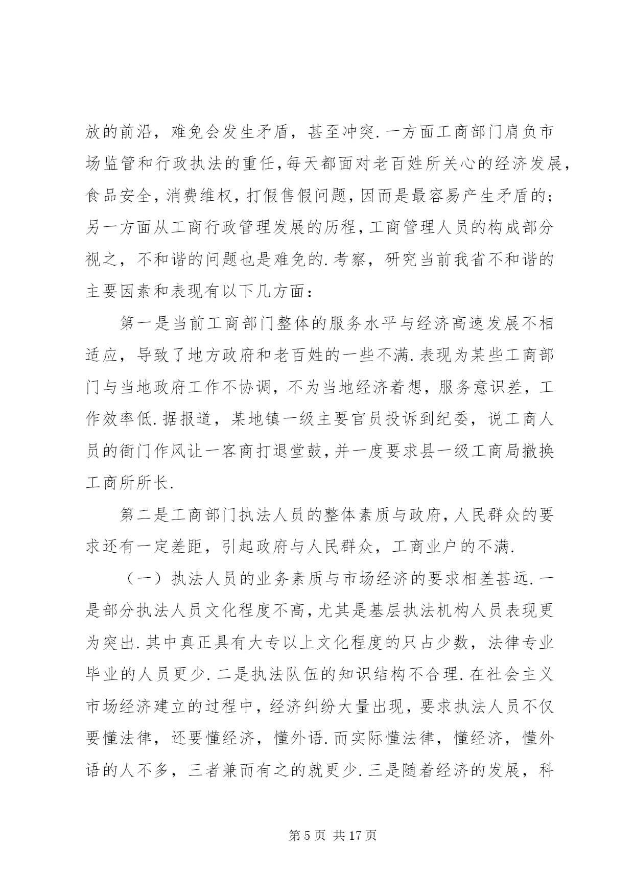 第PAGE\*Arabic\*MERGEFORMAT17页共NUMPAGES\*MERGEFORMAT17页对构建和谐工商的一些思考摘要本文就和谐工商的含义,当前工商部门存在的不和谐表现及其成因以及如何构建和谐工商展开思考.提出从工商人员的思维,意识入手,打造服务型工商,创新监管机制,以使工商行政管理的各项工作更适应和推动经济的发展,达到制度理论与经济发展步调一致,内部管理畅通,部门与政府,工商业户,人民群众关系更加融洽更为协调的和谐境界.关键词工商行政管理;服务;创新;和谐;思考国家主席胡锦涛在十六大报告中将"社会更加和谐"纳入全面建设小康社会的总体目标.如何构建和谐社会已经引起社会各界的广泛关注,这是我国社会经济发展进入快速升阶段中必然面对的一个问题.权威人士指出,构建和谐社会最关键的是要处理好政府,市场和社会三者之间的关系.作为与老百姓生活息息相关的市场经济监管者,作为联系基层人民群众生活最为密切的工商行政管理部门,我想,应当也必须成为构建和谐社会的先行者和示范者,这是建立和谐社会,维护社会稳定,促进经济发展的现实需要.当然,构建一个和谐工商是一项长期的,复杂的,艰巨的系统工程,在这样一个机遇和挑战面前,如何构建一个全新的和谐工商,成为当前工商行政管理部门的一个重要而艰巨的课题.一,解读和谐工商和谐的概念是什么呢和谐就是统一宁静,就是化对立矛盾于无形之中,就是古往今来人们所认可的"和为贵",就是造就一种具有"天然"的亲和力这样的大环境.在党的十六届四中全会《决定》中,我们党第一次把构建和谐社会作为重要任务和奋斗目标写进党的正式文件,胡锦涛总书记把"和谐社会"的特征概括为"民主法治,公平正义,诚信友爱,充满活力,安定有序和人与自然和谐相处.",这是在新的历史条件下对中国特色社会主义的新认识,是我们党在新时期推进伟大事业的又一个重大理论创新.在这样一个理论指引下,工商行政管理部门很有必要对和谐理论作深入的广泛的探讨.故而,从"和谐社会"引申出"和谐工商"这个论题是适时的也是必要的."和谐工商"是一个引申的概念,目前尚未有一个明确清晰的阐述.从哲学观点出发,任何事物都是多角度,多方位的,相互联系的,结合胡锦涛总书记对"和谐社会"的提倡来看,"和谐工商"不应该独指机关内部的和谐,"和谐工商"当然包括工商系统内部的和谐,稳定,有序,而且还要包括外部关系的协调.一个和谐的工商部门应达到制度理论与经济发展步调一致,系统内部管理活力和秩序统一,工商部门与政府,工商业户,人民群众关系相对融洽,才能有效促进经济的发展.工商部门的内部和谐和外部和谐是辩证的统一,内部和谐能有效地促进外部和谐,外部的和谐反作用于内部的和谐.其着力点在于协调好内外部的矛盾,从而达到社会和谐的理想,实现工商行政管理的和谐目标.因此,构建和谐工商的意义是重要的,它能有效地促进工商行政管理事业自身发展,同时也是我国构建和谐社会,发展社会主义市场经济的客观迫切要求."和谐工商",是构建和谐社会的重要组成部分和客观要求.党的十六届四中全会从加强党的执政能力建设的角度,明确提出了"构建社会主义和谐社会"这一重大战略任务.构建和谐社会是一项系统工程,需要全国上下各行业,各部门的齐心协力和不断努力才能实现.当前,各行各业正在为构建和谐社会而奋斗,社会的"大"和谐是由众多行业和部门的"小"和谐来共同组成,工商行政管理系统作为整个社会的一个有机组成部分,有责任也有义务为构建和谐社会做出自己应尽的努力.作为市场经济的监管者,上为政府参谋,下为百姓维权,必须成为构建和谐社会的先行者和示范者."和谐工商",是促进工商行政管理事业发展和经济发展的需要.中共中央政治局委员,XX省委书记张德江在广州召开的全国工商行政管理工作会议中指出"广东是经济大省,工商行政管理工作十分重要,广东工商行政管理工作是做得好的,但与建立完善的社会主义市场经济体制的要求相比还有差距".他的话既是勉励又是鞭策,说明我们工商行政管理部门在促进经济发展上还存在不足,人民群众对我们的工作还有期望.经济发展需要工商行政管理部门自身事业的发展.当前,我省工商行政管理系统在党和政府以及国家总局的正确领导下,以"一流的队伍素质,一流的执法水平,一流的服务效能,一流的后勤保障和一流的生活质量"这"五个一流"为目标,不断加快工商行政管理事业的发展,不断将改革推向深入.实践证明越是改革,发展的关键时期,就越需要一个安定,稳固,有序的和谐环境.没有一个充满活力的,政令畅通的,内和外顺的和谐工商,就不可能有效促进工商行政管理自身水平的提升和有效地保障社会经济的快速发展.二,当前工商部门不和谐表现及其成因近年来,随着中国加入wto,政府明显加强工商行政管理工作.2001年4月30日,国务院将国家工商行政管理局调整为国家