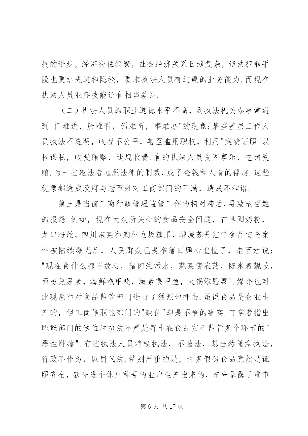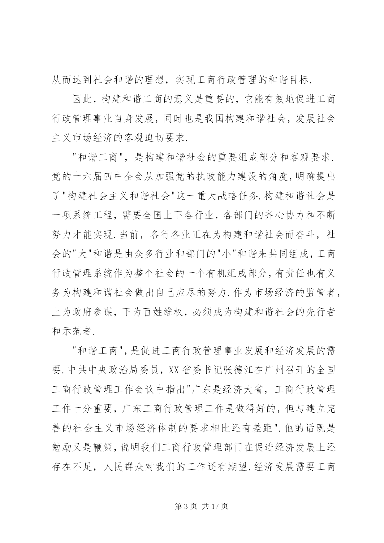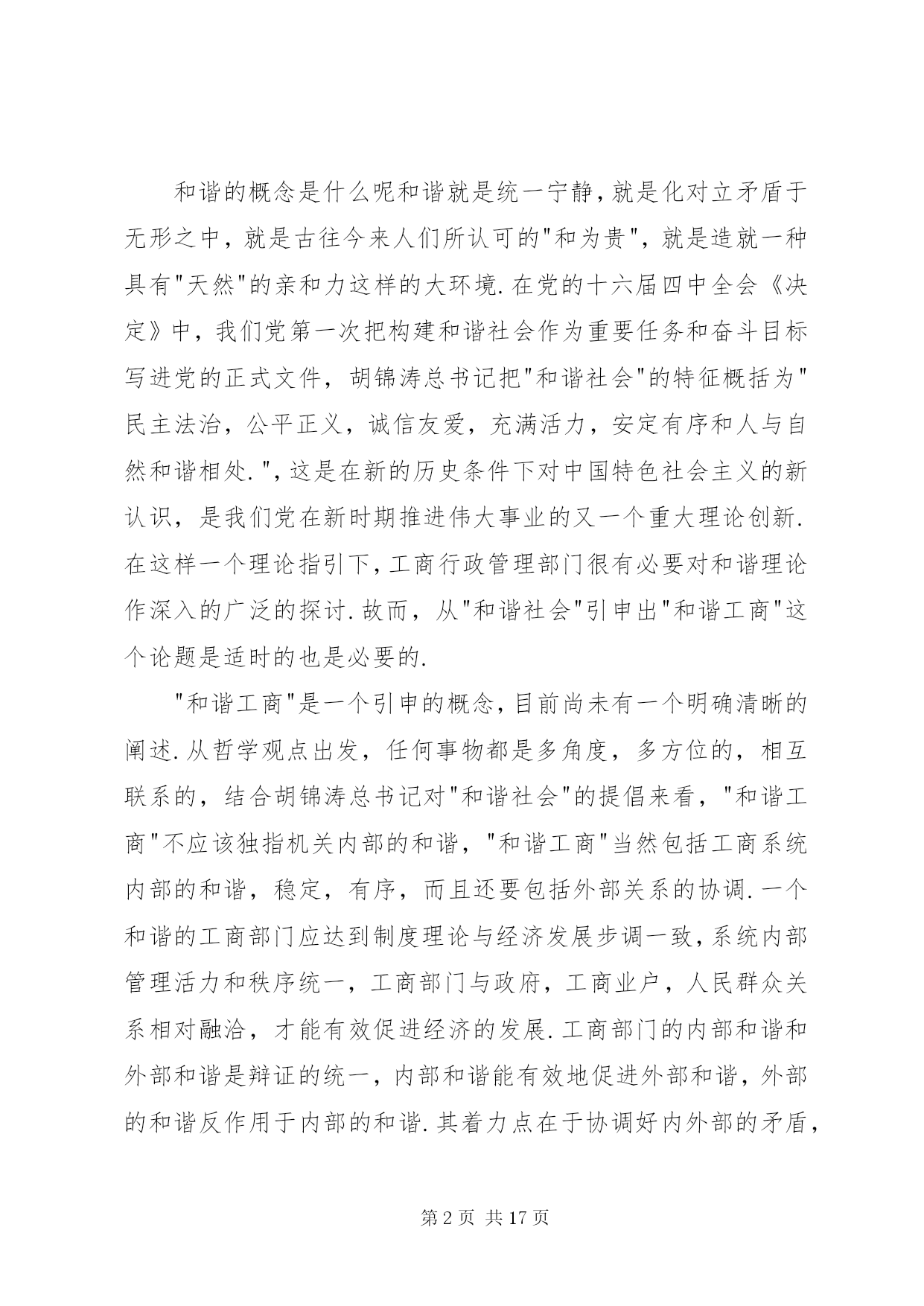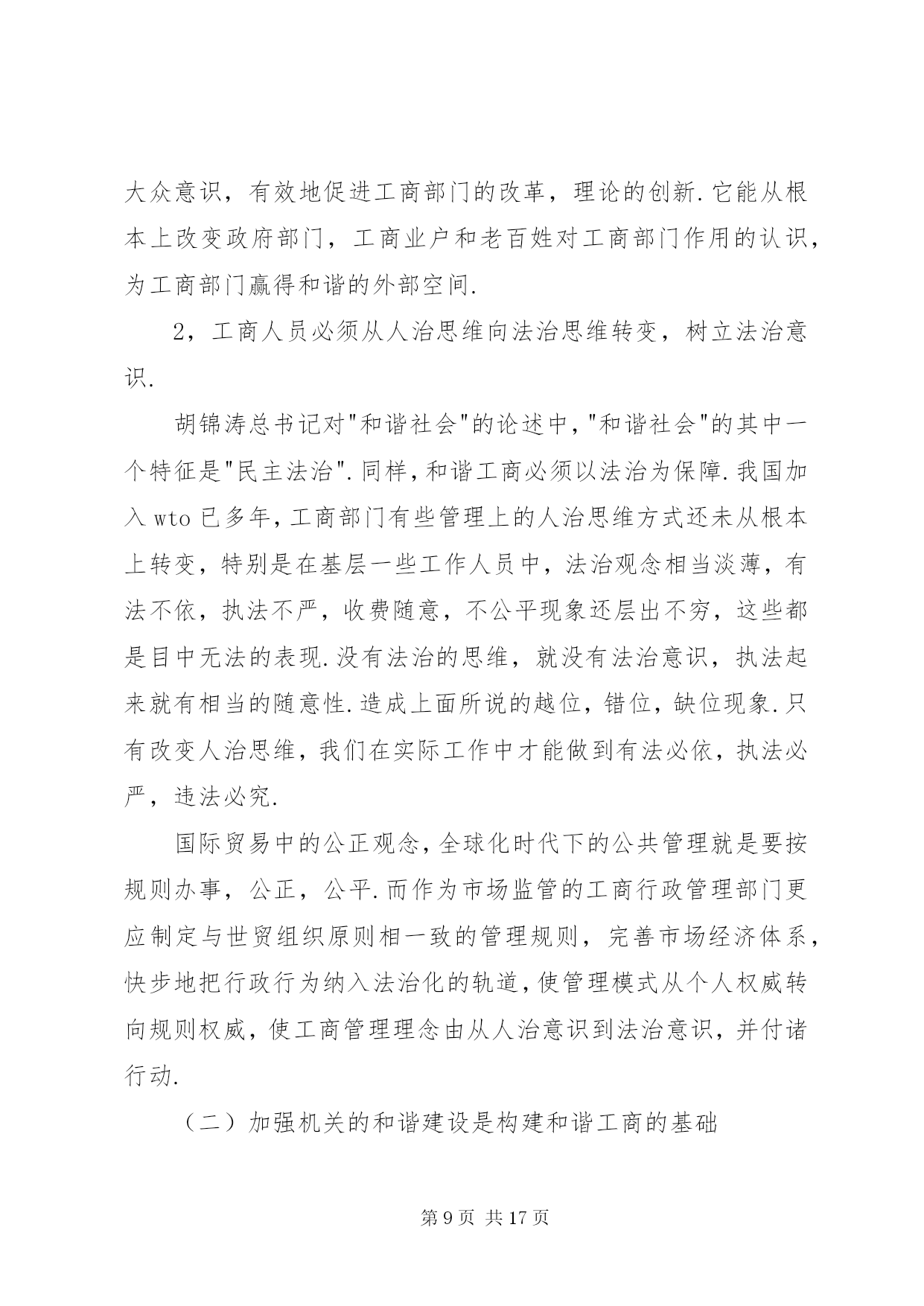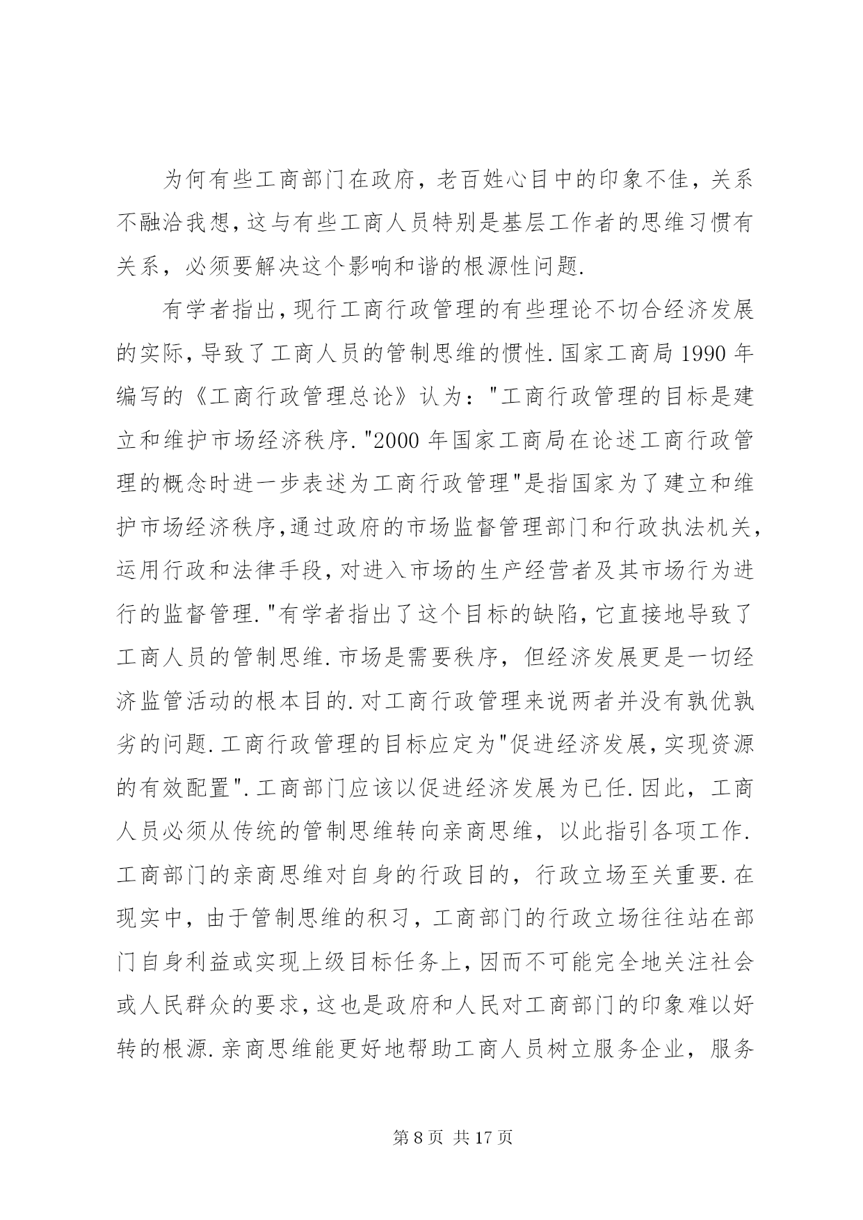 第PAGE\*Arabic\*MERGEFORMAT17页共NUMPAGES\*MERGEFORMAT17页对构建和谐工商的一些思考摘要本文就和谐工商的含义,当前工商部门存在的不和谐表现及其成因以及如何构建和谐工商展开思考.提出从工商人员的思维,意识入手,打造服务型工商,创新监管机制,以使工商行政管理的各项工作更适应和推动经济的发展,达到制度理论与经济发展步调一致,内部管理畅通,部门与政府,工商业户,人民群众关系更加融洽更为协调的和谐境界.关键词工商行政管理;服务;创新;和谐;思考国家主席胡锦涛在十六大报告中将"社会更加和谐"纳入全面建设小康社会的总体目标.如何构建和谐社会已经引起社会各界的广泛关注,这是我国社会经济发展进入快速升阶段中必然面对的一个问题.权威人士指出,构建和谐社会最关键的是要处理好政府,市场和社会三者之间的关系.作为与老百姓生活息息相关的市场经济监管者,作为联系基层人民群众生活最为密切的工商行政管理部门,我想,应当也必须成为构建和谐社会的先行者和示范者,这是建立和谐社会,维护社会稳定,促进经济发展的现实需要.当然,构建一个和谐工商是一项长期的,复杂的,艰巨的系统工程,在这样一个机遇和挑战面前,如何构建一个全新的和谐工商,成为当前工商行政管理部门的一个重要而艰巨的课题.一,解读和谐工商和谐的概念是什么呢和谐就是统一宁静,就是化对立矛盾于无形之中,就是古往今来人们所认可的"和为贵",就是造就一种具有"天然"的亲和力这样的大环境.在党的十六届四中全会《决定》中,我们党第一次把构建和谐社会作为重要任务和奋斗目标写进党的正式文件,胡锦涛总书记把"和谐社会"的特征概括为"民主法治,公平正义,诚信友爱,充满活力,安定有序和人与自然和谐相处.",这是在新的历史条件下对中国特色社会主义的新认识,是我们党在新时期推进伟大事业的又一个重大理论创新.在这样一个理论指引下,工商行政管理部门很有必要对和谐理论作深入的广泛的探讨.故而,从"和谐社会"引申出"和谐工商"这个论题是适时的也是必要的."和谐工商"是一个引申的概念,目前尚未有一个明确清晰的阐述.从哲学观点出发,任何事物都是多角度,多方位的,相互联系的,结合胡锦涛总书记对"和谐社会"的提倡来看,"和谐工商"不应该独指机关内部的和谐,"和谐工商"当然包括工商系统内部的和谐,稳定,有序,而且还要包括外部关系的协调.一个和谐的工商部门应达到制度理论与经济发展步调一致,系统内部管理活力和秩序统一,工商部门与政府,工商业户,人民群众关系相对融洽,才能有效促进经济的发展.工商部门的内部和谐和外部和谐是辩证的统一,内部和谐能有效地促进外部和谐,外部的和谐反作用于内部的和谐.其着力点在于协调好内外部的矛盾,从而达到社会和谐的理想,实现工商行政管理的和谐目标.因此,构建和谐工商的意义是重要的,它能有效地促进工商行政管理事业自身发展,同时也是我国构建和谐社会,发展社会主义市场经济的客观迫切要求."和谐工商",是构建和谐社会的重要组成部分和客观要求.党的十六届四中全会从加强党的执政能力建设的角度,明确提出了"构建社会主义和谐社会"这一重大战略任务.构建和谐社会是一项系统工程,需要全国上下各行业,各部门的齐心协力和不断努力才能实现.当前,各行各业正在为构建和谐社会而奋斗,社会的"大"和谐是由众多行业和部门的"小"和谐来共同组成,工商行政管理系统作为整个社会的一个有机组成部分,有责任也有义务为构建和谐社会做出自己应尽的努力.作为市场经济的监管者,上为政府参谋,下为百姓维权,必须成为构建和谐社会的先行者和示范者."和谐工商",是促进工商行政管理事业发展和经济发展的需要.中共中央政治局委员,XX省委书记张德江在广州召开的全国工商行政管理工作会议中指出"广东是经济大省,工商行政管理工作十分重要,广东工商行政管理工作是做得好的,但与建立完善的社会主义市场经济体制的要求相比还有差距".他的话既是勉励又是鞭策,说明我们工商行政管理部门在促进经济发展上还存在不足,人民群众对我们的工作还有期望.经济发展需要工商行政管理部门自身事业的发展.当前,我省工商行政管理系统在党和政府以及国家总局的正确领导下,以"一流的队伍素质,一流的执法水平,一流的服务效能,一流的后勤保障和一流的生活质量"这"五个一流"为目标,不断加快工商行政管理事业的发展,不断将改革推向深入.实践证明越是改革,发展的关键时期,就越需要一个安定,稳固,有序的和谐环境.没有一个充满活力的,政令畅通的,内和外顺的和谐工商,就不可能有效促进工商行政管理自身水平的提升和有效地保障社会经济的快速发展.二,当前工商部门不和谐表现及其成因近年来,随着中国加入wto,政府明显加强工商行政管理工作.2001年4月30日,国务院将国家工商行政管理局调整为国家