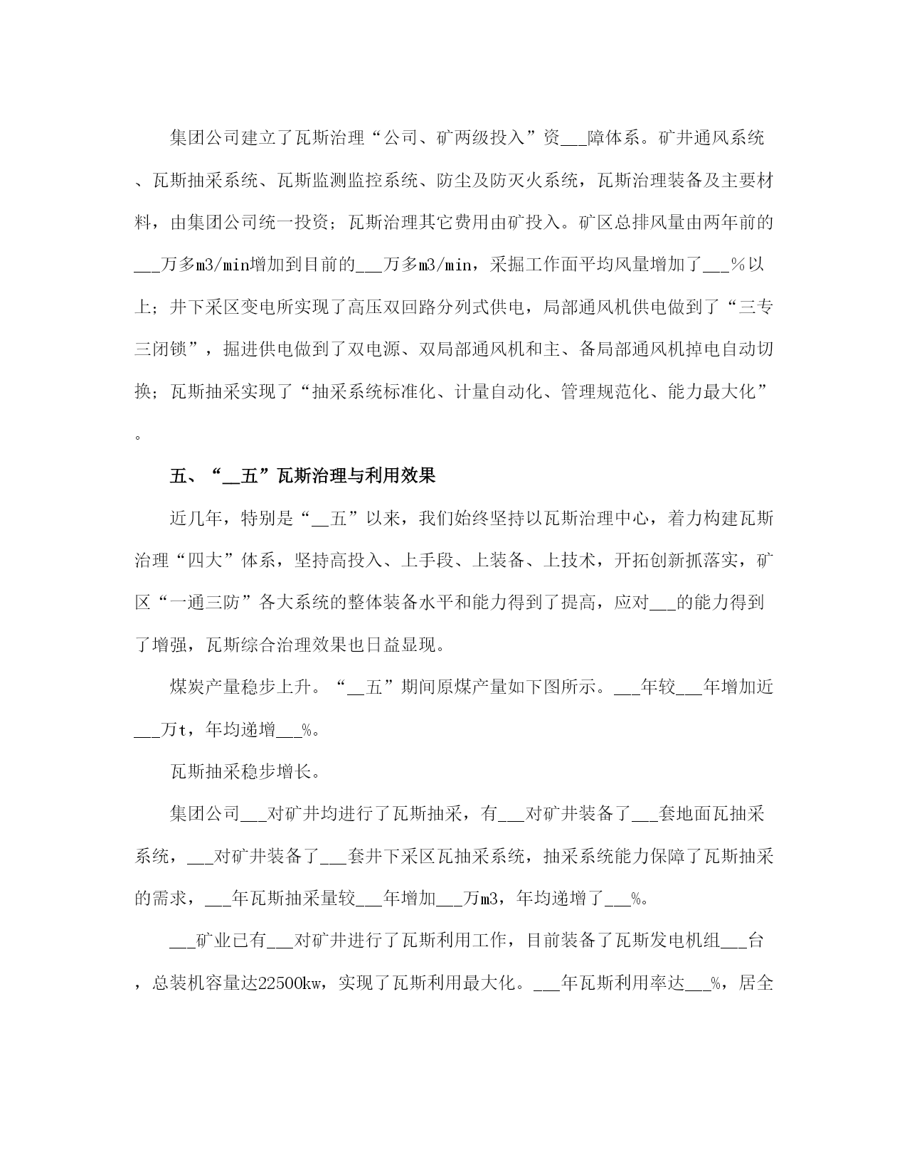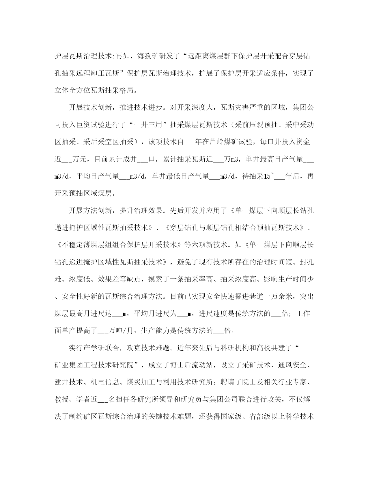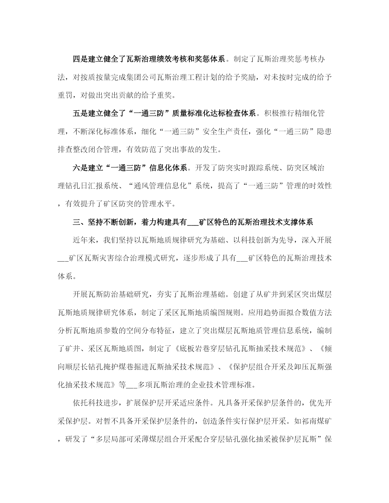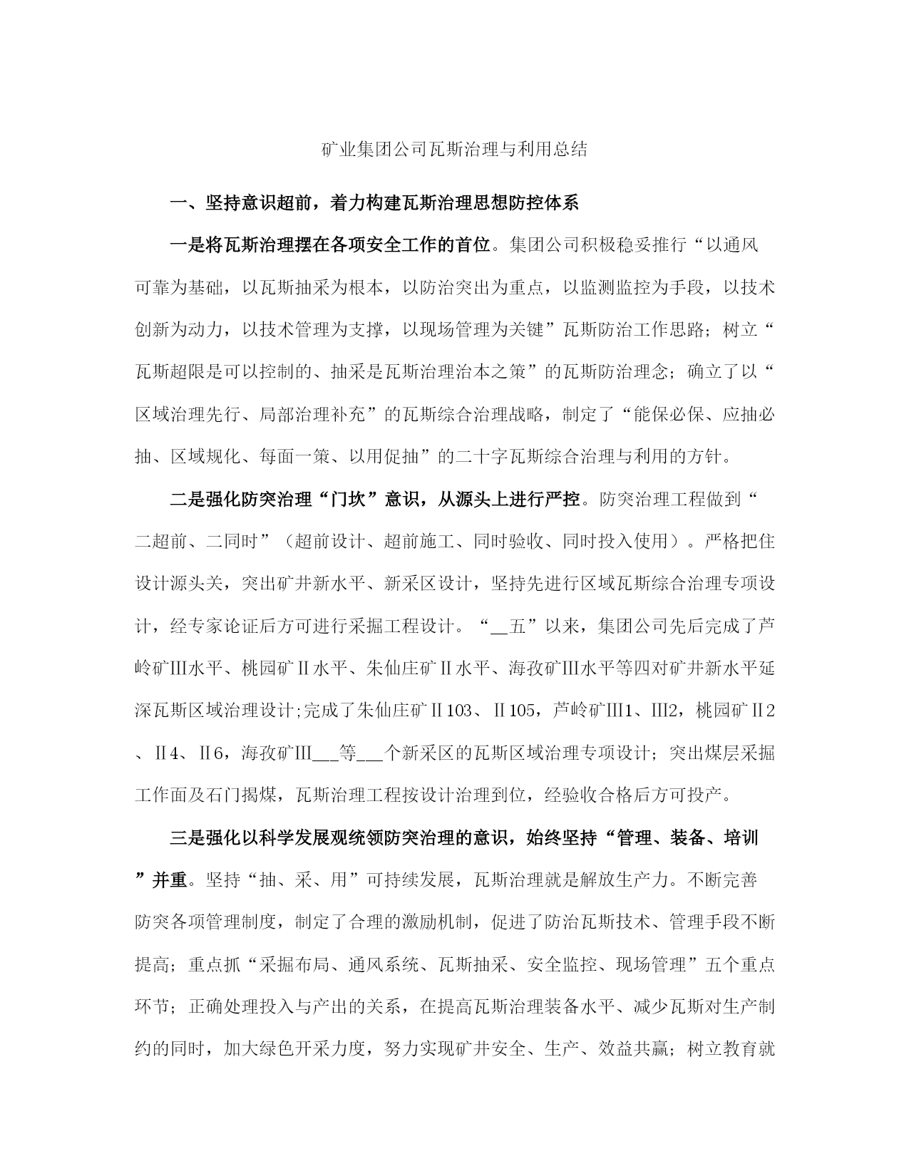 矿业集团公司瓦斯治理与利用总结(完整版)文档资料可直接使用,可编辑,欢迎下载矿业集团公司瓦斯治理与利用总结一、坚持意识超前,着力构建瓦斯治理思想防控体系一是将瓦斯治理摆在各项安全工作的首位。集团公司积极稳妥推行“以通风可靠为基础,以瓦斯抽采为根本,以防治突出为重点,以监测监控为手段,以技术创新为动力,以技术管理为支撑,以现场管理为关键”瓦斯防治工作思路;树立“瓦斯超限是可以控制的、抽采是瓦斯治理治本之策”的瓦斯防治理念;确立了以“区域治理先行、局部治理补充”的瓦斯综合治理战略,制定了“能保必保、应抽必抽、区域规化、每面一策、以用促抽”的二十字瓦斯综合治理与利用的方针。二是强化防突治理“门坎”意识,从源头上进行严控。防突治理工程做到“二超前、二同时”(超前设计、超前施工、同时验收、同时投入使用)。严格把住设计源头关,突出矿井新水平、新采区设计,坚持先进行区域瓦斯综合治理专项设计,经专家论证后方可进行采掘工程设计。“__五”以来,集团公司先后完成了芦岭矿Ⅲ水平、桃园矿Ⅱ水平、朱仙庄矿Ⅱ水平、海孜矿Ⅲ水平等四对矿井新水平延深瓦斯区域治理设计;完成了朱仙庄矿Ⅱ103、Ⅱ105,芦岭矿Ⅲ1、Ⅲ2,桃园矿Ⅱ2、Ⅱ4、Ⅱ6,海孜矿Ⅲ___等___个新采区的瓦斯区域治理专项设计;突出煤层采掘工作面及石门揭煤,瓦斯治理工程按设计治理到位,经验收合格后方可投产。三是强化以科学发展观统领防突治理的意识,始终坚持“管理、装备、培训”并重。坚持“抽、采、用”可持续发展,瓦斯治理就是解放生产力。不断完善防突各项管理制度,制定了合理的激励机制,促进了防治瓦斯技术、管理手段不断提高;重点抓“采掘布局、通风系统、瓦斯抽采、安全监控、现场管理”五个重点环节;正确处理投入与产出的关系,在提高瓦斯治理装备水平、减少瓦斯对生产制约的同时,加大绿色开采力度,努力实现矿井安全、生产、效益共赢;树立教育就是未来的理念,采取不同层次、不同形式的培训方式,强化职工防治煤与瓦斯突出知识教育培训,增强了全员素质。二、强化管理落实,着力构建突出防治管理体系一是建立健全“一通三防”管理制度和标准体系。根据国家有关安全生产法律、法规、规定和标准的要求,集团公司结合实际,建立了一整套的“一通三防”管理制度、“一通三防”各系统设计技术标准,并汇编成册。构成了“一通三防”管理的基本制度框架,使“一通三防”工作走上了制度化、规范化、科学化管理的轨道。二是建立健全瓦斯治理___保障体系。集团公司规定了企业法人代表是煤与瓦斯突出治理的第一责任者,总工程师对突出治理负全面技术责任,明确了各级分管领导的责任。公司设立了通风副总工程师,成立了通防处,加强了对瓦斯治理工作的领导和管理;基层各矿井设立了通风副总,成立了通风区;突出矿井设立了防突副总,成立了防突区;建立健全了各级瓦斯治理工作岗位责任制,形成了层级管理监督网络。瓦斯防治实行目标管理,从集团公司到矿井都逐级制定了瓦斯治理目标和考核办法,有关职能部门制定了业务保安措施,做到了有目标、有措施、有检查、有责任落实。三是突出五项重点,实现四个转变。重点抓住采掘布局、通风系统、瓦斯抽采、安全监控、现场管理五个重点环节,实现了局部治理向区域治理转变、措施型治理向工程型治理转变、生产过程治理向超前治理转变、单一抽放向以用促抽转变的四个大的转变。四是建立健全了瓦斯治理绩效考核和奖惩体系。制定了瓦斯治理奖惩考核办法,对按质按量完成集团公司瓦斯治理工程计划的给予奖励,对未按时完成的给予重罚,对做出突出贡献的给予重奖。五是建立健全了“一通三防”质量标准化达标检查体系。积极推行精细化管理,不断深化标准体系,细化“一通三防”安全生产责任,强化“一通三防”隐患排查整改闭合管理,有效防范了突出事故的发生。六是建立“一通三防”信息化体系。开发了防突实时跟踪系统、防突区域治理钻孔日汇报系统、“通风管理信息化”系统,提高了“一通三防”管理的时效性,有效提升了矿区防突的管理水平。三、坚持不断创新,着力构建具有___矿区特色的瓦斯治理技术支撑体系近年来,我们坚持以瓦斯地质规律研究为基础、以科技创新为先导,深入开展___矿区瓦斯灾害综合治理模式研究,逐步形成了具有___矿区特色的瓦斯治理技术体系。开展瓦斯防治基础研究,夯实了瓦斯治理基础。创建了从矿井到采区突出煤层瓦斯地质规律研究体系,制定了采区瓦斯地质编图规则。应用趋势面拟合数值方法分析瓦斯地质参数的空间分布特征,建立了突出煤层瓦斯地质管理信息系统,编制了矿井、采区瓦斯地质图,制定了《底板岩巷穿层钻孔瓦斯抽采技术规范》、《倾向顺层长钻孔掩护煤巷掘进瓦斯抽采技术规范》、《保护层组合开采及卸压瓦斯强化抽采技术规范》等___多项瓦斯治理的企业技术管理标准。依托科技进步,扩展保护层开采适应条件。凡具备开采保护层条