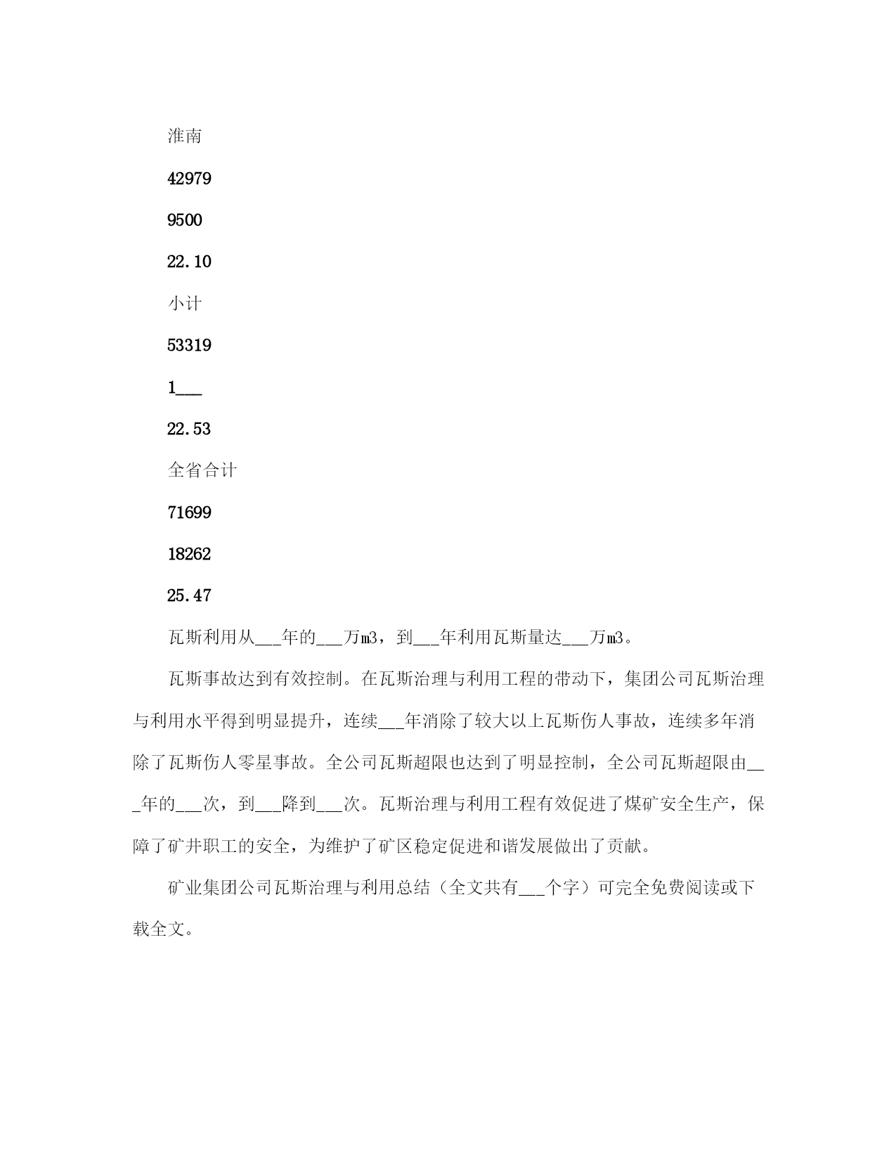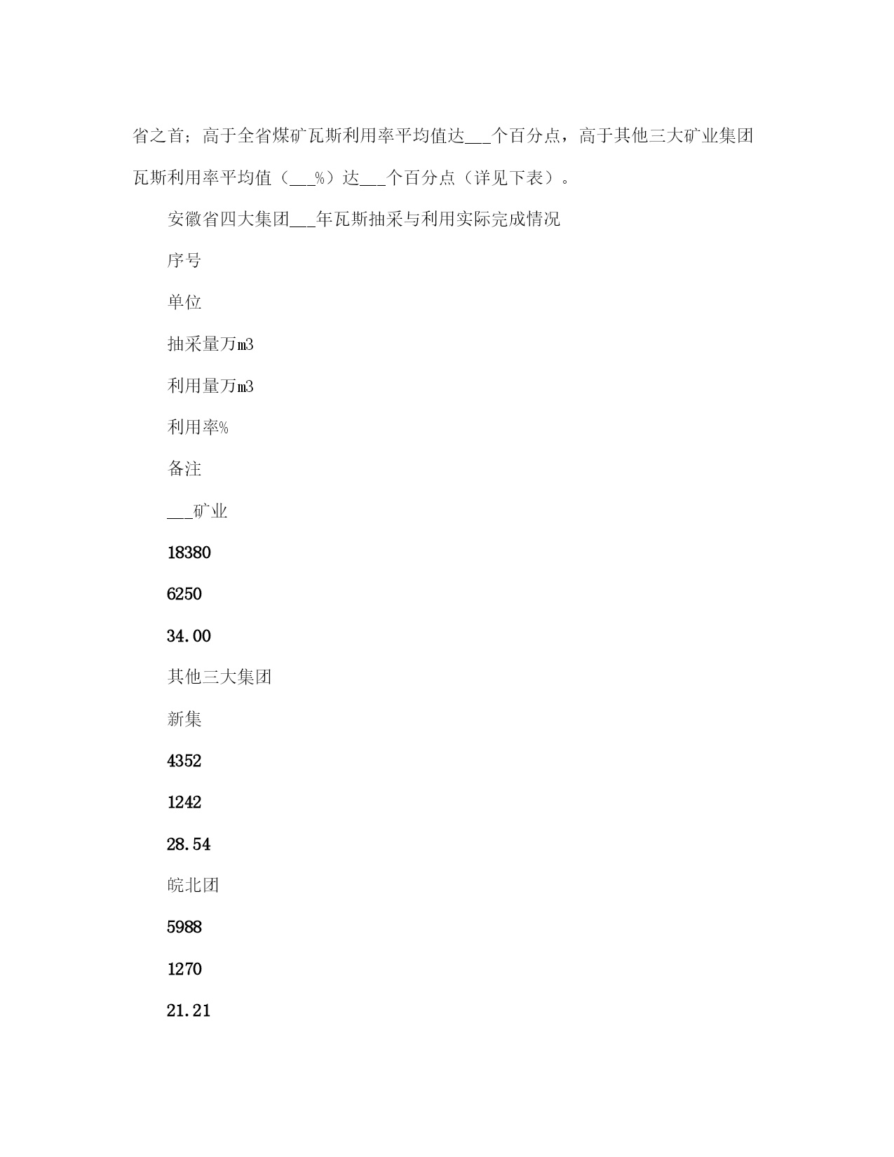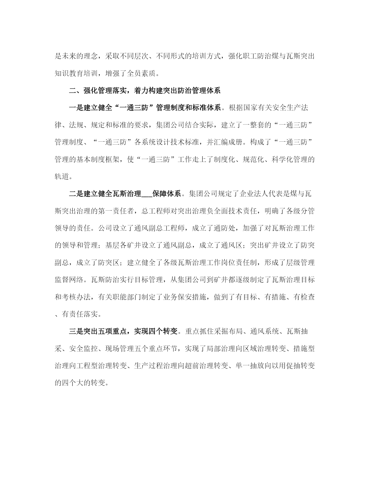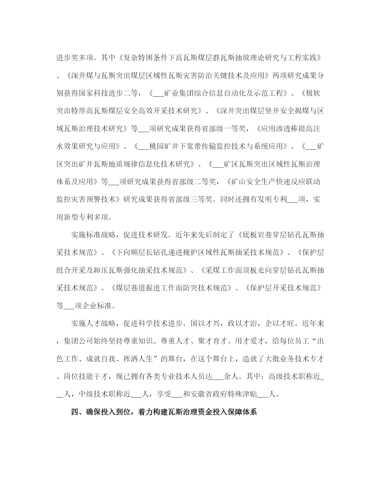 矿业集团公司瓦斯治理与利用总结(完整版)文档资料可直接使用,可编辑,欢迎下载矿业集团公司瓦斯治理与利用总结一、坚持意识超前,着力构建瓦斯治理思想防控体系一是将瓦斯治理摆在各项安全工作的首位。集团公司积极稳妥推行“以通风可靠为基础,以瓦斯抽采为根本,以防治突出为重点,以监测监控为手段,以技术创新为动力,以技术管理为支撑,以现场管理为关键”瓦斯防治工作思路;树立“瓦斯超限是可以控制的、抽采是瓦斯治理治本之策”的瓦斯防治理念;确立了以“区域治理先行、局部治理补充”的瓦斯综合治理战略,制定了“能保必保、应抽必抽、区域规化、每面一策、以用促抽”的二十字瓦斯综合治理与利用的方针。二是强化防突治理“门坎”意识,从源头上进行严控。防突治理工程做到“二超前、二同时”(超前设计、超前施工、同时验收、同时投入使用)。严格把住设计源头关,突出矿井新水平、新采区设计,坚持先进行区域瓦斯综合治理专项设计,经专家论证后方可进行采掘工程设计。“__五”以来,集团公司先后完成了芦岭矿Ⅲ水平、桃园矿Ⅱ水平、朱仙庄矿Ⅱ水平、海孜矿Ⅲ水平等四对矿井新水平延深瓦斯区域治理设计;完成了朱仙庄矿Ⅱ103、Ⅱ105,芦岭矿Ⅲ1、Ⅲ2,桃园矿Ⅱ2、Ⅱ4、Ⅱ6,海孜矿Ⅲ___等___个新采区的瓦斯区域治理专项设计;突出煤层采掘工作面及石门揭煤,瓦斯治理工程按设计治理到位,经验收合格后方可投产。三是强化以科学发展观统领防突治理的意识,始终坚持“管理、装备、培训”并重。坚持“抽、采、用”可持续发展,瓦斯治理就是解放生产力。不断完善防突各项管理制度,制定了合理的激励机制,促进了防治瓦斯技术、管理手段不断提高;重点抓“采掘布局、通风系统、瓦斯抽采、安全监控、现场管理”五个重点环节;正确处理投入与产出的关系,在提高瓦斯治理装备水平、减少瓦斯对生产制约的同时,加大绿色开采力度,努力实现矿井安全、生产、效益共赢;树立教育就是未来的理念,采取不同层次、不同形式的培训方式,强化职工防治煤与瓦斯突出知识教育培训,增强了全员素质。二、强化管理落实,着力构建突出防治管理体系一是建立健全“一通三防”管理制度和标准体系。根据国家有关安全生产法律、法规、规定和标准的要求,集团公司结合实际,建立了一整套的“一通三防”管理制度、“一通三防”各系统设计技术标准,并汇编成册。构成了“一通三防”管理的基本制度框架,使“一通三防”工作走上了制度化、规范化、科学化管理的轨道。二是建立健全瓦斯治理___保障体系。集团公司规定了企业法人代表是煤与瓦斯突出治理的第一责任者,总工程师对突出治理负全面技术责任,明确了各级分管领导的责任。公司设立了通风副总工程师,成立了通防处,加强了对瓦斯治理工作的领导和管理;基层各矿井设立了通风副总,成立了通风区;突出矿井设立了防突副总,成立了防突区;建立健全了各级瓦斯治理工作岗位责任制,形成了层级管理监督网络。瓦斯防治实行目标管理,从集团公司到矿井都逐级制定了瓦斯治理目标和考核办法,有关职能部门制定了业务保安措施,做到了有目标、有措施、有检查、有责任落实。三是突出五项重点,实现四个转变。重点抓住采掘布局、通风系统、瓦斯抽采、安全监控、现场管理五个重点环节,实现了局部治理向区域治理转变、措施型治理向工程型治理转变、生产过程治理向超前治理转变、单一抽放向以用促抽转变的四个大的转变。四是建立健全了瓦斯治理绩效考核和奖惩体系。制定了瓦斯治理奖惩考核办法,对按质按量完成集团公司瓦斯治理工程计划的给予奖励,对未按时完成的给予重罚,对做出突出贡献的给予重奖。五是建立健全了“一通三防”质量标准化达标检查体系。积极推行精细化管理,不断深化标准体系,细化“一通三防”安全生产责任,强化“一通三防”隐患排查整改闭合管理,有效防范了突出事故的发生。六是建立“一通三防”信息化体系。开发了防突实时跟踪系统、防突区域治理钻孔日汇报系统、“通风管理信息化”系统,提高了“一通三防”管理的时效性,有效提升了矿区防突的管理水平。三、坚持不断创新,着力构建具有___矿区特色的瓦斯治理技术支撑体系近年来,我们坚持以瓦斯地质规律研究为基础、以科技创新为先导,深入开展___矿区瓦斯灾害综合治理模式研究,逐步形成了具有___矿区特色的瓦斯治理技术体系。开展瓦斯防治基础研究,夯实了瓦斯治理基础。创建了从矿井到采区突出煤层瓦斯地质规律研究体系,制定了采区瓦斯地质编图规则。应用趋势面拟合数值方法分析瓦斯地质参数的空间分布特征,建立了突出煤层瓦斯地质管理信息系统,编制了矿井、采区瓦斯地质图,制定了《底板岩巷穿层钻孔瓦斯抽采技术规范》、《倾向顺层长钻孔掩护煤巷掘进瓦斯抽采技术规范》、《保护层组合开采及卸压瓦斯强化抽采技术规范》等___多项瓦斯治理的企业技术管理标准。依托科技进步,扩展保护层开采适应条件。凡具备开采保护层条