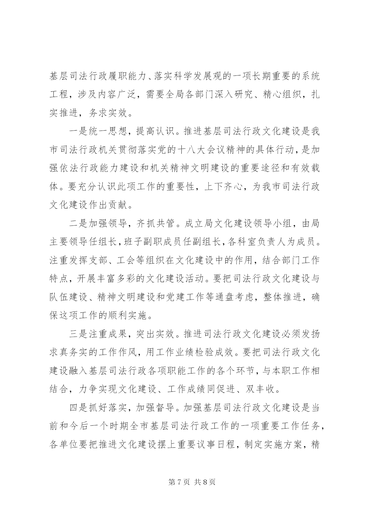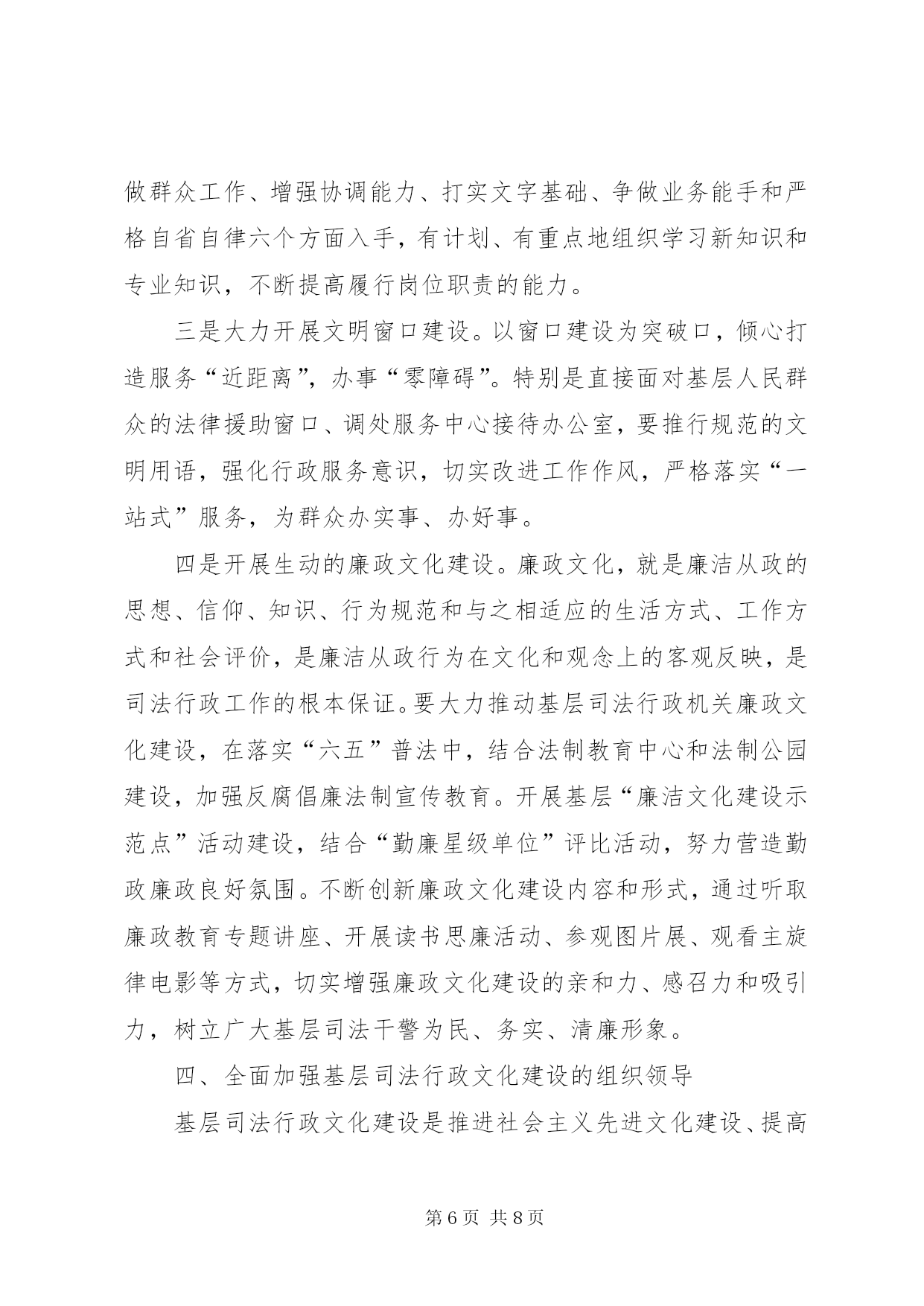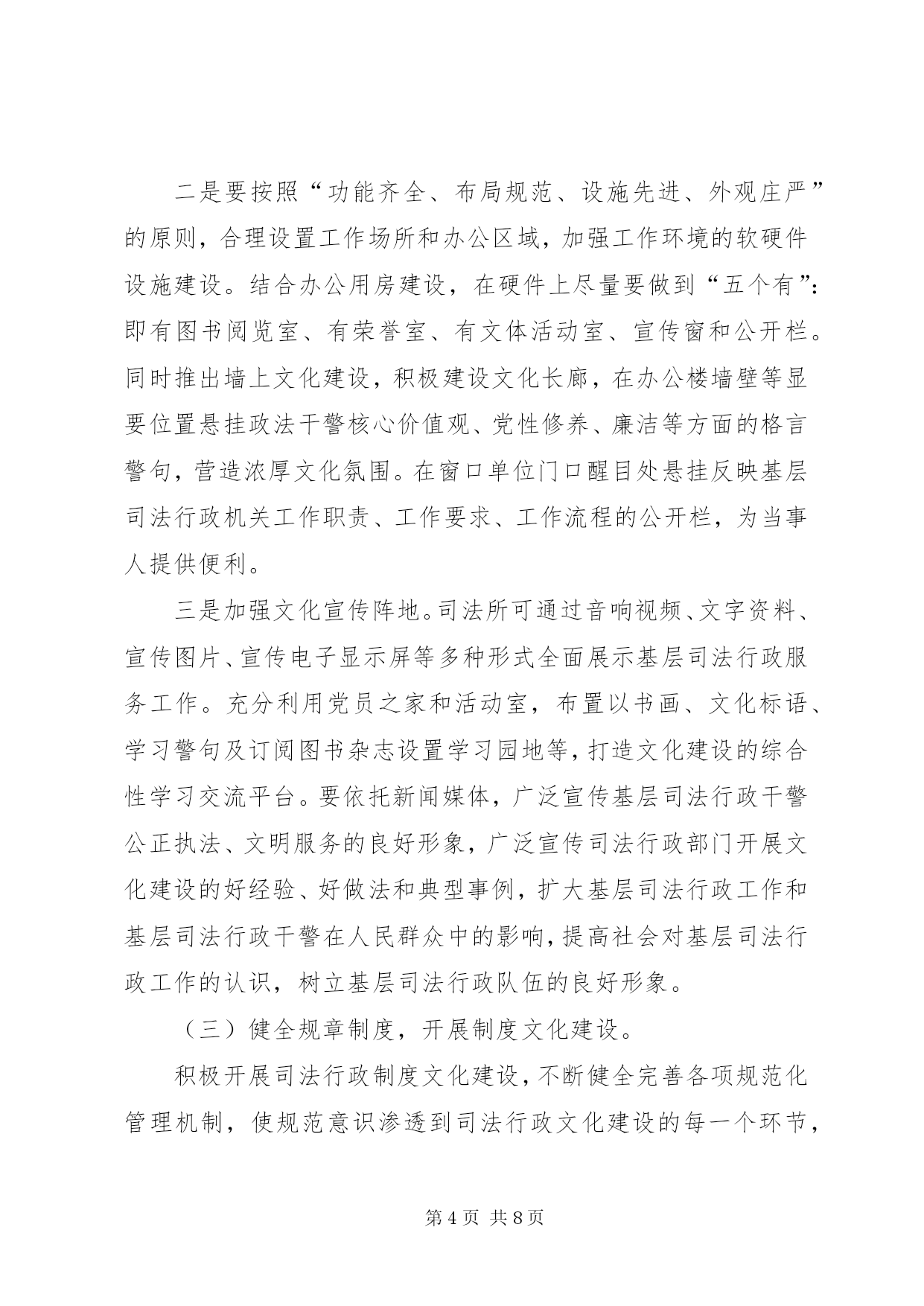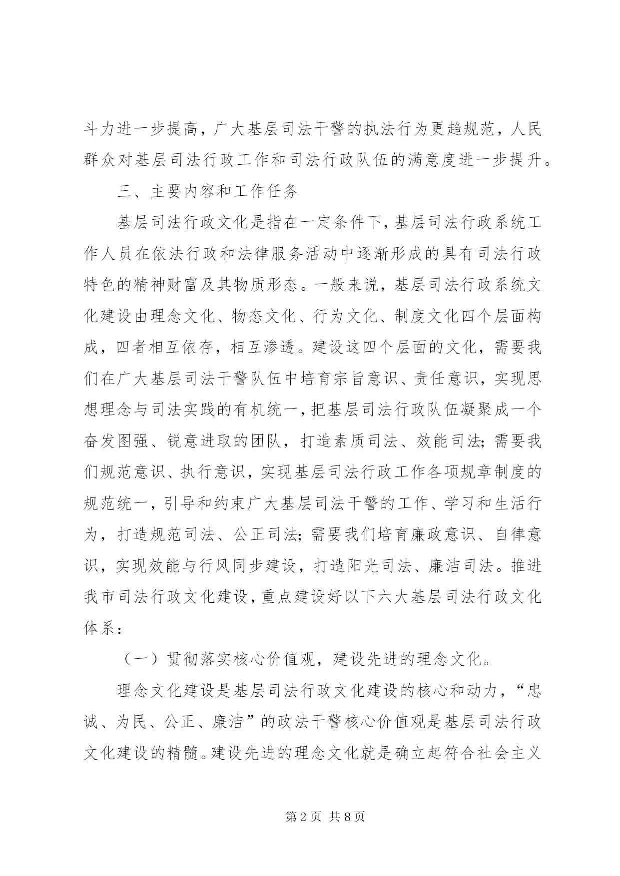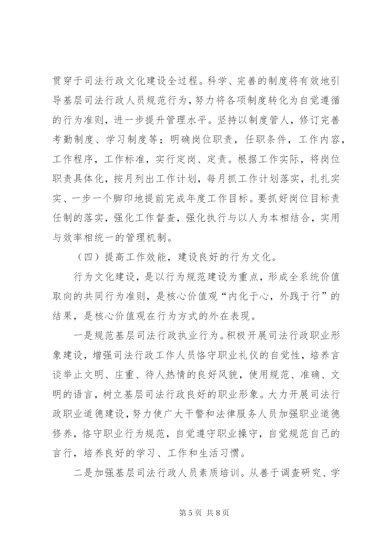 第PAGE\*Arabic\*MERGEFORMAT8页共NUMPAGES\*MERGEFORMAT8页基层司法文化建设工作方案为深入贯彻落实党的十八大会议精神,进一步激发全市基层司法行政机关内部活力,全面提升我市基层司法行政队伍的整体素质、执法水平和服务质量,打造基层司法行政文化品牌,树立基层司法行政良好社会形象,全力推进平安建设、法治建设、队伍建设,进一步提高司法行政工作亲和力和公信力。现结合我市基层司法行政工作实际,制定本实施意见。一、指导思想全面贯彻落实党的十八大会议精神,坚持以科学发展观为指导,以促进基层司法行政工作的全面发展作为文化建设的出发点和落脚点,以提高专业化、职业化、正规化水平为重点,以提升创造力、凝聚力、战斗力为目标,认真研究探索、深入挖掘具有司法行政特色的文化理念、文化内涵、文化精髓,逐步创建具有健康向上、独具特色的基层司法行政系统文化体系,凝聚基层司法行政队伍奋发向上的精神力量,为推动基层司法行政事业创新发展提供有力的思想保证和精神动力。二、总体目标立足基层司法行政实际,积极创新文化建设的内容形式、载体和制度,形成富于特色、内容丰富、健康向上的基层司法行政文化体系。通过创建特色鲜明的基层司法行政机关文化品牌,使司法行政内部凝聚力进一步增强,外部形象进一步提升,整体战斗力进一步提高,广大基层司法干警的执法行为更趋规范,人民群众对基层司法行政工作和司法行政队伍的满意度进一步提升。三、主要内容和工作任务基层司法行政文化是指在一定条件下,基层司法行政系统工作人员在依法行政和法律服务活动中逐渐形成的具有司法行政特色的精神财富及其物质形态。一般来说,基层司法行政系统文化建设由理念文化、物态文化、行为文化、制度文化四个层面构成,四者相互依存,相互渗透。建设这四个层面的文化,需要我们在广大基层司法干警队伍中培育宗旨意识、责任意识,实现思想理念与司法实践的有机统一,把基层司法行政队伍凝聚成一个奋发图强、锐意进取的团队,打造素质司法、效能司法;需要我们规范意识、执行意识,实现基层司法行政工作各项规章制度的规范统一,引导和约束广大基层司法干警的工作、学习和生活行为,打造规范司法、公正司法;需要我们培育廉政意识、自律意识,实现效能与行风同步建设,打造阳光司法、廉洁司法。推进我市司法行政文化建设,重点建设好以下六大基层司法行政文化体系:(一)贯彻落实核心价值观,建设先进的理念文化。理念文化建设是基层司法行政文化建设的核心和动力,“忠诚、为民、公正、廉洁”的政法干警核心价值观是基层司法行政文化建设的精髓。建设先进的理念文化就是确立起符合社会主义先进文化要求的、具有时代特征和司法特色的、为广大基层司法干警所共同认可并自觉履行的价值观、道德观和行为规范,并通过理念文化对人的思想和行为潜移默化的影响和作用,不断融合和塑造基层司法干警的理想、信念、作风、情操,增强基层司法行政队伍的凝聚力和战斗力。建设先进的理念文化,培育和谐进步的基层司法行政文化精神和理念,可以对内凝聚力量,明确目标,形成团队的战斗力;对外树立基层司法行政良好形象。通过开展政治学习,举办司法理念研讨班、举办先进事迹报告会、先进经验交流会、开展廉洁自律标兵评选等方式,培育广大司法干警忠于法律、诚信为本、维护正义的职业精神,成为全市精神文明建设的示范群体。(二)围绕固本强基主题,做实基层物态文化。物态文化是基层司法行政文化的载体和外在表现,是司法行政精神风貌的社会展现。要加强对司法行政物态文化建设,营造司法行政文化氛围,展现司法行政工作成果。要综合利用基础设施、文字图案、形象符号等因素,探索建立具有地方特色、反映基层司法行政部门特点的形象标识系统,展示基层司法行政形象。一是统一标牌标识,根据司法部印发的《关于统一司法所标识的通知》,司法所办公场所悬挂统一规格制式的司法行政徽和司法所标牌;统一服装、工作徽章;使用统一印制的《司法工作证》。二是要按照“功能齐全、布局规范、设施先进、外观庄严”的原则,合理设置工作场所和办公区域,加强工作环境的软硬件设施建设。结合办公用房建设,在硬件上尽量要做到“五个有”:即有图书阅览室、有荣誉室、有文体活动室、宣传窗和公开栏。同时推出墙上文化建设,积极建设文化长廊,在办公楼墙壁等显要位置悬挂政法干警核心价值观、党性修养、廉洁等方面的格言警句,营造浓厚文化氛围。在窗口单位门口醒目处悬挂反映基层司法行政机关工作职责、工作要求、工作流程的公开栏,为当事人提供便利。三是加强文化宣传阵地。司法所可通过音响视频、文字资料、宣传图片、宣传电子显示屏等多种形式全面展示基层司法行政服务工作。充分利用党员之家和活动室,布置以书画、文化标语、学习警句及订阅图书杂志设置学习园地等,打造文化建设的综合性学习交流平台。要依托新闻媒体,广泛宣传基层司