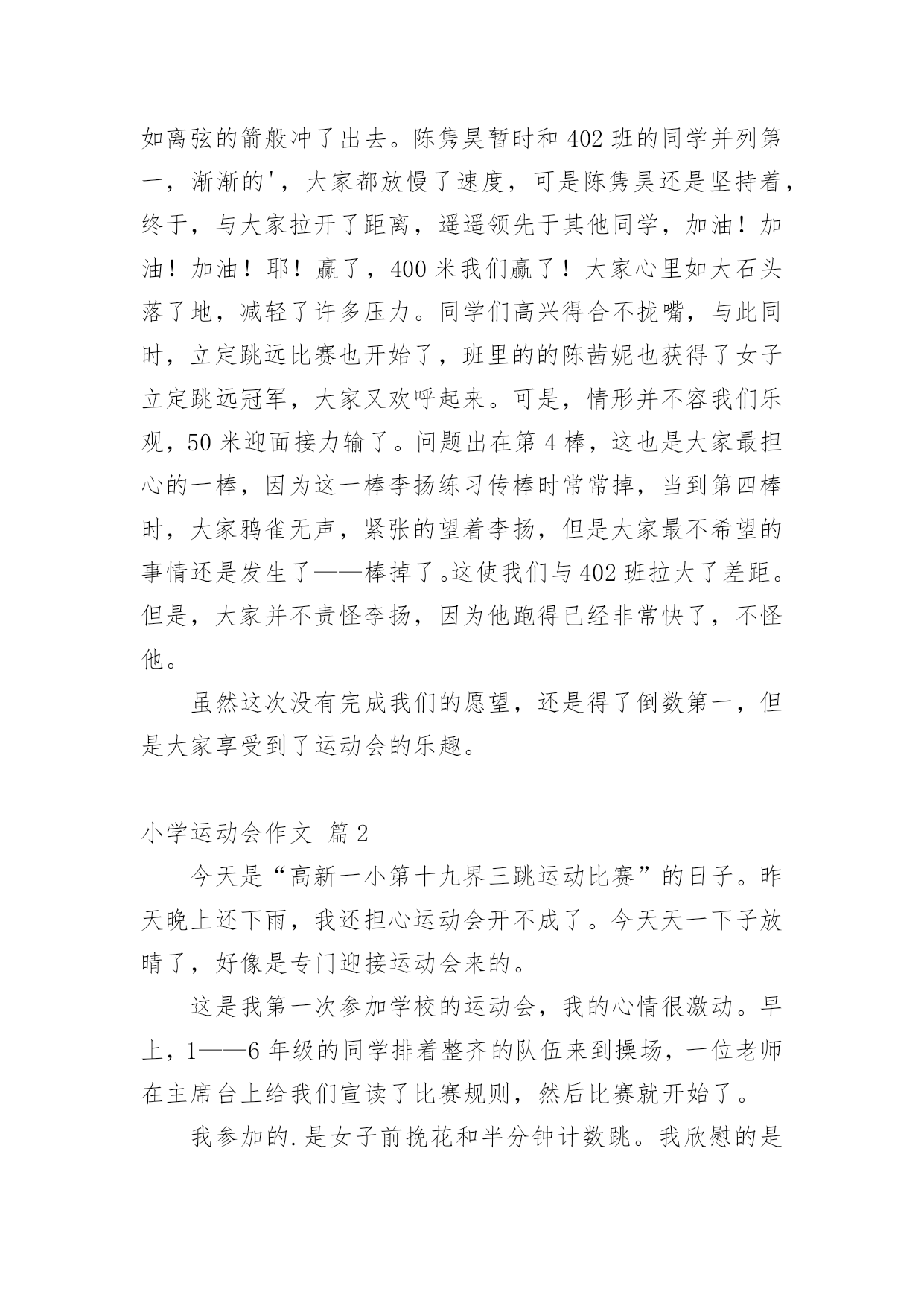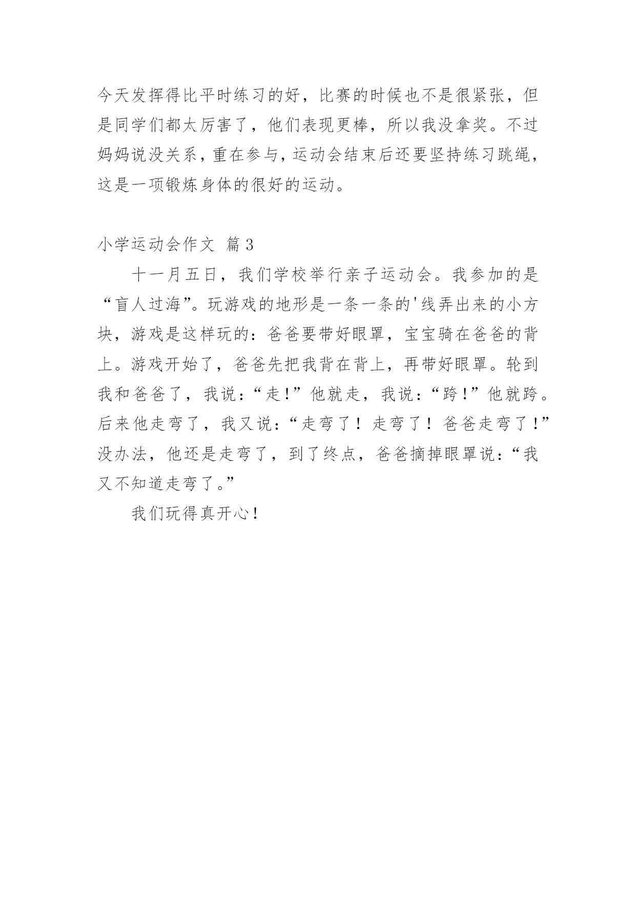 小学运动会作文小学运动会作文【合集】在学习、工作、生活中,大家对作文都再熟悉不过了吧,作文根据写作时限的不同可以分为限时作文和非限时作文。那要怎么写好作文呢?以下是小编帮大家整理的小学运动会作文3篇,仅供参考,希望能够帮助到大家。小学运动会作文篇1咦?哪里来的欢呼声!哦,原来是东柳小学正在举办一年一度的运动会。啦啦队的声音响彻云霄,一阵高过一阵。运动员奋力拼搏,希望获得一个理想的成绩。我们班级团体总分曾经是倒数第一,而今年,大家摩拳擦掌,想把这个倒数翻为正数。我们班的陈隽昊,是一位运动健将,他将面临重大的考验。精彩的100米比赛开始了。运动员们奋力向前冲,可是,这一切都是徒劳,这一次100米,我们输了,大家的心里变得无比沉重,好像压了一块大石头似的,虽然只是一场,但却增添了许多压力。接着的200米,同学们使出吃奶的力气,希望挽回一局,可是,我们还是输了。正犹如火上浇油、冰上加霜、往伤口上撒盐,大家努力控制住自己,不流泪。最精彩的400米开始了,大家把希望都放在了陈隽昊身上,用眼神对他说:“一定要赢啊!要是这局再输,我们班彻底没希望了。加油,陈骏浩!我们看好你,不要让大家失望!”“预备!开始!”运动员们如离弦的箭般冲了出去。陈隽昊暂时和402班的同学并列第一,渐渐的',大家都放慢了速度,可是陈隽昊还是坚持着,终于,与大家拉开了距离,遥遥领先于其他同学,加油!加油!加油!耶!赢了,400米我们赢了!大家心里如大石头落了地,减轻了许多压力。同学们高兴得合不拢嘴,与此同时,立定跳远比赛也开始了,班里的的陈茜妮也获得了女子立定跳远冠军,大家又欢呼起来。可是,情形并不容我们乐观,50米迎面接力输了。问题出在第4棒,这也是大家最担心的一棒,因为这一棒李扬练习传棒时常常掉,当到第四棒时,大家鸦雀无声,紧张的望着李扬,但是大家最不希望的事情还是发生了——棒掉了。这使我们与402班拉大了差距。但是,大家并不责怪李扬,因为他跑得已经非常快了,不怪他。虽然这次没有完成我们的愿望,还是得了倒数第一,但是大家享受到了运动会的乐趣。小学运动会作文篇2今天是“高新一小第十九界三跳运动比赛”的日子。昨天晚上还下雨,我还担心运动会开不成了。今天天一下子放晴了,好像是专门迎接运动会来的。这是我第一次参加学校的运动会,我的心情很激动。早上,1——6年级的同学排着整齐的队伍来到操场,一位老师在主席台上给我们宣读了比赛规则,然后比赛就开始了。我参加的.是女子前挽花和半分钟计数跳。我欣慰的是今天发挥得比平时练习的好,比赛的时候也不是很紧张,但是同学们都太厉害了,他们表现更棒,所以我没拿奖。不过妈妈说没关系,重在参与,运动会结束后还要坚持练习跳绳,这是一项锻炼身体的很好的运动。小学运动会作文篇3十一月五日,我们学校举行亲子运动会。我参加的是“盲人过海”。玩游戏的地形是一条一条的'线弄出来的小方块,游戏是这样玩的:爸爸要带好眼罩,宝宝骑在爸爸的背上。游戏开始了,爸爸先把我背在背上,再带好眼罩。轮到我和爸爸了,我说:“走!”他就走,我说:“跨!”他就跨。后来他走弯了,我又说:“走弯了!走弯了!爸爸走弯了!”没办法,他还是走弯了,到了终点,爸爸摘掉眼罩说:“我又不知道走弯了。”我们玩得真开心!