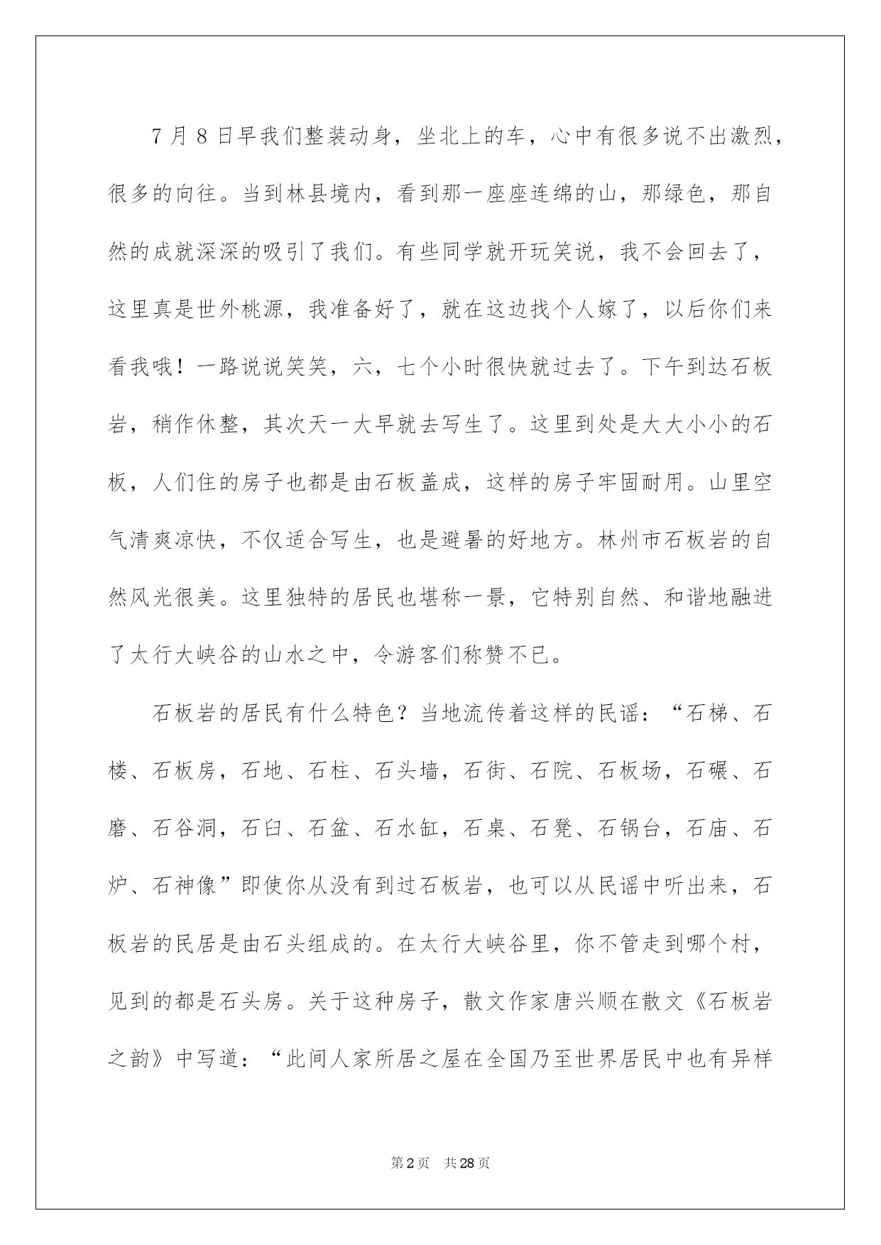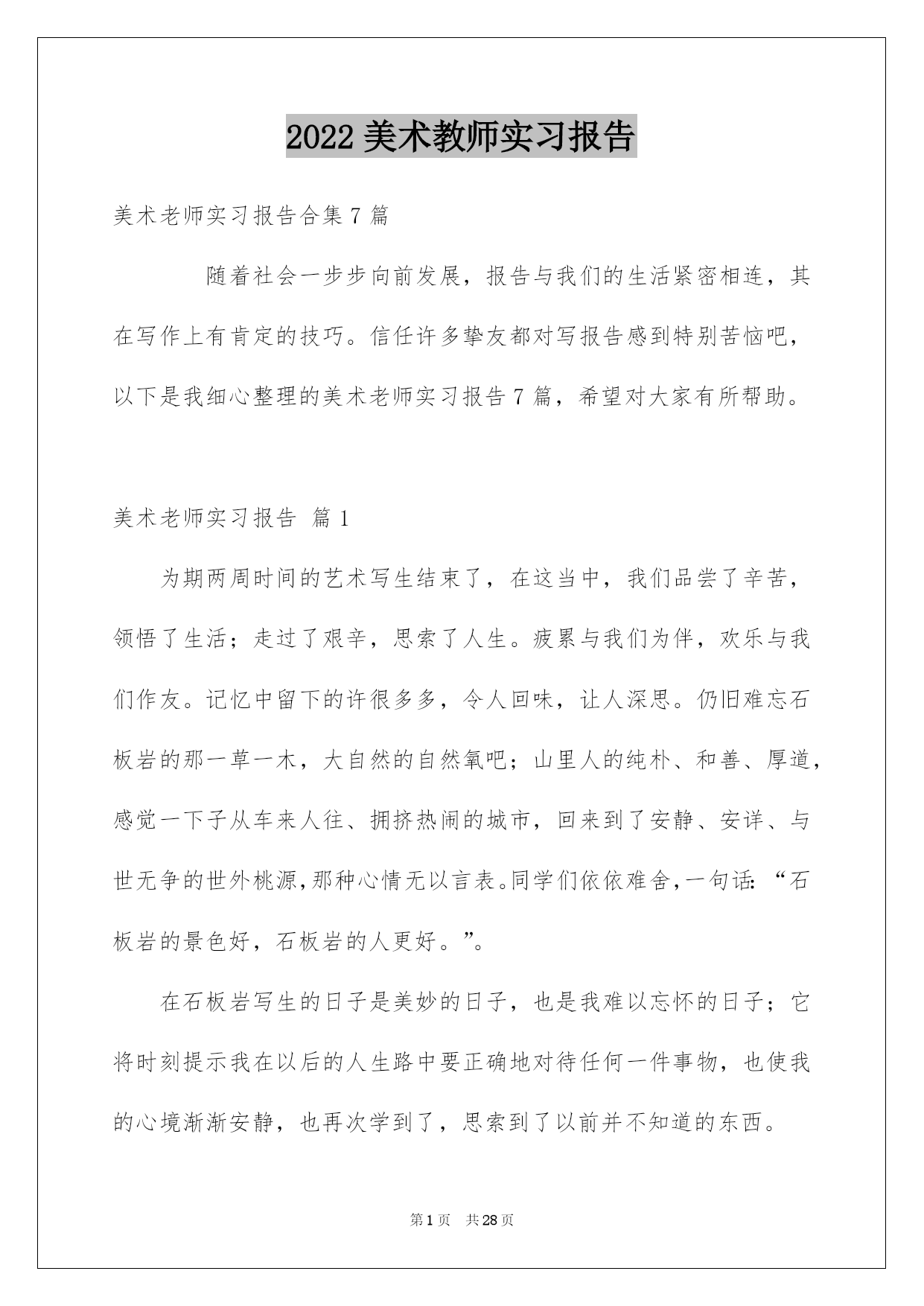第PAGE\*Arabic\*MERGEFORMAT28页共NUMPAGES\*Arabic\*MERGEFORMAT28页第PAGE\*MERGEFORMAT28页共NUMPAGES\*MERGEFORMAT28页第PAGE\*MERGEFORMAT28页共NUMPAGES\*MERGEFORMAT28页第PAGE\*MERGEFORMAT28页共NUMPAGES\*MERGEFORMAT28页第PAGE\*MERGEFORMAT28页共NUMPAGES\*MERGEFORMAT28页第PAGE\*MERGEFORMAT28页共NUMPAGES\*MERGEFORMAT28页第PAGE\*MERGEFORMAT28页共NUMPAGES\*MERGEFORMAT28页第PAGE\*MERGEFORMAT28页共NUMPAGES\*MERGEFORMAT28页第PAGE\*MERGEFORMAT28页共NUMPAGES\*MERGEFORMAT28页第PAGE\*MERGEFORMAT28页共NUMPAGES\*MERGEFORMAT28页第PAGE\*MERGEFORMAT28页共NUMPAGES\*MERGEFORMAT28页2022美术教师实习报告美术老师实习报告合集7篇随着社会一步步向前发展,报告与我们的生活紧密相连,其在写作上有肯定的技巧。信任许多挚友都对写报告感到特别苦恼吧,以下是我细心整理的美术老师实习报告7篇,希望对大家有所帮助。美术老师实习报告篇1为期两周时间的艺术写生结束了,在这当中,我们品尝了辛苦,领悟了生活;走过了艰辛,思索了人生。疲累与我们为伴,欢乐与我们作友。记忆中留下的许很多多,令人回味,让人深思。仍旧难忘石板岩的那一草一木,大自然的自然氧吧;山里人的纯朴、和善、厚道,感觉一下子从车来人往、拥挤热闹的城市,回来到了安静、安详、与世无争的世外桃源,那种心情无以言表。同学们依依难舍,一句话:“石板岩的景色好,石板岩的人更好。”。在石板岩写生的日子是美妙的日子,也是我难以忘怀的日子;它将时刻提示我在以后的人生路中要正确地对待任何一件事物,也使我的心境渐渐安静,也再次学到了,思索到了以前并不知道的东西。7月8日早我们整装动身,坐北上的车,心中有很多说不出激烈,很多的向往。当到林县境内,看到那一座座连绵的山,那绿色,那自然的成就深深的吸引了我们。有些同学就开玩笑说,我不会回去了,这里真是世外桃源,我准备好了,就在这边找个人嫁了,以后你们来看我哦!一路说说笑笑,六,七个小时很快就过去了。下午到达石板岩,稍作休整,其次天一大早就去写生了。这里到处是大大小小的石板,人们住的房子也都是由石板盖成,这样的房子牢固耐用。山里空气清爽凉快,不仅适合写生,也是避暑的好地方。林州市石板岩的自然风光很美。这里独特的居民也堪称一景,它特别自然、和谐地融进了太行大峡谷的山水之中,令游客们称赞不已。石板岩的居民有什么特色?当地流传着这样的民谣:“石梯、石楼、石板房,石地、石柱、石头墙,石街、石院、石板场,石碾、石磨、石谷洞,石臼、石盆、石水缸,石桌、石凳、石锅台,石庙、石炉、石神像”即使你从没有到过石板岩,也可以从民谣中听出来,石板岩的民居是由石头组成的。在太行大峡谷里,你不管走到哪个村,见到的都是石头房。关于这种房子,散文作家唐兴顺在散文《石板岩之韵》中写道:“此间人家所居之屋在全国乃至世界居民中也有异样特色,一律用石头建立。一座房屋只有门子、窗棂是木头的,像童话中的建筑一样漂亮。”对墙的内壁,山里人先用麦秸泥泥一层,然后再泥上一层白灰泥,屋内便变得整齐、亮堂。这种房住进去冬暖夏凉。就地取材成就了富有特色的石板岩居民。古时石板岩山道坎坷险峻,交通运输极为不便,人们进山出山运点儿东西都是靠肩挑手抬,山下的砖瓦是很难运到山里的。再者,石板岩是个特别贫瘠的地方,多数村民没有财力到山下买来砖瓦建房,即使有的人有财力,勤俭的人们也不原意花那冤枉钱,眼前、身边、脚下,那塞满天地间的石头就是最亲切、最经济、最顺手、最志向的建筑材料。他们只须要花些力气把这些石头开出来,再依据自己的须要凿成形,就可以建成一座称心的房子。这种房子在发展旅游业的今日,形成自己独有的地方特色,形成一种极富地方文化魅力的建筑。一起先同学们看到这么多的石板、房子有点手足无措,不知从何画起。于是老师就耐性地讲解并亲自作范画给我们看。根据老师的讲解,先构图,留意疏密关系,画多了自然就好了。在这里,大自然的绚丽壮丽,民族文化的博大精深,恶劣和险峻的路途,艰苦的历程,都剧烈地吸引和刺激着同学们的感官,激励求知探究的欲望,唤起剧烈