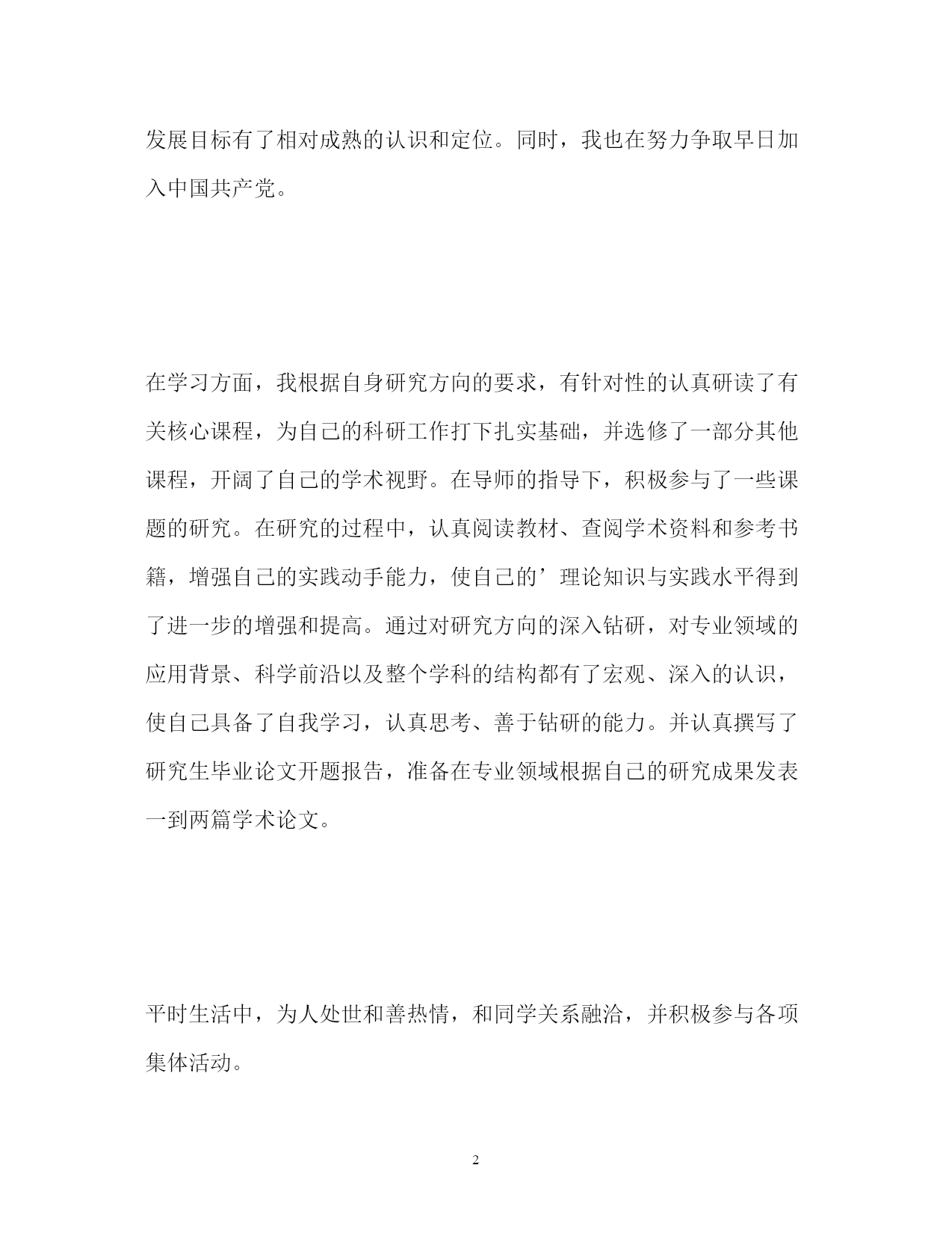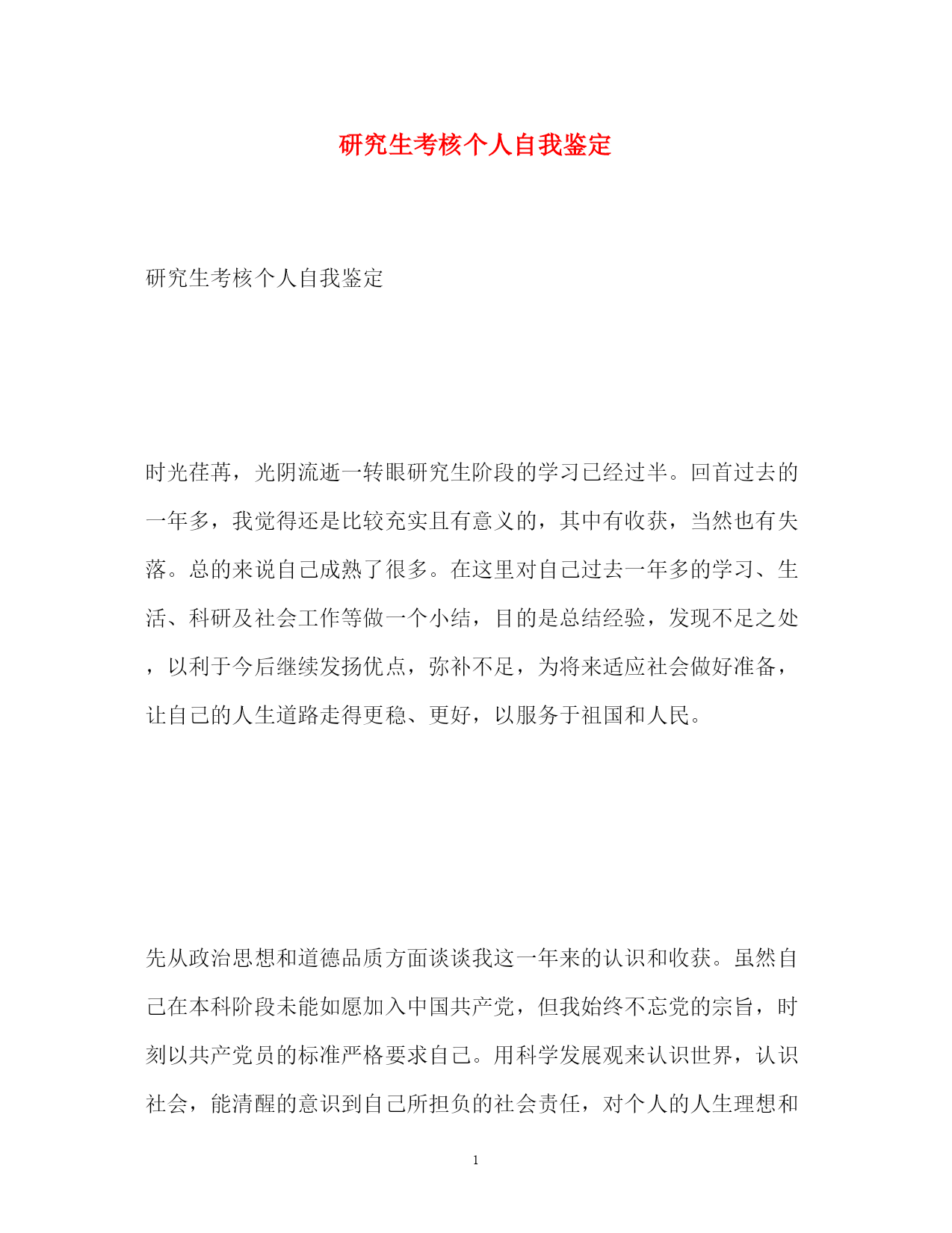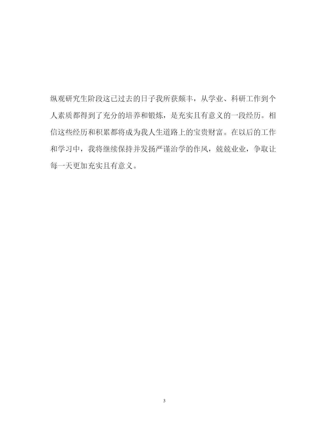 此资料由网络收集而来,如有侵权请告知上传者立即删除。资料共分享,我们负责传递知识。PAGEPAGE3研究生考核个人自我鉴定研究生考核个人自我鉴定时光荏苒,光阴流逝一转眼研究生阶段的学习已经过半。回首过去的一年多,我觉得还是比较充实且有意义的,其中有收获,当然也有失落。总的来说自己成熟了很多。在这里对自己过去一年多的学习、生活、科研及社会工作等做一个小结,目的是总结经验,发现不足之处,以利于今后继续发扬优点,弥补不足,为将来适应社会做好准备,让自己的人生道路走得更稳、更好,以服务于祖国和人民。先从政治思想和道德品质方面谈谈我这一年来的认识和收获。虽然自己在本科阶段未能如愿加入中国共产党,但我始终不忘党的宗旨,时刻以共产党员的标准严格要求自己。用科学发展观来认识世界,认识社会,能清醒的意识到自己所担负的社会责任,对个人的人生理想和发展目标有了相对成熟的认识和定位。同时,我也在努力争取早日加入中国共产党。在学习方面,我根据自身研究方向的要求,有针对性的认真研读了有关核心课程,为自己的科研工作打下扎实基础,并选修了一部分其他课程,开阔了自己的学术视野。在导师的指导下,积极参与了一些课题的研究。在研究的过程中,认真阅读教材、查阅学术资料和参考书籍,增强自己的实践动手能力,使自己的’理论知识与实践水平得到了进一步的增强和提高。通过对研究方向的深入钻研,对专业领域的应用背景、科学前沿以及整个学科的结构都有了宏观、深入的认识,使自己具备了自我学习,认真思考、善于钻研的能力。并认真撰写了研究生毕业论文开题报告,准备在专业领域根据自己的研究成果发表一到两篇学术论文。平时生活中,为人处世和善热情,和同学关系融洽,并积极参与各项集体活动。纵观研究生阶段这已过去的日子我所获颇丰,从学业、科研工作到个人素质都得到了充分的培养和锻炼,是充实且有意义的一段经历。相信这些经历和积累都将成为我人生道路上的宝贵财富。在以后的工作和学习中,我将继续保持并发扬严谨治学的作风,兢兢业业,争取让每一天更加充实且有意义。