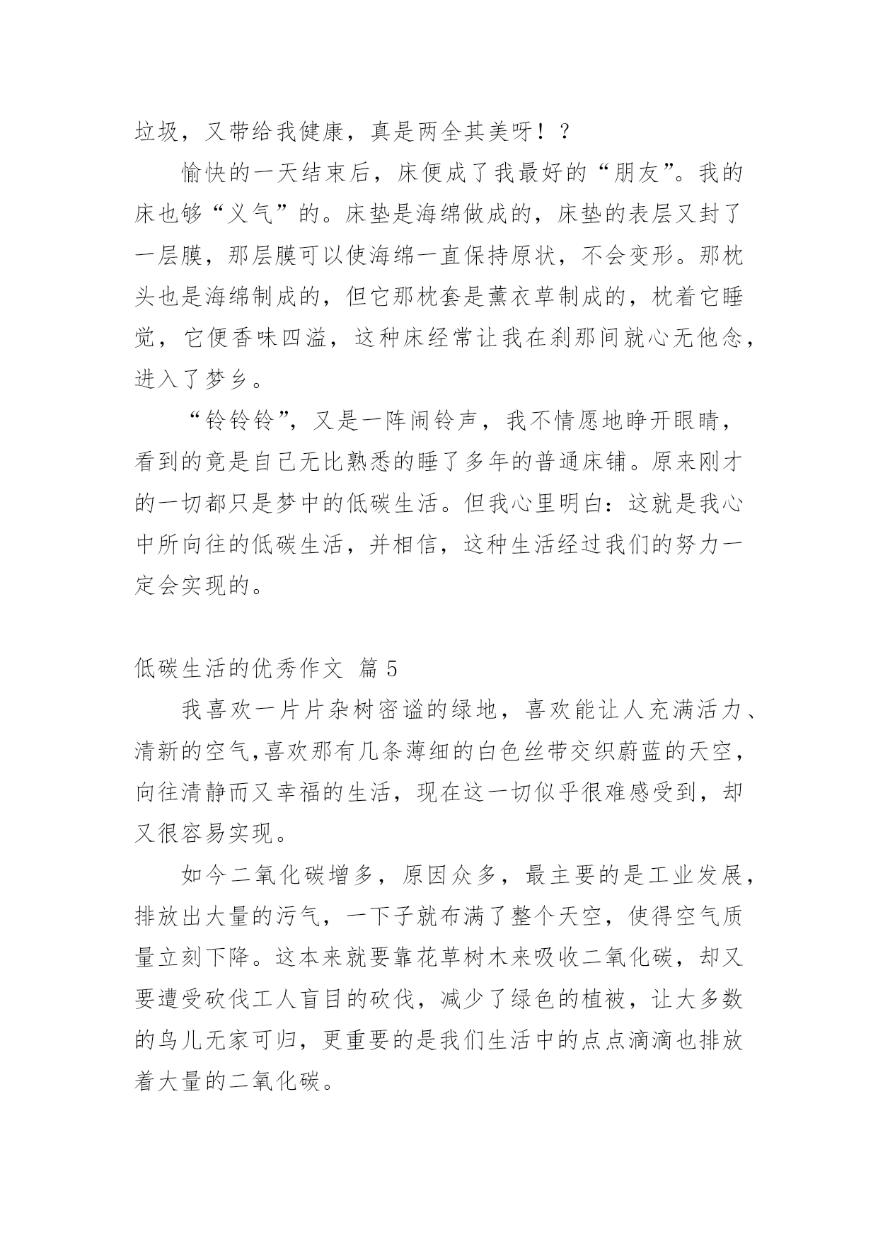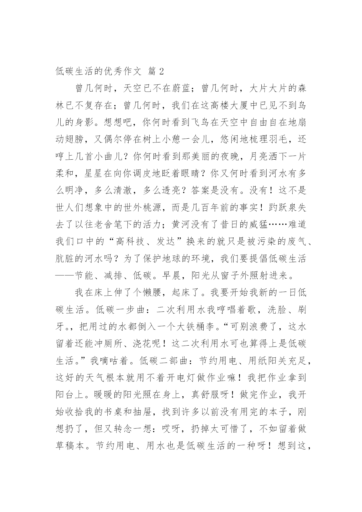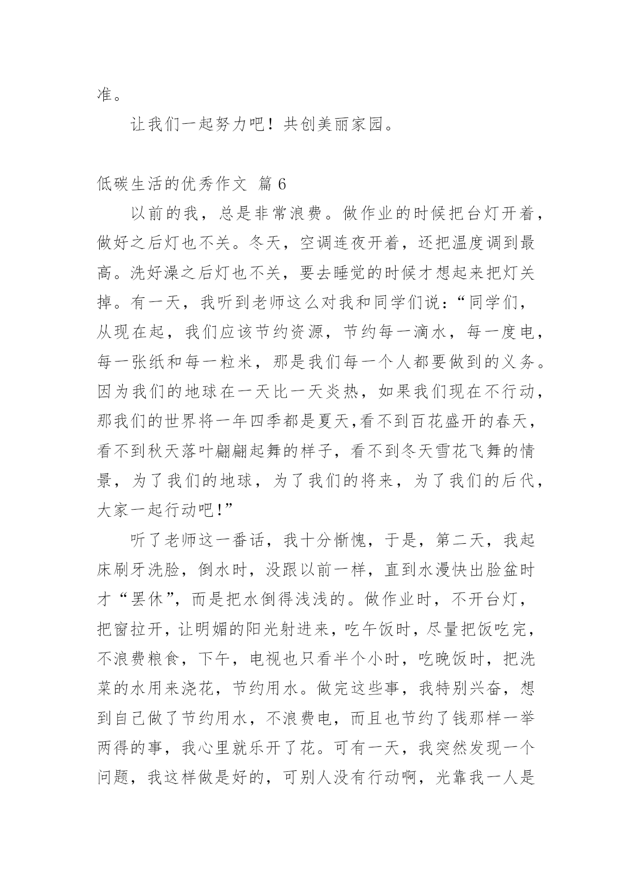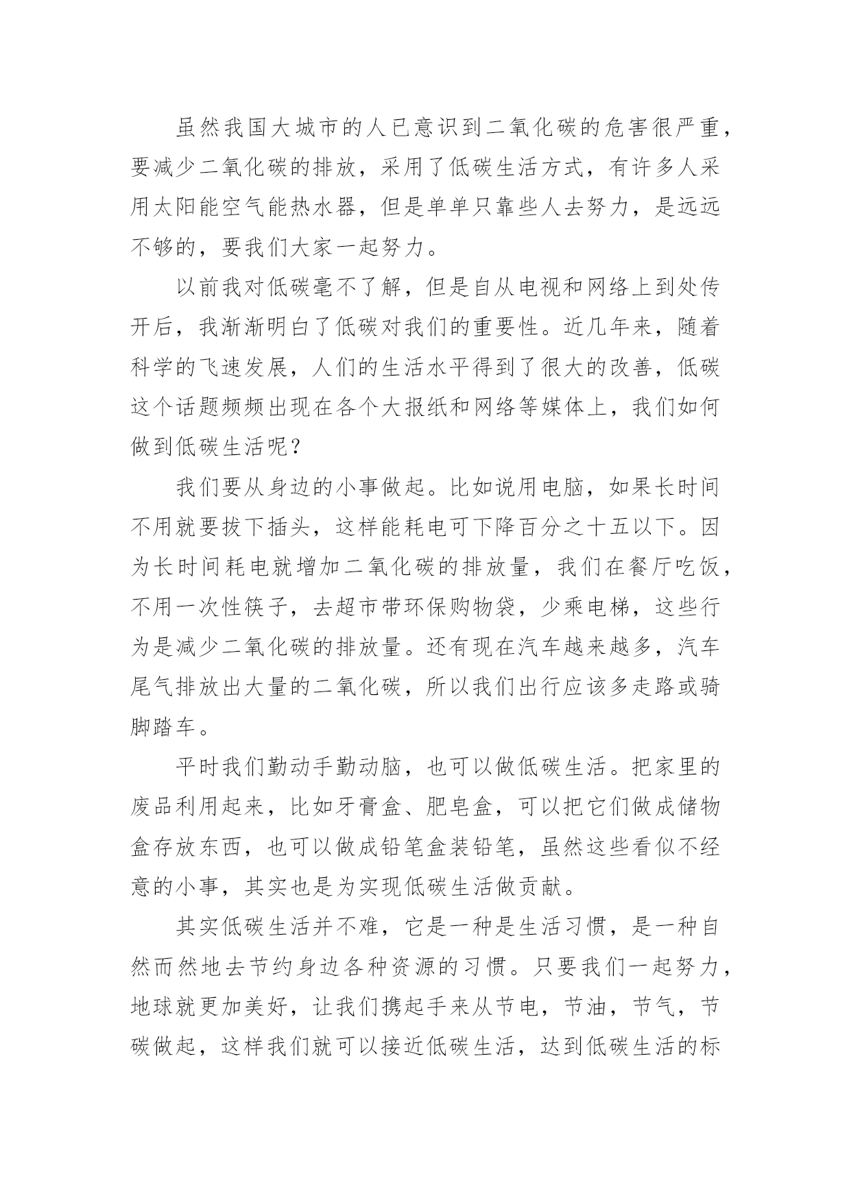 低碳生活的优秀作文低碳生活的优秀作文(精选32篇)在日常生活或是工作学习中,大家都有写作文的经历,对作文很是熟悉吧,作文可分为小学作文、中学作文、大学作文(论文)。还是对作文一筹莫展吗?下面是小编帮大家整理的低碳生活的优秀作文,仅供参考,希望能够帮助到大家。低碳生活的优秀作文篇1风萧萧,飘零了几许落叶。别了,在繁华的都市再难看见这般雅致的情景,我不愿去想象在之后的之后会呈现怎样的景象。只是还在期待梦想般的田园生活,已不至于在现实生活中找不到那样一片诗意的栖居地,我在心中构建一种生活方式——低碳生活。事物总有两个极端,在习惯了灯红酒绿的城市生活后,慢慢地,我们对节能环保的概念在潜移默化中淡了。放眼当今,在物质文明潮流的冲击下,在追求时尚科技的浪潮下,淡漠了一份对自然的关切,对于自然的保护举措还比较欠缺,然而我们总能凭借我们的主观意志加之以实际行动去改善它,用一种环保低碳的理念去营造那样的诗意的栖居地。雨纷飞,湮没了谁的昔日容颜;烟尘散落,让历史古韵更加沧桑。点点滴滴,岁岁年年,二氧化碳带来的温室效应,氮氧化合物的光化学污染,河流、空气等污染严重。绿意浅了,和着那些浓墨重彩的过往朝夕一同付诸东流,一步步,殆尽了昔日盛况。往昔,难念及,难回忆。我渴慕一种低碳的生活,不是仅存在于空旷的想象中,而是付诸于实施。在我们的日常生活中,主要是在两个方面相互联系着,即我周围事物方面与我周围事物之外方面。两方面相互结合共同作用,以低碳标准律己律人,在无意识形态中,长此以往,方可达到低碳环保效果。对于我们周围事物方面,宣传与实践相结合,不单单需要我们从我做起,在自己做好的基础上,以实际行动起表率作用,影响周围的人,带动共建环保和谐社会。关爱身边的一草一木,即爱我们自己的家园。越来越多的人踏上徒步一族,节能环保的自行车慢慢成为人们生活的主要工具;越来越多的人崇拜朴素的唯物主义,简朴为人,勤俭行事。对于在校学生,亦是有许多事我们能做到的,例如草稿纸的反复使用,书的多次利用,不铺张浪费,凡是从简等。我们各自更多以份对自然的关爱,就更多一股捍卫环保事业的力量,我们的家园,是我们所有人都共享的,我们携手共创、共赢如此和谐社会。还有一方面即远于我们周围事物之外的,但我们同样需要关注,那些以为远的其实如咫尺天涯般的近乎于我们。关注每一个细节,抓住每个发展点,创新思维,坚持环保理念,提出自己的想法,大胆实践。环保对于我们既是一种义务,也是一种责任。低碳生活的优秀作文篇2曾几何时,天空已不在蔚蓝;曾几何时,大片大片的森林已不复存在;曾几何时,我们在这高楼大厦中已见不到鸟儿的身影。想想吧,你何时看到飞鸟在天空中自由自在地扇动翅膀,又偶尔停在树上小憩一会儿,悠闲地梳理羽毛,还哼上几首小曲儿?你何时看到那美丽的夜晚,月亮洒下一片柔和,星星在向你调皮地眨着眼睛?你又何时看到河水有多么明净,多么清澈,多么透亮?答案是没有。没有!这不是世人们想象中的世外桃源,而是几百年前的事实!趵跃泉失去了以往老舍笔下的活力;黄河没有了昔日的威猛……难道我们口中的“高科技、发达”换来的就只是被污染的废气、肮脏的河水吗?为了保护地球的环境,我们要提倡低碳生活——节能、减排、低碳。早晨,阳光从窗子外照射进来。我在床上伸了个懒腰,起床了。我要开始我新的一日低碳生活。低碳一步曲:二次利用水我哼唱着歌,洗脸、刷牙。,把用过的水都倒入一个大铁桶李。“可别浪费了,这水留着还能冲厕所、浇花呢!这二次利用水可也算得上是低碳生活。”我嘀咕着。低碳二部曲:节约用电、用纸阳关充足,这好的天气根本就用不着开电灯做作业嘛!我把作业拿到阳台上。暖暖的阳光照在身上,真舒服呀!做完作业,我开始收拾我的书桌和抽屉,找到许多以前没有用完的本子,刚想扔了,但又转念一想:哎呀,扔掉太可惜了,不如留着做草稿本。节约用电、用水也是低碳生活的一种呀!想到这,我托着下巴,甜甜地笑了。低碳三部曲:减少废气的排放下午,爸爸妈妈说要带我出去玩,我高兴得一蹦三尺高。只听见爸爸说:“快准备一下,我去开汽车。”我一听可着急了,连忙对爸爸撒娇似的说:“爸爸,现在我们都要过低碳生活,汽车排出来的尾气多污染空气呀!我们要保护环境,坐公共汽车吧,走点路还能锻炼身体。”妈妈听了笑着摸了摸我的头,对爸爸说:“就听她的吧,这小机灵鬼说得还挺有道理。”“那好,我们坐公共汽车!”爸爸终于点点头,也妥协了。晚上睡觉时,我躺在床上,想着:如果人人每天都过低碳生活,那我们这个地球一定还是湛蓝的……·····低碳生活的优秀作文篇3以前,因为我胆小总是把夜灯开上个彻夜到明,洗手的时候图痛快水龙头开到最大……这样,既浪费水,又浪费电。现在,全世界都在宣传倡导低碳生活,我了解到低碳的生活方式,就是在生活的细节上注重节能减耗,就像中国环境科学学会秘书长任官平强调“节能就是最大的减碳。