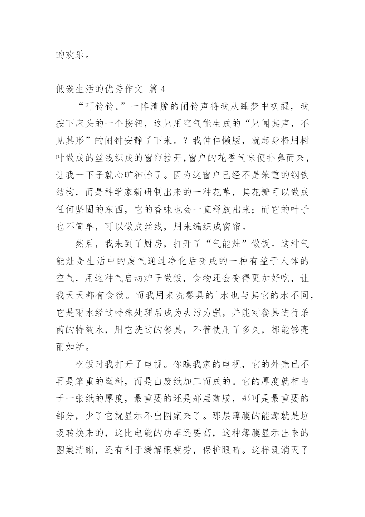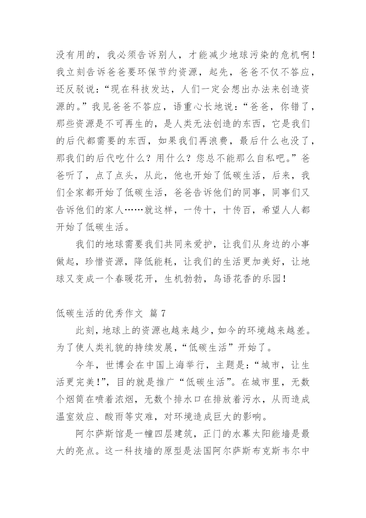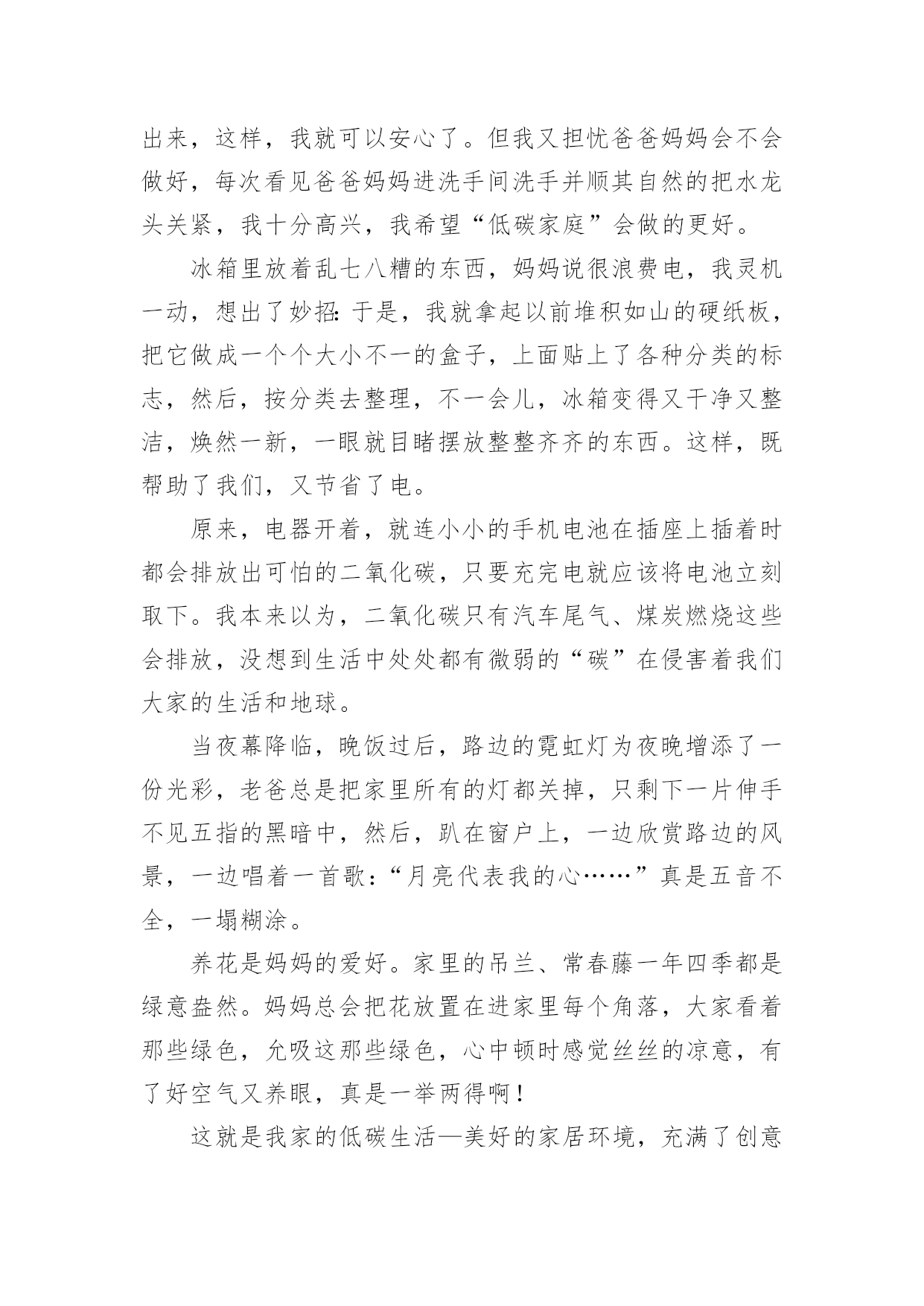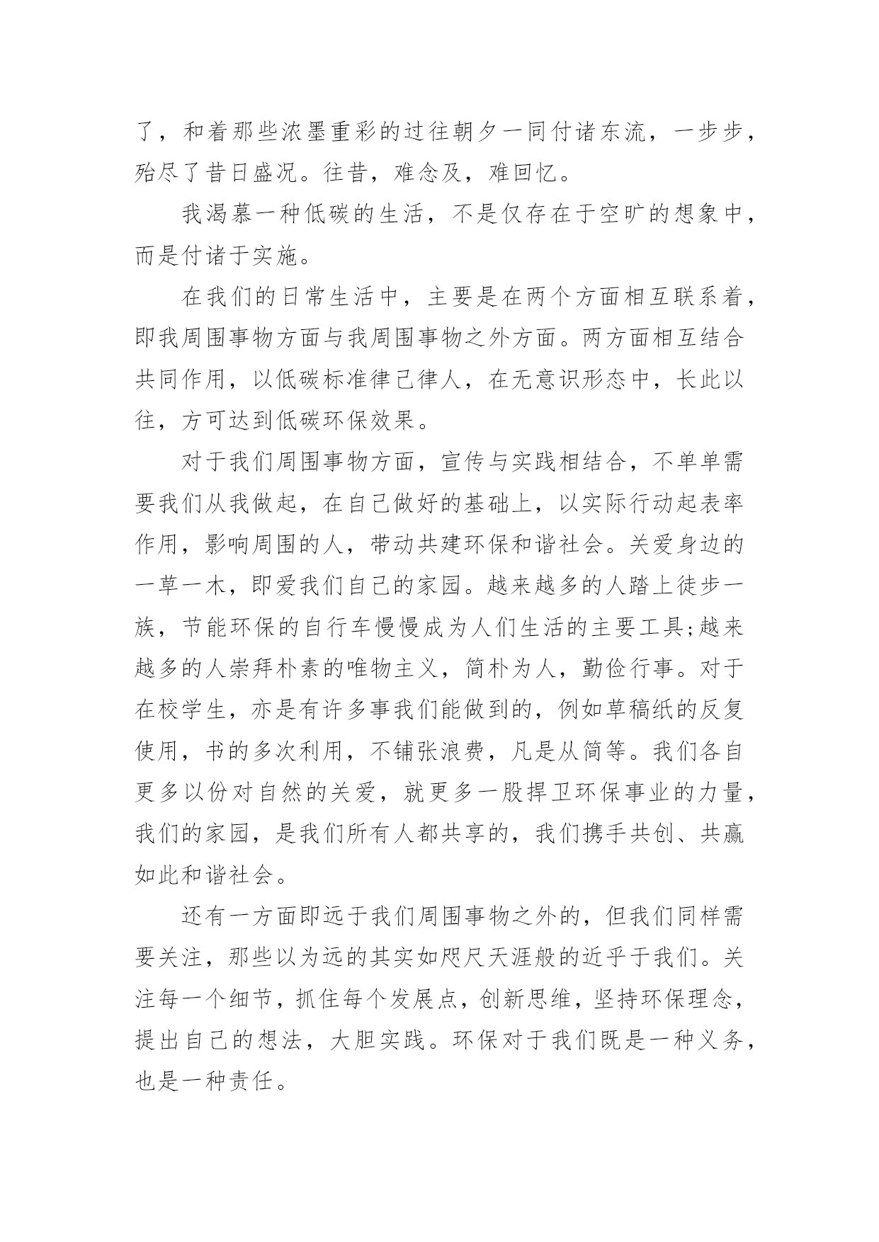 低碳生活的优秀作文低碳生活的优秀作文(精选32篇)在日常生活或是工作学习中,大家都有写作文的经历,对作文很是熟悉吧,作文可分为小学作文、中学作文、大学作文(论文)。还是对作文一筹莫展吗?下面是小编帮大家整理的低碳生活的优秀作文,仅供参考,希望能够帮助到大家。低碳生活的优秀作文篇1风萧萧,飘零了几许落叶。别了,在繁华的都市再难看见这般雅致的情景,我不愿去想象在之后的之后会呈现怎样的景象。只是还在期待梦想般的田园生活,已不至于在现实生活中找不到那样一片诗意的栖居地,我在心中构建一种生活方式——低碳生活。事物总有两个极端,在习惯了灯红酒绿的城市生活后,慢慢地,我们对节能环保的概念在潜移默化中淡了。放眼当今,在物质文明潮流的冲击下,在追求时尚科技的浪潮下,淡漠了一份对自然的关切,对于自然的保护举措还比较欠缺,然而我们总能凭借我们的主观意志加之以实际行动去改善它,用一种环保低碳的理念去营造那样的诗意的栖居地。雨纷飞,湮没了谁的昔日容颜;烟尘散落,让历史古韵更加沧桑。点点滴滴,岁岁年年,二氧化碳带来的温室效应,氮氧化合物的光化学污染,河流、空气等污染严重。绿意浅了,和着那些浓墨重彩的过往朝夕一同付诸东流,一步步,殆尽了昔日盛况。往昔,难念及,难回忆。我渴慕一种低碳的生活,不是仅存在于空旷的想象中,而是付诸于实施。在我们的日常生活中,主要是在两个方面相互联系着,即我周围事物方面与我周围事物之外方面。两方面相互结合共同作用,以低碳标准律己律人,在无意识形态中,长此以往,方可达到低碳环保效果。对于我们周围事物方面,宣传与实践相结合,不单单需要我们从我做起,在自己做好的基础上,以实际行动起表率作用,影响周围的人,带动共建环保和谐社会。关爱身边的一草一木,即爱我们自己的家园。越来越多的人踏上徒步一族,节能环保的自行车慢慢成为人们生活的主要工具;越来越多的人崇拜朴素的唯物主义,简朴为人,勤俭行事。对于在校学生,亦是有许多事我们能做到的,例如草稿纸的反复使用,书的多次利用,不铺张浪费,凡是从简等。我们各自更多以份对自然的关爱,就更多一股捍卫环保事业的力量,我们的家园,是我们所有人都共享的,我们携手共创、共赢如此和谐社会。还有一方面即远于我们周围事物之外的,但我们同样需要关注,那些以为远的其实如咫尺天涯般的近乎于我们。关注每一个细节,抓住每个发展点,创新思维,坚持环保理念,提出自己的想法,大胆实践。环保对于我们既是一种义务,也是一种责任。低碳生活的优秀作文篇2曾几何时,天空已不在蔚蓝;曾几何时,大片大片的森林已不复存在;曾几何时,我们在这高楼大厦中已见不到鸟儿的身影。想想吧,你何时看到飞鸟在天空中自由自在地扇动翅膀,又偶尔停在树上小憩一会儿,悠闲地梳理羽毛,还哼上几首小曲儿?你何时看到那美丽的夜晚,月亮洒下一片柔和,星星在向你调皮地眨着眼睛?你又何时看到河水有多么明净,多么清澈,多么透亮?答案是没有。没有!这不是世人们想象中的世外桃源,而是几百年前的事实!趵跃泉失去了以往老舍笔下的活力;黄河没有了昔日的威猛……难道我们口中的“高科技、发达”换来的就只是被污染的废气、肮脏的河水吗?为了保护地球的环境,我们要提倡低碳生活——节能、减排、低碳。早晨,阳光从窗子外照射进来。我在床上伸了个懒腰,起床了。我要开始我新的一日低碳生活。低碳一步曲:二次利用水我哼唱着歌,洗脸、刷牙。,把用过的水都倒入一个大铁桶李。“可别浪费了,这水留着还能冲厕所、浇花呢!这二次利用水可也算得上是低碳生活。”我嘀咕着。低碳二部曲:节约用电、用纸阳关充足,这好的天气根本就用不着开电灯做作业嘛!我把作业拿到阳台上。暖暖的阳光照在身上,真舒服呀!做完作业,我开始收拾我的书桌和抽屉,找到许多以前没有用完的本子,刚想扔了,但又转念一想:哎呀,扔掉太可惜了,不如留着做草稿本。节约用电、用水也是低碳生活的一种呀!想到这,我托着下巴,甜甜地笑了。低碳三部曲:减少废气的排放下午,爸爸妈妈说要带我出去玩,我高兴得一蹦三尺高。只听见爸爸说:“快准备一下,我去开汽车。”我一听可着急了,连忙对爸爸撒娇似的说:“爸爸,现在我们都要过低碳生活,汽车排出来的尾气多污染空气呀!我们要保护环境,坐公共汽车吧,走点路还能锻炼身体。”妈妈听了笑着摸了摸我的头,对爸爸说:“就听她的吧,这小机灵鬼说得还挺有道理。”“那好,我们坐公共汽车!”爸爸终于点点头,也妥协了。晚上睡觉时,我躺在床上,想着:如果人人每天都过低碳生活,那我们这个地球一定还是湛蓝的……·····低碳生活的优秀作文篇3以前,因为我胆小总是把夜灯开上个彻夜到明,洗手的时候图痛快水龙头开到最大……这样,既浪费水,又浪费电。现在,全世界都在宣传倡导低碳生活,我了解到低碳的生活方式,就是在生活的细节上注重节能减耗,就像中国环境科学学会秘书长任官平强调“节能就是最大的减碳。