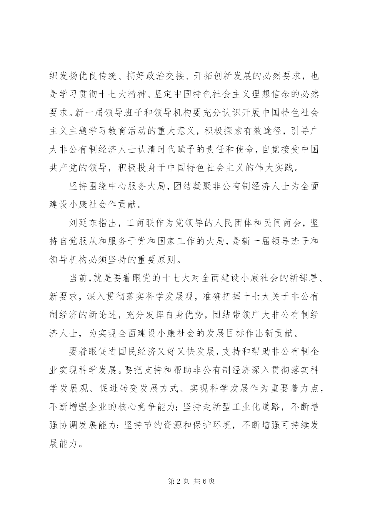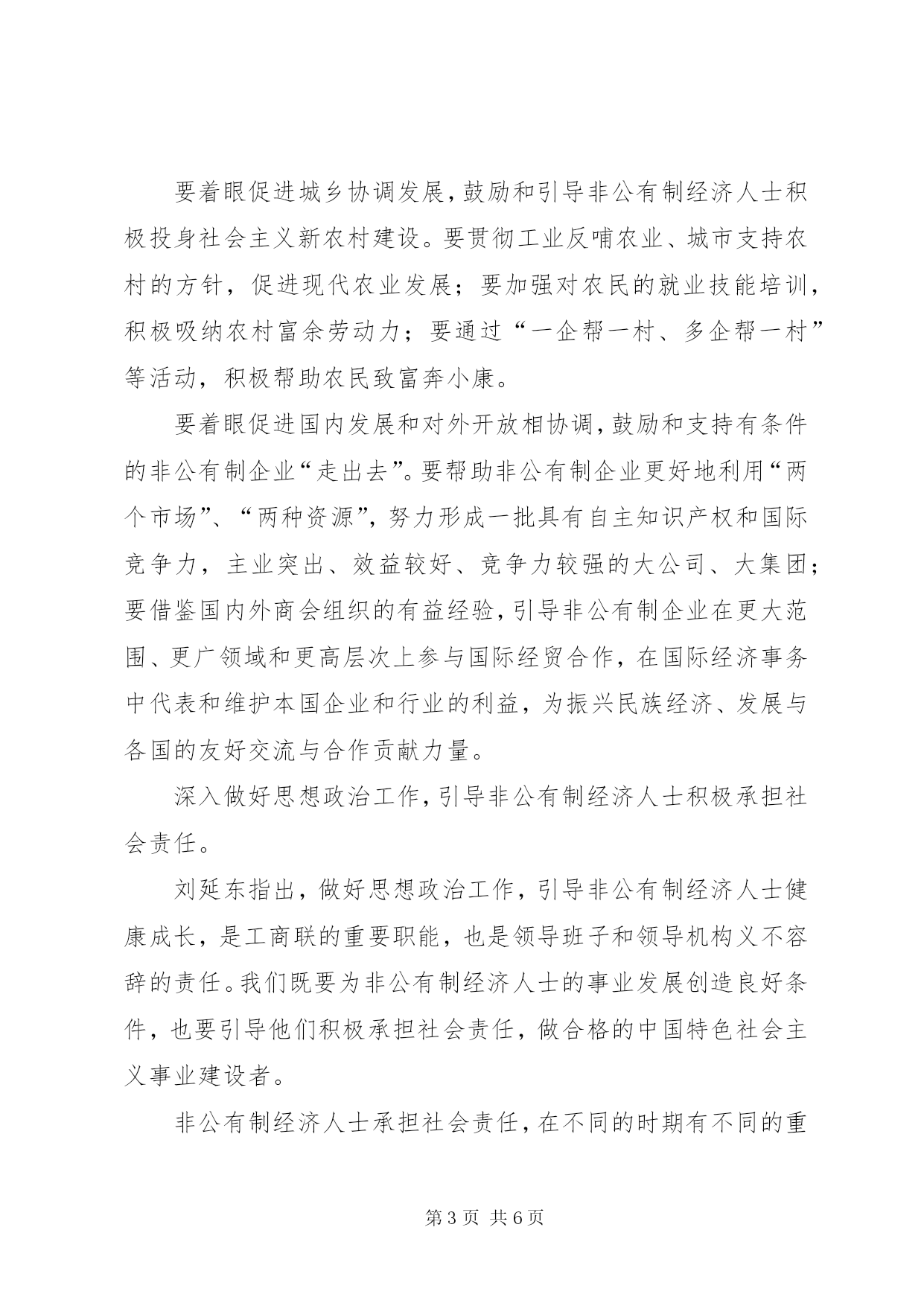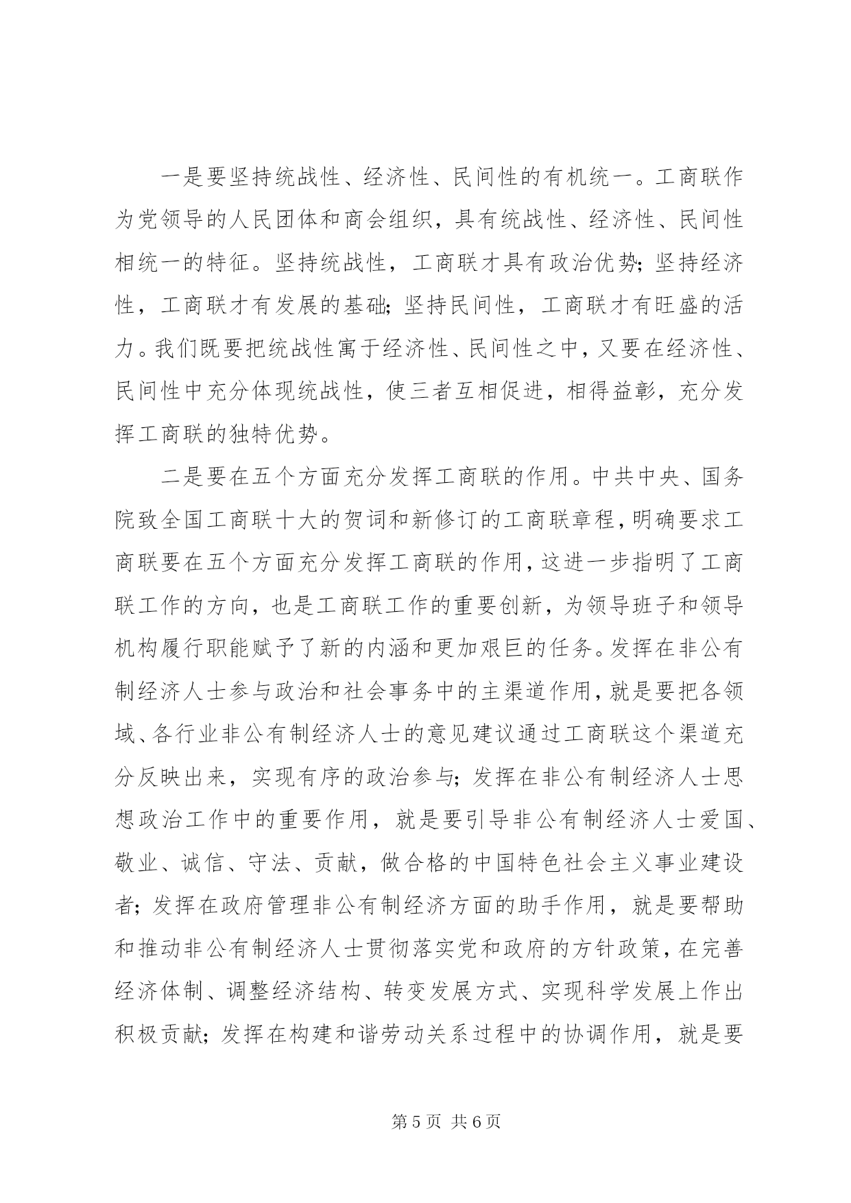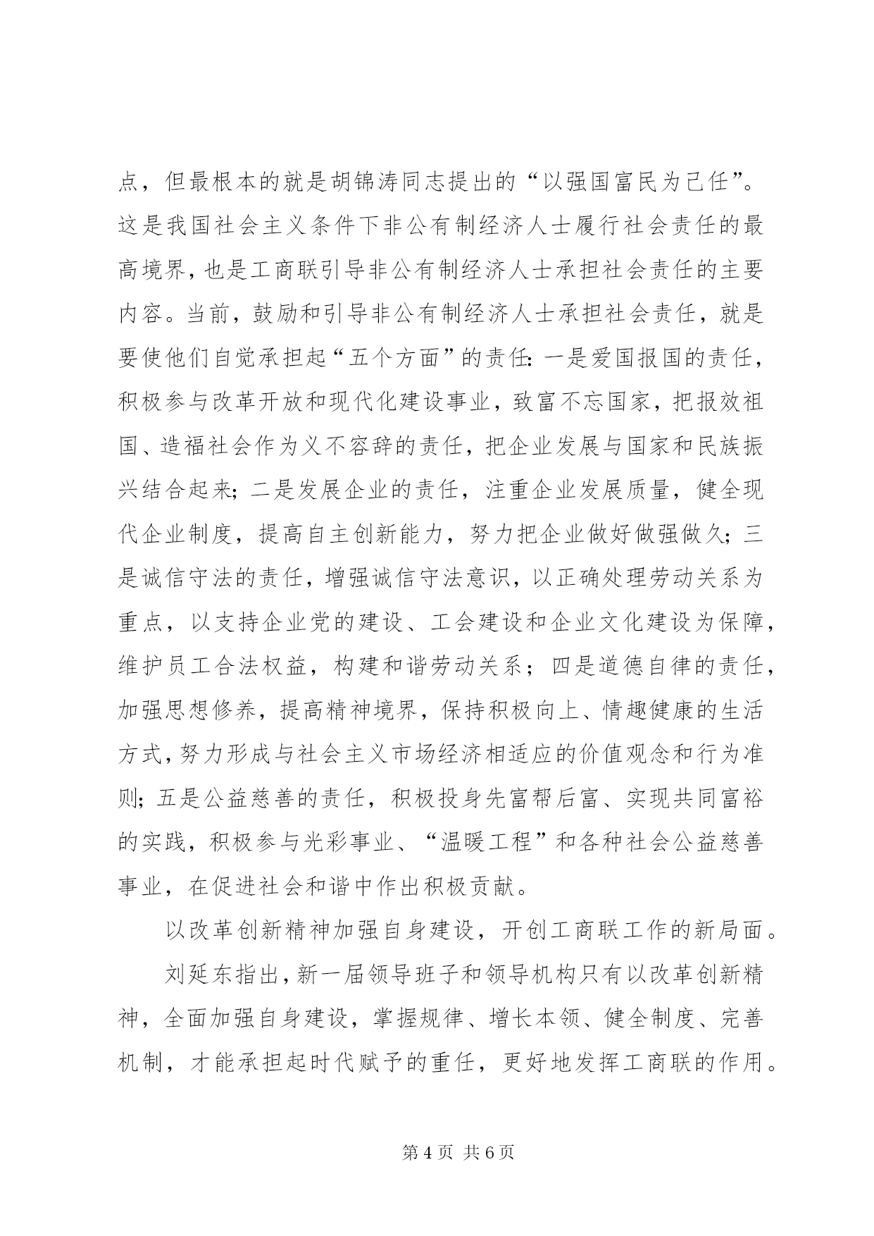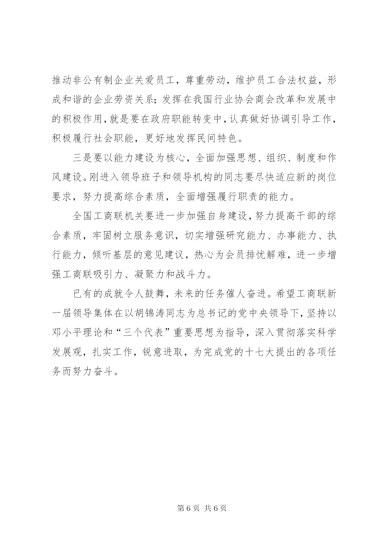 第PAGE\*Arabic\*MERGEFORMAT6页共NUMPAGES\*MERGEFORMAT6页工商联新局面会议致辞中共中央政治局委员、全国政协副主席、中共中央统战部部长刘延东在全国工商联十届一次执委会闭幕会上指出,当前,国际形势正在发生广泛而深刻的变化,我国社会也在发生广泛而深刻的变革。党的十七大适应国内外形势的新变化,顺应各族人民过上更好生活的新期待,明确了实现全面建设小康社会奋斗目标的新要求,对我国经济建设、政治建设、文化建设、社会建设和党的建设做出了新部署。这些既使工商联的舞台更加广阔、任务更加繁重、使命更加光荣,也对工商联领导班子和领导机构更好地履行职责提出了新的更高的要求。深入学习贯彻十七大精神,坚定不移地走中国特色社会主义伟大道路。刘延东指出,要把学习贯彻十七大精神作为新一届领导班子和领导机构当前的首要政治任务。中国特色社会主义是十七大的主题和灵魂,是马克思主义中国化的最重要成果。我们要努力学习和领会中国特色社会主义理论体系的精神实质,坚持用其基本立场、观点和方法来认识和看待我国改革发展进程中的问题,进一步增强走中国特色社会主义道路的自觉性和坚定性,团结引导广大非公有制经济人士为推进中国特色社会主义伟大事业作出新贡献。开展中国特色社会主义主题学习教育活动,是各级工商联组织发扬优良传统、搞好政治交接、开拓创新发展的必然要求,也是学习贯彻十七大精神、坚定中国特色社会主义理想信念的必然要求。新一届领导班子和领导机构要充分认识开展中国特色社会主义主题学习教育活动的重大意义,积极探索有效途径,引导广大非公有制经济人士认清时代赋予的责任和使命,自觉接受中国共产党的领导,积极投身于中国特色社会主义的伟大实践。坚持围绕中心服务大局,团结凝聚非公有制经济人士为全面建设小康社会作贡献。刘延东指出,工商联作为党领导的人民团体和民间商会,坚持自觉服从和服务于党和国家工作的大局,是新一届领导班子和领导机构必须坚持的重要原则。当前,就是要着眼党的十七大对全面建设小康社会的新部署、新要求,深入贯彻落实科学发展观,准确把握十七大关于非公有制经济的新论述,充分发挥自身优势,团结带领广大非公有制经济人士,为实现全面建设小康社会的发展目标作出新贡献。要着眼促进国民经济又好又快发展,支持和帮助非公有制企业实现科学发展。要把支持和帮助非公有制经济深入贯彻落实科学发展观、促进转变发展方式、实现科学发展作为重要着力点,不断增强企业的核心竞争能力;坚持走新型工业化道路,不断增强协调发展能力;坚持节约资源和保护环境,不断增强可持续发展能力。要着眼促进城乡协调发展,鼓励和引导非公有制经济人士积极投身社会主义新农村建设。要贯彻工业反哺农业、城市支持农村的方针,促进现代农业发展;要加强对农民的就业技能培训,积极吸纳农村富余劳动力;要通过“一企帮一村、多企帮一村”等活动,积极帮助农民致富奔小康。要着眼促进国内发展和对外开放相协调,鼓励和支持有条件的非公有制企业“走出去”。要帮助非公有制企业更好地利用“两个市场”、“两种资源”,努力形成一批具有自主知识产权和国际竞争力,主业突出、效益较好、竞争力较强的大公司、大集团;要借鉴国内外商会组织的有益经验,引导非公有制企业在更大范围、更广领域和更高层次上参与国际经贸合作,在国际经济事务中代表和维护本国企业和行业的利益,为振兴民族经济、发展与各国的友好交流与合作贡献力量。深入做好思想政治工作,引导非公有制经济人士积极承担社会责任。刘延东指出,做好思想政治工作,引导非公有制经济人士健康成长,是工商联的重要职能,也是领导班子和领导机构义不容辞的责任。我们既要为非公有制经济人士的事业发展创造良好条件,也要引导他们积极承担社会责任,做合格的中国特色社会主义事业建设者。非公有制经济人士承担社会责任,在不同的时期有不同的重点,但最根本的就是胡锦涛同志提出的“以强国富民为己任”。这是我国社会主义条件下非公有制经济人士履行社会责任的最高境界,也是工商联引导非公有制经济人士承担社会责任的主要内容。当前,鼓励和引导非公有制经济人士承担社会责任,就是要使他们自觉承担起“五个方面”的责任:一是爱国报国的责任,积极参与改革开放和现代化建设事业,致富不忘国家,把报效祖国、造福社会作为义不容辞的责任,把企业发展与国家和民族振兴结合起来;二是发展企业的责任,注重企业发展质量,健全现代企业制度,提高自主创新能力,努力把企业做好做强做久;三是诚信守法的责任,增强诚信守法意识,以正确处理劳动关系为重点,以支持企业党的建设、工会建设和企业文化建设为保障,维护员工合法权益,构建和谐劳动关系;四是道德自律的责任,加强思想修养,提高精神境界,保持积极向上、情趣健康的生活方式,努力形成与社会主义市场经济相适应的价值观念和行为准则;五是公益慈善的责