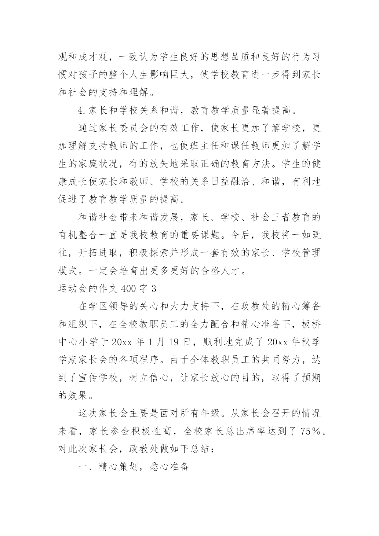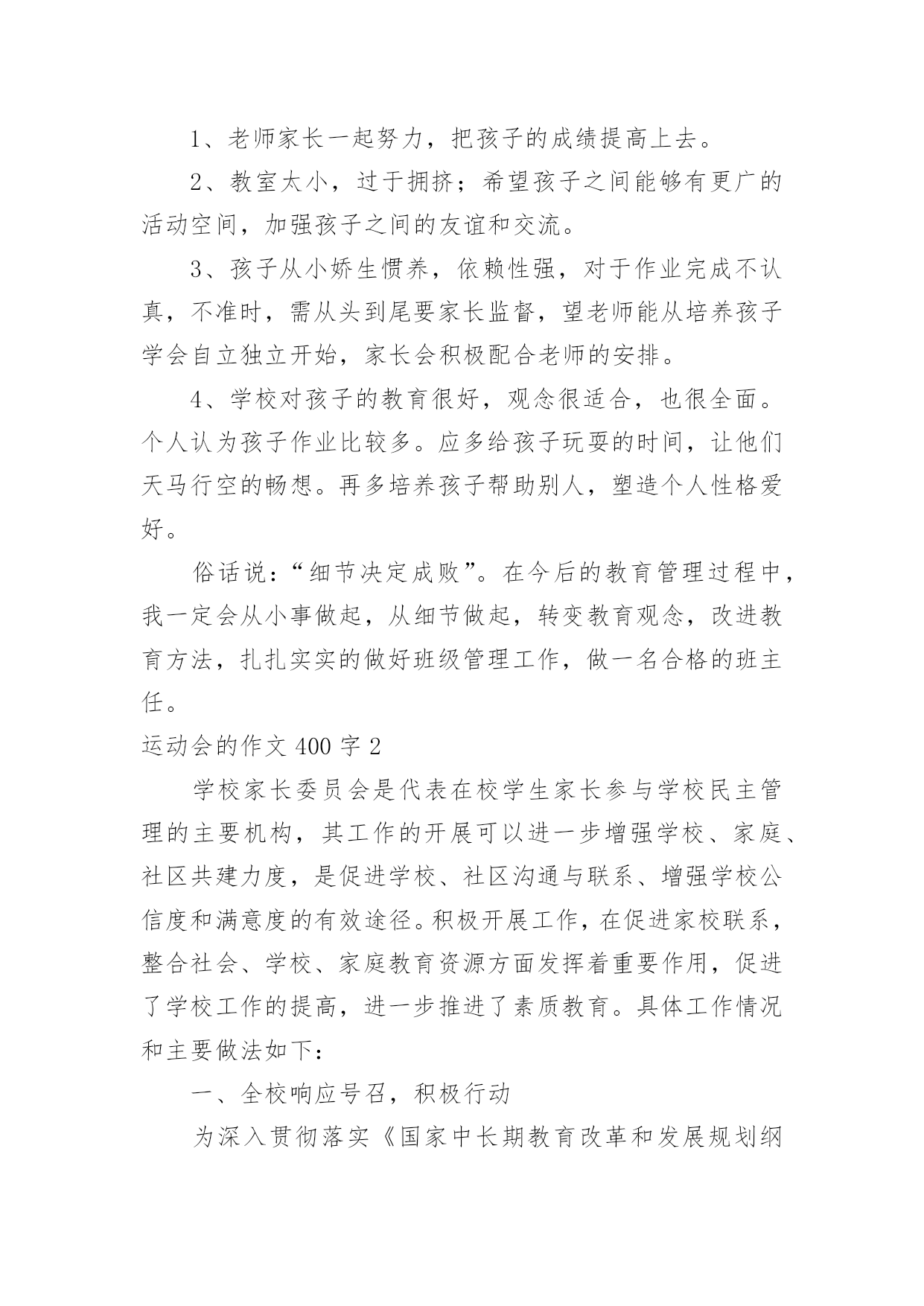 运动会的作文400字(推荐)运动会的作文400字在生活、工作和学习中,大家都不可避免地要接触到作文吧,写作文可以锻炼我们的独处习惯,让自己的心静下来,思考自己未来的方向。如何写一篇有思想、有文采的作文呢?下面是小编精心整理的运动会的作文400字,希望能够帮助到大家。运动会的作文400字1一、基本情况5月19日下午3:30,我校举行了学生家长会。在全体班主任、任课老师和学校行政、全体教师的共同努力下,圆满完成预定工作目标。在这次家长会上,我们班共有40名家长参加家长会,其中5位同学的家长未到。在会上,我详细介绍了班级的整体情况,对班级中学生的纪律、卫生、学习、安全等方面都依次归类,把每个学生的表现都向家长一一做了汇报,指出了优点和不足,让每位家长能对自己孩子的情况有所掌握。还针对学校的安排和班级的管理情况,从学校有关规章制度、班级常规、安全以及学生习惯的培养等方面向家长做了详细的要求和说明,同时总结了自己班级工作的优点和不足。最后,为了更好地促进家校联系,更好地教育好孩子,我对家长提出了一些建议,通过这些建议,尽量使家庭教育和学校教育保持一致同时也有利于学生的全面健康发展。在家长交流教育孩子的成功经验时,有家长这样说道:感谢老师,让我认识了这么多学生家长,听了他们教育、培养孩子的方法后,使我认识了差距,明白了更多教育孩子的方式和方法,为培养孩子成为有用的'人而努力。二、收获:1、家庭教育是学生教育中不可忽视的部分,通过与家长的交流与沟通,达成共识。通过家长会,加强了教育的合力,为以后的学生教育工作打下了好基础。2、通过家长会的成功举行,使家长们更深刻地认识到学校的严格管理和对学生的严格要求,同时在家庭教育中给予支持和配合。三、反思通过这次家长会与家长的交流,在今后的工作中我还要努力做到以下几点:1、在今后的班主任工作中,要经常和家长联系。要关注尖子生和后进生,同时也要带动中间生,要克服以往单纯关注后进生的做法,让每一个孩子都能感觉到老师最关心自己,让每一个家长都能感觉到老师最关注自己的孩子。这一点需要班主任更耐心细致地管理工作,需要更和谐、民主的管理氛围,需要班主任更先进、更有层次的虚心学习。2、要更多地了解学生的思想状况,了解学生之间发生的矛盾,及时帮助学生解决思想上的包袱。三、建议1、老师家长一起努力,把孩子的成绩提高上去。2、教室太小,过于拥挤;希望孩子之间能够有更广的活动空间,加强孩子之间的友谊和交流。3、孩子从小娇生惯养,依赖性强,对于作业完成不认真,不准时,需从头到尾要家长监督,望老师能从培养孩子学会自立独立开始,家长会积极配合老师的安排。4、学校对孩子的教育很好,观念很适合,也很全面。个人认为孩子作业比较多。应多给孩子玩耍的时间,让他们天马行空的畅想。再多培养孩子帮助别人,塑造个人性格爱好。俗话说:“细节决定成败”。在今后的教育管理过程中,我一定会从小事做起,从细节做起,转变教育观念,改进教育方法,扎扎实实的做好班级管理工作,做一名合格的班主任。运动会的作文400字2学校家长委员会是代表在校学生家长参与学校民主管理的主要机构,其工作的开展可以进一步增强学校、家庭、社区共建力度,是促进学校、社区沟通与联系、增强学校公信度和满意度的有效途径。积极开展工作,在促进家校联系,整合社会、学校、家庭教育资源方面发挥着重要作用,促进了学校工作的提高,进一步推进了素质教育。具体工作情况和主要做法如下:一、全校响应号召,积极行动为深入贯彻落实《国家中长期教育改革和发展规划纲要》,落实《中共中央国务院关于进一步深化教育改革大力推进素质教育的决定》、《中共中央国务院关于进一步加强和改进未成年人思想道德建设的若干意见》充分发挥家庭、社会在学校教育中的作用,实现学校教育、家庭教育和社会教育的有机结合,从而有利于全面推进素质教育,我校保障家长委员会工作的顺利开展。二、加强学习,活动多样结合学校实际需要,学校家长委员会认真组织,有计划地开展了多种辅助活动,满足了家长的愿望。1.适时召开家长会。开学第一周,及时召开了家长会,就学生阶段性学习及表现等方面向家长汇报,与家长沟通,和孩子共同找差距,帮助孩子共同进步。2.定期召开经验交流会。通过家长典型的现身说法,更好地指导家庭教育,把从家长学校学来的理论知识与家庭教育的实际有机地结合起来。3.适时进行家访。家访是对家庭进行个别指导的一种有效的形式,我校要求每位班主任认真主动地和家长沟通,采取家访、校访电话联系等方式,深入学生家庭,特别是单亲家庭、寄养家庭、待进或学习困难学生家庭要给予有效的指导。教师通过沟通,不仅掌握了大量的第一手材料,有效地加强了学生思想和心理方面的教育,而且与家长之间建立起了一种牢固的信任关系。这种关系的建立使学生在心目中对教师产生了一种亲情,缩短了师生之间的心理距离,有助于强