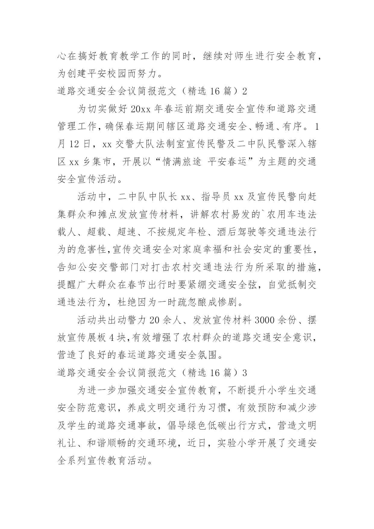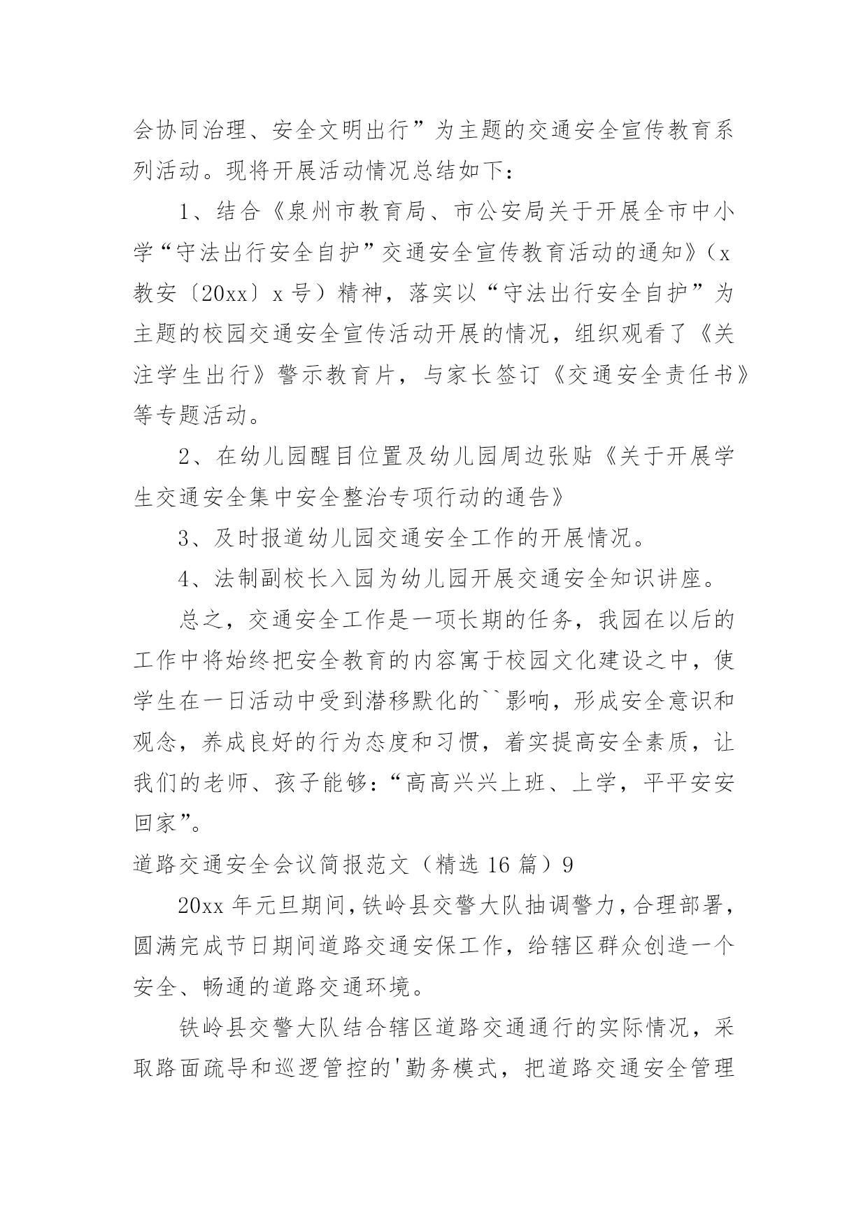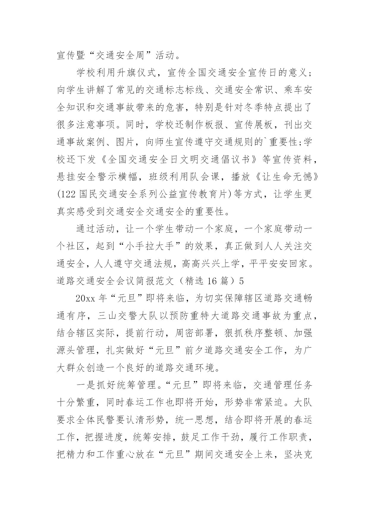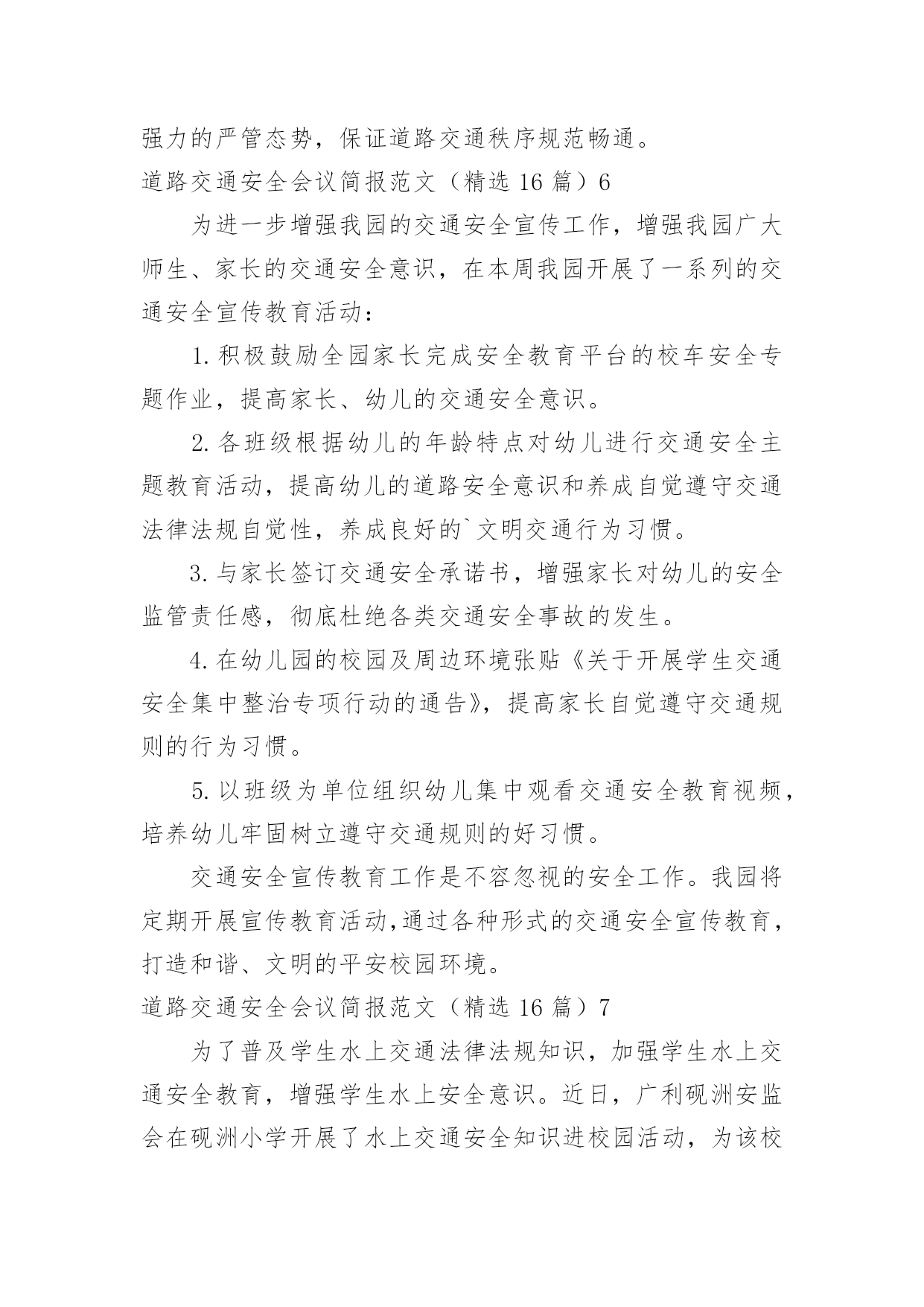 道路交通安全会议简报道路交通安全会议简报范文(精选16篇)在快速变化和不断变革的新时代,简报使用的情况越来越多,简报作为加强领导和推动工作的重要工具,内容必须保证绝对真实、准确。还苦于找不到好的简报?以下是小编为大家整理的道路交通安全会议简报范文(精选16篇),仅供参考,大家一起来看看吧。道路交通安全会议简报范文(精选16篇)1今年12月2日是“全国交通安全日”,九江市鹤湖学校一直以来重视学校的安全工作,特别是交通安全教育,为了学生的健康发展,减少交通意外伤害事故,提高安全防范意识,创造“人人讲安全,人人受教育”的良好氛围,提高全校师生的交通安全素养和自我保护能力,增强家长的文明交通意识。29日上午,该校联合九江市交警二大队开展了“社会协同治理,安全文明出行”为主题的`交通安全宣传教育活动。同学们在交警叔叔的带领下,认识交通安全标志,学做交通指挥手势操,开展道路交通体验活动,学习交通安全知识。通过给学生上一堂交通安全教育课,使同学们时刻注意交通安全,做到知法守法,确保安全,避免事故发生。此次“交通安全日”活动,强化了学生们的安全意识,增强了自我防范能力,提高了交通法制观念,今后,该校决心在搞好教育教学工作的同时,继续对师生进行安全教育,为创建平安校园而努力。道路交通安全会议简报范文(精选16篇)2为切实做好20xx年春运前期交通安全宣传和道路交通管理工作,确保春运期间辖区道路交通安全、畅通、有序。1月12日,xx交警大队法制室宣传民警及二中队民警深入辖区xx乡集市,开展以“情满旅途平安春运”为主题的交通安全宣传活动。活动中,二中队中队长xx、指导员xx及宣传民警向赶集群众和摊点发放宣传材料,讲解农村易发的`农用车违法载人、超载、超速、不按规定年检、酒后驾驶等交通违法行为的危害性,宣传交通安全对家庭幸福和社会安定的重要性,告知公安交警部门对打击农村交通违法行为所采取的措施,提醒广大群众在春节出行时要紧绷交通安全弦,自觉抵制交通违法行为,杜绝因为一时疏忽酿成惨剧。活动共出动警力20余人、发放宣传材料3000余份、摆放宣传展板4块,有效增强了农村群众的道路交通安全意识,营造了良好的春运道路交通安全氛围。道路交通安全会议简报范文(精选16篇)3为进一步加强交通安全宣传教育,不断提升小学生交通安全防范意识,养成文明交通行为习惯,有效预防和减少涉及学生的道路交通事故,倡导绿色低碳出行方式,营造文明礼让、和谐顺畅的交通环境,近日,实验小学开展了交通安全系列宣传教育活动。实验小学通过国旗下讲话、宣传窗等开展形式多样、内容丰富的'系列主题教育活动,邀请交警城区中队的警官开展交通安全知识进校园活动,发放交通安全知识宣传册,宣讲《道路交通安全法》,具体指导学生怎样走路、乘车、过路口,切实提升了小学生交通安全素质。发挥“小手拉大手”的辐射带动作用,鼓励学生不仅要做文明交通的实践者,还要努力当好宣传员,用自己学到的知识对家长、亲朋好友进行交通安全提醒,共同拒绝交通违法行为,做到安全文明出行。实验小学通过微信向家长宣传学校在交通安全方面需要家长配合的举措,倡导家长主动遵守交通法规,安全出行、文明出行、绿色出行。充分发挥教职员工文明出行模范带头作用,大力倡导教职员工文明出行、步行、乘坐公共交通、自行车出行。切实把体验式教育融入于社会课堂,让每个学生掌握候车、行走、过马路、上下车、乘车等交通参与的注意事项和要求,深刻领会遵守交通法规的重要性和必要性,增强安全意识,提高自我防范能力和危险情况下的自救能力,从源头上减少交通乱象发生,共同创造良好交通秩序。道路交通安全会议简报范文(精选16篇)420xx年12月2日是我国第xx个“全国交通安全日”,为进一步提高广大师生的交通安全意识和交通文明意识,最大限度地预防和减少冬季道路交通事故发生,11月23—12月6日,xx县xx中心小学开展了“全国交通安全宣传日”宣传暨“交通安全周”活动。学校利用升旗仪式,宣传全国交通安全宣传日的意义;向学生讲解了常见的交通标志标线、交通安全常识、乘车安全知识和交通事故带来的危害,特别是针对冬季特点提出了很多注意事项。同时,学校还制作板报、宣传展板,刊出交通事故案例、图片,向师生宣传遵守交通规则的`重要性;学校还下发《全国交通安全日文明交通倡议书》等宣传资料,悬挂安全警示横幅,班级利用队会课,播放《让生命无憾》(122国民交通安全系列公益宣传教育片)等方式,让学生更真实感受到交通安全交通安全的重要性。通过活动,让一个学生带动一个家庭,一个家庭带动一个社区,起到“小手拉大手”的效果,真正做到人人关注交通安全,人人遵守交通法规,高高兴兴上学,平平安安回家。道路交通安全会议简报范文(精选16篇)520xx年“元旦”即将来临,为切实保障辖区道路交通畅通有序,三山交警大队以预防重特大道路交通事