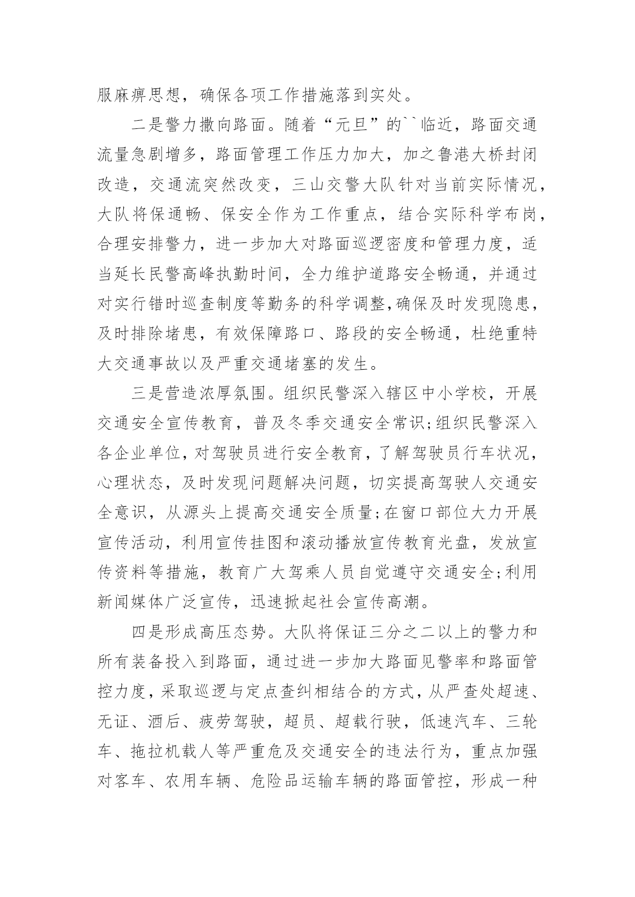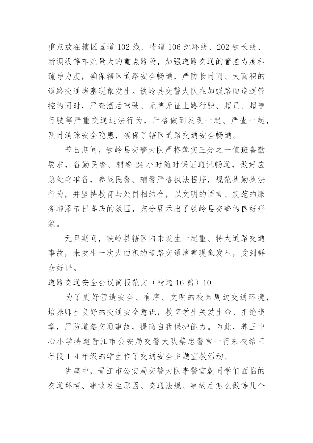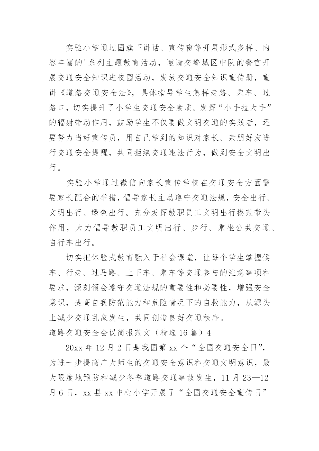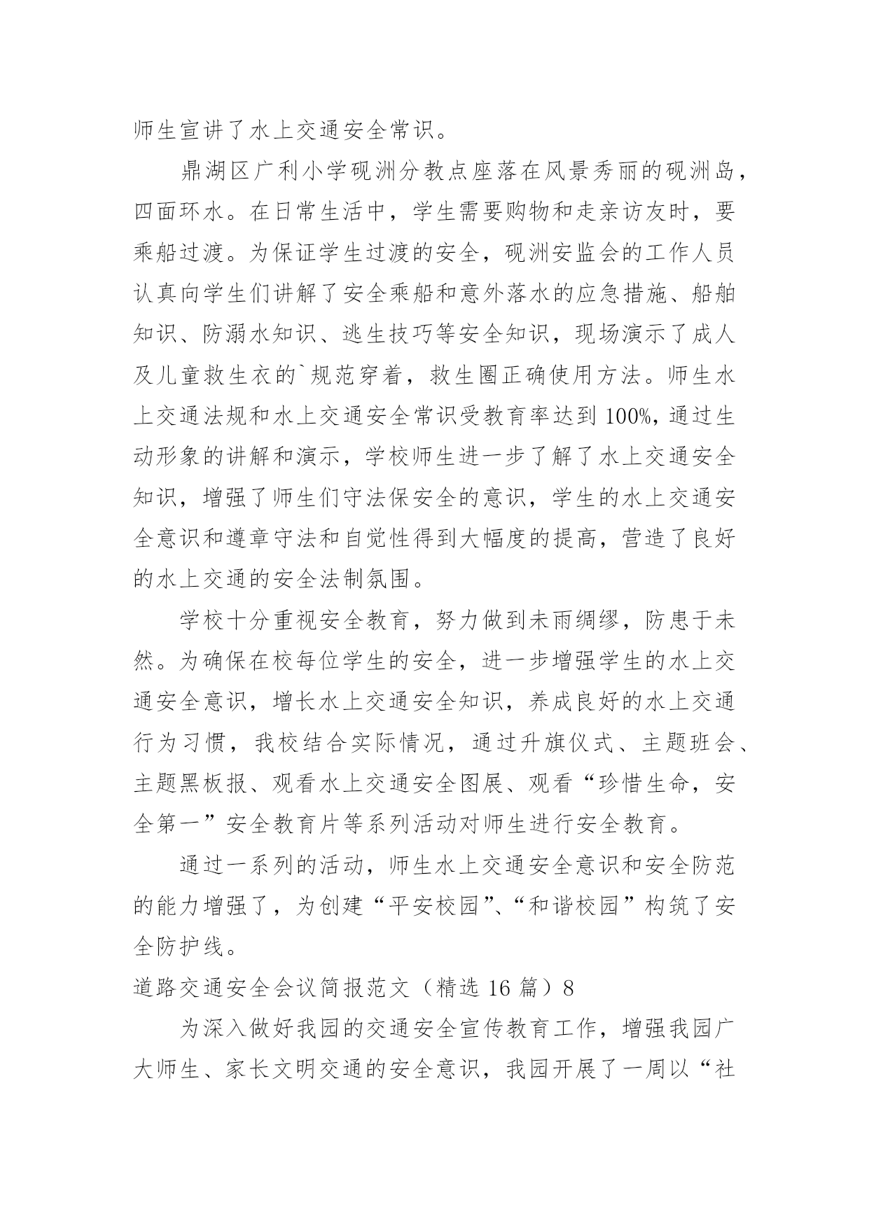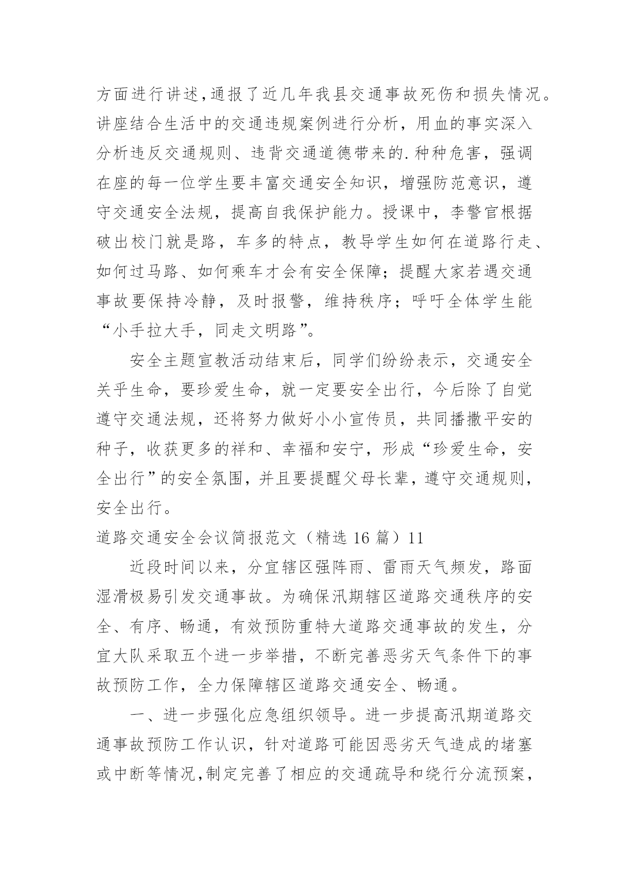 道路交通安全会议简报道路交通安全会议简报范文(精选16篇)在快速变化和不断变革的新时代,简报使用的情况越来越多,简报作为加强领导和推动工作的重要工具,内容必须保证绝对真实、准确。还苦于找不到好的简报?以下是小编为大家整理的道路交通安全会议简报范文(精选16篇),仅供参考,大家一起来看看吧。道路交通安全会议简报范文(精选16篇)1今年12月2日是“全国交通安全日”,九江市鹤湖学校一直以来重视学校的安全工作,特别是交通安全教育,为了学生的健康发展,减少交通意外伤害事故,提高安全防范意识,创造“人人讲安全,人人受教育”的良好氛围,提高全校师生的交通安全素养和自我保护能力,增强家长的文明交通意识。29日上午,该校联合九江市交警二大队开展了“社会协同治理,安全文明出行”为主题的`交通安全宣传教育活动。同学们在交警叔叔的带领下,认识交通安全标志,学做交通指挥手势操,开展道路交通体验活动,学习交通安全知识。通过给学生上一堂交通安全教育课,使同学们时刻注意交通安全,做到知法守法,确保安全,避免事故发生。此次“交通安全日”活动,强化了学生们的安全意识,增强了自我防范能力,提高了交通法制观念,今后,该校决心在搞好教育教学工作的同时,继续对师生进行安全教育,为创建平安校园而努力。道路交通安全会议简报范文(精选16篇)2为切实做好20xx年春运前期交通安全宣传和道路交通管理工作,确保春运期间辖区道路交通安全、畅通、有序。1月12日,xx交警大队法制室宣传民警及二中队民警深入辖区xx乡集市,开展以“情满旅途平安春运”为主题的交通安全宣传活动。活动中,二中队中队长xx、指导员xx及宣传民警向赶集群众和摊点发放宣传材料,讲解农村易发的`农用车违法载人、超载、超速、不按规定年检、酒后驾驶等交通违法行为的危害性,宣传交通安全对家庭幸福和社会安定的重要性,告知公安交警部门对打击农村交通违法行为所采取的措施,提醒广大群众在春节出行时要紧绷交通安全弦,自觉抵制交通违法行为,杜绝因为一时疏忽酿成惨剧。活动共出动警力20余人、发放宣传材料3000余份、摆放宣传展板4块,有效增强了农村群众的道路交通安全意识,营造了良好的春运道路交通安全氛围。道路交通安全会议简报范文(精选16篇)3为进一步加强交通安全宣传教育,不断提升小学生交通安全防范意识,养成文明交通行为习惯,有效预防和减少涉及学生的道路交通事故,倡导绿色低碳出行方式,营造文明礼让、和谐顺畅的交通环境,近日,实验小学开展了交通安全系列宣传教育活动。实验小学通过国旗下讲话、宣传窗等开展形式多样、内容丰富的'系列主题教育活动,邀请交警城区中队的警官开展交通安全知识进校园活动,发放交通安全知识宣传册,宣讲《道路交通安全法》,具体指导学生怎样走路、乘车、过路口,切实提升了小学生交通安全素质。发挥“小手拉大手”的辐射带动作用,鼓励学生不仅要做文明交通的实践者,还要努力当好宣传员,用自己学到的知识对家长、亲朋好友进行交通安全提醒,共同拒绝交通违法行为,做到安全文明出行。实验小学通过微信向家长宣传学校在交通安全方面需要家长配合的举措,倡导家长主动遵守交通法规,安全出行、文明出行、绿色出行。充分发挥教职员工文明出行模范带头作用,大力倡导教职员工文明出行、步行、乘坐公共交通、自行车出行。切实把体验式教育融入于社会课堂,让每个学生掌握候车、行走、过马路、上下车、乘车等交通参与的注意事项和要求,深刻领会遵守交通法规的重要性和必要性,增强安全意识,提高自我防范能力和危险情况下的自救能力,从源头上减少交通乱象发生,共同创造良好交通秩序。道路交通安全会议简报范文(精选16篇)420xx年12月2日是我国第xx个“全国交通安全日”,为进一步提高广大师生的交通安全意识和交通文明意识,最大限度地预防和减少冬季道路交通事故发生,11月23—12月6日,xx县xx中心小学开展了“全国交通安全宣传日”宣传暨“交通安全周”活动。学校利用升旗仪式,宣传全国交通安全宣传日的意义;向学生讲解了常见的交通标志标线、交通安全常识、乘车安全知识和交通事故带来的危害,特别是针对冬季特点提出了很多注意事项。同时,学校还制作板报、宣传展板,刊出交通事故案例、图片,向师生宣传遵守交通规则的`重要性;学校还下发《全国交通安全日文明交通倡议书》等宣传资料,悬挂安全警示横幅,班级利用队会课,播放《让生命无憾》(122国民交通安全系列公益宣传教育片)等方式,让学生更真实感受到交通安全交通安全的重要性。通过活动,让一个学生带动一个家庭,一个家庭带动一个社区,起到“小手拉大手”的效果,真正做到人人关注交通安全,人人遵守交通法规,高高兴兴上学,平平安安回家。道路交通安全会议简报范文(精选16篇)520xx年“元旦”即将来临,为切实保障辖区道路交通畅通有序,三山交警大队以预防重特大道路交通事