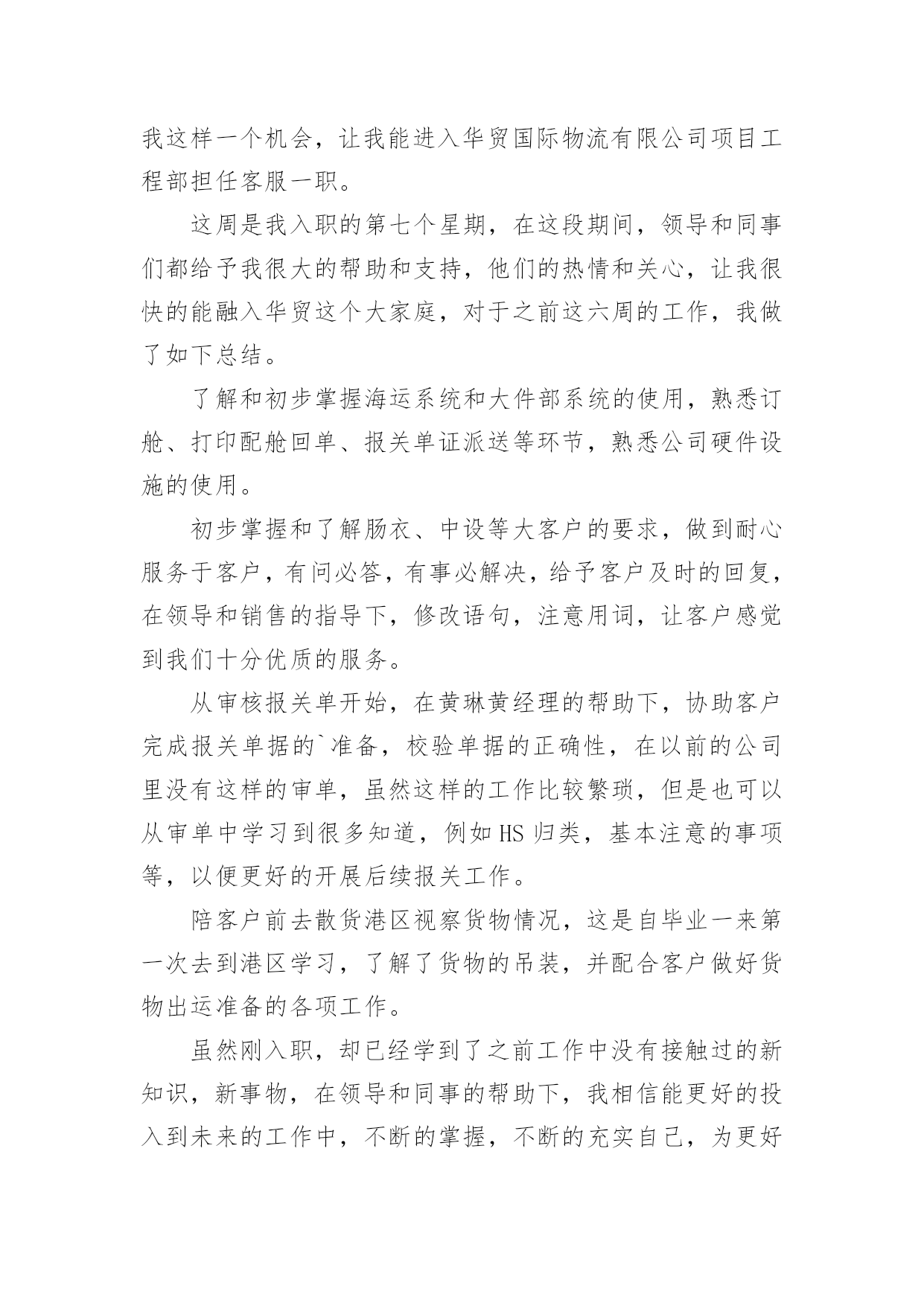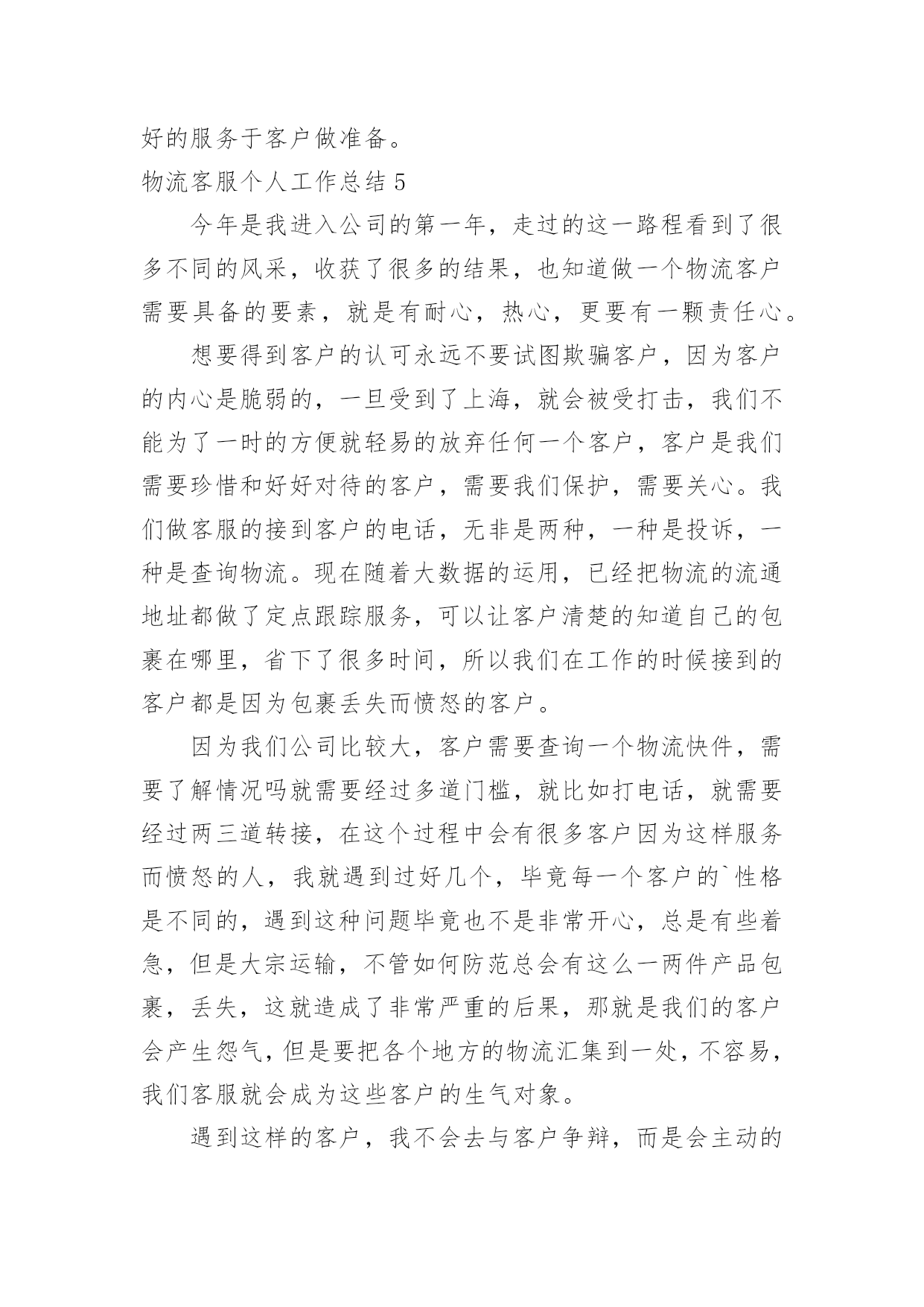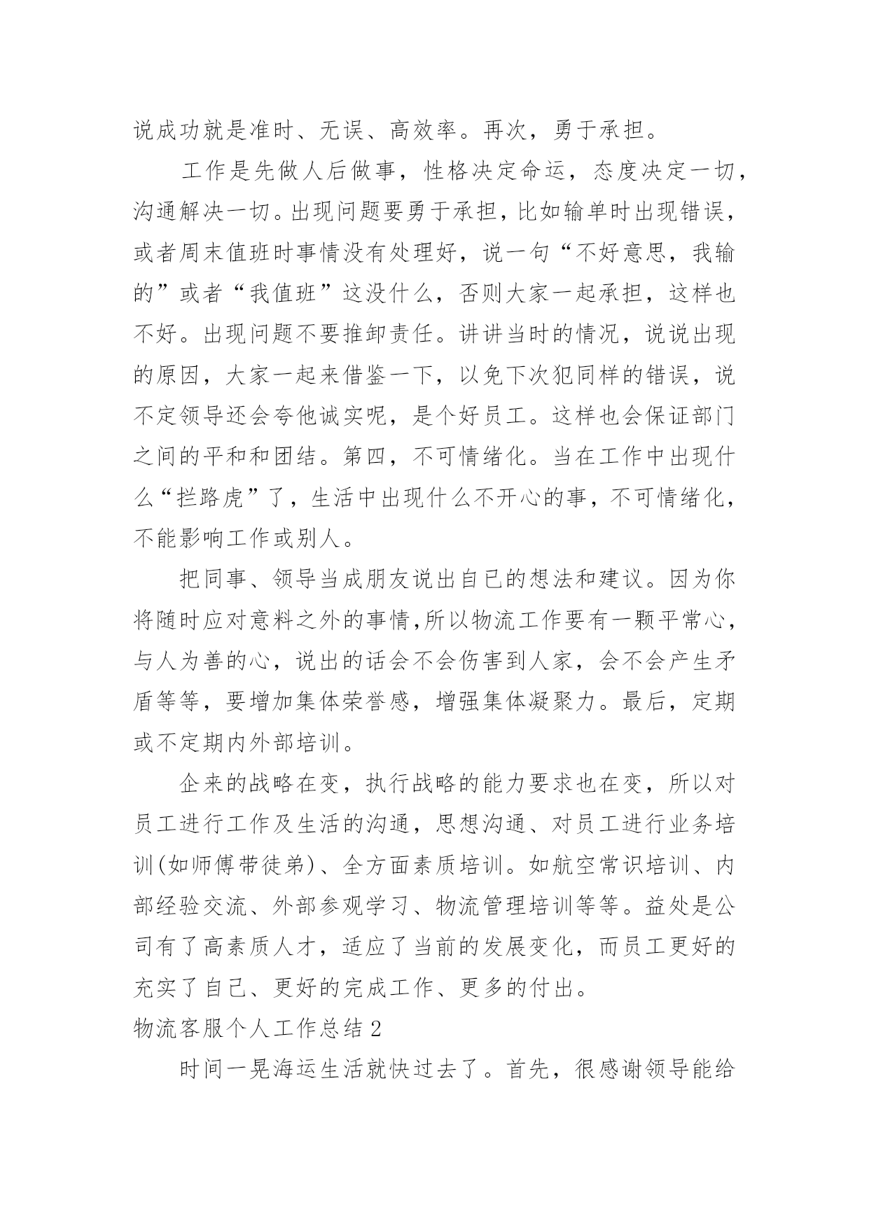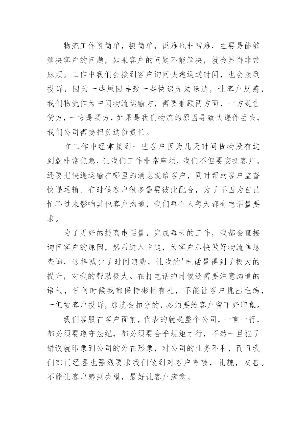 物流客服个人工作总结物流客服个人工作总结总结在一个时期、一个年度、一个阶段对学习和工作生活等情况加以回顾和分析的一种书面材料,他能够提升我们的书面表达能力,因此,让我们写一份总结吧。那么总结要注意有什么内容呢?下面是小编为大家收集的物流客服个人工作总结,仅供参考,希望能够帮助到大家。物流客服个人工作总结1自我进入协远物流,成为一名客服专员已经xx个月有余,在新年到来之际,在此对我的20xx做个总结,希望可以在20xx年里有更大的进步。初进协远因之前没有过任何物流方面的经验,很担心无法融入到客服的工作中,但是从我进入公司的第一天开始,公司一直强调的“齐心协力,志存高远”的企业文化、宽松融洽的工作氛围、以及施经理和客服部各位同事的耐心指导,使我在较短的时间内适应了公司的工作环境,也熟悉了公司的整个操作流程。在客服部的工作中,我一直严格要求自己,认真及时的做好领导布置的'每一项任务,并虚心的向同事们学习,借鉴她们许多良好的工作习惯和在工作中积累的经验。公司注重时限和承诺,所以我们客服在受理、跟踪、查询和确认收货情况时,要本着公司的这种精神,言语得体,有礼有节,并且要非常的细心。我也会加强学习业务知识,不断提高和充实自己,希望能尽早独当一面,为公司做出更多的贡献。不过在工作中我也出现了一些错误,因此在处理各种问题时我会考虑得更全面,杜绝类似错误的发生。在此,我要非常感谢施经理和各位同事,感谢她们对我工作中出现的错误给予及时的提醒和改正。转正之后在成为协远的正式一分子后,我对客服的工作有了更深层次的认识,在处理问题和突发事件上有了相对的提高。首先,我认为客服工作中“细心”是最重要的,比如在受理时,要尽可能详尽的得到货物信息和客户的要求;在跟营运部门登记和查询时,更要尽可能详尽的了解到货物的在途和到货实况,并有能力根据这些信息推测和判断后续情况,在应对客户询问时能够简言答之,令客户满意。在工作中发现问题,找出原因,找到解决问题的办法不断改进不断提高。所以说注意物流工作的细节是非常重要的。其次,不要主观。若出现和以往不一致等异常的情况,要冷静观察,不可盲目去处理,认真落实。不要强调“以自我为中心”,而应该强调“整体利益优先”,在工作中要发扬“有人负责我服从,无人负责我负责”的精神。如受理时、回复客户时、接到领导指示的工作等不可凭主观想像做事,按部就班,简单的事情更要认真对待。记得有句话这样说的“简单的事情重复做,当成功来临时挡也挡不住”。对于物流来说成功就是准时、无误、高效率。再次,勇于承担。工作是先做人后做事,性格决定命运,态度决定一切,沟通解决一切。出现问题要勇于承担,比如输单时出现错误,或者周末值班时事情没有处理好,说一句“不好意思,我输的”或者“我值班”这没什么,否则大家一起承担,这样也不好。出现问题不要推卸责任。讲讲当时的情况,说说出现的原因,大家一起来借鉴一下,以免下次犯同样的错误,说不定领导还会夸他诚实呢,是个好员工。这样也会保证部门之间的平和和团结。第四,不可情绪化。当在工作中出现什么“拦路虎”了,生活中出现什么不开心的事,不可情绪化,不能影响工作或别人。把同事、领导当成朋友说出自已的想法和建议。因为你将随时应对意料之外的事情,所以物流工作要有一颗平常心,与人为善的心,说出的话会不会伤害到人家,会不会产生矛盾等等,要增加集体荣誉感,增强集体凝聚力。最后,定期或不定期内外部培训。企来的战略在变,执行战略的能力要求也在变,所以对员工进行工作及生活的沟通,思想沟通、对员工进行业务培训(如师傅带徒弟)、全方面素质培训。如航空常识培训、内部经验交流、外部参观学习、物流管理培训等等。益处是公司有了高素质人才,适应了当前的发展变化,而员工更好的充实了自己、更好的完成工作、更多的付出。物流客服个人工作总结2时间一晃海运生活就快过去了。首先,很感谢领导能给我这样一个机会,让我能进入华贸国际物流有限公司项目工程部担任客服一职。这周是我入职的第七个星期,在这段期间,领导和同事们都给予我很大的帮助和支持,他们的热情和关心,让我很快的能融入华贸这个大家庭,对于之前这六周的工作,我做了如下总结。了解和初步掌握海运系统和大件部系统的使用,熟悉订舱、打印配舱回单、报关单证派送等环节,熟悉公司硬件设施的使用。初步掌握和了解肠衣、中设等大客户的要求,做到耐心服务于客户,有问必答,有事必解决,给予客户及时的回复,在领导和销售的指导下,修改语句,注意用词,让客户感觉到我们十分优质的服务。从审核报关单开始,在黄琳黄经理的帮助下,协助客户完成报关单据的`准备,校验单据的正确性,在以前的公司里没有这样的审单,虽然这样的工作比较繁琐,但是也可以从审单中学习到很多知道,例如HS归类,基本注意的事项等,以便更好的开展后续报关工作。陪客户前去散货港区视察货物情况,这是自毕业