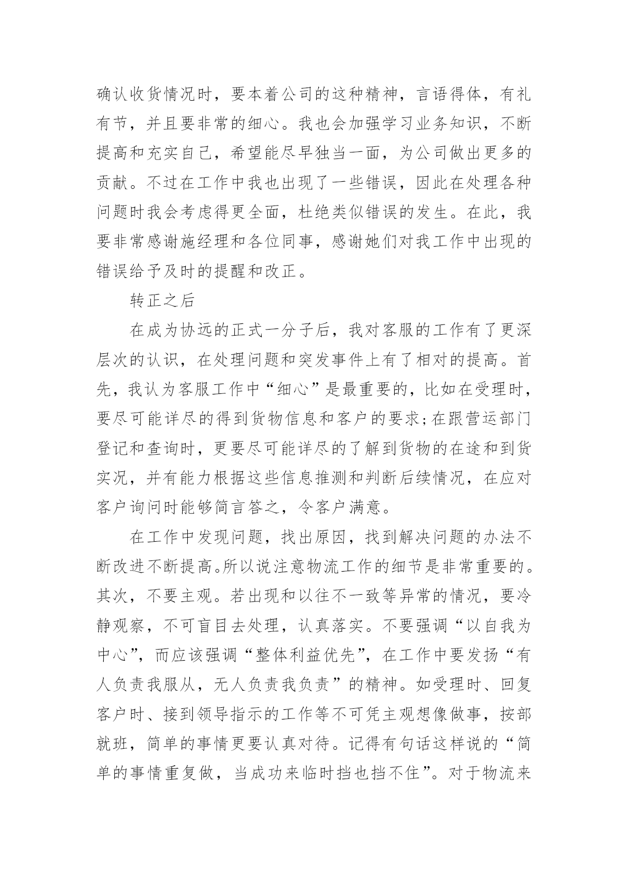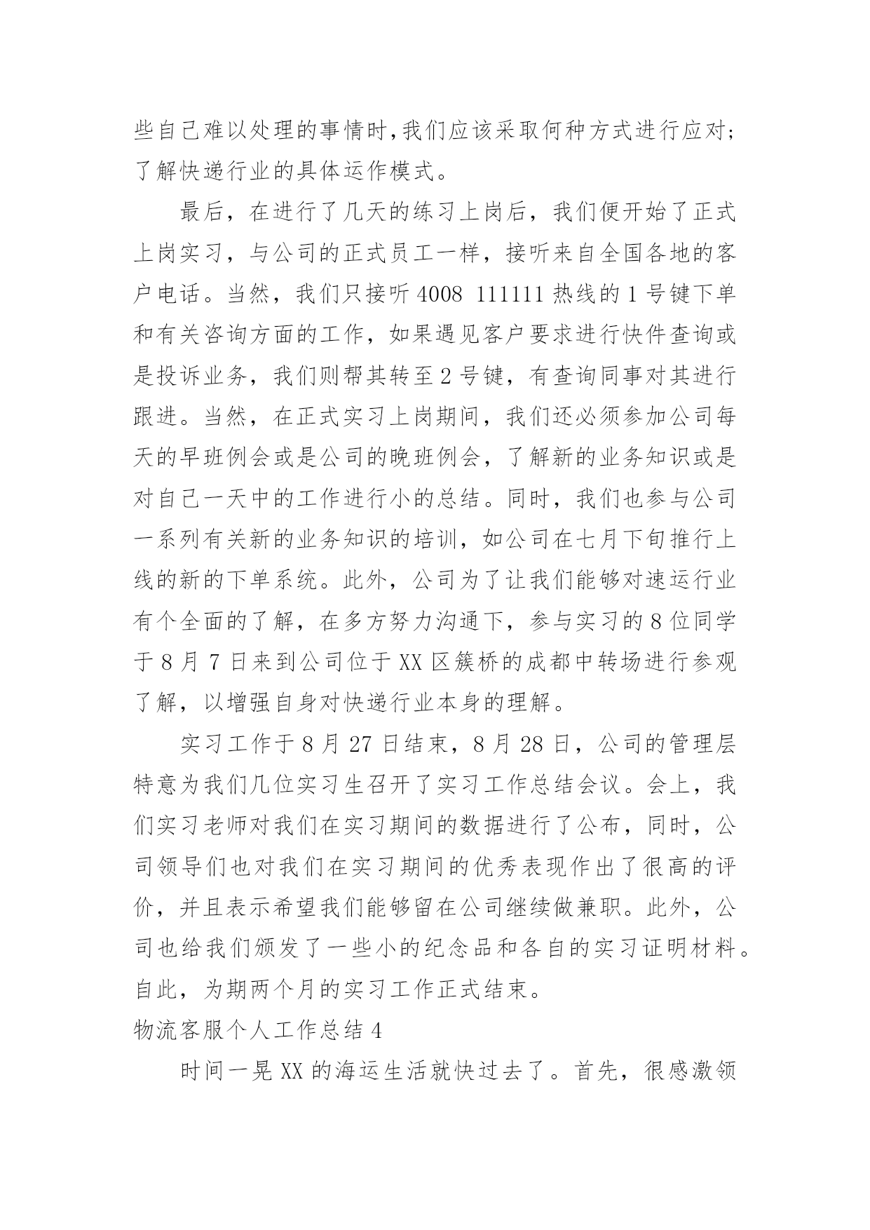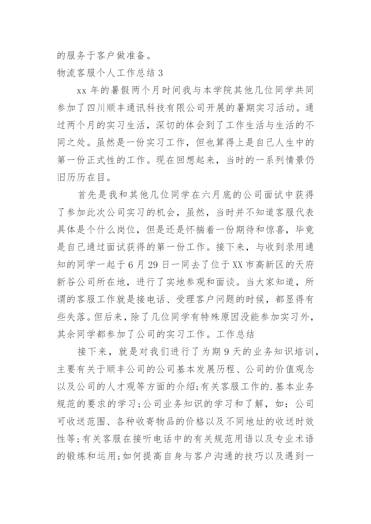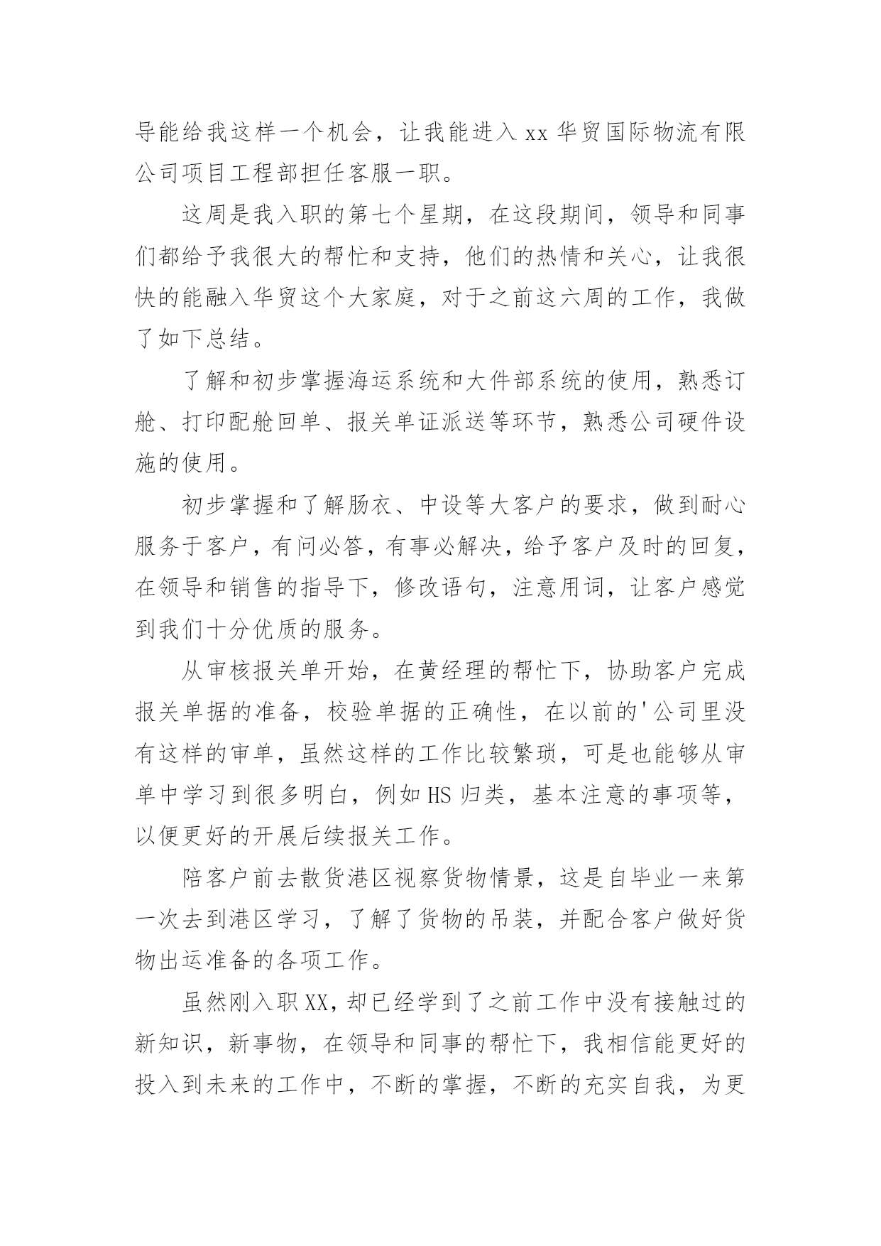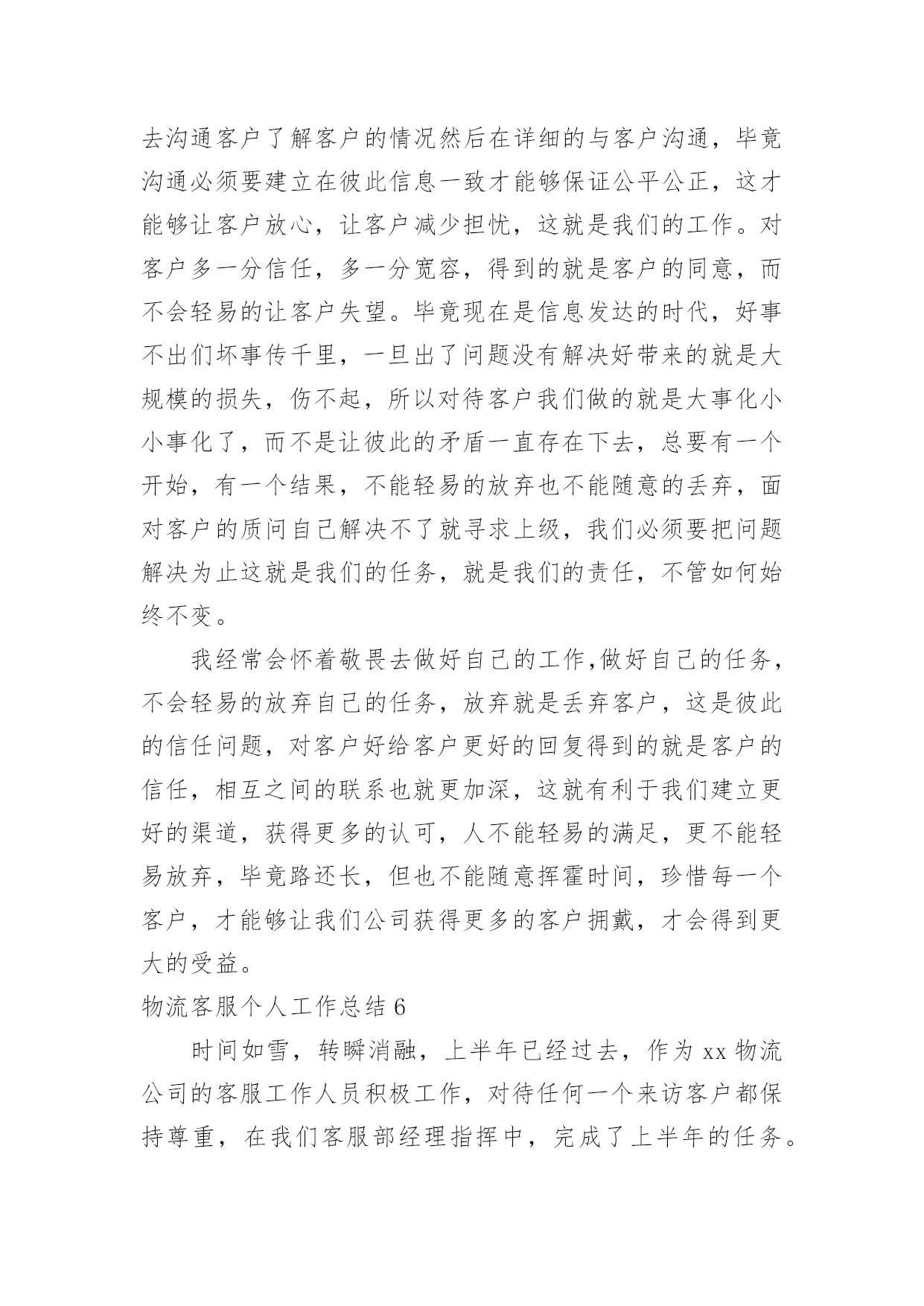 物流客服个人工作总结物流客服个人工作总结总结在一个时期、一个年度、一个阶段对学习和工作生活等情况加以回顾和分析的一种书面材料,他能够提升我们的书面表达能力,因此,让我们写一份总结吧。那么总结要注意有什么内容呢?下面是小编为大家收集的物流客服个人工作总结,仅供参考,希望能够帮助到大家。物流客服个人工作总结1自我进入协远物流,成为一名客服专员已经xx个月有余,在新年到来之际,在此对我的20xx做个总结,希望可以在20xx年里有更大的进步。初进协远因之前没有过任何物流方面的经验,很担心无法融入到客服的工作中,但是从我进入公司的第一天开始,公司一直强调的“齐心协力,志存高远”的企业文化、宽松融洽的工作氛围、以及施经理和客服部各位同事的耐心指导,使我在较短的时间内适应了公司的工作环境,也熟悉了公司的整个操作流程。在客服部的工作中,我一直严格要求自己,认真及时的做好领导布置的'每一项任务,并虚心的向同事们学习,借鉴她们许多良好的工作习惯和在工作中积累的经验。公司注重时限和承诺,所以我们客服在受理、跟踪、查询和确认收货情况时,要本着公司的这种精神,言语得体,有礼有节,并且要非常的细心。我也会加强学习业务知识,不断提高和充实自己,希望能尽早独当一面,为公司做出更多的贡献。不过在工作中我也出现了一些错误,因此在处理各种问题时我会考虑得更全面,杜绝类似错误的发生。在此,我要非常感谢施经理和各位同事,感谢她们对我工作中出现的错误给予及时的提醒和改正。转正之后在成为协远的正式一分子后,我对客服的工作有了更深层次的认识,在处理问题和突发事件上有了相对的提高。首先,我认为客服工作中“细心”是最重要的,比如在受理时,要尽可能详尽的得到货物信息和客户的要求;在跟营运部门登记和查询时,更要尽可能详尽的了解到货物的在途和到货实况,并有能力根据这些信息推测和判断后续情况,在应对客户询问时能够简言答之,令客户满意。在工作中发现问题,找出原因,找到解决问题的办法不断改进不断提高。所以说注意物流工作的细节是非常重要的。其次,不要主观。若出现和以往不一致等异常的情况,要冷静观察,不可盲目去处理,认真落实。不要强调“以自我为中心”,而应该强调“整体利益优先”,在工作中要发扬“有人负责我服从,无人负责我负责”的精神。如受理时、回复客户时、接到领导指示的工作等不可凭主观想像做事,按部就班,简单的事情更要认真对待。记得有句话这样说的“简单的事情重复做,当成功来临时挡也挡不住”。对于物流来说成功就是准时、无误、高效率。再次,勇于承担。工作是先做人后做事,性格决定命运,态度决定一切,沟通解决一切。出现问题要勇于承担,比如输单时出现错误,或者周末值班时事情没有处理好,说一句“不好意思,我输的”或者“我值班”这没什么,否则大家一起承担,这样也不好。出现问题不要推卸责任。讲讲当时的情况,说说出现的原因,大家一起来借鉴一下,以免下次犯同样的错误,说不定领导还会夸他诚实呢,是个好员工。这样也会保证部门之间的平和和团结。第四,不可情绪化。当在工作中出现什么“拦路虎”了,生活中出现什么不开心的事,不可情绪化,不能影响工作或别人。把同事、领导当成朋友说出自已的想法和建议。因为你将随时应对意料之外的事情,所以物流工作要有一颗平常心,与人为善的心,说出的话会不会伤害到人家,会不会产生矛盾等等,要增加集体荣誉感,增强集体凝聚力。最后,定期或不定期内外部培训。企来的战略在变,执行战略的能力要求也在变,所以对员工进行工作及生活的沟通,思想沟通、对员工进行业务培训(如师傅带徒弟)、全方面素质培训。如航空常识培训、内部经验交流、外部参观学习、物流管理培训等等。益处是公司有了高素质人才,适应了当前的发展变化,而员工更好的充实了自己、更好的完成工作、更多的付出。物流客服个人工作总结2时间一晃海运生活就快过去了。首先,很感谢领导能给我这样一个机会,让我能进入华贸国际物流有限公司项目工程部担任客服一职。这周是我入职的第七个星期,在这段期间,领导和同事们都给予我很大的帮助和支持,他们的热情和关心,让我很快的能融入华贸这个大家庭,对于之前这六周的工作,我做了如下总结。了解和初步掌握海运系统和大件部系统的使用,熟悉订舱、打印配舱回单、报关单证派送等环节,熟悉公司硬件设施的使用。初步掌握和了解肠衣、中设等大客户的要求,做到耐心服务于客户,有问必答,有事必解决,给予客户及时的回复,在领导和销售的指导下,修改语句,注意用词,让客户感觉到我们十分优质的服务。从审核报关单开始,在黄琳黄经理的帮助下,协助客户完成报关单据的`准备,校验单据的正确性,在以前的公司里没有这样的审单,虽然这样的工作比较繁琐,但是也可以从审单中学习到很多知道,例如HS归类,基本注意的事项等,以便更好的开展后续报关工作。陪客户前去散货港区视察货物情况,这是自毕业