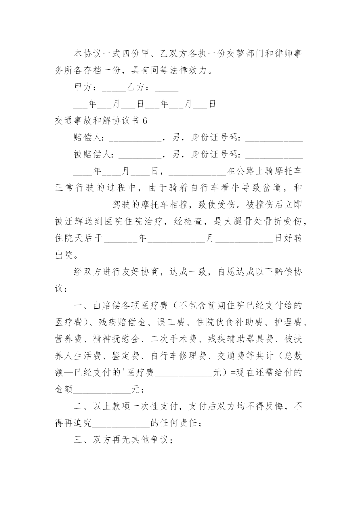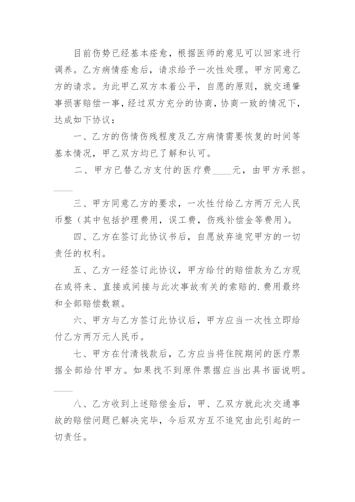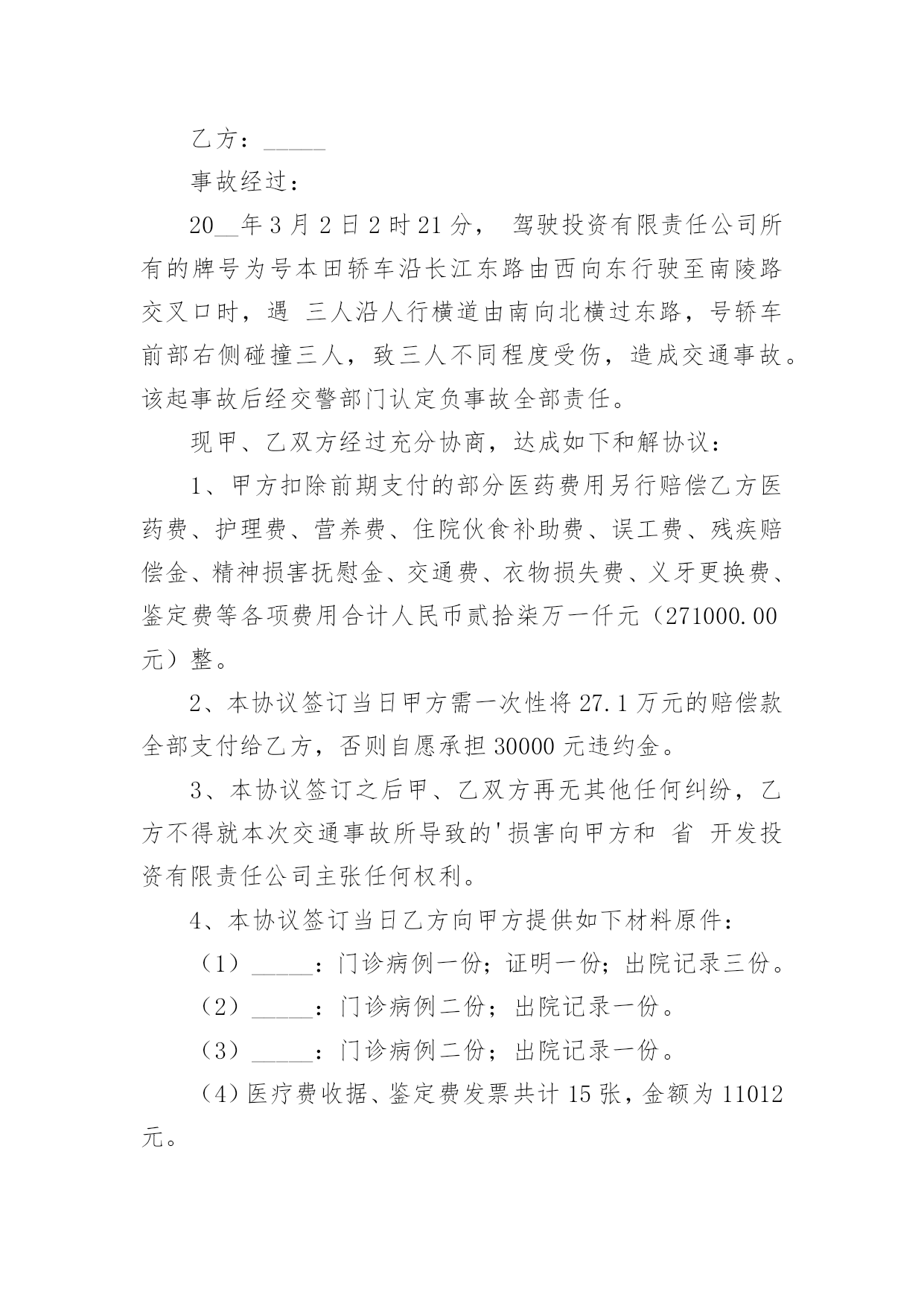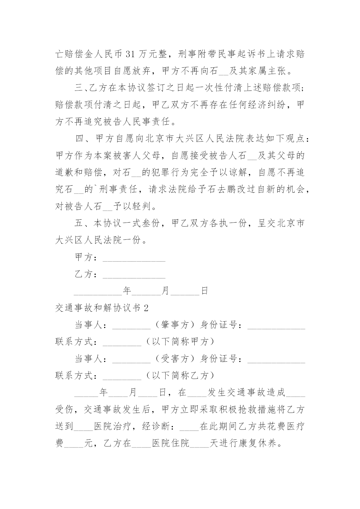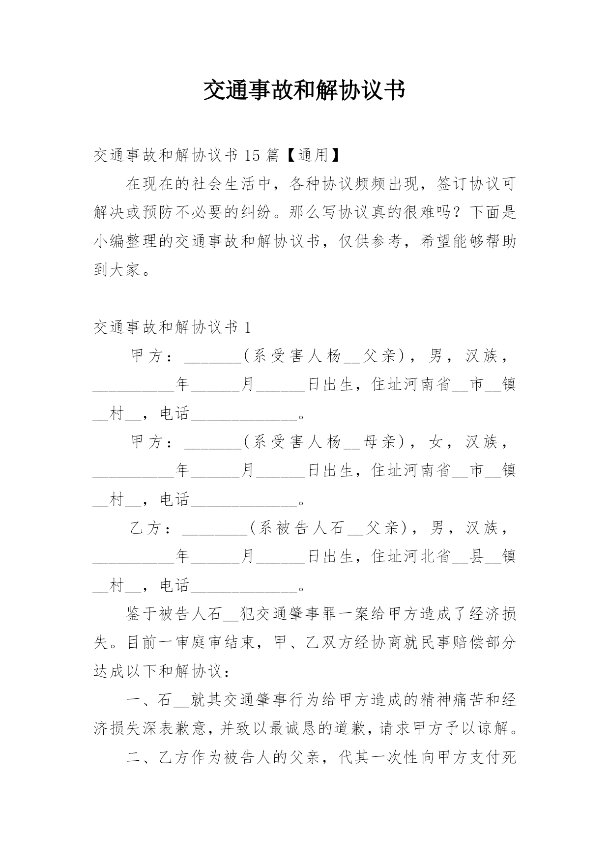 交通事故和解协议书交通事故和解协议书15篇【通用】在现在的社会生活中,各种协议频频出现,签订协议可解决或预防不必要的纠纷。那么写协议真的很难吗?下面是小编整理的交通事故和解协议书,仅供参考,希望能够帮助到大家。交通事故和解协议书1甲方:_______(系受害人杨__父亲),男,汉族,__________年______月______日出生,住址河南省__市__镇__村__,电话_____________。甲方:_______(系受害人杨__母亲),女,汉族,__________年______月______日出生,住址河南省__市__镇__村__,电话_____________。乙方:________(系被告人石__父亲),男,汉族,__________年______月______日出生,住址河北省__县__镇__村__,电话_____________。鉴于被告人石__犯交通肇事罪一案给甲方造成了经济损失。目前一审庭审结束,甲、乙双方经协商就民事赔偿部分达成以下和解协议:一、石__就其交通肇事行为给甲方造成的精神痛苦和经济损失深表歉意,并致以最诚恳的道歉,请求甲方予以谅解。二、乙方作为被告人的父亲,代其一次性向甲方支付死亡赔偿金人民币31万元整,刑事附带民事起诉书上请求赔偿的其他项目自愿放弃,甲方不再向石__及其家属主张。三、乙方在本协议签订之日起一次性付清上述赔偿款项;赔偿款项付清之日起,甲乙双方不再存在任何经济纠纷,甲方不再追究被告人民事责任。四、甲方自愿向北京市大兴区人民法院表达如下观点:甲方作为本案被害人父母,自愿接受被告人石__及其父母的道歉和赔偿,对石__的犯罪行为完全予以谅解,自愿不再追究石__的`刑事责任,请求法院给予石去鹏改过自新的机会,对被告人石__予以轻判。五、本协议一式叁份,甲乙双方各执一份,呈交北京市大兴区人民法院一份。甲方:_____________乙方:_______________________年______月______日交通事故和解协议书2当事人:________(肇事方)身份证号:____________联系方式:________(以下简称甲方)当事人:________(受害方)身份证号:____________联系方式:________(以下简称乙方)_____年____月____日,在____发生交通事故造成____受伤,交通事故发生后,甲方立即采取积极抢救措施将乙方送到____医院治疗,经诊断:____在此期间乙方共花费医疗费____元,乙方在____医院住院____天进行康复休养。目前伤势已经基本痊愈,根据医师的意见可以回家进行调养。乙方病情痊愈后,请求给予一次性处理。甲方同意乙方的请求。为此甲乙双方本着公平,自愿的原则,就交通肇事损害赔偿一事,经过双方充分的协商,协商一致的情况下,达成如下协议:一、乙方的伤情伤残程度及乙方病情需要恢复的时间等基本情况,甲乙双方均已了解和认可。二、甲方已替乙方支付的医疗费____元,由甲方承担。____三、甲方同意乙方的要求,一次性付给乙方两万元人民币整(其中包括护理费用,误工费,伤残补偿金等费用)。四、乙方在签订此协议书后,自愿放弃追究甲方的一切责任的权利。五、乙方一经签订此协议,甲方给付的赔偿款为乙方现在或将来、直接或间接与此次事故有关的索赔的.费用最终和全部赔偿数额。六、甲方与乙方签订此协议后,甲方应当一次性立即给付乙方两万元人民币。七、甲方在付清钱款后,乙方应当将住院期间的医疗票据全部给付甲方。如果找不到原件票据应当出具书面说明。____八、乙方收到上述赔偿金后,甲、乙双方就此次交通事故的赔偿问题已解决完毕,今后双方互不追究由此引起的一切责任。九、(1)本协议甲乙双方签定后,一方出现反悔或违反此协议的规定,根据的相关规定,违约方将承担违约责任,将支付给对方违约金5000元。(2)如果乙方违反此协议,应当将原来甲方给付的钱款全额退回,并再给付甲方5000元的违约金。十、本协议一式两份,双方签字后生效,甲乙双方各执一份。协议是自愿达成调解凭证,一经签定后不得反悔。____我们上述协议完全真实、合法,如果有虚假愿意承担法律责任。甲方:________乙方:_________见证人:________________年____月____日交通事故和解协议书3甲方:黄x,男,__市东湖区人,身份证号:____________市__针织制衣厂,地址:__市郊区__乡。法定代表人:叶__,系该厂厂长乙方:代__,男,__市__区人,身份证号:____________秦__,女,__市__区人,身份证号:____________戴__,女,2周岁,系代__与秦__之女事发经过:20__年5月7日2时0分,黄x驾驶__市__针织制衣厂所有的牌号为赣A2__7