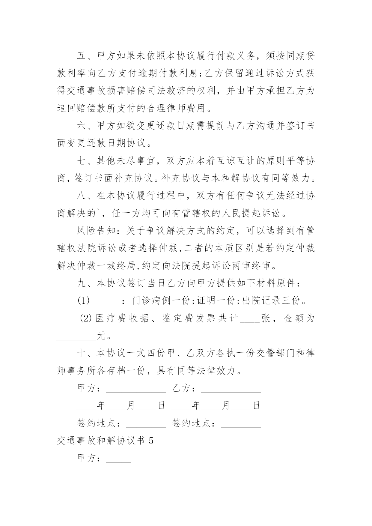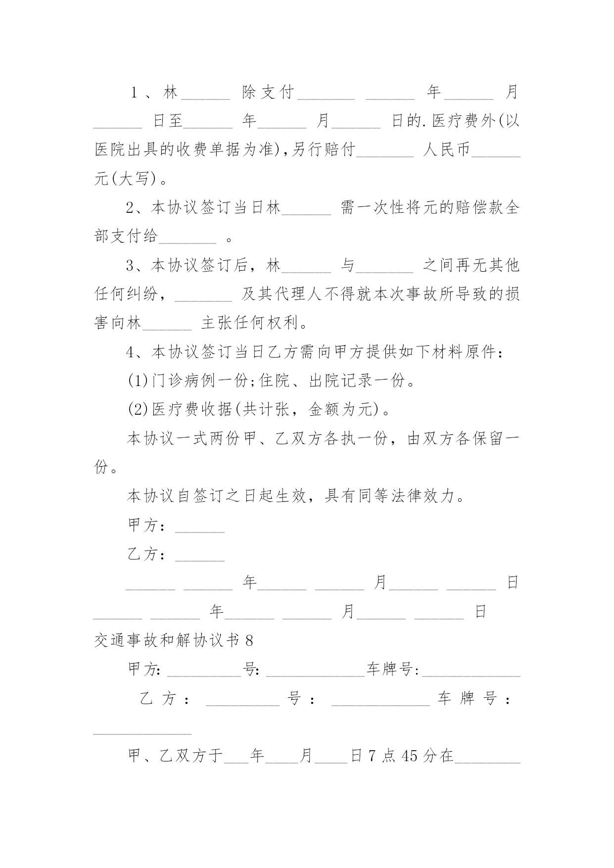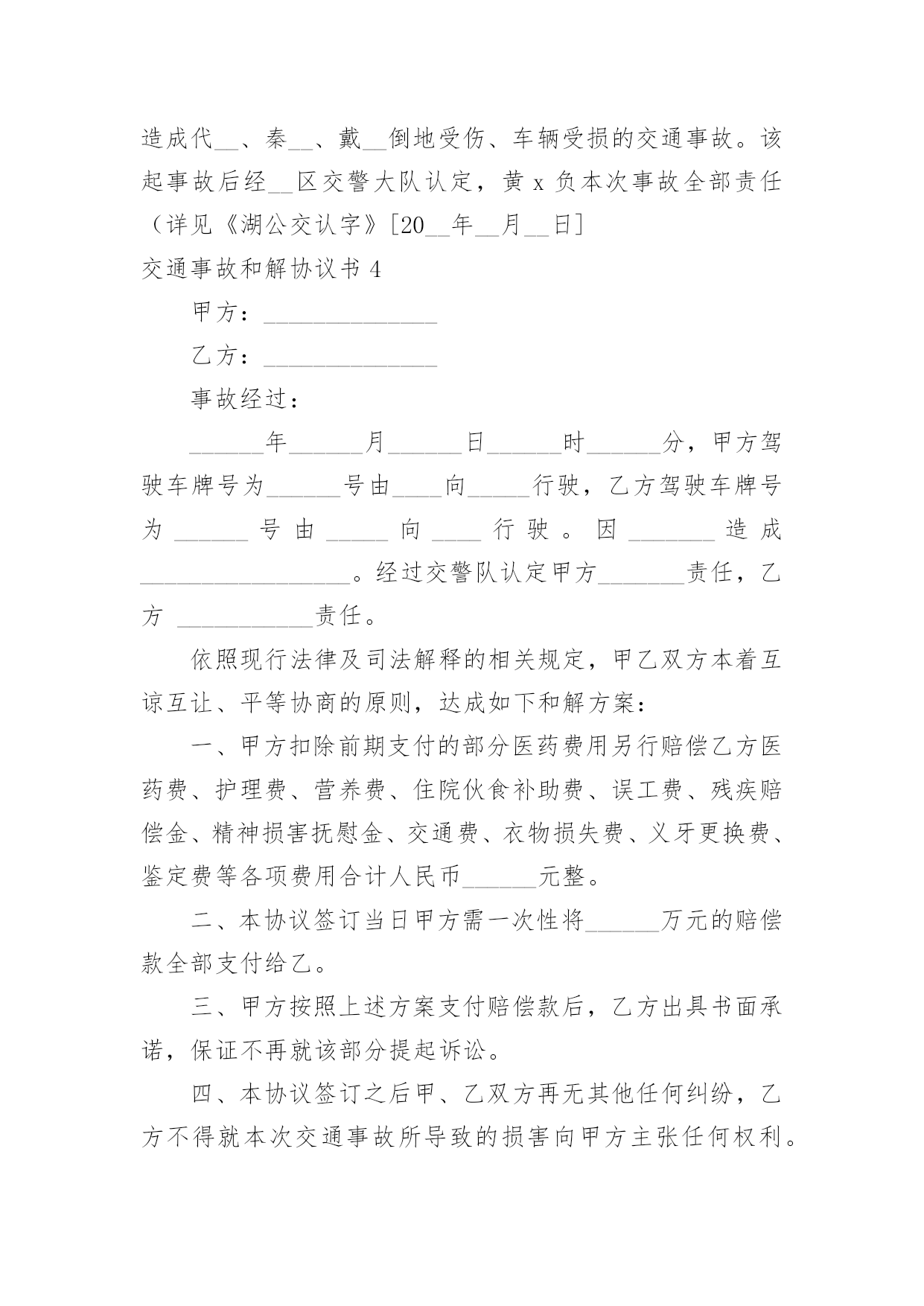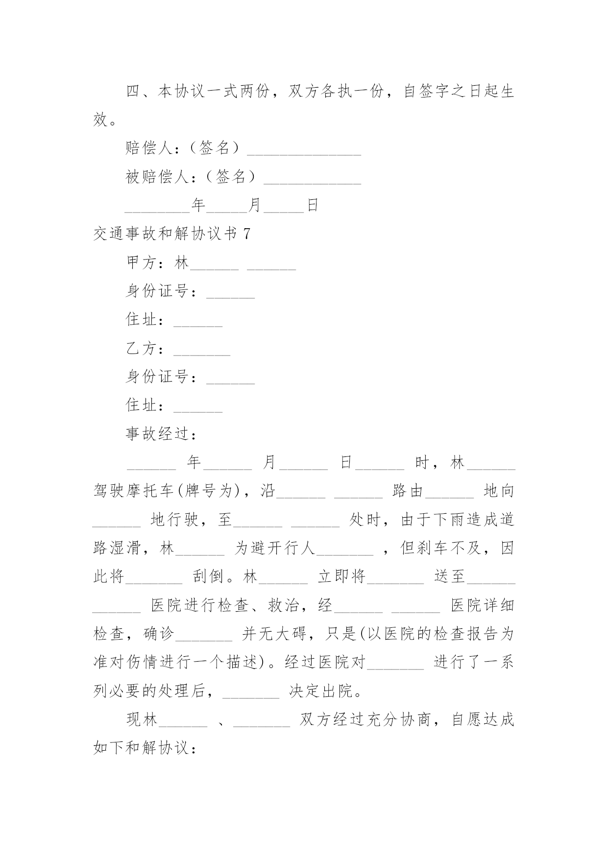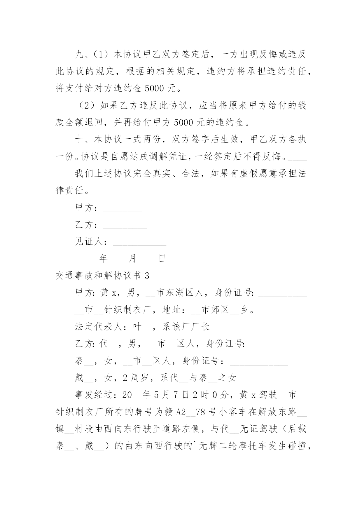 交通事故和解协议书交通事故和解协议书15篇【通用】在现在的社会生活中,各种协议频频出现,签订协议可解决或预防不必要的纠纷。那么写协议真的很难吗?下面是小编整理的交通事故和解协议书,仅供参考,希望能够帮助到大家。交通事故和解协议书1甲方:_______(系受害人杨__父亲),男,汉族,__________年______月______日出生,住址河南省__市__镇__村__,电话_____________。甲方:_______(系受害人杨__母亲),女,汉族,__________年______月______日出生,住址河南省__市__镇__村__,电话_____________。乙方:________(系被告人石__父亲),男,汉族,__________年______月______日出生,住址河北省__县__镇__村__,电话_____________。鉴于被告人石__犯交通肇事罪一案给甲方造成了经济损失。目前一审庭审结束,甲、乙双方经协商就民事赔偿部分达成以下和解协议:一、石__就其交通肇事行为给甲方造成的精神痛苦和经济损失深表歉意,并致以最诚恳的道歉,请求甲方予以谅解。二、乙方作为被告人的父亲,代其一次性向甲方支付死亡赔偿金人民币31万元整,刑事附带民事起诉书上请求赔偿的其他项目自愿放弃,甲方不再向石__及其家属主张。三、乙方在本协议签订之日起一次性付清上述赔偿款项;赔偿款项付清之日起,甲乙双方不再存在任何经济纠纷,甲方不再追究被告人民事责任。四、甲方自愿向北京市大兴区人民法院表达如下观点:甲方作为本案被害人父母,自愿接受被告人石__及其父母的道歉和赔偿,对石__的犯罪行为完全予以谅解,自愿不再追究石__的`刑事责任,请求法院给予石去鹏改过自新的机会,对被告人石__予以轻判。五、本协议一式叁份,甲乙双方各执一份,呈交北京市大兴区人民法院一份。甲方:_____________乙方:_______________________年______月______日交通事故和解协议书2当事人:________(肇事方)身份证号:____________联系方式:________(以下简称甲方)当事人:________(受害方)身份证号:____________联系方式:________(以下简称乙方)_____年____月____日,在____发生交通事故造成____受伤,交通事故发生后,甲方立即采取积极抢救措施将乙方送到____医院治疗,经诊断:____在此期间乙方共花费医疗费____元,乙方在____医院住院____天进行康复休养。目前伤势已经基本痊愈,根据医师的意见可以回家进行调养。乙方病情痊愈后,请求给予一次性处理。甲方同意乙方的请求。为此甲乙双方本着公平,自愿的原则,就交通肇事损害赔偿一事,经过双方充分的协商,协商一致的情况下,达成如下协议:一、乙方的伤情伤残程度及乙方病情需要恢复的时间等基本情况,甲乙双方均已了解和认可。二、甲方已替乙方支付的医疗费____元,由甲方承担。____三、甲方同意乙方的要求,一次性付给乙方两万元人民币整(其中包括护理费用,误工费,伤残补偿金等费用)。四、乙方在签订此协议书后,自愿放弃追究甲方的一切责任的权利。五、乙方一经签订此协议,甲方给付的赔偿款为乙方现在或将来、直接或间接与此次事故有关的索赔的.费用最终和全部赔偿数额。六、甲方与乙方签订此协议后,甲方应当一次性立即给付乙方两万元人民币。七、甲方在付清钱款后,乙方应当将住院期间的医疗票据全部给付甲方。如果找不到原件票据应当出具书面说明。____八、乙方收到上述赔偿金后,甲、乙双方就此次交通事故的赔偿问题已解决完毕,今后双方互不追究由此引起的一切责任。九、(1)本协议甲乙双方签定后,一方出现反悔或违反此协议的规定,根据的相关规定,违约方将承担违约责任,将支付给对方违约金5000元。(2)如果乙方违反此协议,应当将原来甲方给付的钱款全额退回,并再给付甲方5000元的违约金。十、本协议一式两份,双方签字后生效,甲乙双方各执一份。协议是自愿达成调解凭证,一经签定后不得反悔。____我们上述协议完全真实、合法,如果有虚假愿意承担法律责任。甲方:________乙方:_________见证人:________________年____月____日交通事故和解协议书3甲方:黄x,男,__市东湖区人,身份证号:____________市__针织制衣厂,地址:__市郊区__乡。法定代表人:叶__,系该厂厂长乙方:代__,男,__市__区人,身份证号:____________秦__,女,__市__区人,身份证号:____________戴__,女,2周岁,系代__与秦__之女事发经过:20__年5月7日2时0分,黄x驾驶__市__针织制衣厂所有的牌号为赣A2__7