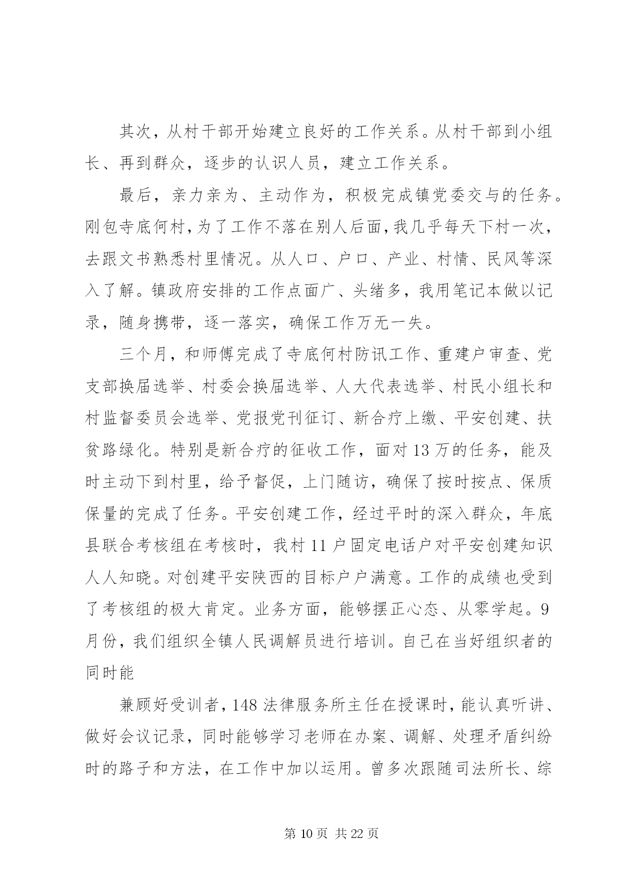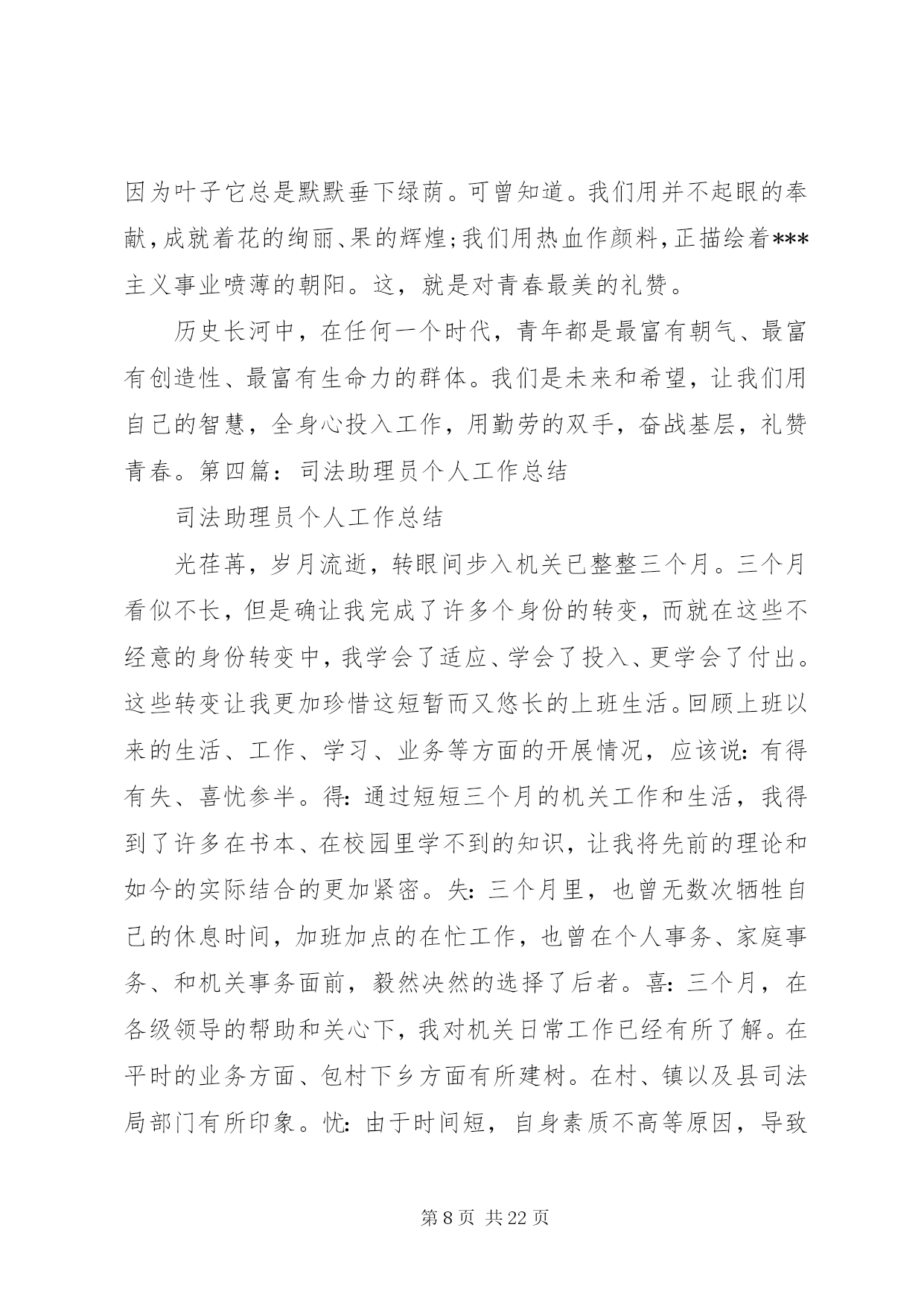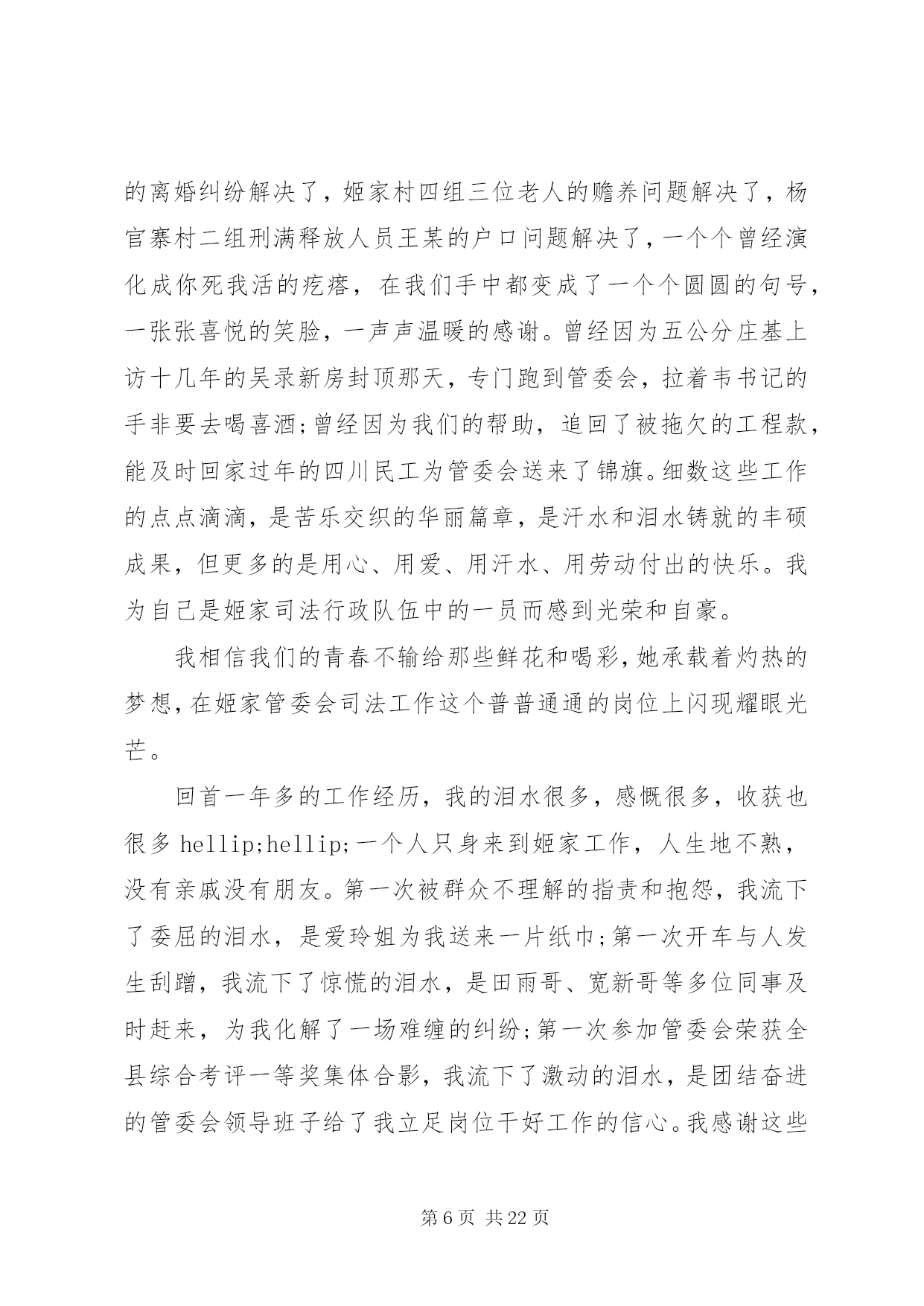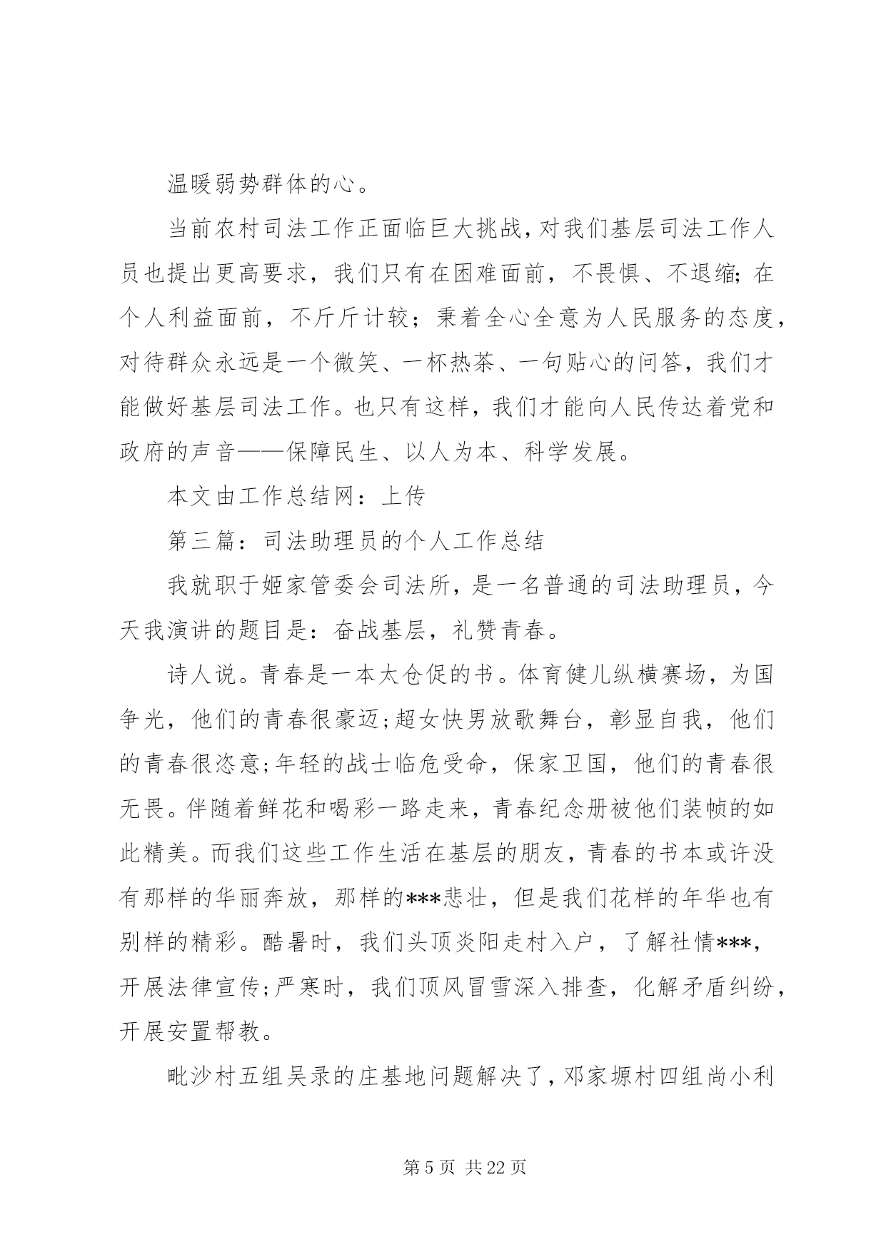 第PAGE\*Arabic\*MERGEFORMAT22页共NUMPAGES\*MERGEFORMAT22页司法助理员工作总结(精选多篇)第一篇:司法助理员工作总结司法助理员工作总结一年来,我在区司法局的正确领导下,在乡党委、政府的大力支持下,紧紧围绕2014年工作任务的要求,以科学的发展观、服务于人民群众为宗旨,认真履行职责,现就任职一年来工作任务完成情况总结如下:一、加强业务学习,苦炼内功。司法工作是一项全面、系统性工作,涉及面广,工作复杂。今年我不断加强学习,提高司法工作能力。一是加强业务知识学习,认真学习司法工作相关的法律、法规、文件等知识,提高自身的业务水平;二是不断学习外地司法工作的做法,不断拓宽自己的视野,增强自身综治工作创新能力。二、开展法制宣传教育。今年我充分利用各种有利时机,结合各种宣传教育活动,多方位多形式地开展法制宣传教育工作。(一)结合各种会议为契机,有选择的组织乡村干部学习了《行政诉讼法》、《国家赔偿法》、《公务员法》、中央关于综治工作的意见、省市区关于司法工作的意见等法律法规文件,增长了广大干部的知识,增强了依法行政的法律意识。(二)结合村两位换届、综治宣传月、高铁建设、禁毒宣传月等,加强对全乡广大村民进行综治、平安建设、《村民委员会选举法》、《土地法》、《信访条例》、《禁毒法》、《国-家-安-全法》等政策法律法规知识的宣传,增强了广大群众村民法制观念。(三)在各中小学开展法制教育。为加强学生的法制教育,定期组织法制副校长到学校上法制课,增强了学生的法制观念,从小培养学生学法、懂法、遵法、守法的热情。三、做好矛盾纠纷排查调处工作。为化解矛盾纠纷,消除影响社会治安和社会稳定的隐患,维护社会的和-谐稳定,我积极做好矛盾纠纷排查调处工作,(一)全乡13个村全部成立了矛盾纠纷排查小组和人民调解委员会,形成了信息灵敏,反应快捷,运作协调,化解及时的矛盾纠纷排查调处网络;(二)加大矛盾纠纷排查调处力度,坚持乡村每半月一排查制度,强化“两排”工作,扎实做好矛盾纠纷排查,妥善调处好各类矛盾纠纷。四、做好刑释解教人员安置帮教。为做好刑释解教人员的教育和管理,防止重新犯罪。今年组织各村干部对全乡范围内的帮教人员逐一进行了排查,建立了一套详细资料台帐,落实了帮教措施,坚持每季度进行一次帮教谈话,定期分析他们的思想动态第二篇:司法助理员工作总结司法助理员工作总结我就职于姬家管委会司法所,是一名普通的司法助理员,今天我演讲的题目是:奋战基层,礼赞青春。诗人说。青春是一本太仓促的书。体育健儿纵横赛场,为国争光,他们的青春很豪迈;超女快男放歌舞台,彰显自我,他们的青春很恣意;年轻的战士临危受命,保家卫国,他们的青春很无畏。伴随着鲜花和喝彩一路走来,青春纪念册被他们装帧的如此精美。而我们这些工作生活在基层的朋友,青春的书本或许没有那样的华丽奔放,那样的***悲壮,但是我们花样的年华也有别样的精彩。酷暑时,我们头顶炎阳走村入户,了解社情***,开展法律宣传;严寒时,我们顶风冒雪深入排查,化解矛盾纠纷,开展安置帮教。毗沙村五组吴录的庄基地问题解决了,邓家塬村四组尚小利的离婚纠纷解决了,姬家村四组三位老人的赡养问题解决了,杨官寨村二组刑满释放人员王某的户口问题解决了,一个个曾经演化成你死我活的疙瘩,在我们手中都变成了一个个圆圆的句号,一张张喜悦的笑脸,一声声温暖的感谢。曾经因为五公分庄基上访十几年的吴录新房封顶那天,专门跑到管委会,拉着韦书记的手非要去喝喜酒;曾经因为我们的帮助,追回了被拖欠的工程款,能及时回家过年的四川民工为管委会送来了锦旗。细数这些工作的点点滴滴,是苦乐交织的华丽篇章,是汗水和泪水铸就的丰硕成果,但更多的是用心、用爱、用汗水、用劳动付出的快乐。我为自己是姬家司法行政队伍中的一员而感到光荣和自豪。我相信我们的青春不输给那些鲜花和喝彩,她承载着灼热的梦想,在姬家管委会司法工作这个普普通通的岗位上闪现耀眼光芒。回首一年多的工作经历,我的泪水很多,感慨很多,收获也很多……一个人只身来到姬家工作,人生地不熟,没有亲戚没有朋友。第一次被群众不理解的指责和抱怨,我流下了委屈的泪水,是爱玲姐为我送来一片纸巾;第一次开车与人发生刮蹭,我流下了惊慌的泪水,是田雨哥、宽新哥等多位同事及时赶来,为我化解了一场难缠的纠纷;第一次参加管委会荣获全县综合考评一等奖集体合影,我流下了激动的泪水,是团结奋进的管委会领导班子给了我立足岗位干好工作的信心。我感谢这些可敬可爱的人,我敬仰这些无私无畏的人,我尊敬这些干事敬业的人。是什么让他们对这份事业的感情历久弥坚。我想,这是一种精神,一种“事不避难、任劳任怨、攻坚克难、勇于担当”的姬家精神;是一种大爱,对祖国和家乡的热爱,对司法事业的热爱,对父老乡亲的热爱。同志们奋战的从容和胜