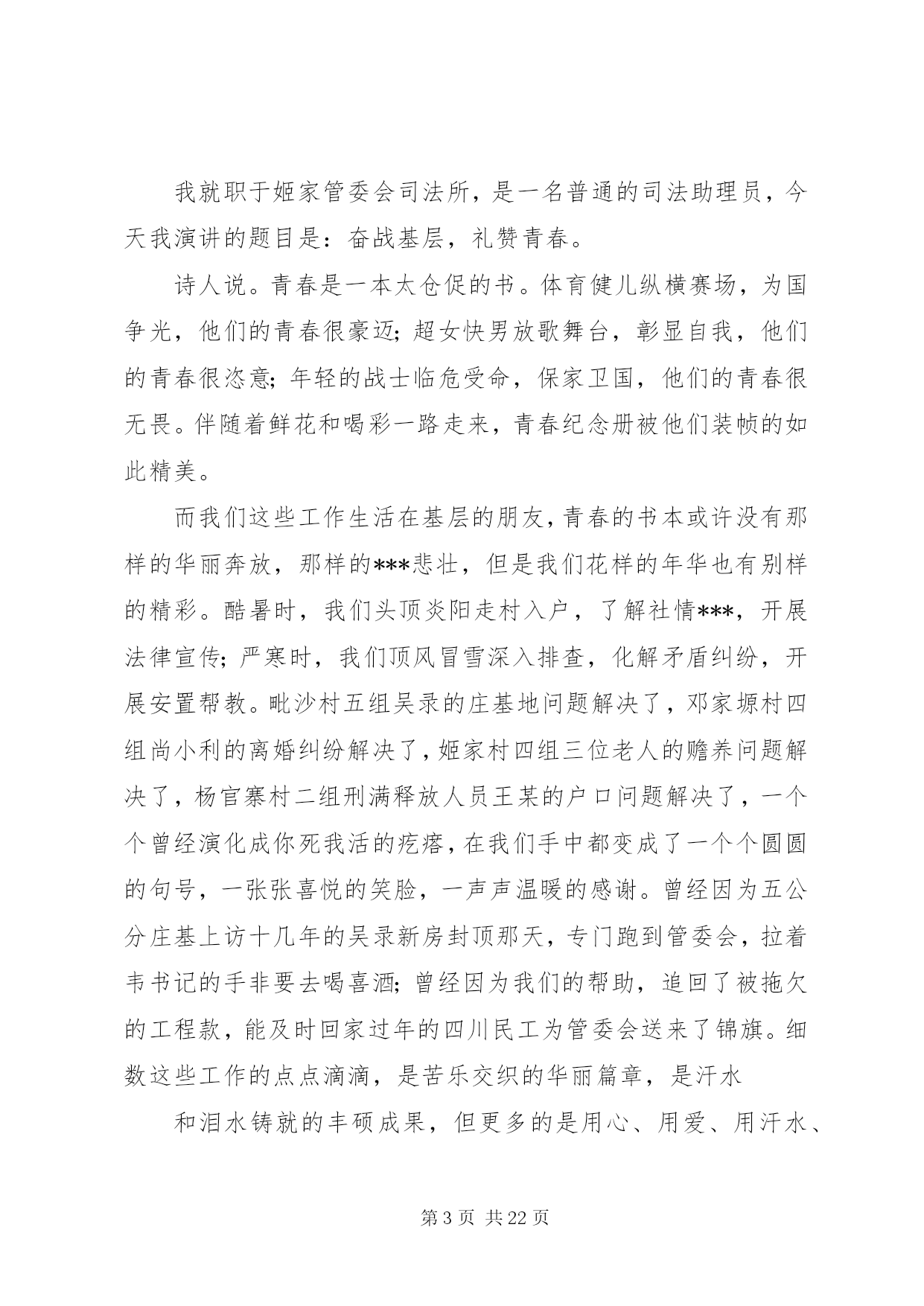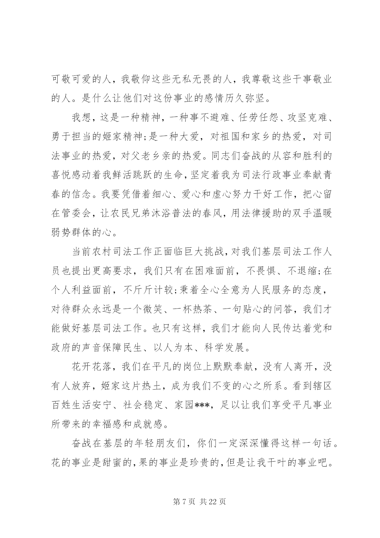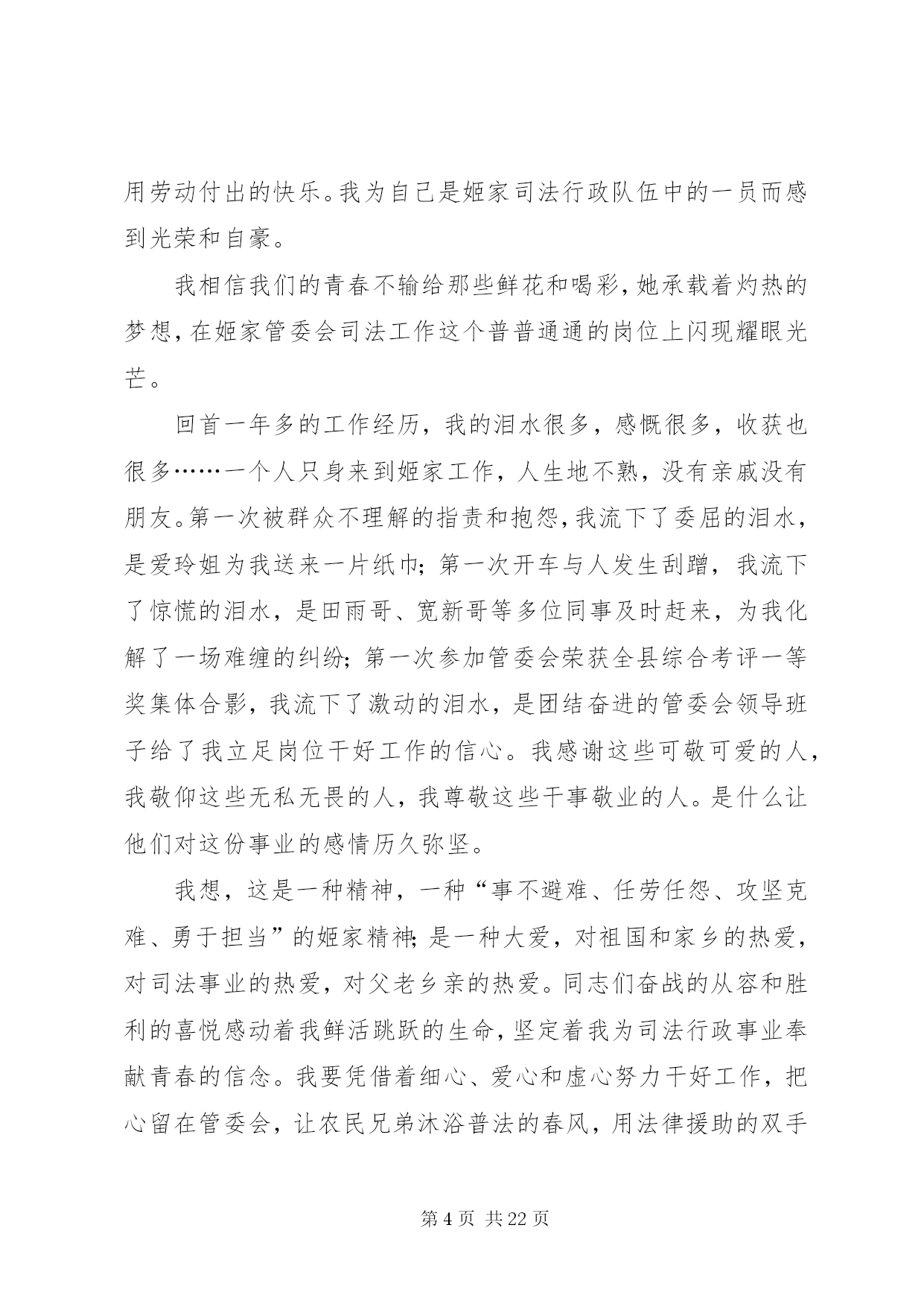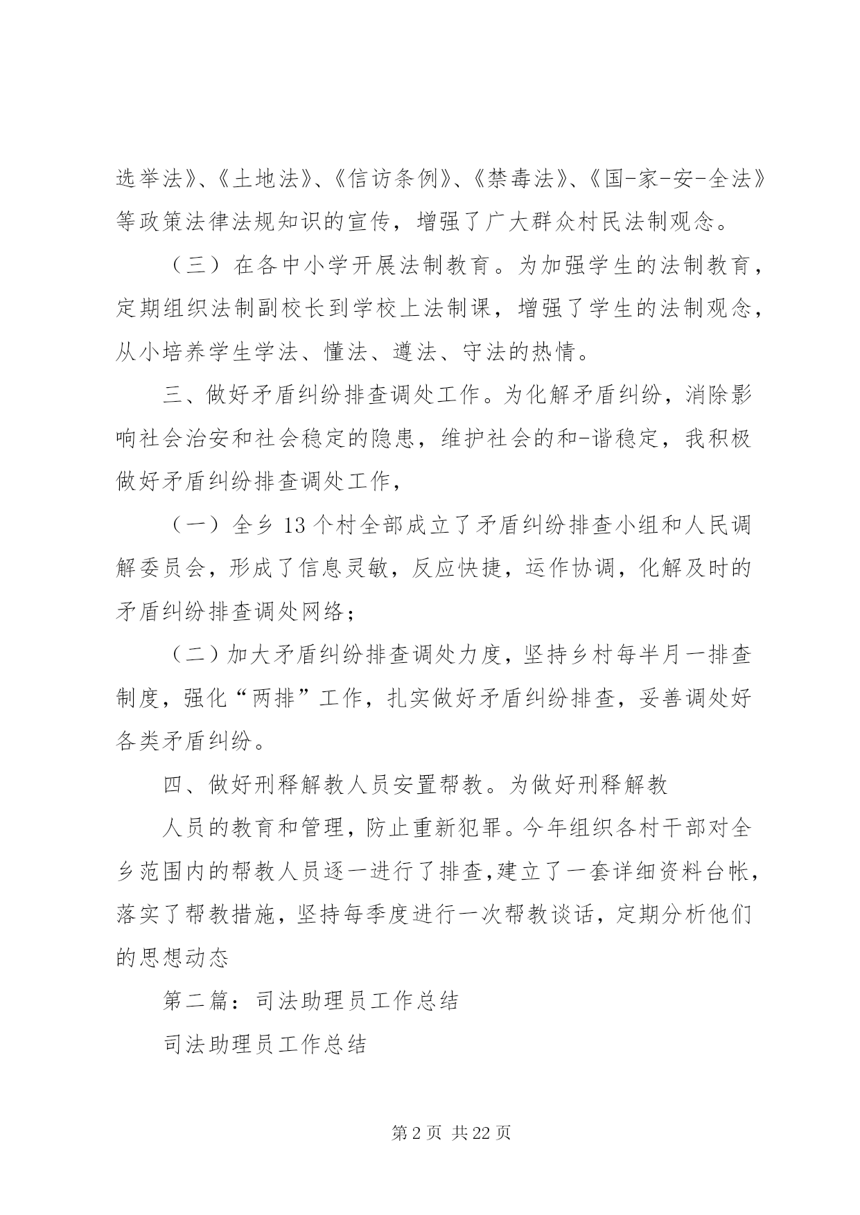第PAGE\*Arabic\*MERGEFORMAT22页共NUMPAGES\*MERGEFORMAT22页司法助理员工作总结(精选多篇)第一篇:司法助理员工作总结司法助理员工作总结一年来,我在区司法局的正确领导下,在乡党委、政府的大力支持下,紧紧围绕2014年工作任务的要求,以科学的发展观、服务于人民群众为宗旨,认真履行职责,现就任职一年来工作任务完成情况总结如下:一、加强业务学习,苦炼内功。司法工作是一项全面、系统性工作,涉及面广,工作复杂。今年我不断加强学习,提高司法工作能力。一是加强业务知识学习,认真学习司法工作相关的法律、法规、文件等知识,提高自身的业务水平;二是不断学习外地司法工作的做法,不断拓宽自己的视野,增强自身综治工作创新能力。二、开展法制宣传教育。今年我充分利用各种有利时机,结合各种宣传教育活动,多方位多形式地开展法制宣传教育工作。(一)结合各种会议为契机,有选择的组织乡村干部学习了《行政诉讼法》、《国家赔偿法》、《公务员法》、中央关于综治工作的意见、省市区关于司法工作的意见等法律法规文件,增长了广大干部的知识,增强了依法行政的法律意识。(二)结合村两位换届、综治宣传月、高铁建设、禁毒宣传月等,加强对全乡广大村民进行综治、平安建设、《村民委员会选举法》、《土地法》、《信访条例》、《禁毒法》、《国-家-安-全法》等政策法律法规知识的宣传,增强了广大群众村民法制观念。(三)在各中小学开展法制教育。为加强学生的法制教育,定期组织法制副校长到学校上法制课,增强了学生的法制观念,从小培养学生学法、懂法、遵法、守法的热情。三、做好矛盾纠纷排查调处工作。为化解矛盾纠纷,消除影响社会治安和社会稳定的隐患,维护社会的和-谐稳定,我积极做好矛盾纠纷排查调处工作,(一)全乡13个村全部成立了矛盾纠纷排查小组和人民调解委员会,形成了信息灵敏,反应快捷,运作协调,化解及时的矛盾纠纷排查调处网络;(二)加大矛盾纠纷排查调处力度,坚持乡村每半月一排查制度,强化“两排”工作,扎实做好矛盾纠纷排查,妥善调处好各类矛盾纠纷。四、做好刑释解教人员安置帮教。为做好刑释解教人员的教育和管理,防止重新犯罪。今年组织各村干部对全乡范围内的帮教人员逐一进行了排查,建立了一套详细资料台帐,落实了帮教措施,坚持每季度进行一次帮教谈话,定期分析他们的思想动态第二篇:司法助理员工作总结司法助理员工作总结我就职于姬家管委会司法所,是一名普通的司法助理员,今天我演讲的题目是:奋战基层,礼赞青春。诗人说。青春是一本太仓促的书。体育健儿纵横赛场,为国争光,他们的青春很豪迈;超女快男放歌舞台,彰显自我,他们的青春很恣意;年轻的战士临危受命,保家卫国,他们的青春很无畏。伴随着鲜花和喝彩一路走来,青春纪念册被他们装帧的如此精美。而我们这些工作生活在基层的朋友,青春的书本或许没有那样的华丽奔放,那样的***悲壮,但是我们花样的年华也有别样的精彩。酷暑时,我们头顶炎阳走村入户,了解社情***,开展法律宣传;严寒时,我们顶风冒雪深入排查,化解矛盾纠纷,开展安置帮教。毗沙村五组吴录的庄基地问题解决了,邓家塬村四组尚小利的离婚纠纷解决了,姬家村四组三位老人的赡养问题解决了,杨官寨村二组刑满释放人员王某的户口问题解决了,一个个曾经演化成你死我活的疙瘩,在我们手中都变成了一个个圆圆的句号,一张张喜悦的笑脸,一声声温暖的感谢。曾经因为五公分庄基上访十几年的吴录新房封顶那天,专门跑到管委会,拉着韦书记的手非要去喝喜酒;曾经因为我们的帮助,追回了被拖欠的工程款,能及时回家过年的四川民工为管委会送来了锦旗。细数这些工作的点点滴滴,是苦乐交织的华丽篇章,是汗水和泪水铸就的丰硕成果,但更多的是用心、用爱、用汗水、用劳动付出的快乐。我为自己是姬家司法行政队伍中的一员而感到光荣和自豪。我相信我们的青春不输给那些鲜花和喝彩,她承载着灼热的梦想,在姬家管委会司法工作这个普普通通的岗位上闪现耀眼光芒。回首一年多的工作经历,我的泪水很多,感慨很多,收获也很多……一个人只身来到姬家工作,人生地不熟,没有亲戚没有朋友。第一次被群众不理解的指责和抱怨,我流下了委屈的泪水,是爱玲姐为我送来一片纸巾;第一次开车与人发生刮蹭,我流下了惊慌的泪水,是田雨哥、宽新哥等多位同事及时赶来,为我化解了一场难缠的纠纷;第一次参加管委会荣获全县综合考评一等奖集体合影,我流下了激动的泪水,是团结奋进的管委会领导班子给了我立足岗位干好工作的信心。我感谢这些可敬可爱的人,我敬仰这些无私无畏的人,我尊敬这些干事敬业的人。是什么让他们对这份事业的感情历久弥坚。我想,这是一种精神,一种“事不避难、任劳任怨、攻坚克难、勇于担当”的姬家精神;是一种大爱,对祖国和家乡的热爱,对司法事业的热爱,对父老乡亲的热爱。同志们奋战的从容和胜